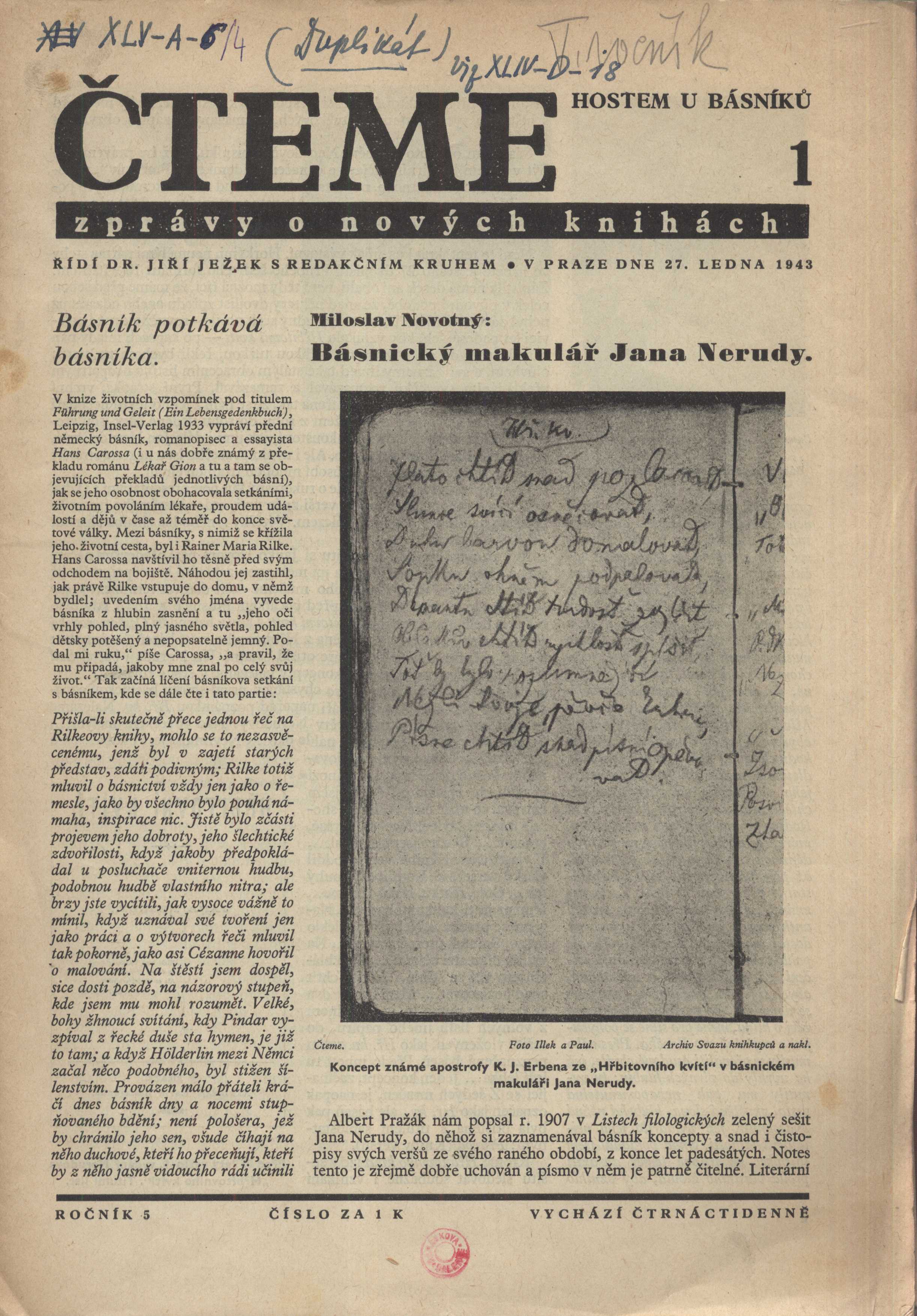 Názvové údaje Čteme : zprávy o nových knihách Další autoři Ježek, Jiří, 1901-1963 (Redaktor, výkonný redaktor) Kleinert, Jaroslav, 1882- (Redaktor, výkonný redaktor) Karásek ze Lvovic, Jiří, 1871-1951 (Autor podpisu) Koděra, Josef (Dřívější majitel) Korp. Svaz českých knihkupců a nakladatelů (Nakladatel, vydavatel) Česká grafická Unie (tiskárna a nakladatelství) (Tiskař) Roč., číslo Ročník 5, číslo 1-9, 1943 Nakladatel V Praze : Svaz českých knihkupců a nakladatelů, 1943 Rozsah 99 stran : ilustrace Osobní hesla Hrubín, František, 1910-1971 - básník, dramatik, prozaik, překladatel * Vrchlický, Jaroslav, 1853-1912 - básník, dramatik, prozaik a překladatel * Neruda, Jan, 1834-1891 - novinář, básník, prozaik, překladatel Klíčová slova česká literatura * literární časopis * knižní kultura * literární život * česká nakladatelství * čeští nakladatelé * nakladatelský časopis * nakladatelská činnost * nakladatelé * nakladatelství * r. 1943 * české časopisy Nadřízená jednotka Čteme zprávy o nových knihách Počet ex. 3, z toho volných 3 Druh dok. PERIODIKA - Svázaný ročník periodika Signatura KaG XLV A 6/4, KaG XLIV D 18a, KaG XLIV D 18b Názvové údaje Čteme : zprávy o nových knihách Další autoři Ježek, Jiří, 1901-1963 (Redaktor, výkonný redaktor) Kleinert, Jaroslav, 1882- (Redaktor, výkonný redaktor) Korp. Svaz českých knihkupců a nakladatelů (Nakladatel, vydavatel) Česká grafická Unie (tiskárna a nakladatelství) (Tiskař) Roč., číslo Ročník 4, číslo 1-20, 1942 Nakladatel V Praze : Svaz českých knihkupců a nakladatelů, 1942 Rozsah 238 stran : ilustrace Osobní hesla Šalda, F. X., 1867-1937 - výtvarný a literární kritik, estetik, básník, dramatik, překladatel * Blatný, Ivan, 1919-1990 - básník, překladatel, autor knih pro děti * Trnka, Jiří, 1912-1969 - malíř, ilustrátor, animátor * Hrubín, František, 1910-1971 - básník, dramatik, prozaik, překladatel * Jirát, Vojtěch, 1902-1945 - literární historik, esejista a kritik, překladatel * Komenský, Jan Amos, 1592-1670 - pedagog, českobratrský teolog * Mukařovský, Jan, 1891-1975 - literární vědec, estetik, pedagog * Florian, Josef, 1873-1941 - nakladatel a překladatel * Preissová, Gabriela, 1862-1946 - spisovatelka * John, Jaromír, 1882-1952 - novinář, beletrista, překladatel, profesor estetiky Klíčová slova česká literatura * literární časopis * knižní kultura * literární život * česká nakladatelství * čeští nakladatelé * nakladatelský časopis * nakladatelská činnost * nakladatelé * nakladatelství * r. 1942 * české časopisy Nadřízená jednotka Čteme zprávy o nových knihách Počet ex. 1, z toho volných 1 Druh dok. PERIODIKA - Svázaný ročník periodika Signatura KaG XLV A 6/3 Názvové údaje Čteme : zprávy o nových knihách Další autoři Ježek, Jiří, 1901-1963 (Redaktor, výkonný redaktor) Kleinert, Jaroslav, 1882- (Redaktor, výkonný redaktor) Korp. Svaz českých knihkupců a nakladatelů (Nakladatel, vydavatel) Česká grafická Unie (tiskárna a nakladatelství) (Tiskař) Roč., číslo Ročník 3, číslo 1-20, 1941 Nakladatel V Praze : Svaz českých knihkupců a nakladatelů, 1941 Rozsah 267 stran : ilustrace Osobní hesla Zeyer, Julius, 1841-1901 - básník, prozaik, dramatik, překladatel * Šváb, Jaroslav, 1906-1999 - grafik, ilustrátor * Zeyer, Julius, 1841-1901 - básník, prozaik, dramatik, překladatel * Dvořák, Antonín, 1841-1904 - hudební skladatel * Deml, Jakub, 1878-1961 - katolický kněz, básník, prozaik, publicista, překladatel * Lermontov, Michail Jur‘jevič, 1814-1841 - ruský básník, prozaik a dramatik * Wirth, Zdeněk, 1878-1961 - historik umění Klíčová slova česká literatura * literární časopis * knižní kultura * literární život * česká nakladatelství * čeští nakladatelé * nakladatelský časopis * nakladatelská činnost * nakladatelé * nakladatelství * r. 1941 * české časopisy Nadřízená jednotka Čteme zprávy o nových knihách Počet ex. 1, z toho volných 1 Druh dok. PERIODIKA - Svázaný ročník periodika Signatura KaG XLV A 6/2 Názvové údaje Čteme : zprávy o nových knihách Další autoři Ježek, Jiří, 1901-1963 (Redaktor, výkonný redaktor) Kleinert, Jaroslav, 1882- (Redaktor, výkonný redaktor) Korp. Svaz českých knihkupců a nakladatelů (Nakladatel, vydavatel) Česká grafická Unie (tiskárna a nakladatelství) (Tiskař) Roč., číslo Ročník 2, číslo 1-24, 1939/1940 Nakladatel V Praze : Svaz českých knihkupců a nakladatelů, 1939-1940 Rozsah 364 stran : ilustrace Osobní hesla Švabinský, Max, 1873-1962 - malíř a grafik * Wenig, Adolf, 1874-1940 - učitel, básník, spisovatel, překladatel, redaktor * Rutte, Miroslav, 1889-1954 - literární a divadelní kritik, esejista a publicista, dramatik, prozaik a básník, filmový estetik * Foerster, Josef Bohuslav, 1859-1951 - hudební skladatel * Němcová, Božena, 1820-1862 - prozaička, publicistka, autorka a sběratelka pohádek, folkloristka * Šváb, Jaroslav, 1906-1999 - grafik, ilustrátor * Těsnohlídek, Rudolf, 1882-1928 - básník, prozaik, novinář a překladatel * Rilke, Rainer Maria, 1875-1926 - pražský německy píšící spisovatel * Jirásek, Alois, 1851-1930 - prozaik, dramatik * Neff, Vladimír, 1909-1983 - prozaik, dramatik, překladatel * Šrámek, Fráňa, 1877-1952 - básník, prozaik, dramatik a publicista * Pražák, Albert, 1880-1956 - literární vědec a politik Klíčová slova česká literatura * literární časopis * knižní kultura * literární život * česká nakladatelství * čeští nakladatelé * nakladatelský časopis * nakladatelská činnost * nakladatelé * nakladatelství * r. 1939-1940 * české časopisy Nadřízená jednotka Čteme zprávy o nových knihách Počet ex. 3, z toho volných 3 Druh dok. PERIODIKA - Svázaný roč