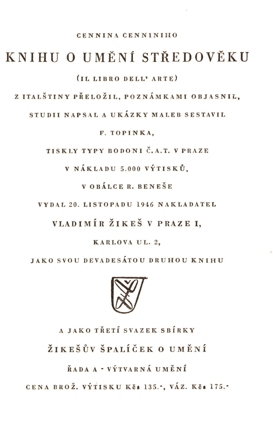 Názvové údaje O malbě, O soše / Léon Battista Alberti ; z italštiny přeložil, poznámkami objasnil, studii o L.B. Abertim napsal, náčrty kreslil a obrázky sestavil F. Topinka ; v obálce R. Beneše Osobní jméno Alberti, Leon Battista, 1404-1472 (Autor) Další autoři Topinka, F. (Překladatel) (Autor úvodu atd.) (Autor komentáře textu) (Ilustrátor) Beneš, R. (Autor obálky) Korp. Vladimír Žikeš (nakladatelství a knihkupectví) (Nakladatel, vydavatel) Grafický závod J. Čížek (Pardubice) (Tiskař) Nakladatel V Praze : Nakladatelství Vladimíra Žikeše, 1947 Výrobce V Pardubicích : Grafický závod J. Čížek Rozsah 220 stran, 4 nečíslované listy obrazových příloh : ilustrace ; 16 cm Osobní hesla Alberti, Leon Battista, 1404-1472 - italský teoretik umění, estetik, architekt, spisovatel Klíčová slova italská literatura * překlady * studie * umění * malířství * sochařství * techniky * Alberti L. B. * Itálie * stol. 15. Počet ex. 2, z toho volných 2 Druh dok. monografie Signatura MUK 2078, JVladislav 741 Názvové údaje Kniha o umění středověku = Il libro dell'arte A.D. 1437 / Cennino Cennini ; z italštiny přeložil, poznámkami objasnil, studii napsal a ukázky maleb sestavil F. Topinka ; v obálce R. Beneše Osobní jméno Cennini, Cennino, asi 1350-asi 1440 (Autor) Další autoři Topinka, F. (Překladatel) (Autor komentáře textu) (Autor úvodu atd.) Beneš, R. (Autor obálky) Korp. Vladimír Žikeš (nakladatelství a knihkupectví) (Nakladatel, vydavatel) Č.A.T., Českomoravské akciové tiskařské a vydavatelské podniky (Praha) (Tiskař) Nakladatel Praha : nakl. Vladimír Žikeš, 1946 Výrobce Č.A.T. Rozsah 318 stran, 22 nečíslovaných stran obrazových příloh : ilustrace ; 16 cm Klíčová slova česká literatura Počet ex. 2, z toho volných 2 Druh dok. monografie Signatura Holan 1646, JVladislav 746 Názvové údaje Úvahy o malířství = Trattato della pittura / Lionardo da Vinci ; [z italštiny přeložil a studii i poznámky pořídil F. Topinka ; v úpravě J. Solara ; v obálce R. Beneše] Autor Leonardo, da Vinci, 1452-1519 (Autor) Další autoři Topinka, F. (Překladatel) (Autor úvodu atd.) Solar, Josef, 1896-1977 (Grafický technik) Beneš, R. (Autor obálky) Korp. Vladimír Žikeš (nakladatelství a knihkupectví) (Nakladatel, vydavatel) Č.A.T., Českomoravské akciové tiskařské a vydavatelské podniky (Praha) (Tiskař) Nakladatel Praha : Nakladatel Vladimír Žikeš, 1941 Výrobce (Č.A.T., Českomoravské akciové tiskařské a vydavatelské podniky) Rozsah 336 - [II] s., [3] l. příl. : il. ; 8° Klíčová slova italská literatura * studie * úvahy * malířství * Leonardo da Vinci * Itálie * stol. 16. Počet ex. 1, z toho volných 1 Druh dok. monografie Signatura MUK 2049