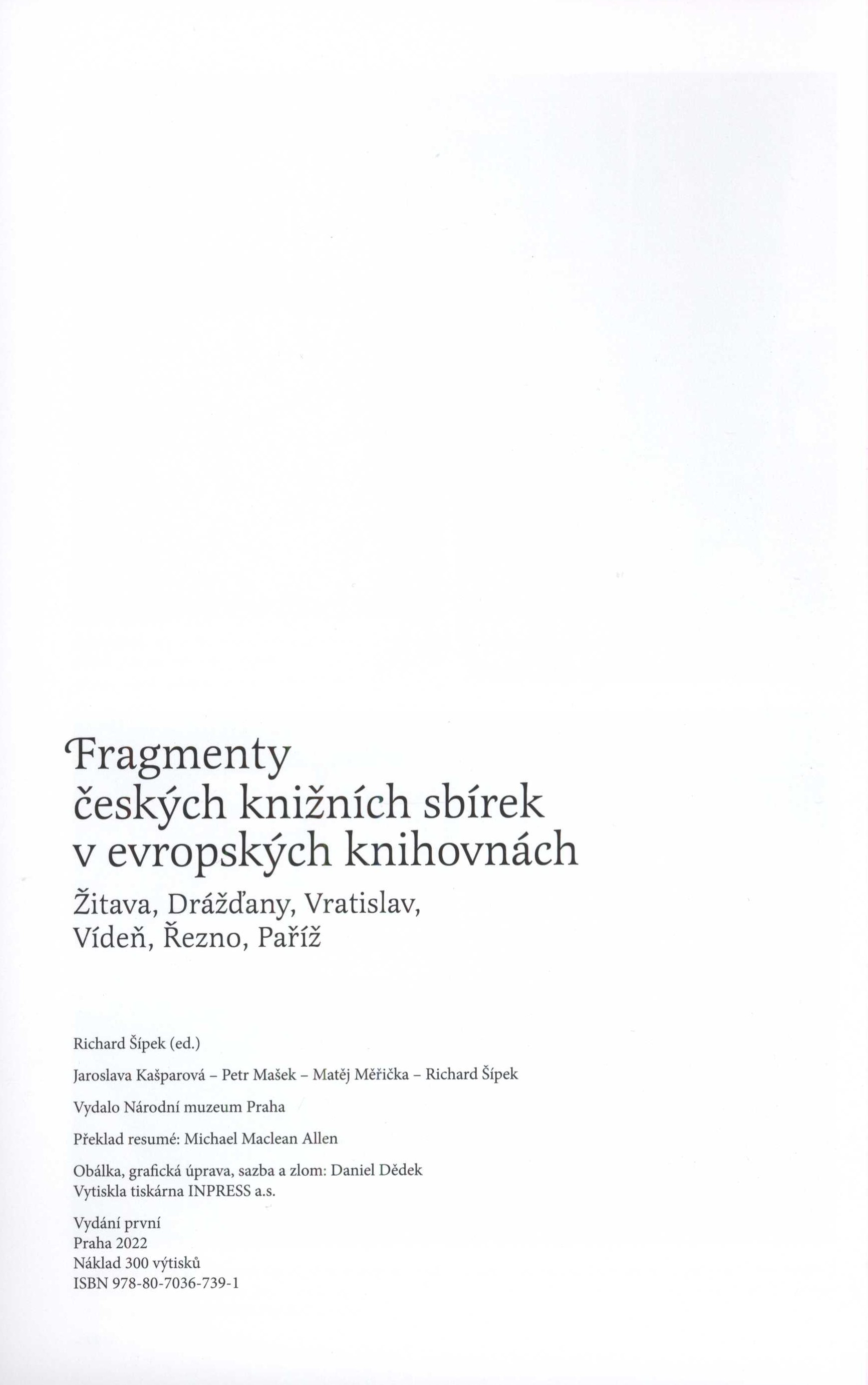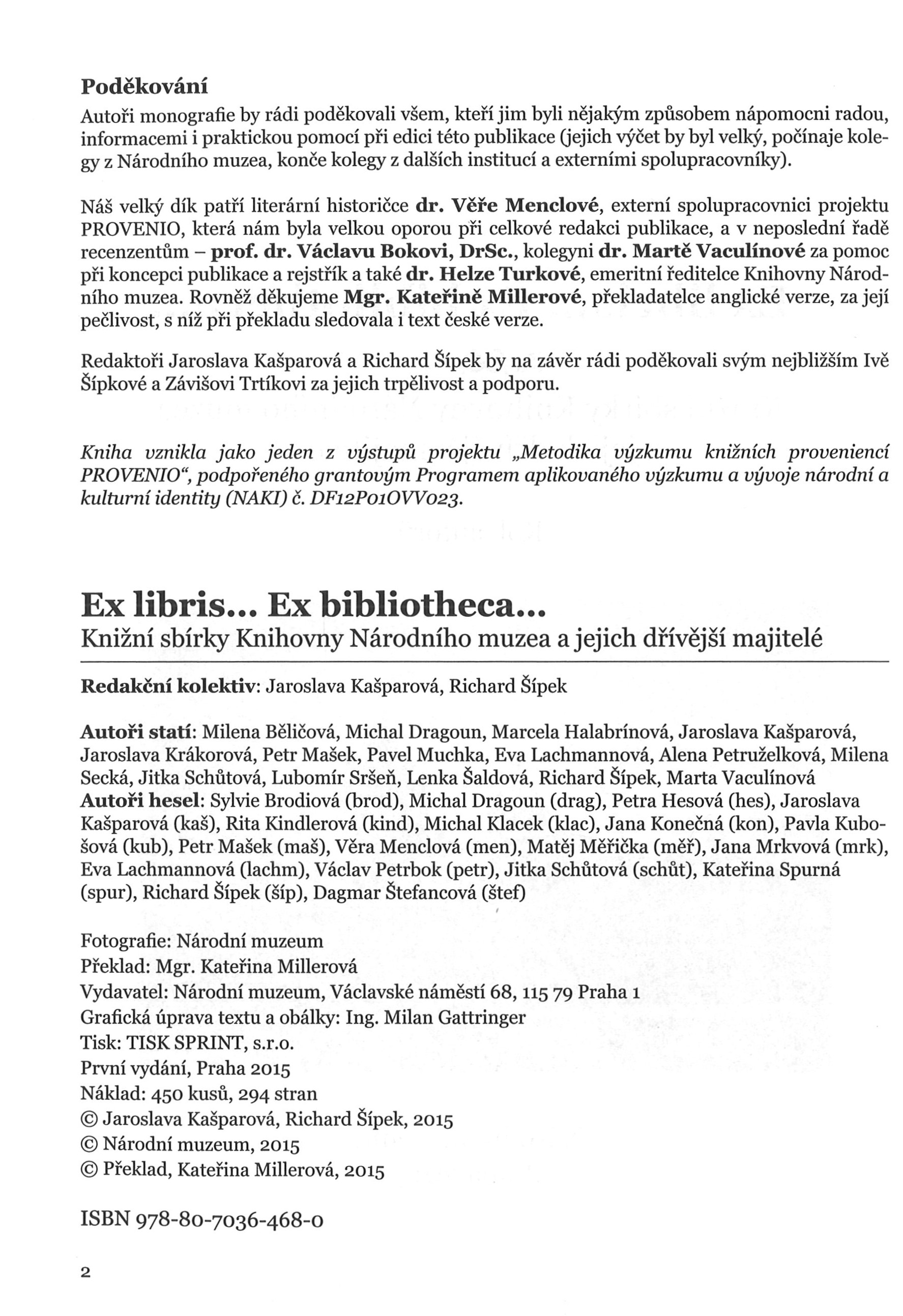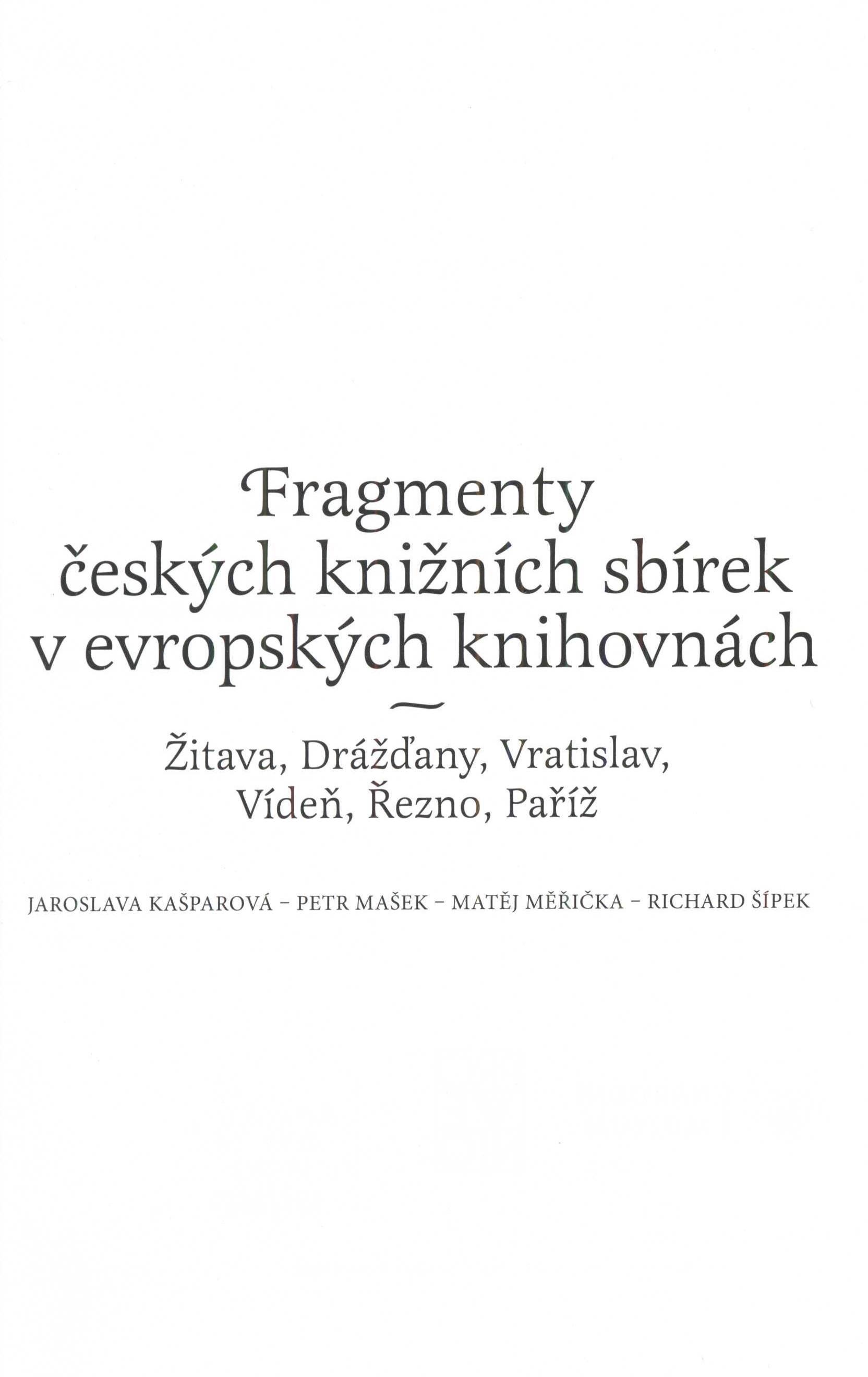 Názvové údaje Bohemia hispánica: fondos españoles de los siglos XV a XVII en bibliotecas checas / Robert Archer, Jaroslava Kašparová, Pavel Marek Osobní jméno Archer, Robert, 1945- (Autor) Další autoři Kašparová, Jaroslava, 1952- (Autor) Marek, Pavel, 1977- (Autor) Nakladatel Barcelona : Reial Acadèmia de bones lletres : King's college London, 2013 Rozsah 123 s. : 1 faksim. Klíčová slova hispanika * španělské rukopisy * staré španělské tisky * historické knihovní fondy * vzácné knihovní fondy * archivní fondy * veřejné knihovny * šlechtické knihovny * klášterní knihovny * kulturní vztahy * Česko * Španělsko * stol. 15.-17. * souborné katalogy * speciální bibliografie * retrospektivní bibliografie Počet ex. 1, z toho volných 1 Druh dok. monografie Signatura C12b 15245 Názvové údaje Libri magistri muti sunt : pocta Jaroslavě Kašparové / k vydání připravily Alena Císařová Smítková, Andrea Jelínková a Milada Svobodová ; [grafická úprava, sazba, obálka David Jůna] Osobní jméno Kašparová, Jaroslava, 1952- (Poctěná osoba) Další autoři Císařová Smítková, Alena, 1971- (Editor) Jelínková, Andrea, 1972- (Editor) Svobodová, Milada, 1963- (Editor) Jůna, David (Knižní grafik) (Sazeč) (Autor obálky) Mazalová, Ludmila, 1943-2019 (Autor úvodu atd.) Ducreux, Marie-Elizabeth, 1950- (Autor úvodu atd.) Korp. Akademie věd České republiky. Knihovna (Nakladatel, vydavatel) Göfi-print (tiskárna) (Tiskař) (Tiskař obrazu) Nakladatel Praha : Knihovna AV ČR, 2013 Výrobce (Göfi-print s. r. o.) Rozsah 430 s. : il., faksim. Osobní hesla Kašparová, Jaroslava, 1952- - bibliografka, redaktorka Klíčová slova knihovědkyně * bibliografky * české překladatelky * knihověda * překlady * dějiny knihy * dějiny četby * dějiny knižní kultury * dějiny knihoven * Kašparová J. * Česko * stol. 15.-20. * stol. 20.-21. * kolektivní monografie * jubilejní publikace Počet ex. 1, z toho volných 1 Druh dok. monografie Signatura C12c 4330 Názvové údaje Rytíř smutné postavy v Čechách : u příležitosti 400. výročí vydání prvního dílu Dona Quijota = El caballero de la Triste Figura en las tierras de Bohemia : con motivo del IV Centenario de la aparición de la primera parte del Quijote / Jaroslava Kašparová, Pavel Štěpánek ; [překlad do španělštiny Eduardo Fernández Couceiro, Pavel Štěpánek Osobní jméno Kašparová, Jaroslava, 1952- (Autor) Další autoři Štěpánek, Pavel, 1942- (Autor) Fernández Couceiro, Eduardo, 1967- (Překladatel) Korp. Národní knihovna České republiky (Nakladatel, vydavatel) Nakladatel Praha : Národní knihovna České republiky, 2005 Rozsah 159 s., [22] s. obr. příl. : il. (některé barev.), portréty, faksim. ; 22 cm Osobní hesla Cervantes Saavedra, Miguel de, 1547-1616 - španělský prozaik, dramatik a básník Heslo korporace (zkrác. heslo korp.) : Národní knihovna České republiky Klíčová slova španělská literatura * román * literární překlady * vlivy * knihovní fondy * stol. 17. * knižní produkce * stol. 17.-20. * katalogy výstav Počet ex. 2, z toho volných 2 Druh dok. monografie Signatura C12b 9132, C12b 9132a Názvové údaje České svobodné zednářství v průběhu XVIII. století / Jan Podškubka ; [redaktor publikace Jaroslava Kašparová] Osobní jméno Podškubka, Jan (Autor) Další autoři Kašparová, Jaroslava, 1952- (Editor) Nakladatel Praha : Národní knihovna České republiky, 2005 Rozsah 326 s. Klíčová slova svobodné zednářství * svobodní zednáři * osvícenství * vzácné knihy * stol. 18. * bibliografie * studie * biografie Počet ex. 1, z toho volných 1 Druh dok. monografie Signatura C12b 8586 Názvové údaje Literární a myšlenkové proudy latinsko-českého středověku : rétorika, etika a symbolika / Josef Tříška ; [redaktor publikace Jaroslava Kašparová] Osobní jméno Tříška, Josef, 1922-2005 (Autor) Další autoři Kašparová, Jaroslava, 1952- (Editor) Nakladatel Praha : Národní knihovna České republiky, 2004 Rozsah 170 s. : il., faksim. Klíčová slova česká literatura * středověká literatura * latinská literatura * rétorika * intelektuální život * Česko * středověk * studie Počet ex. 1, z toho volných 1 Druh dok. monografie Signatura C12b 7839 Názvové údaje Ex libris... Ex bibliotheca... : knižní sbírky Knihovny Národního muzea a jejich dřívější majitelé / kol. autorů ; redakční kolektiv: Jaroslava Kašparová, Richard Šípek ; grafická úprava textu a obálky: Milan Gattinger Další autoři Kašparová, Jaroslava, 1952- (Editor) Šípek, Richard (Editor) Gattringer, Milan, 1958- (Autor obálky) (Knižní grafik) Korp. Národní muzeum (Praha, Česko). Knihovna (Jiná role) Národní muzeum (Praha, Česko) (Nakladatel, vydavatel) TISK SPRINT (tiskárna) (Tiskař) Nakladatel Praha : Národní muzeum, 2015 Výrobce [Vestec-Jesenice] : TISK SPRINT, s.r.o. Rozsah 294 stran : ilustrace (některé barevné), portréty, faksimile ; 23 cm Heslo korporace (zkrác. heslo korp.) : Národní muzeum (Praha, Česko). Knihovna Předmětová hesla provenance of documents - Czechia * property marks - Czechia - 19th-20th centuries * superexlibris - Czechia - 19th-20th centuries * bookplates - Czechia - 19th-20th centuries * dedications - Czechia - 19th-20th centuries * personal libraries - Czechia - 19th-20th centuries * rare library collections - Czechia - 21st century * methodology of bibliography * programs and projects - Czechia - 21st century * databases - Czechia Geografické heslo Praha (Česko) * Prague (Czechia) Klíčová slova Národní muzeum, Praha * knihovna * knihovní fondy * knižní sbírky * knižní soubor * osobní knihovny * provenience dokumentů * knižní značky * supralibros * exlibris * vzácné knihovní fondy * rukopisy * knihovní katalogy * muzejní knihovny * stol. 21. * kolektivní monografie Počet ex. 1, z toho v