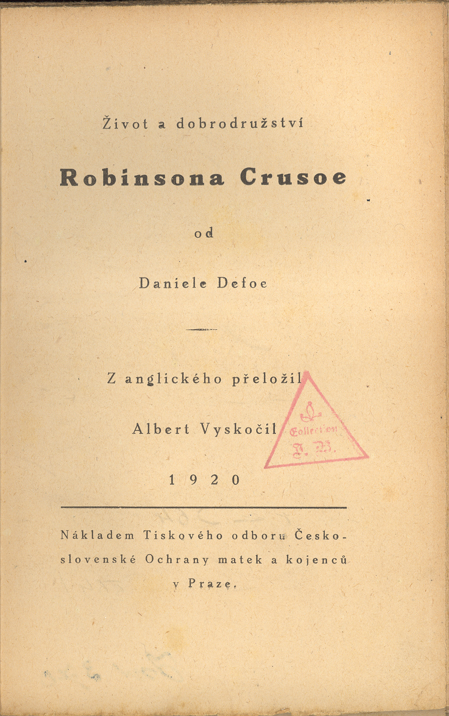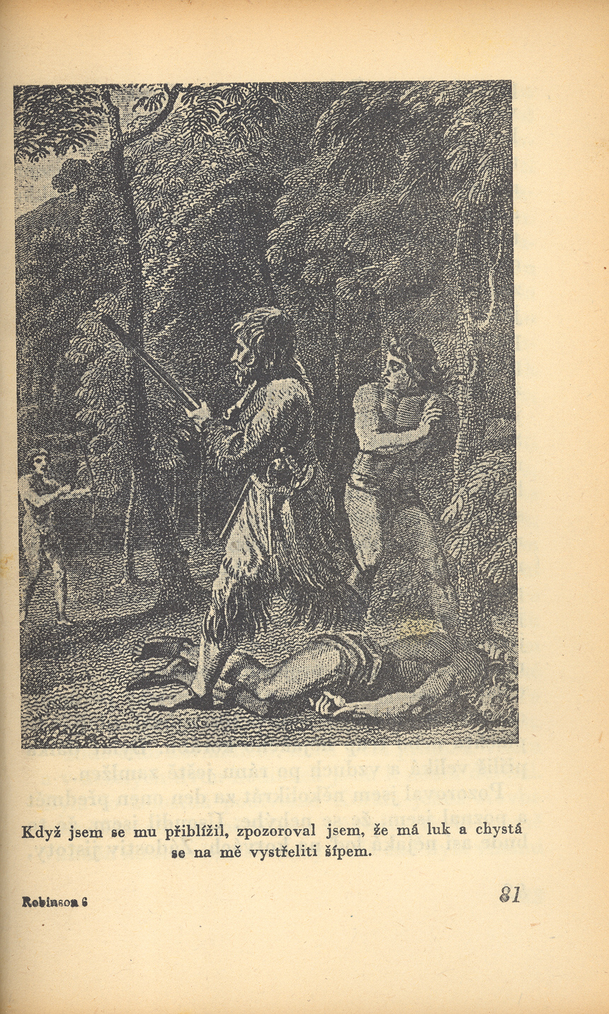 Názvové údaje Hrdinové : úcta k hrdinům a hrdinství v dějinách / Thomas Carlyle ; [přeložil Albert Vyskočil ; upravila a vazbu navrhla Hana Dostalová ; portrét Carlylův, který podle Whistlera v leptu provedl Vl. Silovský] Osobní jméno Carlyle, Thomas, 1795-1881 (Autor) Další autoři Vyskočil, Albert, 1890-1966 (Překladatel) Dostalová, Hana, 1890-1981 (Knižní grafik) (Výtvarník vazby) Škeřík, Rudolf, 1896-1968 Whistler, James McNeill, 1834-1903 (Umělec) Silovský, Vladimír, 1891-1974 (Leptař) (Grafický technik) Korp. Symposion (nakladatelství) (Nakladatel, vydavatel) Průmyslová tiskárna v Praze (Tiskař) Nakladatel Praha : Symposion, 1925 Výrobce (Průmyslová tiskárna) Rozsah 251 s., [1] l. obr. příl. : il. Klíčová slova britská literatura * filozofické úvahy * historické úvahy * politické úvahy * úvahy * eseje * esejistické texty * hrdinové bájí Počet ex. 2, z toho volných 2 Druh dok. monografie Signatura VHB 0043, VMartínek 0736 Názvové údaje Sartor Resartus : život a myšlenky pana Teufelsdrockha ve třech dílech / Thomas Carlyle ; z anglického přeložil Albert Vyskočil ; [upravil a dřevorytem vyzdobil Albert Vyskočil] Osobní jméno Carlyle, Thomas, 1795-1881 (Autor) Další autoři Vyskočil, Albert, 1890-1966 (Překladatel) (Ilustrátor) Nakladatel Ve Staré Říši na Moravě : Josef V. Florian, 1920 Rozsah 352 s. ; 8° Klíčová slova anglická literatura * filozofická pojednání Počet ex. 1, z toho volných 1 Druh dok. monografie Signatura Holan 02746 Názvové údaje Sartor resartus : Život a myšlenky pana Teufelsdröckha ve třech dílech / Tomáš Carlyle ; Z anglického přeložil, upravil a dřevorytem vyzdobil Albert Vyskočil Osobní jméno Carlyle, Thomas, 1795-1881 (Autor) Další autoři Vyskočil, Albert, 1890-1966 Nakladatel Praha : [Stanislava Jílovská], 1920 Rozsah 352 s., obr Klíčová slova anglická literatura * filozofie Počet ex. 1, z toho volných 1 Druh dok. monografie Signatura C12a 355 Názvové údaje Zpověď anglického poživače opia / Thomas De Quincey ; [přeložil Jaroslav Skalický ; upravil A. Vyskočil] Osobní jméno De Quincey, Thomas, 1785-1859 (Autor) Další autoři Skalický, Jaroslav, 1867-1947 (Překladatel) Vyskočil, Albert, 1890-1966 (Knižní grafik) Korp. Nakladatelská společnost Rozmach (nakladatelství) (Nakladatel, vydavatel) Ladislav Kuncíř (nakladatelství a knihkupectví) (Nakladatel, vydavatel) František Obzina (tiskárna, nakladatelství) (Tiskař) Nakladatel Praha : Ladislav Kuncíř Rozmach, 1926 Výrobce Frant. Obzina) Rozsah 280, [8] s. ; 19,8 cm Klíčová slova anglická literatura * próza * autobiografická próza * stol. 19., léta 20. Počet ex. 6, z toho volných 5 Druh dok. monografie Signatura OŘíha 278, POR 57, P 74 D 29, P 22 B 34, P 93 D 75, Holan 61 Názvové údaje Podivná dobrodružství Robinsona Crusoe / Daniel Defoe ; [přeložil Albert Vyskočil ; obrázky jsou z původního vydání z roku 1790 a kreslil je Thomas Stothard a do ocele ryl Medland] Osobní jméno Defoe, Daniel, asi 1661-1731 (Autor) Další autoři Vyskočil, Albert, 1890-1966 (Překladatel) Stothard, Thomas, 1755-1834 (Ilustrátor) Korp. Melantrich (nakladatelství) (Nakladatel, vydavatel) Nakladatel [V Praze] : [vydal a vytiskl] Melantrich, [1941] Rozsah 95, [1] s. : il. ; 8° Osobní hesla Defoe, Daniel, asi 1661-1731 - anglický prozaik a žurnalista Klíčová slova anglická literatura * překlad * próza * dobrodružný příběh * Robinson Počet ex. 1, z toho volných 1 Druh dok. monografie Signatura P 76 d 10 Názvové údaje Robinson Crusoe / Daniel Defoe ; [z anglických kritických vydání přeložili Albert Vyskočil (1. díl: The life and strange surprising adventures of Robinson Crusoe of York, mariner) a Timotheus Vodička (2. díl: The farther adventures of Robinson Crusoe, being the second and last part of his life) ; doslov napsal Jaroslav Hornát ; ilustroval Adolf Born ; graficky upravil Václav Rein] Osobní jméno Defoe, Daniel, asi 1661-1731 (Autor) Další autoři Vyskočil, Albert, 1890-1966 (Překladatel) Vodička, Timotheus, 1910-1967 (Překladatel) Born, Adolf, 1930-2016 (Autor obálky) Hornát, Jaroslav, 1929-1990 (Autor doslovu, tiráže atd.) Rein, Václav, 1918- (Grafický technik) Korp. Odeon (nakladatelství) (Nakladatel, vydavatel) Svoboda (tiskárna) (Tiskař) Nakladatel [Praha] : Odeon, [1986] Výrobce (Svoboda) Rozsah 518, [4] s. : il. ; 8° Osobní hesla Defoe, Daniel, asi 1661-1731 - anglický prozaik a žurnalista Klíčová slova anglická literatura * překlad * próza * dobrodružný příběh * Robinson Počet ex. 1, z toho volných 1 Druh dok. monografie Signatura M 79 h 7 Názvové údaje Robinson Crusoe / Daniel Defoe ; [z anglických kritických vydání přeložili Albert Vyskočil (1. díl: The life and strange surprising adventures of Robinson Crusoe of York, mariner) a Timotheus Vodička (2. díl: The farther adventures of Robinson Crusoe, being the second and last part of his life) ; doslov napsal Jaroslav Hornát ; ilustroval a graficky upravil Adolf Born] Osobní jméno Defoe, Daniel, asi 1661-1731 (Autor) Další autoři Vyskočil, Albert, 1890-1966 (Překladatel) Vodička, Timotheus, 1910-1967 (Překladatel) Born, Adolf, 1930-2016 (Autor obálky) Hornát, Jaroslav, 1929-1990 (Autor doslovu, tiráže atd.) Korp. Odeon (nakladatelství) (Nakladatel, vydavatel) Nakladatelství Svoboda (Tiskař) Nakladatel [Praha] : Odeon, [1975] Výrobce (Svoboda) Rozsah 508, [4] s. : il. ; 8° Osobní hesla Defoe, Daniel, asi 1661-1731 - anglický prozaik a žurnalista Klíčová slova anglická literatura * překlad * próza * dobrodružný příběh * Robinson Počet ex. 1, z toho volných 1 Druh dok. monografie Signatura Z G 2 e 38 Názvové údaje Život a dobrodružství Robinsona Crusoe / od Daniele Defoe ; z anglického přeložil Albert Vyskočil ; [obrázky Slavoboj Tusar] Osobní jméno Defoe, Dani