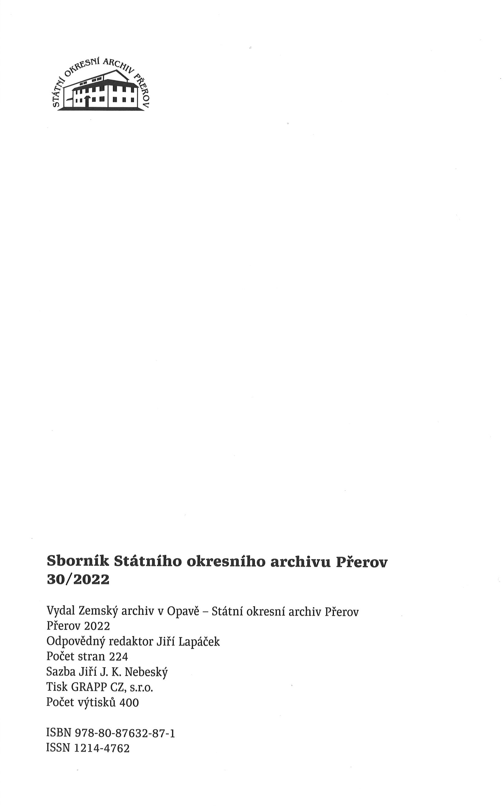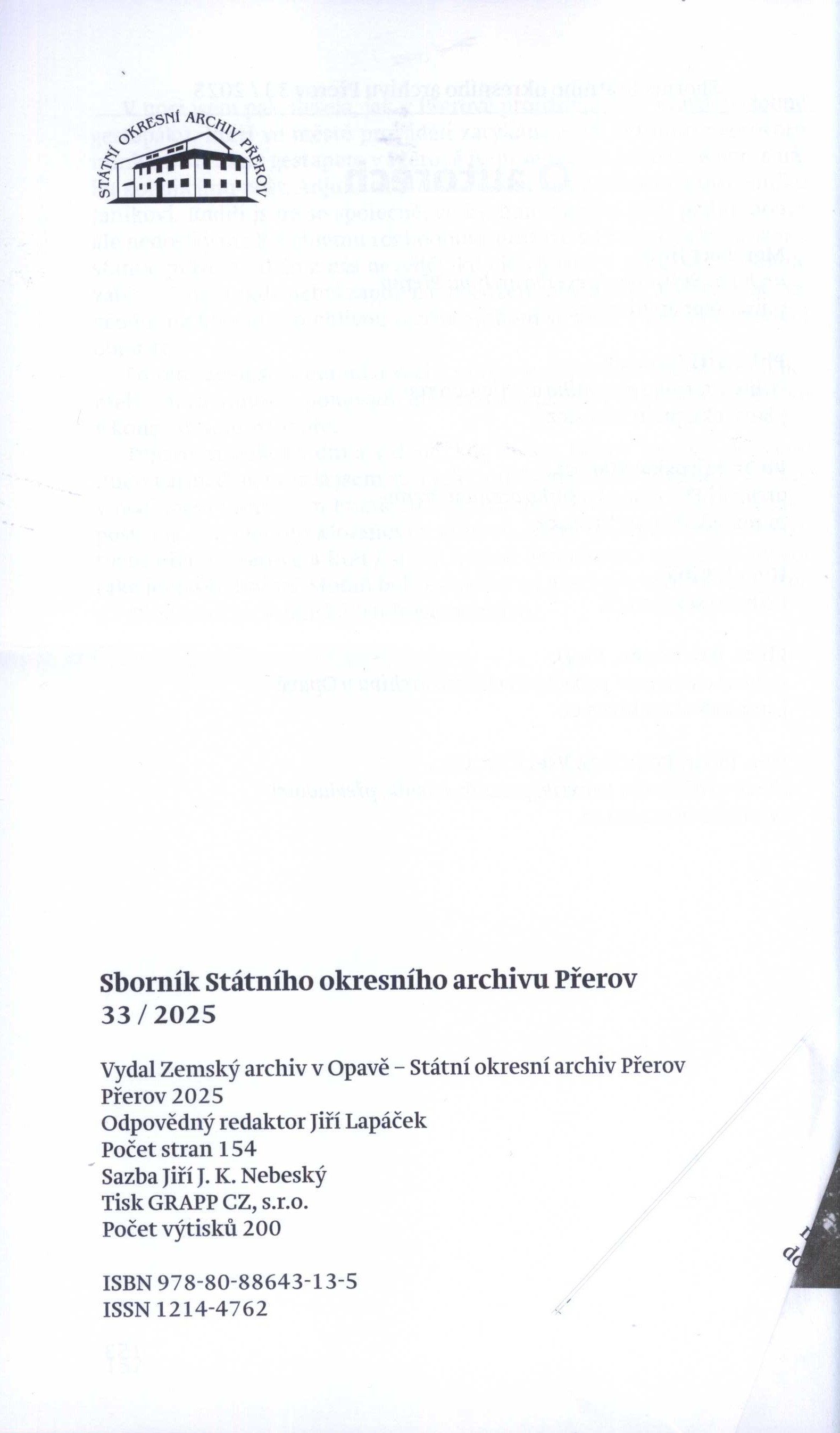 Názvové údaje Sborník Státního okresního archivu Přerov Další autoři Lapáček, Jiří, 1960- (Šéfredaktor, odpovědný redaktor) Korp. Státní okresní archiv Přerov (Nakladatel, vydavatel) GRAPP CZ (reklamní agentura, tiskárna) (Tiskař) Roč., číslo 33, 2025 Nakladatel Přerov : Státní okresní archiv Přerov, 2025 Výrobce GRAPP CZ, s.r.o. Rozsah 153 stran : ilustrace, portréty, faksimile ; 23 cm Osobní hesla Skálová, Augusta, 1898-1996 - spisovatelka, dramatička * Schreiber, Emanuel, 1852-1932 - rabín * Vlček, Bartoš, 1897-1926 - překladatel, spisovatel, básník, pedagog Klíčová slova přerovský kraj * Přerov * historie kraje * archivní materiály * osobnosti kraje * kati * stol. 16. * r. 1945 * události * regionální sborník Nadřízená jednotka . Sborník Státního okresního archivu Přerov Státní okresní archiv Přerov Počet ex. 1, z toho volných 1 Druh dok. PERIODIKA - Svázaný ročník periodika Signatura LITc 0955 Názvové údaje Sborník Státního okresního archivu Přerov Další autoři Lapáček, Jiří, 1960- (Šéfredaktor, odpovědný redaktor) Korp. Státní okresní archiv Přerov (Nakladatel, vydavatel) GRAPP CZ (reklamní agentura, tiskárna) (Tiskař) Roč., číslo 32, 2024 Nakladatel Přerov : Státní okresní archiv Přerov, 2024 Výrobce GRAPP CZ, s.r.o. Rozsah 155 stran : fotografie, portréty, faksimile, plány ; 23 cm Klíčová slova přerovský kraj * Přerov * historie kraje * stavební památky * archivní materiály * osobnosti kraje * regionální sborník Nadřízená jednotka . Sborník Státního okresního archivu Přerov Státní okresní archiv Přerov Počet ex. 1, z toho volných 1 Druh dok. PERIODIKA - Svázaný ročník periodika Signatura LITc 0778 Názvové údaje Sborník Státního okresního archivu Přerov Další autoři Lapáček, Jiří, 1960- (Šéfredaktor, odpovědný redaktor) Korp. Státní okresní archiv Přerov (Nakladatel, vydavatel) GRAPP CZ (reklamní agentura, tiskárna) (Tiskař) Roč., číslo 31, 2023 Nakladatel Přerov : Státní okresní archiv Přerov, 2023 Výrobce GRAPP CZ, s.r.o. Rozsah 159 stran : fotografie, portréty, faksimile, plány ; 23 cm Osobní hesla Lorenz, František Mirovít, 1800-1863 - varhaník, hudební skladatel, pedagog Klíčová slova přerovský kraj * Přerov * historie kraje * stavební památky * archivní materiály * osobnosti kraje * regionální sborník Nadřízená jednotka . Sborník Státního okresního archivu Přerov Státní okresní archiv Přerov Počet ex. 1, z toho volných 1 Druh dok. PERIODIKA - Svázaný ročník periodika Signatura LITc 0634 Názvové údaje Sborník Státního okresního archivu Přerov Další autoři Lapáček, Jiří, 1960- (Šéfredaktor, odpovědný redaktor) Korp. Státní okresní archiv Přerov (Nakladatel, vydavatel) GRAPP CZ (reklamní agentura, tiskárna) (Tiskař) Roč., číslo 30, 2022 Nakladatel Přerov : Státní okresní archiv Přerov, 2022 Výrobce GRAPP CZ, s.r.o. Rozsah 223 stran : fotografie, portréty, faksimile, plány ; 23 cm Osobní hesla Hašek, Jaroslav, 1883-1923 - novinář, prozaik, humorista, satirik, autor kabaretních her a publicista Klíčová slova přerovský kraj * Přerov * historie kraje * stavební památky * archivní materiály * osobnosti kraje * čeští spisovatelé * regionální sborník Nadřízená jednotka . Sborník Státního okresního archivu Přerov Státní okresní archiv Přerov Počet ex. 1, z toho volných 1 Druh dok. PERIODIKA - Svázaný ročník periodika Signatura LITc 0488 Názvové údaje Sborník Státního okresního archivu Přerov Další autoři Lapáček, Jiří, 1960- (Šéfredaktor, odpovědný redaktor) Korp. GRAPP CZ (reklamní agentura, tiskárna) (Tiskař) Roč., číslo 29, 2021 Nakladatel Přerov : Státní okresní archiv Přerov, 2021 Výrobce GRAPP CZ, s.r.o. Rozsah 239 stran : fotografie, portréty, faksimile, plány ; 23 cm Osobní hesla Kniebandl, Jan Jakub, 1670-1730 - zednický mistr, stavitel, projektující architekt * Hauková, Jiřina, 1919-2005 - básnířka, překladatelka Klíčová slova přerovský kraj * Přerov * historie kraje * stavební památky * archivní materiály * osobnosti kraje * české básně * české básnířky * legionáři * legie * regionální sborník Nadřízená jednotka . Sborník Státního okresního archivu Přerov Státní okresní archiv Přerov Počet ex. 1, z toho volných 1 Druh dok. PERIODIKA - Svázaný ročník periodika Signatura LITc 0335 Názvové údaje Sborník Státního okresního archivu Přerov Další autoři Lapáček, Jiří, 1960- (Šéfredaktor, odpovědný redaktor) Korp. GRAPP CZ (reklamní agentura, tiskárna) (Tiskař) Roč., číslo 28, 2020 Nakladatel Přerov : Státní okresní archiv Přerov, 2020 Výrobce GRAPP CZ, s.r.o. Rozsah 231 stran : fotografie, portréty, faksimile, plány ; 23 cm Klíčová slova přerovský kraj * Přerov * historie kraje * stavební památky * hostince * archivní materiály * osobnosti kraje * regionální sborník Nadřízená jednotka . Sborník Státního okresního archivu Přerov Státní okresní archiv Přerov Počet ex. 1, z toho volných 1 Druh dok. PERIODIKA - Svázaný ročník periodika Signatura LITc 0162 Názvové údaje Sborník Státního okresního archivu Přerov Další autoři Lapáček, Jiří, 1960- (Šéfredaktor, odpovědný redaktor) Korp. GRAPP CZ (reklamní agentura, tiskárna) (Tiskař) Roč., číslo 27, 2019 Nakladatel Přerov : Zemský archiv v Opavě - Státní okresní archiv Přerov, 2019 Výrobce GRAPP CZ, s.r.o. Rozsah 251 stran : fotografie, portréty, faksimile, plány ; 23 cm Klíčová slova přerovský kraj * Přerov * historie kraje * stavební památky * hostince * archivní materiály * osobnosti kraje * třetí odboj * 2. světová válka * odbojová činnost * regionální sborník Nadřízená jednotka . Sborník Státního okresního archivu Přerov Státní okresní