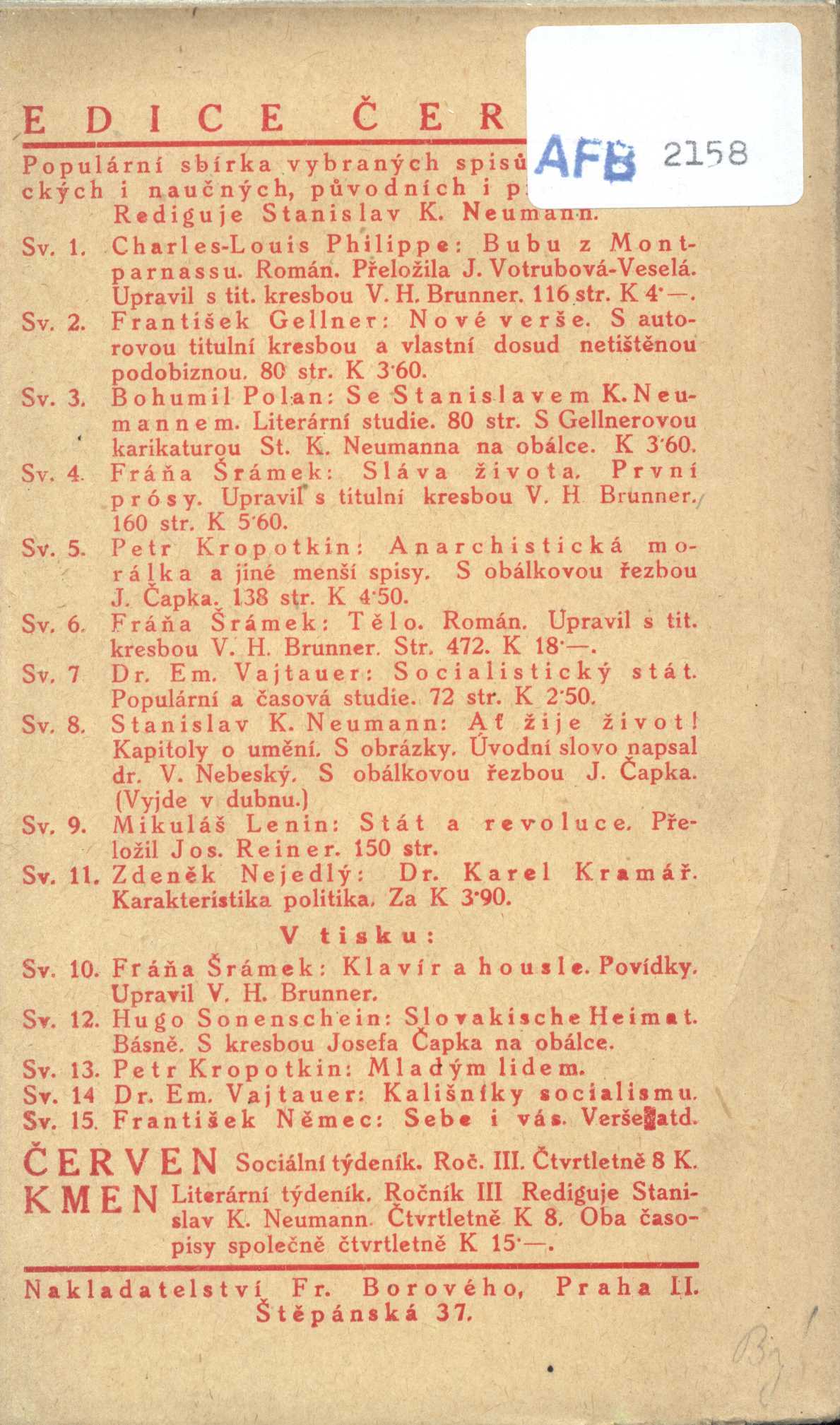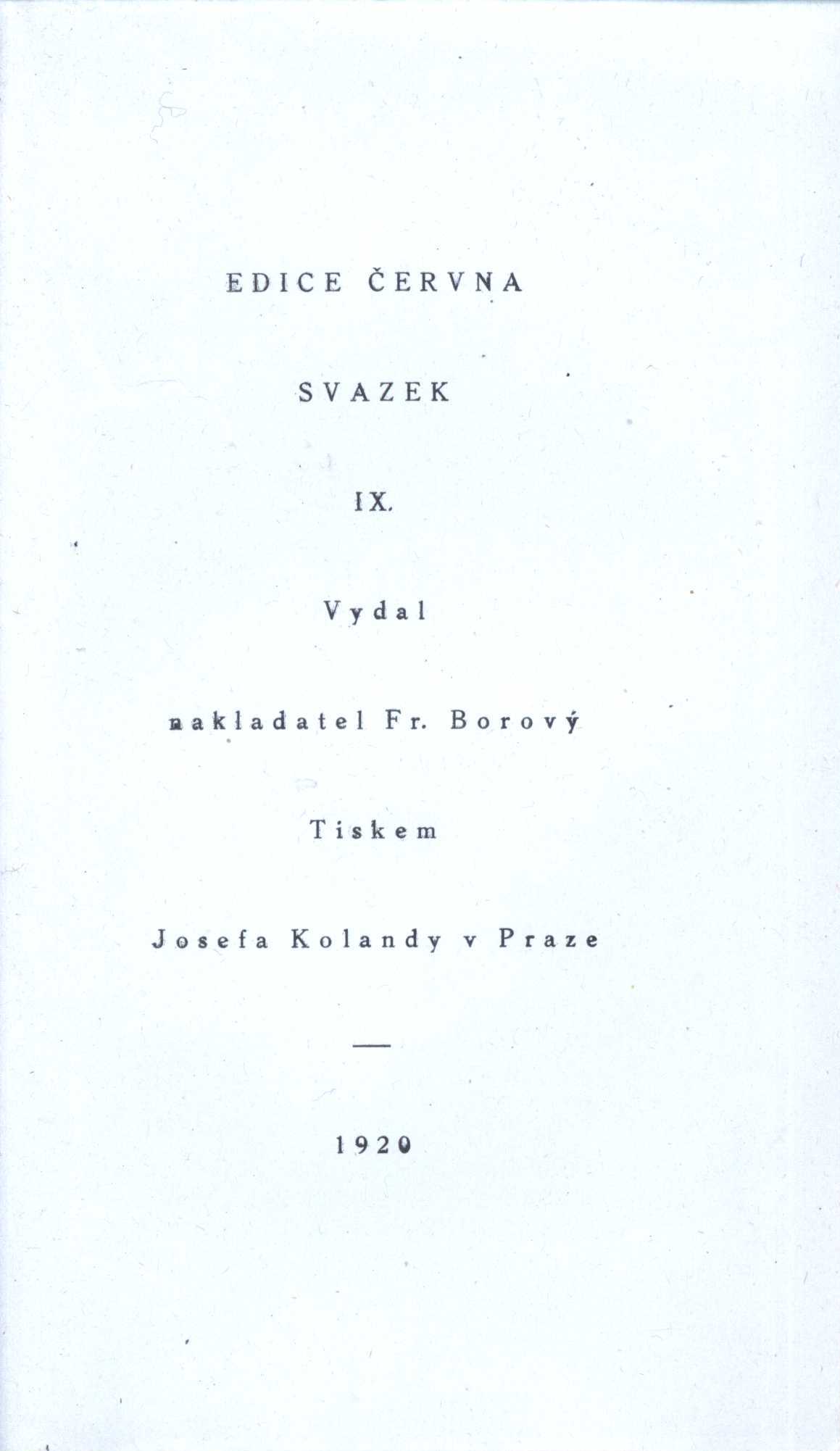 Názvové údaje Opičí žlázy : nechte se omladit : fraška o třech jednáních / napsal Jindra Adamec Osobní jméno Adamec, Jindra, 1903-1973 (Autor) Další autoři Fr. Švejda (nakladatelství) (Nakladatel, vydavatel) Josef Kolanda (Praha) (Tiskař) Nakladatel Praha : Frant. Švejda, 1930 Výrobce Jos. Kolanda Rozsah 88 stran Klíčová slova česká dramata * divadelní hry * veselohry Počet ex. 1, z toho volných 1 Druh dok. monografie Signatura P 44 F 112 Názvové údaje J. Ex. hrabě František Thun z Hohenšteina, c. k. místodržící v království Českém : kritika úřadní činnosti Jeho Excelence. Část III. / napsal J. Arbes Osobní jméno Arbes, Jakub, 1840-1914 (Autor) (Nakladatel, vydavatel) Další autoři Josef Kolanda (Praha) (Nakladatel, vydavatel) Nakladatel Na Smíchově : J. Arbes, 1895 Výrobce Knihtiskárna Vondruška a Kolanda Rozsah 638 stran ; 22 cm Osobní hesla Thun-Hohenstein, František de Paula Antonín, hrabě, 1847-1916 - právník a politik, říšský poslanec, Rytíř Zlatého rouna Klíčová slova politici * šlechtici * vláda * politika * Česko * Rakousko-Uhersko * stol. 19. * studie Počet ex. 1, z toho volných 1 Druh dok. monografie Signatura M 63 a 41/3 Názvové údaje Hlad / Knut Hamsun ; z norštiny přeložila M. Lesná-Krausová Osobní jméno Hamsun, Knut, 1859-1952 (Autor) Další autoři Krausová-Lesná, Milada, 1888-1961 (Překladatel) Korp. Nakladatelství Alois Hynek (Nakladatel, vydavatel) Josef Kolanda (Praha) (Tiskař) Unifikovaný název Sult. Česky Nakladatel V Praze : nakladatel Alois Hynek, 1932 Výrobce (knihtiskárna Josefa Kolandy) Rozsah 208 s., [1] l. obr. příl. ; 18,8 cm Klíčová slova norská literatura * próza * překlad * román Počet ex. 1, z toho volných 1 Druh dok. monografie Signatura OŘíha 190 Názvové údaje Posvátné ohně : legendy / Jiřího Karáska ze Lvovic Osobní jméno Karásek ze Lvovic, Jiří, 1871-1951 (Autor) (Autor podpisu) (Dedikátor) Další autoři Šimek, Rudolf (Nakladatel, vydavatel) Helbling, Vilibald, 1884- (Dřívější majitel) Korp. Josef Kolanda (Praha) (Tiskař) Nakladatel Praha : Rudolf Šimek, 1921 Výrobce (Knihtiskárna J. Kolanda) Rozsah 190 s. Klíčová slova Židé * novely * bibliofilie * česká próza * přelom 19. a 20. stol. * dekadence * moderní česká próza * apokryfy * bibliofilská vydání Počet ex. 2, z toho volných 2 Druh dok. monografie Signatura KaG V A 64, VMartínek 1386 Názvové údaje Překvapení v posteli : fraška o 3 jednáních / napsal Jiří Anger Osobní jméno Langer, Stanislav, (Autor) 1887-1967 Další autoři Evžen Rosendorf (nakladatelství) (Nakladatel, vydavatel) Josef Kolanda (Praha) (Tiskař) Nakladatel Praha : Evžen K. Rosendorf, [1928] Výrobce Josef Kolanda Rozsah 68 stran Klíčová slova česká dramata * komedie * divadelní hry Počet ex. 1, z toho volných 1 Druh dok. monografie Signatura P 44 f 61 Názvové údaje Stát a revoluce / Mikuláš Lenin ; přeložil Josef Reiner Osobní jméno Lenin, Vladimir Iľjič, 1870-1924 (Autor) Další autoři Reiner, Josef, 1897-1920 (Překladatel) Brunner, Vratislav Hugo, 1886-1928 (Autor obálky) (Knižní grafik) Korp. Fr. Borový (firma) (Nakladatel, vydavatel) Josef Kolanda (Praha) (Tiskař) Nakladatel Praha : Fr. Borový, 1920 Výrobce Josef Kolanda) Rozsah 145 s. Klíčová slova stát * revoluce * marxistické pojetí Počet ex. 3, z toho volných 3 Druh dok. monografie Signatura N/A, AFB 2158, AFB 2158a Názvové údaje Žalář nejtemnější : román / Ivan Olbracht Osobní jméno Olbracht, Ivan, 1882-1952 (Autor) Další autoři Brunner, Vratislav Hugo, 1886-1928 (Autor obálky) Korp. Fr. Borový (firma) (Nakladatel, vydavatel) Josef Kolanda (Praha) (Tiskař) Nakladatel V Praze : nakladatel Fr. Borový, 1921 Výrobce (tiskem J. Kolandy) Rozsah 186, [2] s. ; 8° Klíčová slova česká literatura * próza * román Počet ex. 2, z toho volných 2 Druh dok. monografie Signatura AFB 0186, AFB 0186a Názvové údaje Podobizna Doriana Graye / Oscar Wilde ; [román ... přeložen podle anglického vydání z roku 1908 Emanuelem Lešehradem ; a zvláště vyzdoben originálními komposicemi malíře a grafika Jana Konůpka] Osobní jméno Wilde, Oscar, 1854-1900 (Autor) Další autoři Lešehrad, Emanuel, 1877-1955 (Překladatel) (Dedikátor) Konůpek, Jan, 1883-1950 (Ilustrátor) Karásek ze Lvovic, Jiří, 1871-1951 (Dedikant) Korp. Nakladatelství Alois Hynek (Nakladatel, vydavatel) Josef Kolanda (Praha) (Tiskař) Nakladatel Praha : Nakladatelství Aloise Hynka, 1927 Výrobce (Josef Kolanda) Rozsah 289 s. : il. Klíčová slova britská literatura * próza * román * dekadence Počet ex. 1, z toho volných 1 Druh dok. monografie Signatura KaG XVI B2 164 Názvové údaje Aristainetos : listy o lásce a milování / knihu přeložila z originálu z latiny Libuše Bartošová podle jediného výtisku chovaného v pražské Universitní knihovně Autor Aristainetos, činný 5. století (Autor) Další autoři Bartošová, Libuše (Překladatel) Beneš, Oldřich (Nakladatel, vydavatel) Korp. Nakladatelství Ostrov (1991-2020) (Nakladatel, vydavatel) Josef Kolanda (Praha) (Tiskař) Nakladatel Na Žižkově [Praha] : Ostrov, 1926 Výrobce Josef Kolanda Rozsah 178 stran : 5 obrazových příloha Klíčová slova řecká literatura * antická literatura Počet ex. 1, z toho volných 1 Druh dok. monografie Signatura P 77 g 56 Názvové údaje Mysterie / Knut Hamsun ; z norštiny přeložila M. Lesná-Krausová Osobní jméno Hamsun, Knut, 1859-1952 (Autor) Další autoři Krausová-Lesná, Milada, 1888-1961 (Překladatel) Korp. Nakladatelství Alois Hynek (Nakladatel, vydavatel) Josef Kolanda (Praha) (Tiskař) Nakladatel V Praze : Nakladatel Alois Hynek, 1931 Výrobce V Praze : Knihtiskárna Josefa Kolandy Rozsah 344 stran ; 19 cm Klíčová slova norská literatura * próza * Hamsun K. * román * český překlad * Lesná-Krausová M. * r. 1931 Počet ex. 1, z 