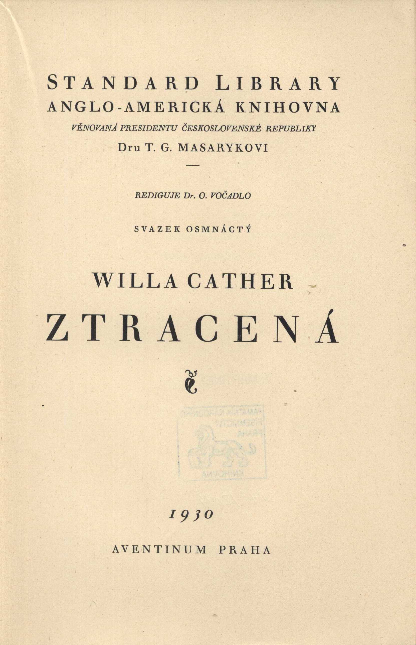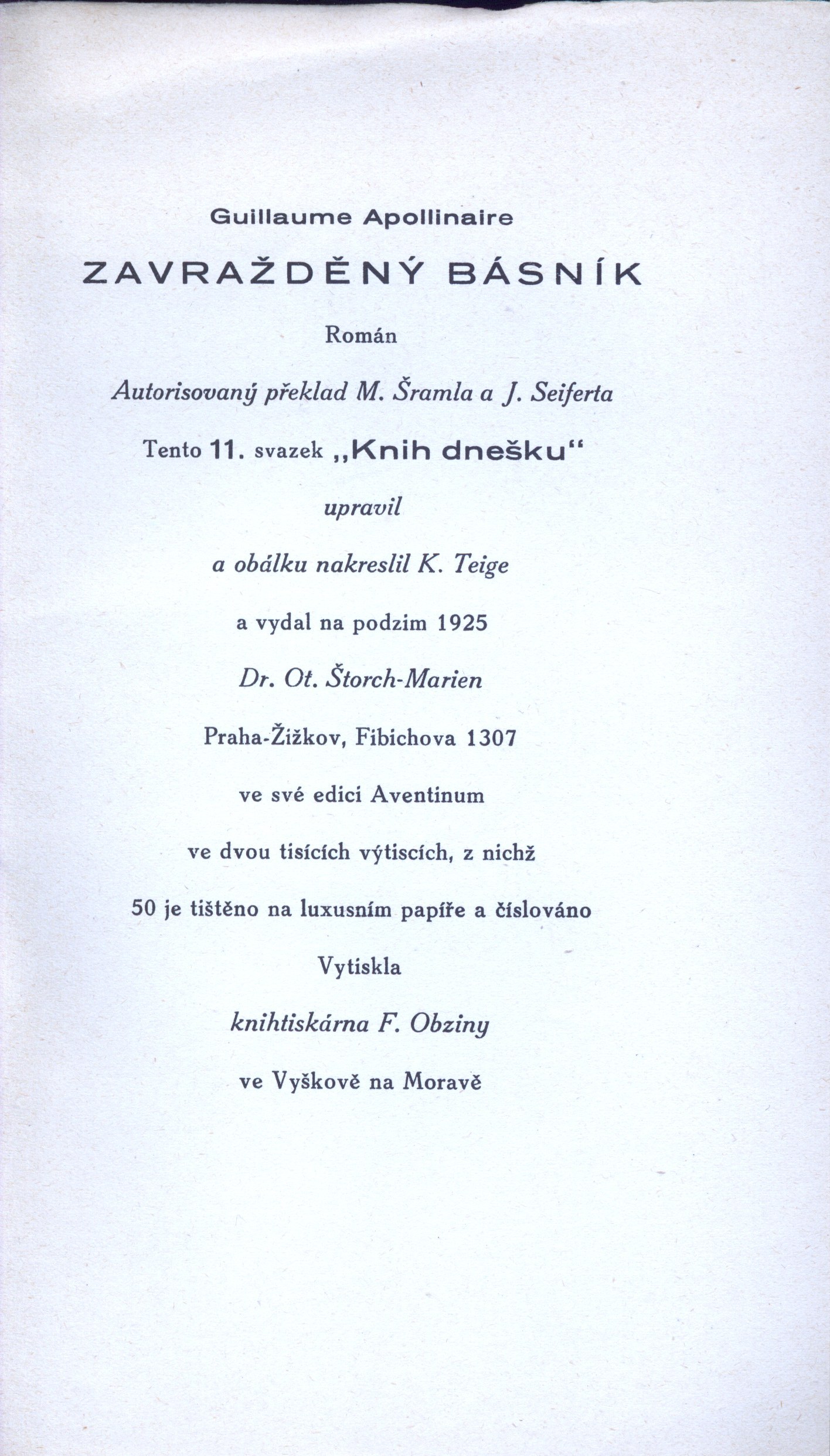 Názvové údaje Básně G[uillaumea] Apollinairea : vybrané z knih: Hnijící kouzelník, Alkoholy, Kalligramy / překlad Miloše Hlávky s použitím K. Čapkova Pásma ; upravil F. Muzika Osobní jméno Apollinaire, Guillaume, 1880-1918 (Autor) Další autoři Hlávka, Miloš, 1907-1945 (Překladatel) Čapek, Karel, 1890-1938 (Jiná role) Muzika, František, 1900-1974 (Knižní grafik) Korp. Aventinum (nakladatelství) (Nakladatel, vydavatel) Vokolek, Václav (tiskárna : Pardubice) (Tiskař) Nakladatel Praha : Aventinum, 1929 Výrobce V Pardubicích : Václav Vokolek Rozsah 68 stran : Klíčová slova francouzská poezie * výbory * stol. 20. Počet ex. 3, z toho volných 3 Druh dok. monografie Signatura M 183 f 68, P 107 a 51, P 91 g 15 Názvové údaje Zavražděný básník : román / Guillaume Apollinaire ; [autorisovaný překlad M. Šramla a J. Seiferta ; upravil a obálku nakreslil K. Teige] Osobní jméno Apollinaire, Guillaume, 1880-1918 (Autor) Další autoři Teige, Karel, 1900-1951 (Knižní grafik) (Autor obálky) Seifert, Jaroslav, 1901-1986 (Překladatel) Štorch-Marien, Otakar, 1897-1974 (Nakladatel, vydavatel) Bernard, Maxim, 1902-1949 (Překladatel) Korp. Aventinum (nakladatelství) (Nakladatel, vydavatel) František Obzina (tiskárna, nakladatelství) (Tiskař) Nakladatel Praha : Dr. Ot. Štorch-Marien, 1925 Výrobce Knihtiskárna F. Obziny) Rozsah 84 s. Klíčová slova francouzská literatura * francouzská próza * román * avantgarda Počet ex. 1, z toho volných 1 Druh dok. monografie Signatura KaG XV C 145 Názvové údaje Zavražděný básník : román / Guillaume Apollinaire ; autorisovaný překlad M. Šramla a J. Seiferta Osobní jméno Apollinaire, Guillaume, 1880-1918 (Autor) Další autoři Seifert, Jaroslav, 1901-1986 (Překladatel) Šraml, Max, 1902-1949 (Překladatel) Teige, Karel, 1900-1951 (Autor obálky) (Knižní grafik) Mrkvička, Otakar, 1898-1957 (Autor obálky) Hořejší, Jindřich, 1886-1941 (Dřívější majitel) Korp. Dr. Ot. Štorch-Marien (nakladatelství) (Nakladatel, vydavatel) Aventinum (nakladatelství) (Nakladatel, vydavatel) František Obzina (tiskárna, nakladatelství) (Tiskař) Nakladatel Praha : Aventinum, Dr. Ot. Štorch-Marien, 1925 Výrobce Ve Vyškově na Moravě : knihtiskárna F. Obziny Rozsah 84 stran ; 22 cm Klíčová slova francouzská literatura * próza * Apollinaire G. * román * český překlad * Šraml M. * Seifert J. * r. 1925 Počet ex. 2, z toho volných 2 Druh dok. monografie Signatura OŘíha 323, AHO 0382 Názvové údaje Deset let Aventina : 1919-1929 : seznam knih vydaný k 15. září roku 1929 Záhlaví-korpor. Aventinum (nakladatelství) (Nakladatel, vydavatel) Další autoři Štorch-Marien, Otakar, 1897-1974 (Autor úvodu atd.) Korp. František Obzina (tiskárna, nakladatelství) (Tiskař) Nakladatel Praha : Aventinum, 1929 Výrobce Knihtiskárna F. Obziny) Rozsah 67 s. Klíčová slova česká literatura * česká nakladatelství * katalog nakladatelství * knihy Počet ex. 1, z toho volných 1 Druh dok. monografie Signatura KaG V B 17 Názvové údaje Londýnský antikvář / Arnold Bennett ; [přeložila Ludmila Vočadlová ; obálku navrhl Josef Čapek] Osobní jméno Bennett, Arnold, 1867-1931 (Autor) Další autoři Vočadlová, Ludmila, 1895-1982 (Překladatel) Čapek, Josef, 1887-1945 (Autor obálky) Korp. Aventinum (nakladatelství) (Nakladatel, vydavatel) Orbis (tiskárna) (Tiskař) Nakladatel Praha : Aventinum, 1931 Výrobce (Orbis) Rozsah 304 s. ; 22 cm Klíčová slova anglická próza * romány Počet ex. 1, z toho volných 1 Druh dok. monografie Signatura VMartínek 1016 Názvové údaje Moje pohádka : cyklus šesti dřevorytů / František Bílek Osobní jméno Bílek, František, 1872-1941 (Autor) (Ilustrátor) (Grafický technik) Další autoři Karásek ze Lvovic, Jiří, 1871-1951 (Autor podpisu) Korp. Aventinum (nakladatelství) (Nakladatel, vydavatel) František Obzina (tiskárna, nakladatelství) (Tiskař) Nakladatel Praha : Aventinum, 1921 Výrobce Fr. Obzina) Rozsah [6] s., [6] l. obr. příl. : il. Klíčová slova česká literatura * české umění * česká grafika * grafické listy * album * dřevoryty * bibliofilie * bibliofilská vydání * bibliofilské tisky Počet ex. 1, z toho volných 1 Druh dok. monografie Signatura KaG X B 16 Názvové údaje Ztracená / Willa Cather ; [přeložila Ludmila Vočadlová ; obálku navrhl Josef Čapek] Osobní jméno Cather, Willa Sibert, 1873-1947 (Autor) Další autoři Vočadlová, Ludmila, 1895-1982 Čapek, Josef, 1887-1945 (Překladatel) Korp. Aventinum (nakladatelství) (Nakladatel, vydavatel) Orbis (tiskárna) (Tiskař) Nakladatel Praha : Aventinum, 1930 Rozsah 111 s. ; 22 cm Klíčová slova americká próza * romány Počet ex. 1, z toho volných 1 Druh dok. monografie Signatura VMartínek 1012 Názvové údaje Pan-Evropa / R. Coudenhove-Kalergi ; [v překladu O. Laurinové ; s předmluvou Ed. Beneše] Osobní jméno Coudenhove-Kalergi, Richard Nicolaus von, 1894-1972 (Autor) Další autoři Laurinová, Olga, 1892-1950 (Překladatel) Beneš, Edvard, 1884-1948 (Autor úvodu atd.) Korp. Aventinum (nakladatelství) (Nakladatel, vydavatel) Orbis (tiskárna) (Tiskař) Nakladatel Praha : Aventinum, 1926 Výrobce (Orbis) Rozsah 111 s., [1] příl. Klíčová slova německá literatura * Evropa * evropanství * evropská politika Počet ex. 1, z toho volných 1 Druh dok. monografie Signatura KaG XXV B 2 Názvové údaje Adam stvořitel : komedie o sedmi obrazech / bratří Čapkové ; [v úpravě Josefa Čapka] Osobní jméno Čapek, Josef, 1887-1945 (Autor) (Knižní grafik) Další autoři Čapek, Karel, 1890-1938 (Autor) Korp. Dr. Ot. Štorch-Marien (nakladatelství) (Nakladatel, vydavatel) Aventinum (nakladatelství) (Nakladatel, vydavatel) František Obzina (tiskárna, nakladatelství) (Tiskař) Nakladatel Praha : Aventinum, Dr. Ot. Štorch-Marien, 1928 Výrobce F. Obzina) Rozsah 92 s. : il. ; 22 cm Klíčová slova č