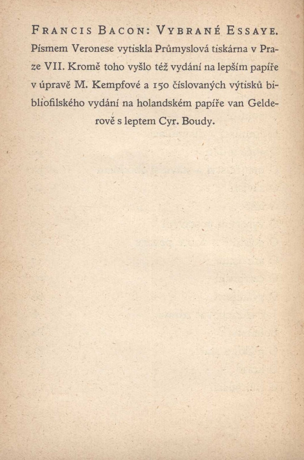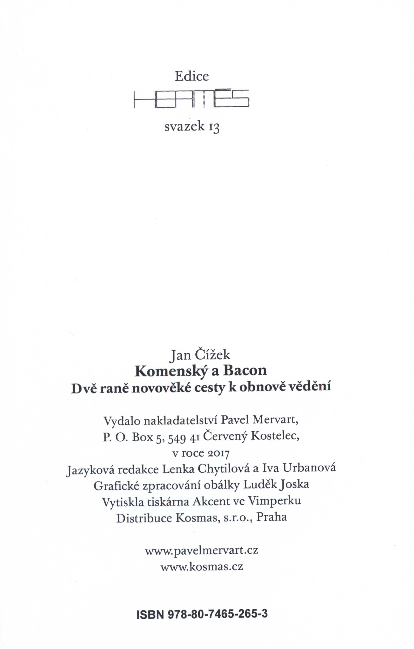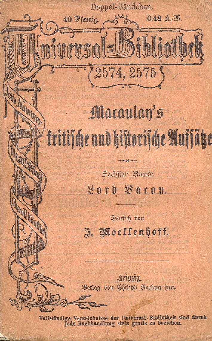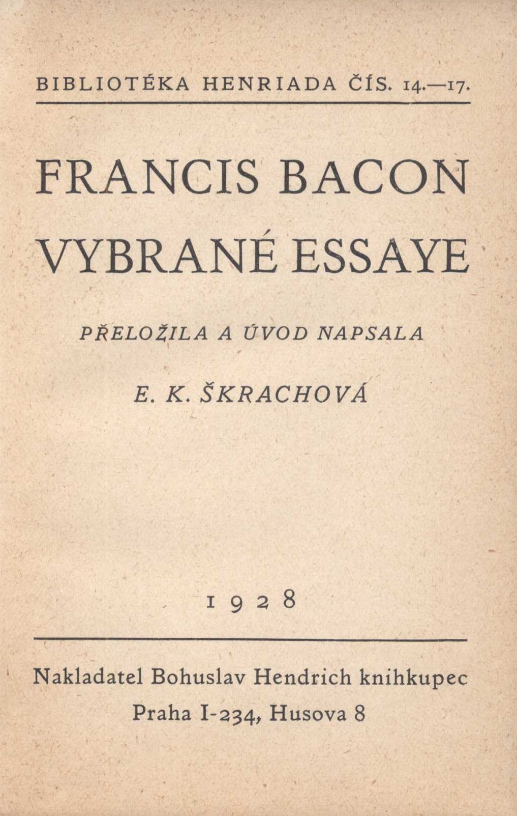 Názvové údaje Eseje, čili, Rady občanské a mravní / Francis Bacon ; z anglického originálu Essays ... přeložil, poznámky a doslov napsal Alois Bejblík ; typografie Jan Solpera Osobní jméno Bacon, Francis, 1561-1626 (Autor) Další autoři Bejblík, Alois, 1926-1990 (Překladatel) Solpera, Jan, 1939- (Grafický technik) Korp. Odeon (nakladatelství) (Nakladatel, vydavatel) Stráž, tiskařské závody (Tiskař) Nakladatel Praha : Odeon, 1985 Výrobce Vimperk : Stráž Rozsah 212 stran Klíčová slova anglická literatura * filozofie * etika * eseje Počet ex. 2, z toho volných 2 Druh dok. monografie Signatura NK/85 0048, NK 230 Názvové údaje Franz Baco's Neues Organon / uebersetzt, erläutert und mit einer Lebensbeschreibung des Verfassers versehen von J. H. v. Kirchmann Osobní jméno Bacon, Francis, 1561-1626 (Autor) Další autoři Kirchmann, Julius H. von, 1802-1884 (Autor úvodu atd.) (Překladatel) Korp. L. Heimann (nakladatelství) (Nakladatel, vydavatel) Gebrüder Grunert (tiskárna) (Tiskař) Nakladatel Berlin : Verlag von L. Heimann, 1870 Výrobce (Gebrüder Grunert) Rozsah vii, 386 s. Klíčová slova britská literatura * filozofie Počet ex. 1, z toho volných 1 Druh dok. monografie Signatura VHB 3985 Názvové údaje Nová Atlantis / Francis Bacon ; z anglického originálu Francis Bacon, The New Atlantis ... přeložil Konstantin Jelínek Osobní jméno Bacon, Francis, 1561-1626 (Autor) Další autoři Jelínek, Konstantin, 1891-1972 (Překladatel) Sviták, Ivan, 1925-1994 (Editor) Rossmann, Zdeněk, 1905-1984 (Autor obálky) Korp. Nakladatelství Rovnost (Nakladatel, vydavatel) Svoboda (tiskárna) (Tiskař) Nakladatel Praha : Nakladatelství Rovnost, 1952 Výrobce Brno : Svoboda 05, n. p. Rozsah 52 stran, 2 nečíslované listy obrazové přílohy : ilustrace ; 21 cm Klíčová slova anglická literatura * Bacon F. * překlad * Jelínek K. * filozofie * sociologie * utopické myšlení * utopie Počet ex. 6, z toho volných 6 Druh dok. monografie Signatura VHB 0004, VZinková 0172, P 46 e 174, P 142 a 49, Janeček 1244, P 77 f 3 Názvové údaje Vybrané essaye / Francis Bacon / přeložila a úvod napsala E.K. Škrachová Osobní jméno Bacon, Francis, 1561-1626 (Autor) Další autoři Škrachová, Ema, nar. 1891 (Překladatel) (Autor úvodu atd.) Korp. Bohuslav Hendrich (nakladatelství) (Nakladatel, vydavatel) Průmyslová tiskárna v Praze (Tiskař) (Tiskař obrazu) Nakladatel Praha : Nakladatel Bohuslav Hendrich knihkupec, 1928 Výrobce V Praze : Průmyslová tiskárna Rozsah 103 stran, 1 nečíslovaný list obrazové přílohy : ilustrace ; 15 cm Osobní hesla Bacon, Francis, 1561-1626 - anglický filozof, spisovatel a politik Klíčová slova anglická literatura * Bacon F. * próza * eseje * výbor esejů * český překlad * Škrachová E. K. * r. 1928 Počet ex. 1, z toho volných 1 Druh dok. monografie Signatura VZinková 0743 Názvové údaje Vybrané essaye / Francis Bacon ; přeložila E. K. Škrachová Osobní jméno Bacon, Francis, 1561-1626 (Autor) Další autoři Škrachová, Ema, nar. 1891 (Překladatel) Bouda, Cyril, 1901-1984 (Knižní grafik) (Ilustrátor) Korp. Bohuslav Hendrich (nakladatelství) (Nakladatel, vydavatel) Průmyslová tiskárna v Praze (Tiskař) Nakladatel Praha : nakladatel Bohuslav Hendrich, 1928 Výrobce V Praze : Průmyslová tiskárna Rozsah 103 stran, 1 nečíslovaný list obrazové přílohy : ilustrace ; 16 cm Klíčová slova filozofie * anglická literatura * Bacon F. * eseje * esejistické texty * zahrady * český překlad * Škrachová E. K. Počet ex. 4, z toho volných 4 Druh dok. monografie Signatura VHB 0005, AHO 0066, M 47 g 28, M 126 f 11 Názvové údaje Komenský a Bacon : dvě raně novověké cesty k obnově vědění / Jan Čížek ; grafické zpracování obálky Luděk Joska Osobní jméno Čížek, Jan, 1986- (Autor) Další autoři Joska, Luděk, 1974- (Knižní grafik) Korp. Nakladatelství Pavel Mervart (Nakladatel, vydavatel) Akcent tiskárna Vimperk (Tiskař) Nakladatel Červený Kostelec : Pavel Mervart, 2017 Výrobce Ve Vimperku : Akcent Rozsah 214 stran ; 21 cm Osobní hesla Bacon, Francis, 1561-1626 - anglický filozof, spisovatel a politik * Komenský, Jan Amos, 1592-1670 - pedagog, českobratrský teolog Klíčová slova filozofové * Anglie * stol. 16.-17. * pedagogové * filozofové * Česko * stol. 17. * vědění * vzdělávání * interpretace díla * monografie Počet ex. 1, z toho volných 1 Druh dok. monografie Signatura C12b 17980 Názvové údaje Essaye čili Rady politické a mravní Francise Bacona lorda Verulamského = The essayes or counsels civill and morall of Francis Bacon lord Verulam / napsal a přeložil Břetislav Foustka, Francis Bacon Osobní jméno Foustka, Břetislav, 1862-1947 Další autoři Bacon, Francis, 1561-1626 (Autor) Nakladatel Praha : Česká akademie věd a umění, 1933 Rozsah 182, 176 s. ; 24 cm Klíčová slova česká literatura Počet ex. 1, z toho volných 1 Druh dok. monografie Signatura Holan 512 Názvové údaje Literary essays / by Macaulay Osobní jméno Macaulay, Thomas Babington Macaulay, baron, 1800-1859 (Autor) Další autoři Richard Clay and Sons (Tiskař) The Amalgamated Press (nakladatelství) (Nakladatel, vydavatel) Nakladatel London : The Amalgamated Press : 1905 : Výrobce Richard Clay & Sons) Rozsah xvi, 473 s. Osobní hesla Milton, John, 1608-1674 - britský spisovatel * Moore, George, 1852-1933 - irský prozaik, esejista, básník a dramatik, výtvarný kritik * Johnson, Samuel, 1709-1784 - britský literární vědec * Bunyan, John, 1628-1688 * Bacon, Francis, 1561-1626 * Addison, Joseph, 1672-1719 Klíčová slova britská literatura * britská poezie * anglická literatura * anglická poezie * esej * eseje * esejistické texty Počet ex. 1, z toho volných 1 Druh dok. monografie Signatura VHB 2795 Názvové údaje Macaulays kritische und historische Aufsätze. Sechster Band, Lord Bacon / Deutsch von J. Woellenhoff 