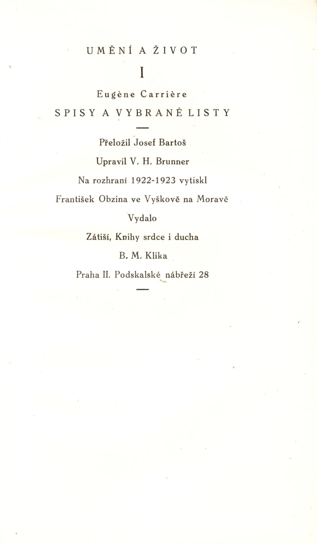 Názvové údaje Antonín Dvořák : kritická studie / Josef Bartoš Osobní jméno Bartoš, Josef, 1887-1952 (Autor) Další autoři Pelcl, Josef, 1861-1916 (Nakladatel, vydavatel) Korp. E. Leschinger (knihtiskař, nakladatel) (Tiskař) Nakladatel V Praze : Nákladem Josefa Pelcla, 1913 Výrobce (Tiskem E. Leschingra) Rozsah 447 s. Osobní hesla Dvořák, Antonín, 1841-1904 - hudební skladatel Klíčová slova česká literatura * česká hudba * česká hudební tvorba * čeští hudebníci * hudební skladatelé * stol. 19., 2. pol. * hudba Počet ex. 1, z toho volných 1 Druh dok. monografie Signatura KaG XXVIII G2 71 Názvové údaje Miroslav Tyrš : studie kritická : s 22 přílohami / Jos. Bartoš Osobní jméno Bartoš, Josef, 1887-1952 (Autor) Další autoři Vaníček, Karel, 1860-1926 (Dřívější majitel) Korp. "Grafia", dělnická knihtiskárna (tiskárna, nakladatelství) (Tiskař) Spolek výtvarných umělců Mánes (Nakladatel, vydavatel) Nakladatel Praha : Nákladem Spolku výtvarných umělců Manes, 1916 Výrobce (Tiskem Grafie, dělnické tiskárny) Rozsah 100 s., [22] příl. Osobní hesla Tyrš, Miroslav, 1832-1884 - univerzitní profesor, historik umění, zakladatel Sokola Klíčová slova česká literatura * studie * sport * tělesná výchova * filozofie * metodika * estetika * Sokol * Tyrš M. * r. 1916 Počet ex. 7, z toho volných 7 Druh dok. monografie Signatura MUK 368, LK Knytl 1656, LK P 54 f 55, LK P XVII d 18, LK M 200 c 28, KaG XIII D 183, KaG XXXVIII B 24 Názvové údaje Otakar Ostrčil / Josef Bartoš Osobní jméno Bartoš, Josef, 1887-1952 (Autor) Další autoři Česká akademie věd a umění (Nakladatel, vydavatel) Burda (knihtiskárna) (Tiskař) Nakladatel V Praze : Nákladem České akademie věd a umění, 1936 Výrobce (Vl. Burda) Rozsah 175 s., [1] l. obr. příl. : il. Osobní hesla Ostrčil, Otakar, 1879-1935 - hudebník, dirigent Klíčová slova česká literatura * česká hudební tvorba * česká hudba * hudební skladatelé * nekrology * monografie Počet ex. 1, z toho volných 1 Druh dok. monografie Signatura KaG XXXI A 125 Názvové údaje Prozatímní divadlo a jeho opera / Josef Bartoš ; [v úpravě M. Kalába ; obálka a kresba v titulu K. Svolinského] Osobní jméno Bartoš, Josef, 1887-1952 (Autor) Další autoři Kaláb, Method, 1885-1963 (Editor) Svolinský, Karel, 1896-1986 (Ilustrátor) (Autor obálky) Korp. Průmyslová tiskárna v Praze (Tiskař) Nakladatel V Praze : Sbor pro zřízení druhého Národního divadla, 1938 Výrobce (Průmyslová tiskárna) Rozsah 397 s. : il. Klíčová slova české divadlo * Prozatímní divadlo * opera * česká dramaturgie * historie divadla * stol. 19., léta 60.-80. Počet ex. 3, z toho volných 3 Druh dok. monografie Signatura KaG XLV D 92, KaG XXV E 58, VMartínek 0829 Názvové údaje Umění : úvod do estetiky / Josef Bartoš Osobní jméno Bartoš, Josef, 1887-1952 (Autor) Další autoři Josef Vetešník (nakladatelství) (Nakladatel, vydavatel) Knihtiskárna Garmond (Tiskař) Nakladatel V Praze : Josef Vetešník, 1922 Výrobce V Praze : Garmond Rozsah 132 stran ; 19 cm Klíčová slova česká literatura * umění * estetika * stol. 20., léta 20. * úvahy Počet ex. 2, z toho volných 2 Druh dok. monografie Signatura KaG VII C2 61, AHO 0527 Názvové údaje Zdeněk Fibich : s 18 obrazovými přílohami a 4 facsimily / Josef Bartoš Osobní jméno Bartoš, Josef, 1887-1952 (Autor) Další autoři Spolek výtvarných umělců Mánes (Nakladatel, vydavatel) "Grafia", dělnická knihtiskárna (tiskárna, nakladatelství) (Tiskař) Štencův grafický závod (Leptař) (Tiskař obrazu) Nakladatel V Praze : nákladem Spolku výtvarných umělců Manes, 1914 Výrobce (tiskem Grafie, dělnické tiskárny) Rozsah [7], 108 s., [1+21] l. obr. příl. ; 17 cm Osobní hesla Fibich, Zdeněk, 1850-1900 - hudební skladatel Klíčová slova česká literatura * biografie * monografie * hudební skladatelé * česká hudební tvorba * Fibich Z. * obrazové přílohy Počet ex. 1, z toho volných 1 Druh dok. monografie Signatura Topič 0507 Názvové údaje Zdeněk Fibich : s 18 obrazovými přílohami a 4 facsimily / Josef Bartoš Osobní jméno Bartoš, Josef, 1887-1952 (Autor) Další autoři "Grafia", dělnická knihtiskárna (tiskárna, nakladatelství) (Tiskař) Spolek výtvarných umělců Mánes (Nakladatel, vydavatel) Nakladatel Praha : Nákladem Spolku výtvarných umělců Manes, 1914 Výrobce (Tiskem Grafie, dělnické tiskárny) Rozsah 108 s., [22] příl. Osobní hesla Fibich, Zdeněk, 1850-1900 - hudební skladatel Klíčová slova česká literatura * česká hudba * monografie * česká hudební tvorba * hudební skladatelé * moderní umění * Fibich Z. Počet ex. 1, z toho volných 1 Druh dok. monografie Signatura KaG XXXVIII B 21 Názvové údaje Komika charakteru / Henri Bergson ; přeložil a úvodem opatřil Dr. Jos. Bartoš Osobní jméno Bergson, Henri, 1859-1941 (Autor) Další autoři Bartoš, Josef, 1887-1952 (Překladatel) (Autor úvodu atd.) Korp. Josef Pelcl (nakladatelství) (Nakladatel, vydavatel) Edvard Leschinger (firma) (Tiskař) Nakladatel V Praze : Nákladem Josefa Pelcla, 1916 Výrobce V Praze : Edvard Leschinger Rozsah 56 stran ; 18 cm Klíčová slova francouzská literatura * filozofie * stol. 20., léta 10.-20. * filozofická esej * charakter Počet ex. 2, z toho volných 2 Druh dok. monografie Signatura KaG XII C2 56, AHO 0529 Názvové údaje Spisy a vybrané listy / Eugene Carriere ; přeložil Josef Bartoš ; upravil V. H. Brunner Osobní jméno Carrière, Eugène, 1849-1906 (Autor) Další autoři Brunner, Vratislav Hugo, 1886-1928 (Knižní grafik) Bartoš, Josef, 1887-1952 (Překladatel) Korp. Zátiší, Knihy srdce i ducha (nakladatelství) (Nakladatel, vydavatel) František Obzina (tiskárna, nakladatelství) (Tiskař) Nakladatel Praha : Zátiší, Knihy srdce i ducha, 1922 Výrobce Ve Vyškově na Moravě : František Obzina, 19