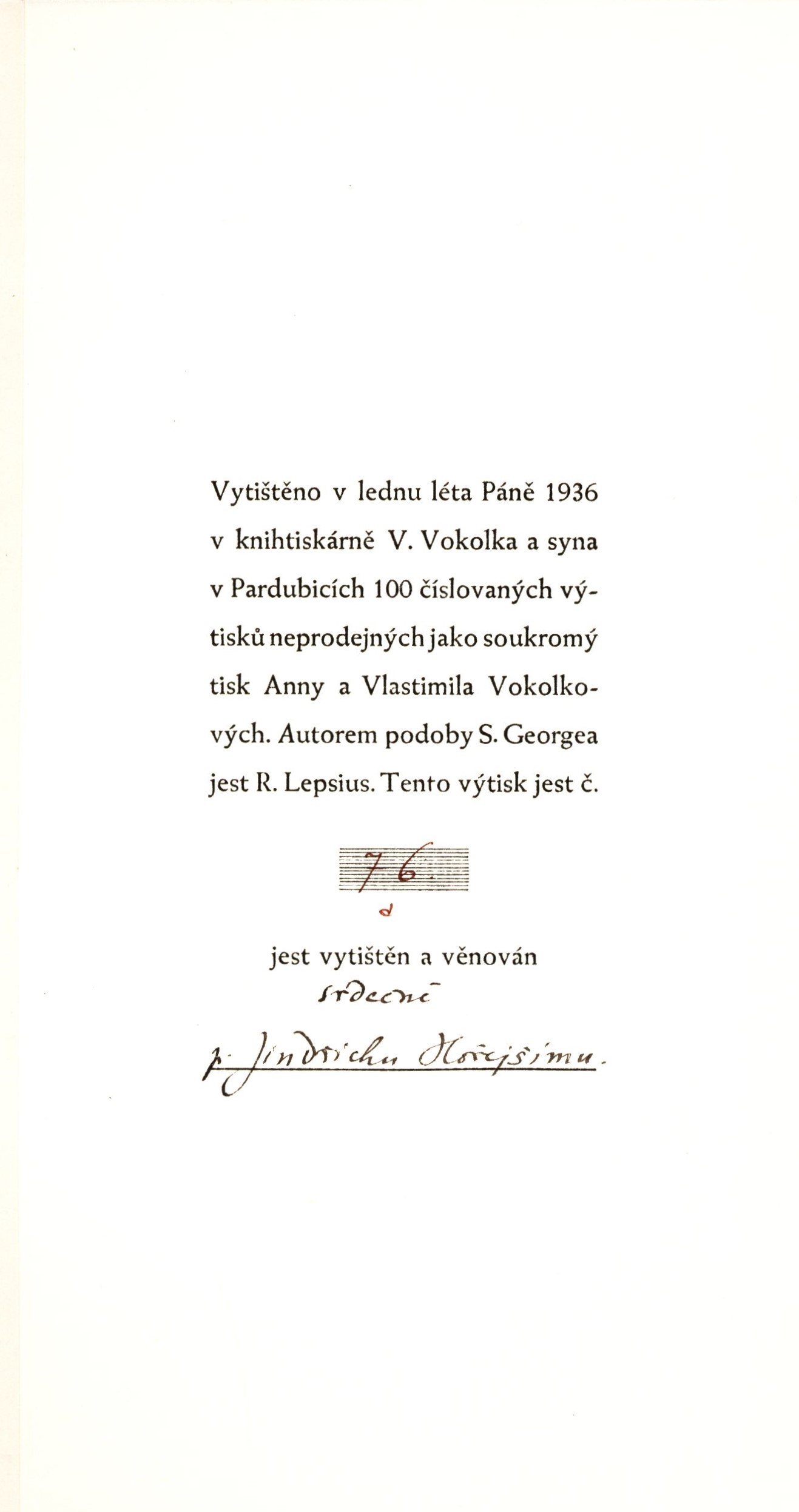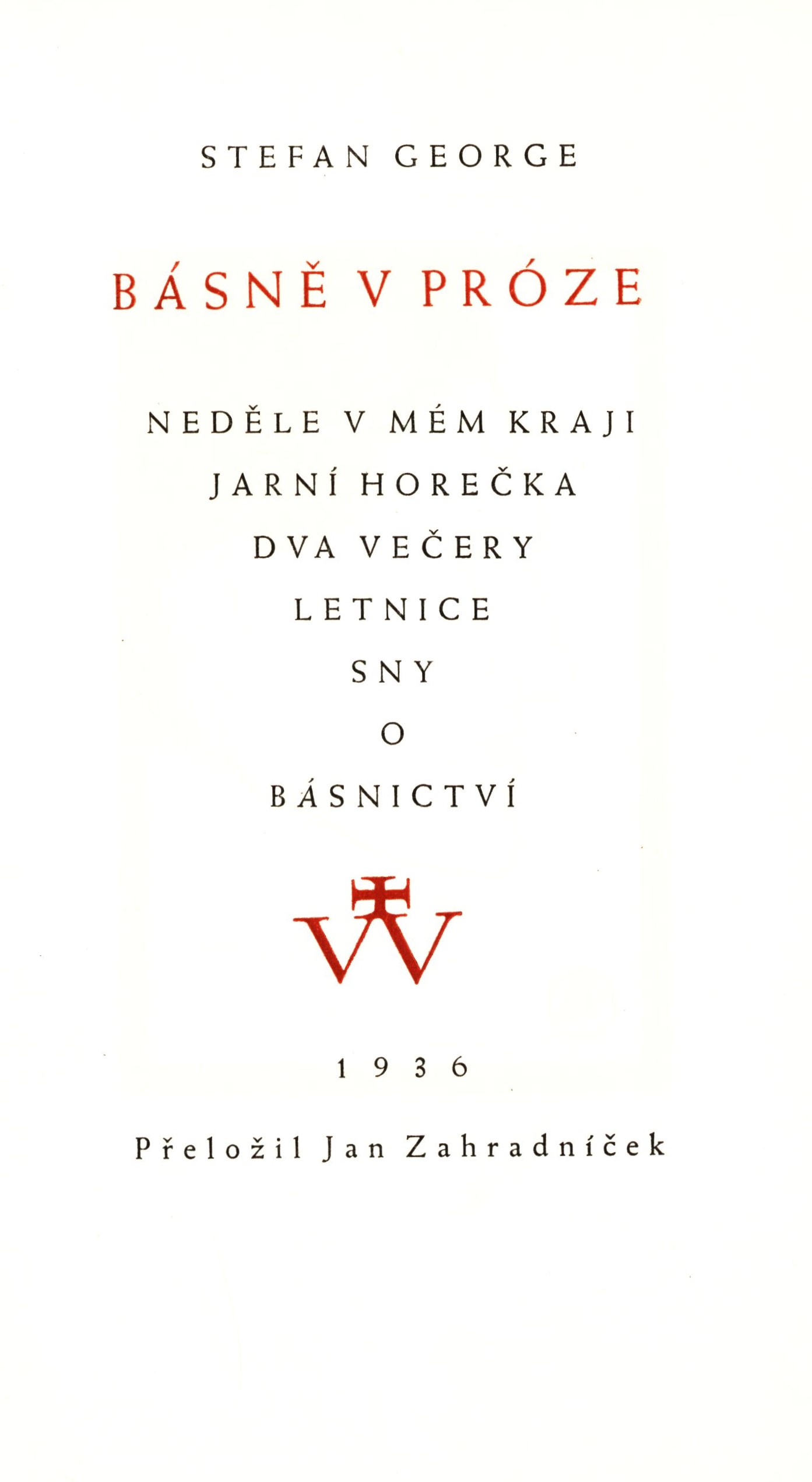 Názvové údaje Die Blumen des Boesen / Baudelaire ; umdichtungen von Stefan George Osobní jméno Baudelaire, Charles, 1821-1867 (Autor) Další autoři George, Stefan, 1868-1933 (Překladatel) (Autor úvodu atd.) Korp. Georg Bondi Verlag (Nakladatel, vydavatel) Otto von Holten (Berlin) (Tiskař) Nakladatel Berlin : Georg Bondi, 1901 Výrobce (Otto v. Holten) Rozsah 197 s. Klíčová slova francouzská literatura * francouzská poezie * dekadence Počet ex. 1, z toho volných 1 Druh dok. monografie Signatura KaG XI C 45 Názvové údaje Básně v próze / Stefan George ; přeložil Jan Zahradníček ; autorem podobizny S. Georgea R. Lepsius Osobní jméno George, Stefan, 1868-1933 (Autor) Další autoři Zahradníček, Jan, 1905-1960 (Dedikátor) (Překladatel) Holan, Vladimír, 1905-1980 (Dedikant) Hořejší, Jindřich, 1886-1941 (Dedikant) Lepsius, Reinhold, 1857-1922 (Ilustrátor) Korp. V. Vokolek a syn (nakladatelství a tiskárna) (Tiskař) Nakladatel [nakladatel není znám] Výrobce V Pardubicích : V. Vokolek a syn, 1936 Rozsah 22 stran : ilustrace ; 23 cm Osobní hesla Zahradníček, Jan, 1905-1960 - básník, překladatel, kritik a publicista katolické orientace * Holan, Vladimír, 1905-1980 - básník, prozaik, překladatel Klíčová slova poezie * sbírka básní * stol. 20., 1. pol. * překlady * překlady básně Počet ex. 2, z toho volných 2 Druh dok. monografie Signatura Holan 2097, AHO 0674 Názvové údaje Der siebente Ring / Stefan George Osobní jméno George, Stefan, 1868-1933 (Autor) Další autoři Georg Bondi Verlag (Nakladatel, vydavatel) Nakladatel Berlin : Georg Bondi, 1914 Rozsah 213 stran ; 20 cm Klíčová slova německá literatura * německá poezie * lyrická poezie Počet ex. 1, z toho volných 1 Druh dok. monografie Signatura BVolkova 1247 Názvové údaje Der Stern des Bundes / Stefan George Osobní jméno George, Stefan, 1868-1933 (Autor) Další autoři Thormaehlen, Ludwig, 1889-1956 (Ilustrátor) Korp. Georg Bondi Verlag (Nakladatel, vydavatel) Otto von Holten (Berlin) (Tiskař) Nakladatel Berlin : Georg Bondi Verlag, 1934 Výrobce (Otto von Holten) Rozsah 125 s., [1] l. obr. příl. : il. Klíčová slova německá literatura * německá poezie * dekadence * symbolismus Počet ex. 1, z toho volných 1 Druh dok. monografie Signatura VHB 3912 Názvové údaje Der Teppich des Lebens und die Lieder von Traum und Tod : mit einem Vorspiel / Stefan George Osobní jméno George, Stefan, 1868-1933 (Autor) Nakladatel Berlin : Georg Bondi, 1919 Rozsah 98 stran ; 20 cm Klíčová slova německá literatura * německá poezie * lyrická poezie Počet ex. 1, z toho volných 1 Druh dok. monografie Signatura BVolkova 1037 Názvové údaje Tři legendy / Stefan George ; [přeložil a vydal Otto F. Babler] Osobní jméno George, Stefan, 1868-1933 (Autor) Další autoři Babler, Otto František, 1901-1984 (Překladatel) (Nakladatel, vydavatel) (Autor podpisu) Korp. Lidové závody tiskařské a nakladatelské (Olomouc) (Tiskař) Nakladatel Samotíšky : Otto F. Babler, 1929 Výrobce Lidové závody tiskařské a nakladatelské) Rozsah 20 s. Klíčová slova německá literatura * německá poezie * legendy * epická poezie * epické básně * bibliofilie * bibliofilská vydání * bibliofilské tisky Počet ex. 1, z toho volných 1 Druh dok. monografie Signatura KaG XI C 120 Názvové údaje Platon a George / Zdeněk Matouš Osobní jméno Matouš, Zdeněk, 1891-1942 (Autor) Další autoři Patočka, Jan, 1907-1977 (Dedikant) Nakladatel [Česko] : [nakladatel není známý] [19--] Rozsah 29 stran ; 23 cm Osobní hesla Platón, 427 př. Kr.-347 př. Kr. - řecký filosof * George, Stefan, 1868-1933 - německý lyrik, esejista a překladatel Klíčová slova filozofie * antická filozofie * filozofické názory * filozofické myšlenky * němečtí básníci * němečtí spisovatelé * literární tvorba * stol. 19.-20. * pojednání * separát Počet ex. 1, z toho volných 1 Druh dok. monografie Signatura Patočka 0165 Názvové údaje Blaetter fuer die Kunst : eine Auslesse aus den Jahren 1892-98 / herausgegeben von Carl August Klein Další autoři Klein, Carl August, 1867-1952 (Editor) George, Stefan, 1868-1933 (Jiná role) Korp. Georg Bondi Verlag (Nakladatel, vydavatel) Nakladatel Berlin : Georg Bondi, 1899 Rozsah 172 s. Klíčová slova německá literatura * německá poezie * německá próza * časopis * časopisy * umělecká revue * výbor * výbor článků * výbor lyriky * výbor poezie * antologie * moderna * dekadence * symbolismus Počet ex. 1, z toho volných 1 Druh dok. monografie Signatura KaG XI C 57