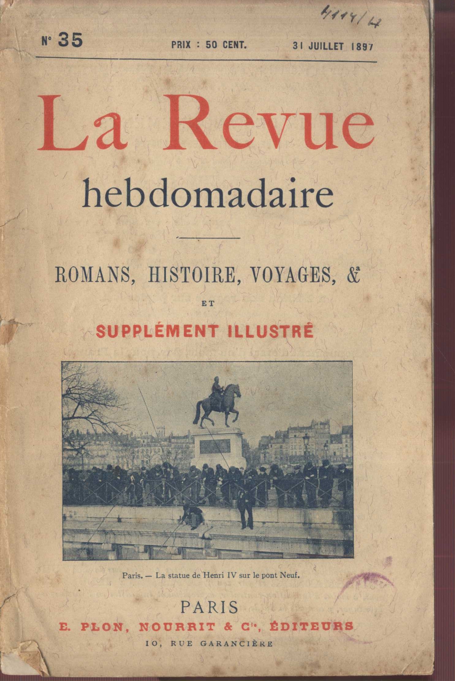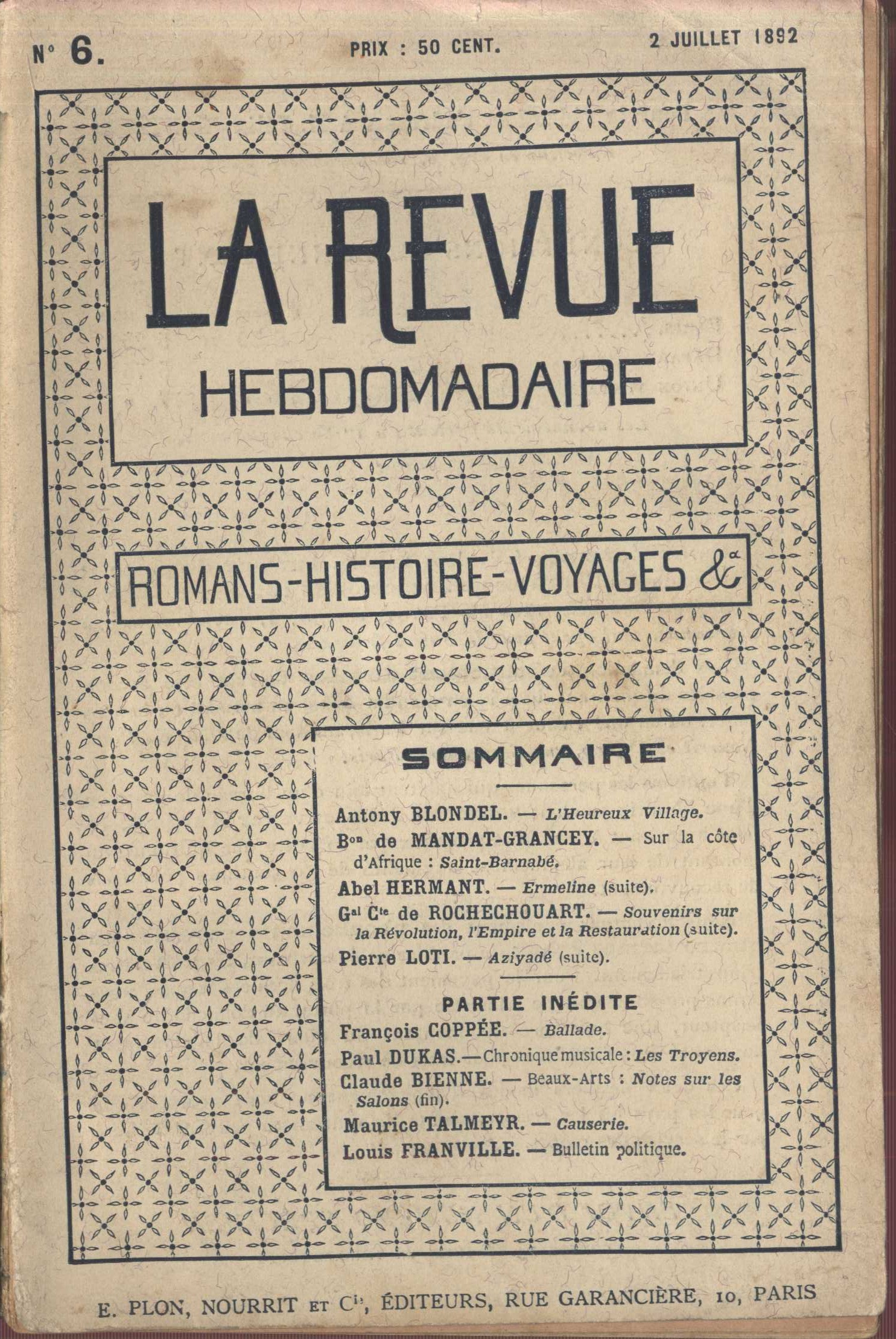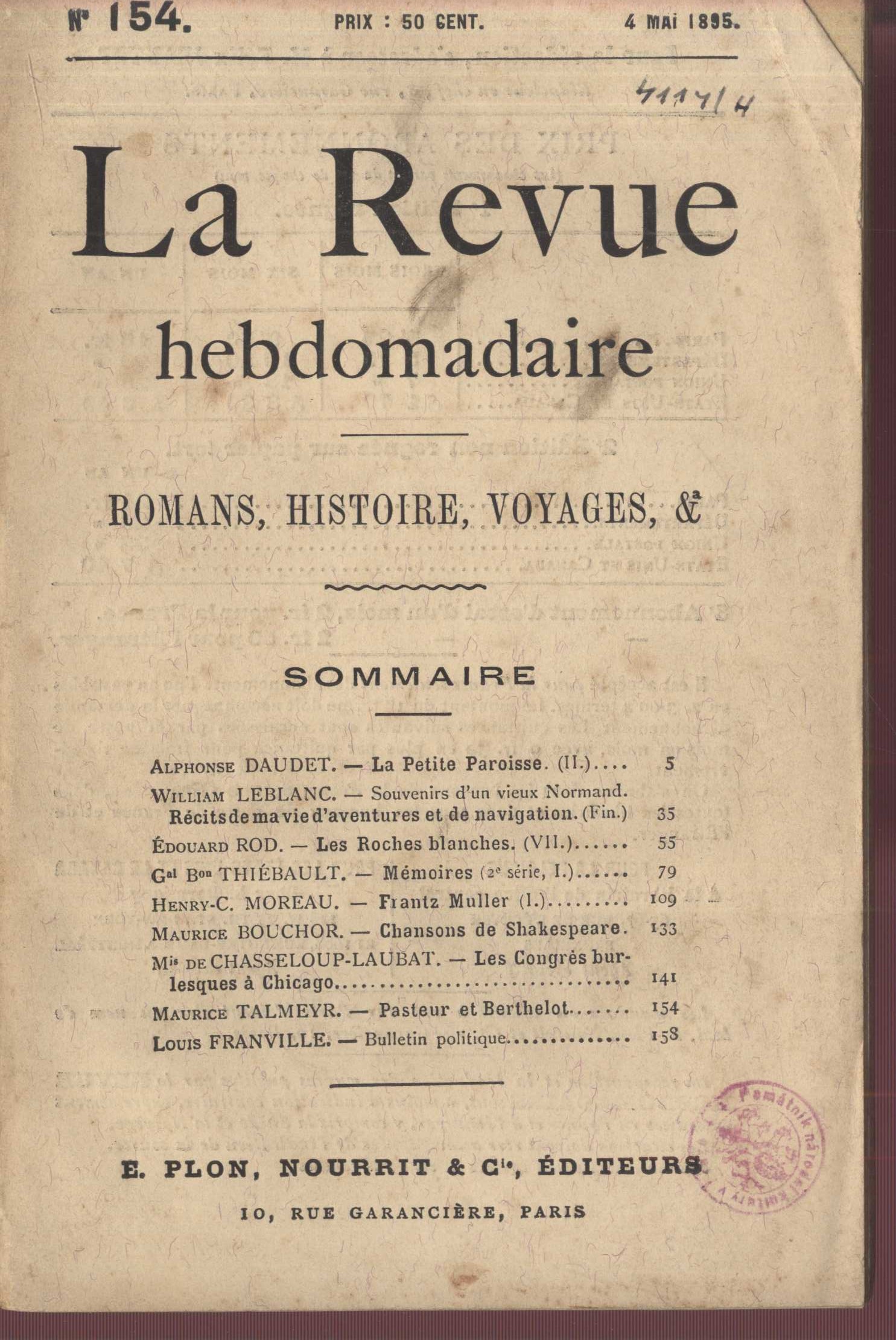 Názvové údaje La Revue hebdomaire : romans - histoire - voyages Další autoři Librairie Plon. Les petit-fils de Plon et Nourrit (Paris, Francie) (Tiskař) (Nakladatel, vydavatel) Roč., číslo Année 6, 1897 Nakladatel Paris : Librairie Plon, 1896 Rozsah strany 577-720, 16 nečíslovaných stran obrazové přílohy : ilustrace Klíčová slova francouzská literatura * francouzské časopisy * literární časopis * literární časopisy Počet ex. 1, z toho volných 1 Druh dok. periodika Signatura VHB 4114/6 Názvové údaje La Revue hebdomaire : romans - histoire - voyages Další autoři Librairie Plon. Les petit-fils de Plon et Nourrit (Paris, Francie) (Tiskař) (Nakladatel, vydavatel) Roč., číslo Année 5, 1896 Nakladatel Paris : Librairie Plon, 1896 Rozsah strany 481-640 Klíčová slova francouzská literatura * francouzské časopisy * literární časopis * literární časopisy Počet ex. 1, z toho volných 1 Druh dok. periodika Signatura VHB 4114/5 Názvové údaje La Revue hebdomaire : romans - histoire - voyages Další autoři Librairie Plon. Les petit-fils de Plon et Nourrit (Paris, Francie) (Tiskař) (Nakladatel, vydavatel) Roč., číslo Année 4, 1895 Nakladatel Paris : Librairie Plon, 1895 Rozsah 160 stran Klíčová slova francouzská literatura * francouzské časopisy * literární časopis * literární časopisy Počet ex. 1, z toho volných 1 Druh dok. periodika Signatura VHB 4114/4 Názvové údaje La Revue hebdomaire : romans - histoire - voyages Další autoři Librairie Plon. Les petit-fils de Plon et Nourrit (Paris, Francie) (Tiskař) (Nakladatel, vydavatel) Roč., číslo Année 3, 1894 Nakladatel Paris : Librairie Plon, 1893 Rozsah strany 1-160, 481-640 Klíčová slova francouzská literatura * francouzské časopisy * literární časopis * literární časopisy Počet ex. 1, z toho volných 1 Druh dok. periodika Signatura VHB 4114/3 Názvové údaje La Revue hebdomaire : romans - histoire - voyages Další autoři Librairie Plon. Les petit-fils de Plon et Nourrit (Paris, Francie) (Tiskař) (Nakladatel, vydavatel) Roč., číslo Année 2, 1893 Nakladatel Paris : Librairie Plon, 1893 Rozsah strany 161-320 Klíčová slova francouzská literatura * francouzské časopisy * literární časopis * literární časopisy Počet ex. 1, z toho volných 1 Druh dok. periodika Signatura VHB 4114/2 Názvové údaje La Revue hebdomaire : romans - histoire - voyages Další autoři Librairie Plon. Les petit-fils de Plon et Nourrit (Paris, Francie) (Tiskař) (Nakladatel, vydavatel) Roč., číslo Année 1, 1892 Nakladatel Paris : Librairie Plon, 1892 Rozsah 160 stran Klíčová slova francouzská literatura * francouzské časopisy * literární časopis * literární časopisy Počet ex. 1, z toho volných 1 Druh dok. periodika Signatura VHB 4114/1