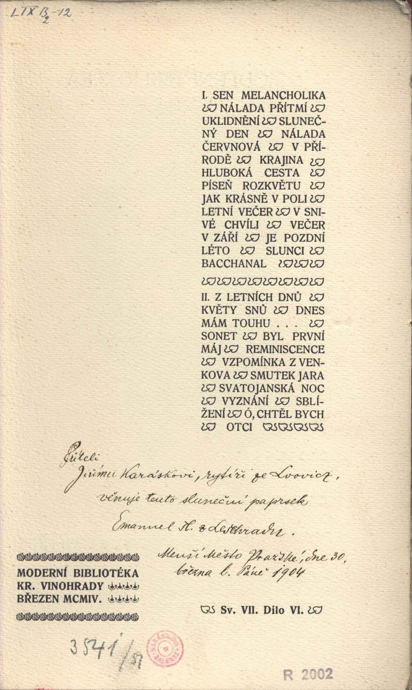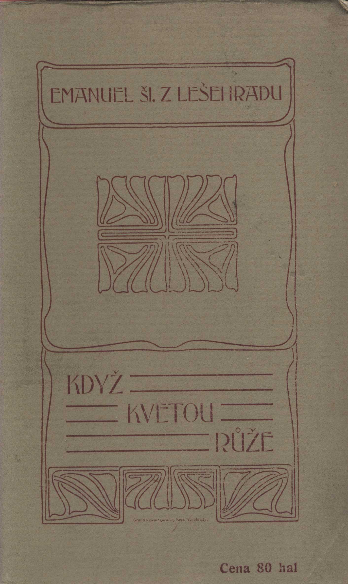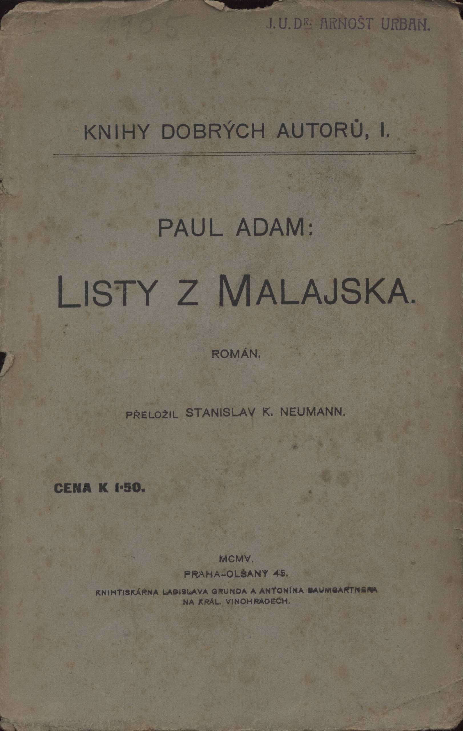 Názvové údaje Listy z Malajska : román / Paul Adam ; přeložil Stanislav K. Neumann Osobní jméno Adam, Paul, 1862-1920 (Autor) Další autoři Neumann, Stanislav Kostka, 1875-1947 (Překladatel) Neumannová, Kamila, 1874-1956 (Nakladatel, vydavatel) Korp. Knihtiskárna Ladislava Grunda a Antonína Baumgartnera (Královské Vinohrady) (Tiskař) Nakladatel Praha : Kamila Neumannová-Krémová, 1905 Výrobce (Knihtiskárna Ladislava Grunda a Antonína Baumgartnera) Rozsah 118 s. Klíčová slova přelom 19. a 20. stol. * francouzská literatura * etnografie * Malajsie * přírodní národy Počet ex. 2, z toho volných 2 Druh dok. monografie Signatura KaG XXI E 123, Hoffmeister 0338 Názvové údaje Listy z Malajska : román / Paul Adam ; přeložil Stanislav K. Neumann Osobní jméno Adam, Paul, 1862-1920 (Autor) Další autoři Neumann, Stanislav Kostka, 1875-1947 (Překladatel) Korp. Nakladatelství Kamilla Neumannová (Nakladatel, vydavatel) Knihtiskárna Ladislava Grunda a Antonína Baumgartnera (Královské Vinohrady) (Tiskař) Nakladatel Praha : K. Neumannová, 1905 Výrobce Knihtiskárna Ladislava Grunda a Antonína Baumgartnera Rozsah 118 stran Klíčová slova francouzská próza * francouzský román Druh dok. monografie Názvové údaje Člověk a doba moderní : fragmentární kapitoly / Frant. K. Bakule Osobní jméno Bakule, František Karel, 1861-1941 (Autor) Další autoři Knihtiskárna Ladislava Grunda a Antonína Baumgartnera (Královské Vinohrady) (Tiskař) Nakladatel Král. Vinohrady : Náklad Moderní bibliotéky, 1903 Výrobce (Tiskem Ladislava Grunda a Antonína Baumgartnera) Rozsah 111 s. Klíčová slova česká literatura * úvahy * člověk * filozofie * moderní doba * společenské změny * mravní výchova * společenský život * r. 1903 Počet ex. 4, z toho volných 4 Druh dok. monografie Signatura KaG V23A 83, AVrbova 327, KaG XVI C2 146, VHB 0257 Názvové údaje Větry od pólů : Básně / Otokar Březina ; s podobiznou autora od Frant. Bílka Osobní jméno Březina, Otokar, 1868-1929 (Autor) (Dedikátor) (Autor podpisu) Další autoři Bílek, František, 1872-1941 (Ilustrátor) Kosterka, Hugo, 1867-1956 (Nakladatel, vydavatel) Korp. Knihtiskárna Ladislava Grunda a Antonína Baumgartnera (Královské Vinohrady) (Tiskař) Nakladatel Vinohrady [Praha] : Hugo Kosterka, 1905 Výrobce Tiskem Ladislava Grunda Rozsah 61 stran ; 17,5 cm Klíčová slova česká poezie * básně * sbírka básní * filozofické básně * reflexivní lyrika * symbolismus Počet ex. 7, z toho volných 7 Druh dok. monografie Signatura P 77 c 80, P 140 CH 27, P 33 F 77, P 104 F 51, Holman-Březina 0050, Holman-Březina 0069, C12a 6374 Názvové údaje Cena slávy : drama o 1 aktu / Arnošt Czech z Czechenherzů Osobní jméno Czech z Czechenherzu, Arnošt, 1878-1951 (Dedikátor) (Autor) Další autoři Pražák, Albert, 1880-1956 (Dedikant) (Dřívější majitel) Korp. Knihtiskárna Ladislava Grunda a Antonína Baumgartnera (Královské Vinohrady) (Tiskař) Nakladatel [S. l.] : Nákladem vydavatelstva Rozkvětu, [1904] Výrobce Tiskem Ladislava Grunda a Ant. Baumgartnera) Rozsah 32 s. Klíčová slova česká literatura * česká dramata * české drama * divadelní hra * přelom 19. a 20. stol. Počet ex. 1, z toho volných 1 Druh dok. monografie Signatura VHB 0360 Názvové údaje Malý Jeník / Frederik van Eeden ; [se svolením autorovým přeložil z hollandštiny Arnošt Procházka ; podobiznu autorovu nakreslil Jan Veth] Osobní jméno Eeden, Frederik van, 1860-1932 Další autoři Procházka, Arnošt, 1869-1925 (Překladatel) Veth, Jan, 1864-1925 (Ilustrátor) Neumannová, Kamila, 1874-1956 (Nakladatel, vydavatel) Korp. Knihtiskárna Ladislava Grunda a Antonína Baumgartnera (Královské Vinohrady) (Tiskař) Nakladatel Praha : Kamila Neumannová-Krémová, 1905 Rozsah 143 s. : il. Klíčová slova holandská literatura * próza * děti * příroda * poznání * stol. 20., léta 10. Počet ex. 3, z toho volných 3 Druh dok. monografie Signatura KaG XVI B 256, Hoffmeister 0336, VMartínek 0965 Názvové údaje Křest sv. Vladimíra / Karel Havlíček-Borovský ; obrazy kreslil František Gelner Osobní jméno Havlíček Borovský, Karel, 1821-1856 (Autor) Další autoři Gellner, František, 1881-1914 (Ilustrátor) Neumann, Stanislav Kostka, 1875-1947 (Nakladatel, vydavatel) Korp. Nový kult (Praha) (Nakladatel, vydavatel) Knihtiskárna Ladislava Grunda a Antonína Baumgartnera (Královské Vinohrady) (Tiskař) Unifikovaný název Křest svatého Vladimíra Nakladatel Praha : nákladem vydavatelstva Nového Kultu, 1904 Výrobce Knihtiskárna Ladislava Grunda a Antonína Baumgartnera Rozsah 46 stran : černobílé ilustrace ; 22 cm Klíčová slova česká poezie * satirická poezie * satirická skladba * stol. 19., 1. pol. * despotismus * absolutismus * Rakousko-Uherská monarchie Počet ex. 3, z toho volných 3 Druh dok. monografie Signatura VMartínek 0473, P 17 B 17, AHO 0650 Názvové údaje Když kvetou růže : verše 1900-1903 / Emanuel šl. z Lešehradu Osobní jméno Lešehrad, Emanuel, 1877-1955 (Autor) (Dedikátor) Další autoři Karásek ze Lvovic, Jiří, 1871-1951 (Dedikant) Korp. Knihtiskárna Ladislava Grunda a Antonína Baumgartnera (Královské Vinohrady) (Tiskař) Nakladatel Kr. Vinohrady : Moderní bibliotéka, 1904 Výrobce (Knihtiskárna Ladislava Grunda a Antonína Baumgartnera) Rozsah 35 s. : il. Klíčová slova česká literatura * česká lyrika * česká poezie * sbírka básní * dekadence * přelom 19. a 20. stol. Počet ex. 1, z toho volných 1 Druh dok. monografie Signatura KaG LIX B2 12 Názvové údaje Antikrist : pokus o kritiku křesťanství / jejž napsal Friedrich Nietzsche ; a přeložil Leopold Pudlač Osobní jméno Nietzsche, Friedrich, 1844-1900 (Autor) Další autoři Pudlač, Leopold, 1869-1925 (Překladatel) Korp. Nakladatelství Kamilla Neumannová (Nakladatel, vydavatel) Knihtiskárna Ladislava Grunda a Antonína Ba