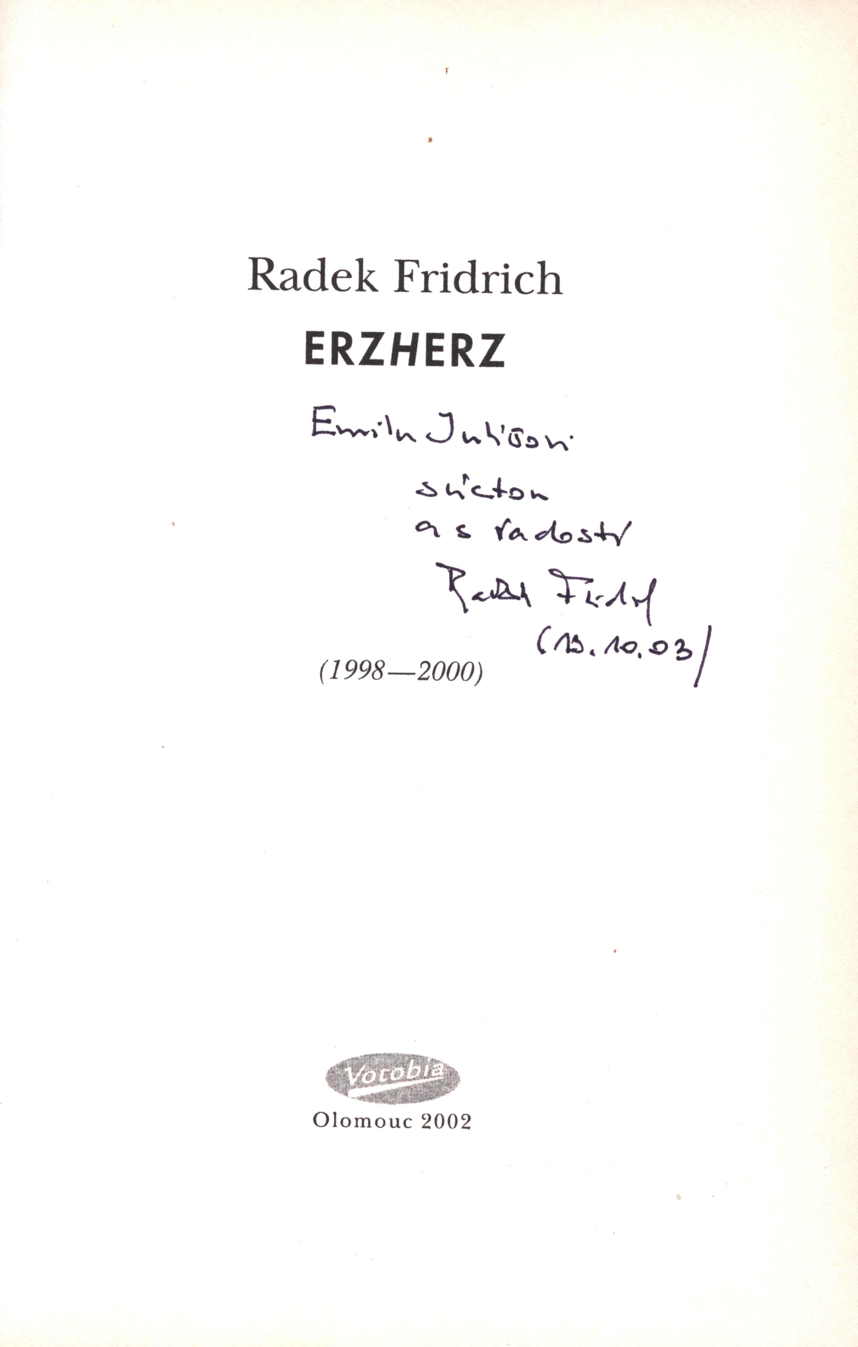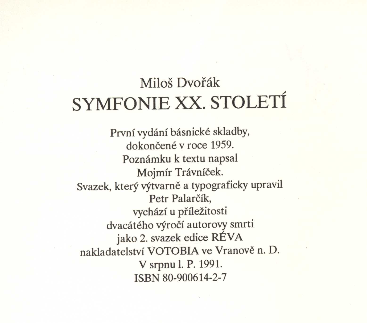 Názvové údaje Rozsvícenou baterkou do pusy / Kateřina Bolechová ; [obálka a grafická úprava Petr Palarčík] Osobní jméno Bolechová, Kateřina, 1966- (Autor) Další autoři Palarčík, Petr, 1963- (Autor obálky) (Grafický technik) Korp. Nakladatelství Petr Štengl (Nakladatel, vydavatel) Nakladatel Praha : Petr Štengl, 2007 Rozsah 37 s. : il. Klíčová slova česká poezie * čeští básníci * sbírka básní Počet ex. 2, z toho volných 2 Druh dok. monografie Signatura C12a 3990, C12a 3990a Názvové údaje Vlídné setkání : vzájemná korespondence Otokara Březiny a Sigismunda Boušky / k vydání připravili Miroslav Červenka a Petr Holman ; obálku s použitím části grafiky A. Kalvody Březový háj navrhl Petr Palarčík ; typograficky upravila Marta Švecová Osobní jméno Březina, Otokar, 1868-1929 (Autor) Další autoři Bouška, Sigismund, 1867-1942 (Autor) Červenka, Miroslav, 1932-2005 (Editor) Holman, Petr, 1951-2019 (Editor) Palarčík, Petr, 1963- (Autor obálky) Kalvoda, Antonín, 1907-1974 (Ilustrátor) Nakladatel Olomouc : Votobia, [1997] Copyright ©1997 Rozsah 229 stran ; 21 cm Osobní hesla Březina, Otokar, 1868-1929 - učitel, básník, esejista, prozaik a myslitel * Bouška, Sigismund, 1867-1942 - katolický kněz, básník, prozaik, literární a výtvarný kritik, překladatel Klíčová slova čeští spisovatelé * čeští básníci * Březina O. * Bouška S. * r. 1896-1923 * stol. 19.-20. * vzájemná korespondence * komentované vydání Počet ex. 2, z toho volných 2 Druh dok. monografie Signatura C12b 1464, Holman-Březina 0103 Názvové údaje Noci bezmoci : studie o křesťanství a současné české poesii / Petr Cekota ; [typografickou úpravu a obálku navrhl Petr Palarčík ; redakce Pavel Šaradín] Osobní jméno Cekota, Petr, 1975- (Autor) Další autoři Palarčík, Petr, 1963- (Typograf) (Autor obálky) Šaradín, Pavel, 1969- (Editor) Korp. Votobia (nakladatelství) (Nakladatel, vydavatel) Nakladatel Olomouc : Votobia, 1997 Rozsah 87 s. Osobní hesla Cekota, Petr, 1975- - literární teoretik a historik Klíčová slova česká literatura * studie * esej * česká poezie * křesťanská poezie * křesťanství * studie Počet ex. 2, z toho volných 2 Druh dok. monografie Signatura C12a 987, RSzpuk 0691 Názvové údaje Obrysy osobnosti Jiřího Kuběny / Alena Dvořáčková ; obálku ... navrhl Petr Palarčík ; typograficky upravila Marta Švecová Osobní jméno Dvořáčková, Alena, 1954- (Autor) Další autoři Palarčík, Petr, 1963- (Autor obálky) Švecová, Marta (Typograf) Korp. Votobia (nakladatelství) (Nakladatel, vydavatel) Nakladatel Olomouc : Votobia, 1995 Rozsah 90 stran : ilustrace ; 15 cm Osobní hesla Kuběna, Jiří, 1936-2017 - historik umění, básník a spisovatel, památkář a kastelán Klíčová slova česká literatura * studentské práce * biografie * poezie * čeští autoři * Kuběna J. * osobnosti * činnost * rozbor literárního díla * Česko * stol. 20.-21. Počet ex. 2, z toho volných 2 Druh dok. monografie Signatura C12a 58, LITa 0712 Názvové údaje Symfonie XX. století / Miloš Dvořák ; [poznámku k textu napsal Mojmír Trávníček ; výtvarně a typograficky upravil Petr Palarčík] Osobní jméno Dvořák, Miloš, 1901-1971 (Autor) Další autoři Trávníček, Mojmír, 1931-2011 (Autor komentáře textu) Palarčík, Petr, 1963- (Typograf) Korp. Votobia (nakladatelství) (Nakladatel, vydavatel) Nakladatel Vranov nad Dyjí : Votobia, 1991 Rozsah 29 s. Klíčová slova česká poezie * politicky angažovaná poezie * básně Počet ex. 2, z toho volných 2 Druh dok. monografie Signatura M 216 f 48, C12b 13311 Názvové údaje Kráska a network / Jakub Grombíř ; [obálka, grafická úprava a sazba Petr Palarčík] Osobní jméno Grombíř, Jakub, 1974- (Autor) Další autoři Palarčík, Petr, 1963- (Autor obálky) (Knižní grafik) (Sazeč) Nakladatel Zlín : Jaroslav Kovanda, 2006 Rozsah 91 s. : il. Klíčová slova česká poezie * sbírka básní Počet ex. 2, z toho volných 2 Druh dok. monografie Signatura C12a 4001, C12a 5097