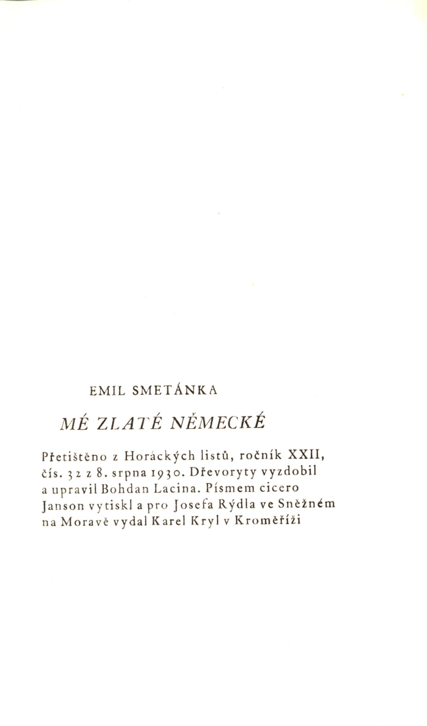 Názvové údaje Literatura česká devatenáctého století : od josefinského obrození až po českou modernu. Díl první, Od Josefa Dobrovského k Jungmannově škole básnické : s 41 vyobrazeními / napsali Josef Hanuš, Jan Jakubec, Jan Máchal, Emil Smetánka, Jaroslav Vlček Osobní jméno Hanuš, Josef, 1862-1941 (Autor) Další autoři Vacík, Miloš, 1922-1999 (Dřívější majitel) Jakubec, Jan, 1862-1936 (Autor) Máchal, Jan, 1855-1939 (Autor) Smetánka, Emil, 1875-1949 (Autor) Vlček, Jaroslav, 1860-1930 (Autor) Nakladatel V Praze : Nákladem Jana Laichtera, 1902 Výrobce Edvard Leschinger Rozsah X, 940 stran : ilustrace ; 21,5 cm Klíčová slova dějiny literatury * česká literatura * stol. 19. * literárněhistorické studie Počet ex. 2, z toho volných 2 Druh dok. monografie Signatura C12b 8164/1, C12b 19406 Názvové údaje Dva traktáty / Petr Chelčický ; [k tisku upravil a poznámkami opatřil Emil Smetánka ; kresbami doprovodil a vazbu navrhl František Bílek ; svázal Antonín Tvrdý] Osobní jméno Chelčický, Petr, asi 1379-asi 1460 (Autor) Další autoři Bílek, František, 1872-1941 (Ilustrátor) (Autor obálky) (Výtvarník vazby) Reichel, Karel, 1895-1970 (Nakladatel, vydavatel) Smetánka, Emil, 1875-1949 (Editor) Tvrdý, Antonín, 1888-1961 (Vazač) Korp. Karel Reichel (nakladatelství) (Nakladatel, vydavatel) Kryl a Scotti (firma) (Tiskař) Nakladatel Praha : Karel Reichel, 1932 Výrobce Kryl a Scotti) Rozsah 194 s. : il. Klíčová slova česká literatura * bibliofilie * bibliofilská vydání * bibliofilské tisky * středověká literatura * česká středověká literatura * náboženská literatura * duchovní úvahy * úvahy * husité Počet ex. 2, z toho volných 2 Druh dok. monografie Signatura KaG XIII C 9, VHB 0190 Názvové údaje Petra Chelčického Síť Víry / k vydání nově upravil Emil Smetánka Osobní jméno Chelčický, Petr, asi 1379-asi 1460 (Autor) Další autoři Smetánka, Emil, 1875-1949 (Editor) Korp. Melantrich (nakladatelství) (Nakladatel, vydavatel) Nakladatel Praha : Melantrich, 1929 Rozsah 446 s. : il. ; 22 cm Osobní hesla Chelčický, Petr, asi 1379-asi 1460 - náboženský reformátor a myslitel Klíčová slova česká literatura * Chelčický P. * církevní reformy * polemiky * traktát Počet ex. 3, z toho volných 3 Druh dok. monografie Signatura Holan 94, MEL 1627, Hoffmeister 0576 Názvové údaje Praktická učebnice jazyka ruského / napsal Evgenij Ljackij ; spoluprací přispěl Emil Smetánka Osobní jméno Ljackij, Jevgenij Aleksandrovič, 1868-1942 (Autor) Další autoři Smetánka, Emil, 1875-1949 (Autor) Nakladatel Praha : Vesmír, 1936 Rozsah 290 s. ; 21 cm Klíčová slova česká literatura Počet ex. 1, z toho volných 1 Druh dok. monografie Signatura Holan 212 Názvové údaje Dva traktáty : výklad na 2. epištolu sv. Jana a o základu zákonů lidských / Petr Chelčický ; k tisku upravil a poznámkami opatřil Emil Smetánka ; kresbami doprovodil a vazbu navrhl František Bílek Osobní jméno Chelčický, Petr, asi 1379-asi 1460 (Autor) Další autoři Smetánka, Emil, 1875-1949 (Editor) Bílek, František, 1872-1941 (Ilustrátor) (Výtvarník vazby) Reichel, Karel, 1895-1970 (Nakladatel, vydavatel) Korp. Kryl a Scotti (firma) (Tiskař) Nakladatel Praha : Karel Reichel, 1932 Výrobce V Novém Jičíně : Kryl a Scotti Rozsah 194 stran : ilustrace ; 12° Klíčová slova křesťanská literatura * starší česká literatura * traktáty * náboženské polemiky * náboženské reformy * výklad Písma * Nový zákon * křesťanská etika * teologie * stol. 15., 1. pol. Počet ex. 3, z toho volných 3 Druh dok. monografie Signatura G A f 109, P 63 g 72, P 84 h 83 Názvové údaje Mé zlaté Německé / Emil Smetánka ; dřevoryty vyzdobil a upravil Bohdan Lacina Osobní jméno Smetánka, Emil, 1875-1949 (Autor) Další autoři Lacina, Bohdan, 1912-1971 (Ilustrátor) (Knižní grafik) Korp. Karel Kryl (firma: Kroměříž, Česko) (Nakladatel, vydavatel) Nakladatel Sněžné na Moravě : pro Josefa Rýdla vydal Karel Kryl, 1948 Výrobce V Kroměříži : Karel Kryl Rozsah 18 stran : ilustrace ; 22 cm Klíčová slova česká próza * bibliofilie * Sněžné Počet ex. 1, z toho volných 1 Druh dok. monografie Signatura JVladislav 1032 Názvové údaje Petra Chelčického Postilla. Díl I / k vydání upravil Emil Smetánka Osobní jméno Chelčický, Petr, asi 1379-asi 1460 (Autor) Další autoři Smetánka, Emil, 1875-1949 (Editor) Korp. Komenského evangelická matice (Nakladatel, vydavatel) Unie (tiskárna) (Tiskař) Nakladatel V Praze : vydáním a nákladem Comenia, Evanjelické matice Komenského, 1900 Výrobce Tiskem České grafické společnosti Unie Rozsah 438 stran ; 21 cm Klíčová slova starší česká literatura * teologické studie * křesťanská teologie * křesťanské náboženství * reformace * reformní kazatelství * biblické texty * výklad Písma * stol. 15., 1. pol. Počet ex. 1, z toho volných 1 Druh dok. monografie Signatura K CH v 17 Názvové údaje Síť víry / Petr Chelčický ; k vydání upravil Emil Smetánka Osobní jméno Chelčický, Petr, asi 1379-asi 1460 (Autor) Další autoři Smetánka, Emil, 1875-1949 (Autor adaptace, upravovatel) Korp. Komenského evangelická matice (Nakladatel, vydavatel) Nakladatel Praha : Comenium, 1912 Rozsah xv, 386 stran, 1 list obrazové přílohy : ilustrace Předmětová hesla Chelčický Petr 1390-1460 Klíčová slova starší česká literatura * náboženská literatura * křesťanská teologie * reformace * reformní kazatelství * kázání * víra * stol. 15., 1. pol. Počet ex. 1, z toho volných 1 Druh dok. monografie Signatura M 125 d 20