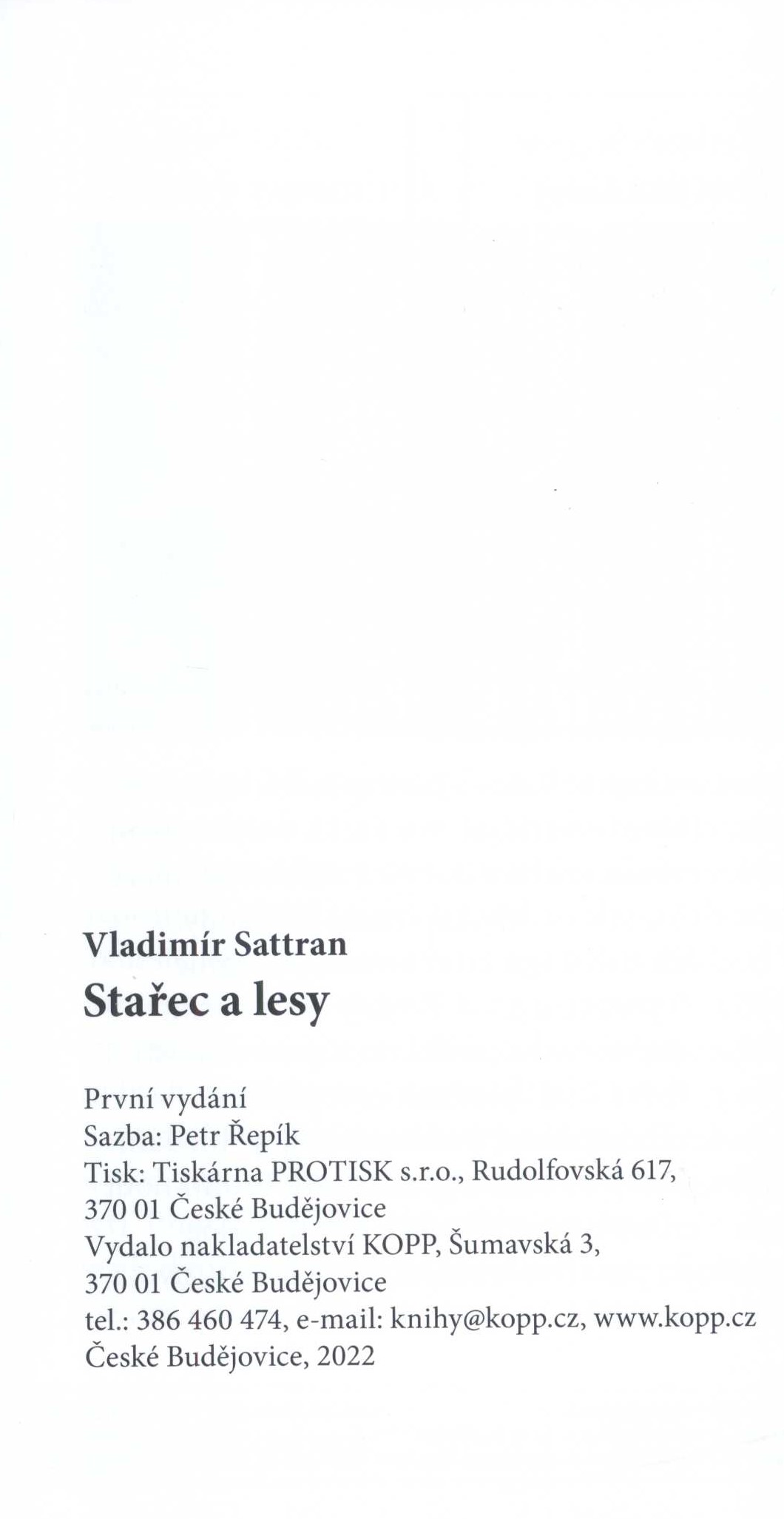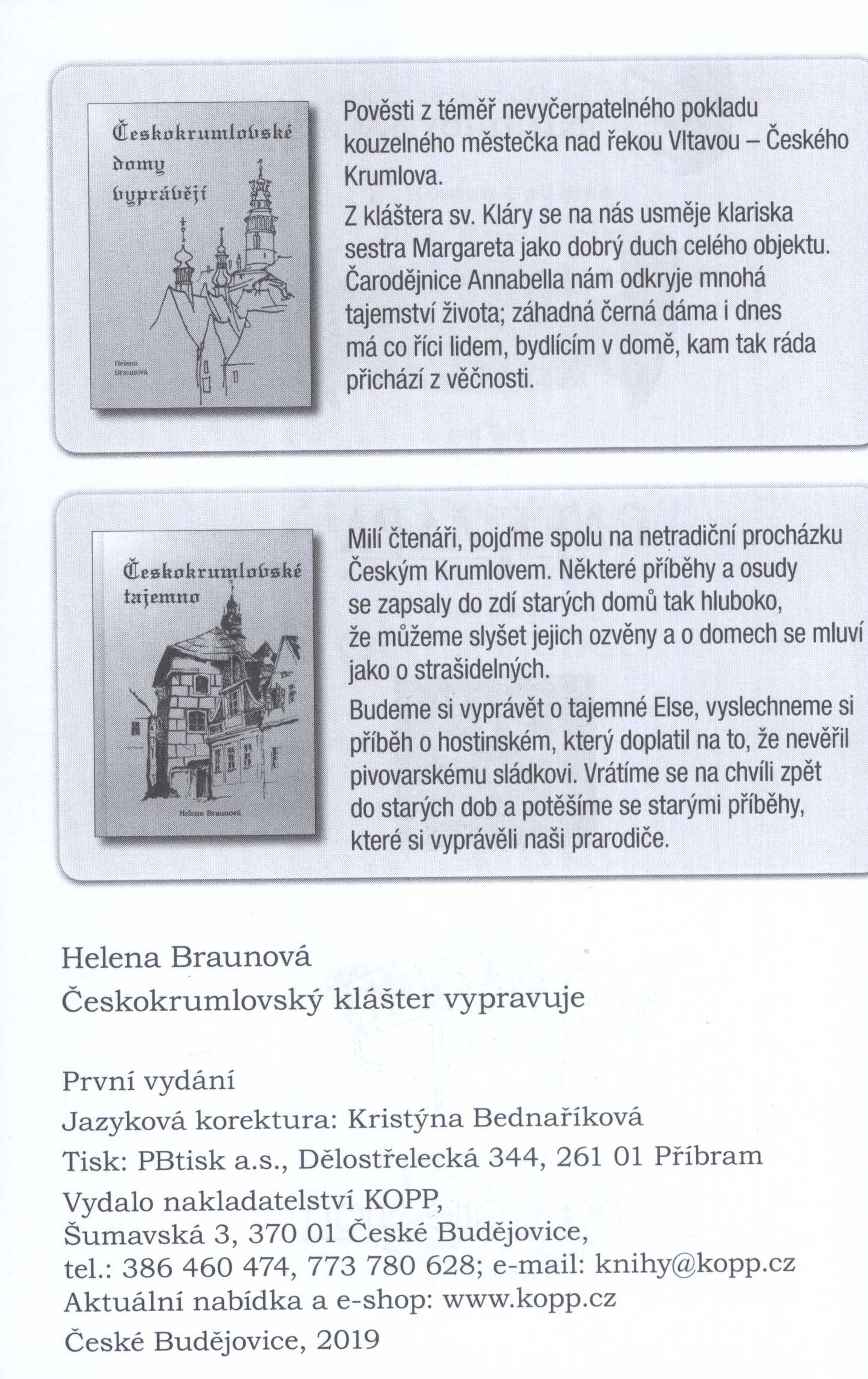 Názvové údaje Český Krumlov - perla staletí = Český Krumlov - pearl of the centuries Český Krumlov - Perle der Jahrhunderte Český Krumlov - perle séculaire / Antonín Holub [foto ; autorka textu Anna Kubíková ; grafická úprava Petr Palma] Osobní jméno Holub, Antonín, 1935-2016 (Fotograf) Další autoři Kubíková, Anna, 1948- (Autor) Palma, Petr, 1957- (Knižní grafik) Korp. Kopp (nakladatelství) (Nakladatel, vydavatel) Protisk (tiskárna, České Budějovice) (Tiskař obrazu) Nakladatel České Budějovice nakladatelství Kopp, 2005 Výrobce (Protisk s. r. o.) Rozsah 93 s. : il. (převážně barev.) ; 25 cm Předmětová hesla architektonické památky - Česko Geografické heslo Český Krumlov (Česko) Klíčová slova fotografické publikace * Český Krumlov * historické památky * architektura * umělecká fotografie Počet ex. 1, z toho volných 1 Druh dok. monografie Signatura C12c 3437 Názvové údaje Českokrumlovský klášter vypravuje / Helena Braunová ; ilustrace Karel Dvořák ; foto archiv Heleny Braunové Osobní jméno Braunová, Helena, 1944-2020 (Autor) Další autoři Dvořák, Karel, 1937- (Ilustrátor) Korp. Kopp (nakladatelství) (Nakladatel, vydavatel) PBtisk (tiskárna) (Tiskař) Nakladatel České Budějovice : Kopp, 2019 Výrobce Příbram : PBtisk a.s. Rozsah 234 stran : ilustrace, portréty ; 21 cm Heslo korporace (zkrác. heslo korp.) : Klášter klarisek (Český Krumlov, Česko) Předmětová hesla dissolved monasteries - Czechia * officials - Czechia * family relationships - Czechia Geografické heslo Český Krumlov (Czechia) Klíčová slova česká literatura * próza * vyprávění * biografický příběh * úředníci * rodinné vztahy * zrušené kláštery * Český Krumlov Počet ex. 1, z toho volných 1 Druh dok. monografie Signatura LITb 00378 Názvové údaje Norton Commander 5.0 / Vladislav Černý, Martin Kvoch ; návrh obálky Antonín Malec Osobní jméno Černý, Vladislav, 1961- (Autor) Další autoři Kvoch, Martin, 1961- (Autor) Malec, Antonín, 1935- (Autor obálky) Korp. Kopp (nakladatelství) (Nakladatel, vydavatel) Nakladatel České Budějovice : Nakladatelství Kopp, 1995 Rozsah 127 stran : černobílé ilustrace ; 20 cm Klíčová slova počítače * výpočetní technika * příručky * programy Počet ex. 1, z toho volných 1 Druh dok. monografie Signatura JVladislav 1487 Názvové údaje Stařec a lesy : (z deníků starého pána) / Vladimír Sattran ; ilustrace Vladimír Sattran Osobní jméno Sattran, Vladimír, 1930- (Autor) (Ilustrátor) Další autoři Kopp (nakladatelství) (Nakladatel, vydavatel) Protisk (tiskárna, České Budějovice) (Tiskař) Nakladatel České Budějovice : Kopp, 2022 Výrobce České Budějovice : Tiskárna PROTISK s.r.o. Rozsah 193 stran : ilustrace (převážně barevné) ; 18 cm Klíčová slova česká literatura * próza * vzpomínky * biografické příběhy * životní události * fikce * postoje * láska * obdiv * víra * věda * dobro * zlo * lesy * Šumava * Česko * stol. 20. Počet ex. 1, z toho volných 1 Druh dok. monografie Signatura LITa 0331