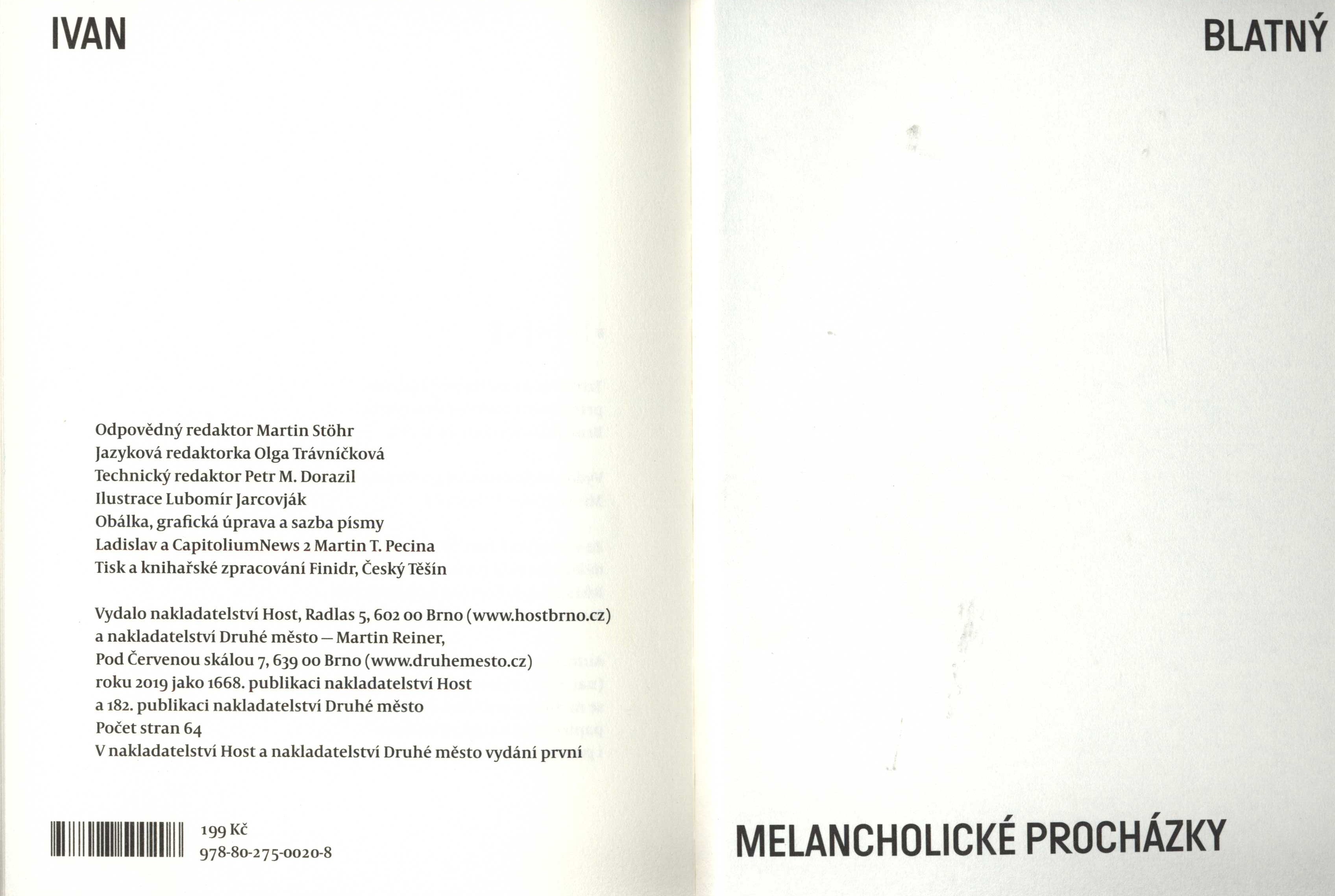 Názvové údaje Lucemburská zahrada : příběh / Michal Ajvaz ; obálka a grafická úprava Bedřich Vémola Osobní jméno Ajvaz, Michail, 1904-1994 (Autor) Další autoři Vémola, Bedřich, 1970- (Knižní grafik) (Autor obálky) Korp. Druhé město (nakladatelství) (Nakladatel, vydavatel) Ekon (tiskárna) (Tiskař) Nakladatel V Brně : Druhé město, 2011 Výrobce V Jihlavě : Ekon Copyright ©2011 Rozsah 172 stran ; 20 cm Klíčová slova česká próza * romány * vnímání * láska * žárlivost * smíření * jazyková poetika * vyprávění Počet ex. 2, z toho volných 2 Druh dok. monografie Signatura C12b 13426, R&AHamanovi 1559 Názvové údaje Hledání přítomného času / Ivan Blatný ; ilustrace Lubomír Jarcovják ; obálka, grafická úprava a sazba ... Martin T. Pecina Osobní jméno Blatný, Ivan, 1919-1990 (Autor) Další autoři Jarcovják, Lubomír, 1962- (Ilustrátor) Pecina, Martin T., 1982- Korp. Host (nakladatelství) (Nakladatel, vydavatel) Druhé město (nakladatelství) (Nakladatel, vydavatel) Finidr (tiskárna) (Tiskař) Nakladatel Brno : Host : Druhé město, 2019 Výrobce Český Těšín : Finidr Rozsah 81 stran ; 20 cm Klíčová slova česká literatura * poezie * přetisk * sbírka básní * r. 1940-1947 * Nejkrásnější české knihy * r. 2019 Počet ex. 2, z toho volných 2 Druh dok. monografie Signatura LITb 00260, NK/19 010/4 Názvové údaje Jde pražské dítě domů z bia... / Ivan Blatný Osobní jméno Blatný, Ivan, 1919-1990 (Autor) Další autoři Kolář, Jiří, 1914-2002 (Ilustrátor) Reiner, Martin, 1964- (Editor) (Redaktor, výkonný redaktor) Vémola, Bedřich, 1970- (Knižní grafik) Korp. Druhé město (nakladatelství) (Nakladatel, vydavatel) Tiskárna Reprocentrum (Tiskař) Studio Vémola (grafické studio) (Sazeč) Nakladatel Brno : Druhé město, 2017 Výrobce Blansko : Reprocentrum Rozsah 446 stran : barevné ilustrace ; 22 x 22 cm Klíčová slova česká literatura * poezie * Blatný I. * ilustrace * Kolář J. * ilustrované knihy Počet ex. 1, z toho volných 1 Druh dok. monografie Signatura C12b 17792 Názvové údaje Melancholické procházky / Ivan Blatný ; ilustrace Lubomír Jarcovják ; obálka, grafická úprava a sazba ... Martin T. Pecina Osobní jméno Blatný, Ivan, 1919-1990 (Autor) Další autoři Jarcovják, Lubomír, 1962- (Ilustrátor) Pecina, Martin T., 1982- (Knižní grafik) Korp. Host (nakladatelství) (Nakladatel, vydavatel) Druhé město (nakladatelství) (Nakladatel, vydavatel) Finidr (tiskárna) (Tiskař) Nakladatel Brno : Host : Druhé město, 2019 Výrobce Český Těšín : Finidr Rozsah 57 stran ; 20 cm Klíčová slova česká literatura * poezie * sbírka básní * přetisk * r. 1940-1947 * Nejkrásnější české knihy * r. 2019 Počet ex. 2, z toho volných 2 Druh dok. monografie Signatura LITb 00261, NK/19 010/2 Názvové údaje Paní Jitřenka / Ivan Blatný ; ilustrace Lubomír Jarcovják ; obálka, grafická úprava a sazba ... Martin T. Pecina Osobní jméno Blatný, Ivan, 1919-1990 (Autor) Další autoři Jarcovják, Lubomír, 1962- (Ilustrátor) Pecina, Martin T., 1982- (Autor obálky) (Knižní grafik) (Sazeč) Korp. Host (nakladatelství) (Nakladatel, vydavatel) Druhé město (nakladatelství) (Nakladatel, vydavatel) Finidr (tiskárna) (Tiskař) Nakladatel Brno : Host : Druhé město, 2019 Výrobce Český Těšín : Finidr Rozsah 57 stran ; 20 cm Klíčová slova česká literatura * poezie * sbírka básní * přetisk * Nejkrásnější české knihy * r. 2019 Počet ex. 2, z toho volných 2 Druh dok. monografie Signatura LITb 00262, NK/19 010/1 Názvové údaje Stará bydliště / Ivan Blatný ; [obálka a grafická úprava Bedřich Vémola ; fotografie na obálce Wilfried Bauer] Osobní jméno Blatný, Ivan, 1919-1990 (Autor) Další autoři Vémola, Bedřich, 1970- (Autor obálky) (Knižní grafik) Bauer, Wilfried, 1944-2005 (Fotograf) Korp. Druhé město (nakladatelství) (Nakladatel, vydavatel) Tiskárna Reprocentrum (Tiskař) Nakladatel Brno : Druhé město, 2014 Výrobce Reprocentrum) Rozsah 106 s. Klíčová slova česká poezie * výbor z poezie Počet ex. 1, z toho volných 1 Druh dok. monografie Signatura C12c 4294 Názvové údaje Tento večer / Ivan Blatný ; ilustrace Lubomír Jarcovják ; obálka, grafická úprava a sazba ... Martin T. Pecina Osobní jméno Blatný, Ivan, 1919-1990 (Autor) Další autoři Jarcovják, Lubomír, 1962- (Ilustrátor) Pecina, Martin T., 1982- (Autor obálky) Korp. Host (nakladatelství) (Nakladatel, vydavatel) Druhé město (nakladatelství) (Nakladatel, vydavatel) Finidr (tiskárna) (Tiskař) Nakladatel Brno : Host : Druhé město, 2019 Výrobce Český Těšín : Finidr Rozsah 73 stran ; 20 cm Klíčová slova česká literatura * poezie * sbírka básní * r. 1940-1947 * Nejkrásnější české knihy * r. 2019 Počet ex. 2, z toho volných 2 Druh dok. monografie Signatura LITb 00259, NK/19 010/3 Názvové údaje Aristokratka a vlna zločinnosti na zámku Kostka / Evžen Boček ; obálka a grafická úprava Bedřich Vémola Osobní jméno Boček, Evžen, 1966- (Autor) Další autoři Vémola, Bedřich, 1970- (Autor obálky) (Knižní grafik) Korp. Druhé město (nakladatelství) (Nakladatel, vydavatel) CPI Moravia Books (tiskárna) (Tiskař) Nakladatel Brno : Druhé město, 2018 Výrobce Pohořelice : CPI Moravia Books, s.r.o. Rozsah 168 stran ; 20 cm Klíčová slova česká próza * humoristický román Počet ex. 1, z toho volných 1 Druh dok. monografie Signatura C12b 18624 Názvové údaje Neřestné ulice / Václav Böhmsche ; [obálka a grafická úprava Bedřich Vémola] Osobní jméno Böhmsche, Václav, 1973- (Autor) Další autoři Vémola, Bedřich, 1970- (Autor obálky) (Knižní grafik) Korp. Druhé město (nakladatelství) (Nakladatel, vydavatel) Tiskárna Reprocentrum (Tiskař) Nakladatel Brno : Druhé město, 2014 Výrobce Reprocentrum) Rozsah 50 s. Klíčová slova česká poezie * poezie v próze Počet ex