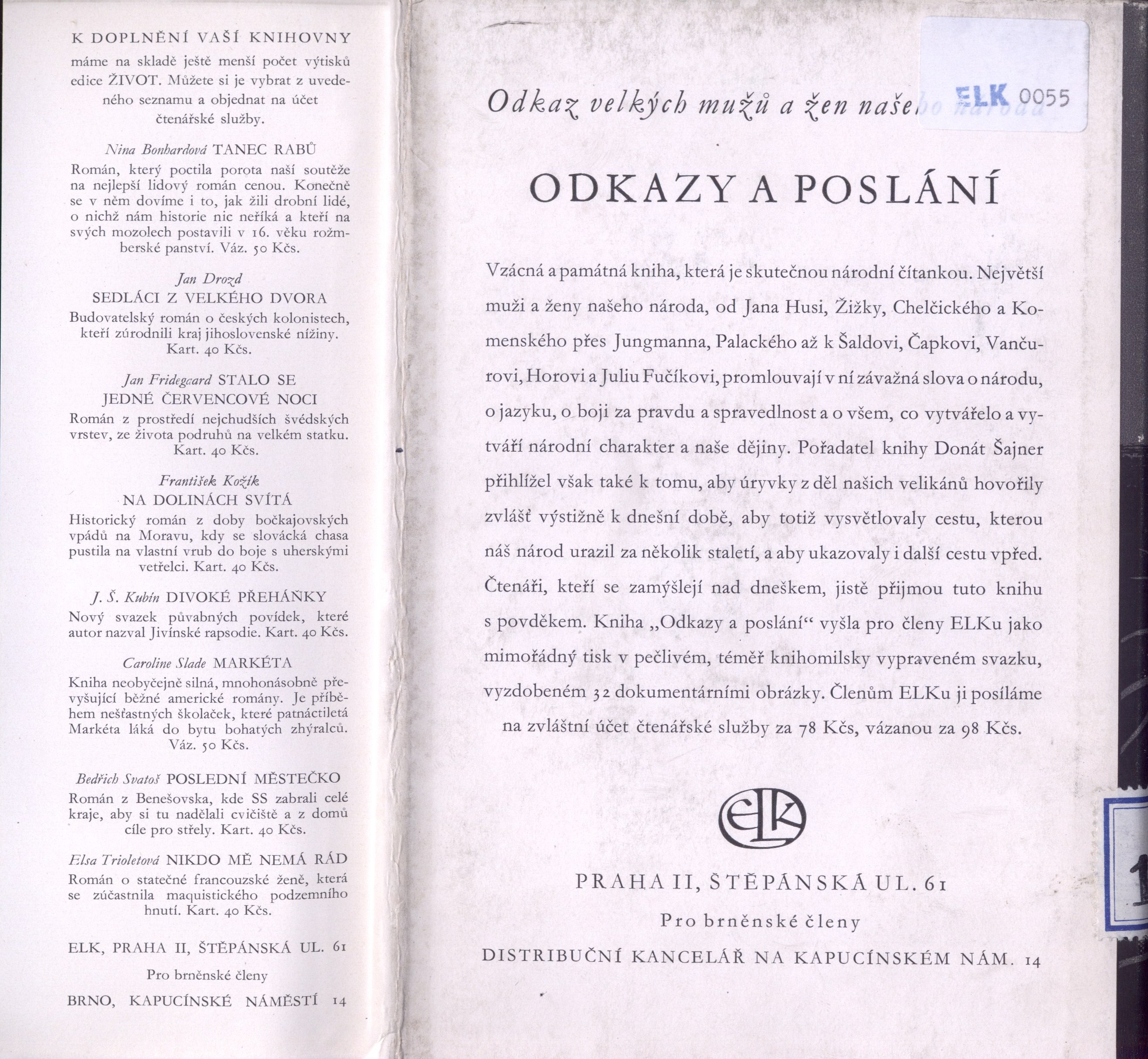 Názvové údaje Henrietta / Richard Aldington ; [z anglického originálu ... přeložil Emanuel Tilsch ; doslov o autorovi napsal František Resl ; obálku a vazbu vytvořil Zdeněk Sklenář ; podle typografické osnovy Antonína Dvořáka ...] Osobní jméno Aldington, Richard, 1892-1962 (Autor) Další autoři Tilsch, Emanuel, 1906-1990 (Překladatel) Resl, František (Autor doslovu, tiráže atd.) Sklenář, Zdeněk, 1910-1986 (Autor obálky) (Výtvarník vazby) (Ilustrátor) Dvořák, Antonín, 1914- (Typograf) Korp. Evropský literární klub (nakladatelství) (Nakladatel, vydavatel) Grafia (tiskárna, nakladatelství) (Tiskař) Nakladatel V Praze : Nakladatelství ELK, 1949 Výrobce (Grafia) Rozsah 285 s. ; 21 cm Osobní hesla Casanova, Giacomo, 1725-1798 - italský dobrodruh a spisovatel Klíčová slova anglická literatura * próza * překlad * román * historický román * historické osobnosti * životopisný román * Casanova G. * Benátky * stol. 18. Počet ex. 2, z toho volných 2 Druh dok. monografie Signatura AVrbova 119, ELK 0263 Názvové údaje Cesta na Jávu / Konstantin Biebl ; uspořádal, text připravil a doslov napsal Z. K. Slabý ; obálku a vazbu navrhl František Tichý, který je také autorem předsádky a kresby na titulním listě a v tiráži ; typograficky upravil Antonín Dvořák Osobní jméno Biebl, Konstantin, 1898-1951 (Autor) Další autoři Slabý, Zdeněk Karel, 1930-2020 (Editor) Tichý, František, 1896-1961 (Ilustrátor) (Výtvarník vazby) (Autor obálky) Dvořák, Antonín, 1914- (Typograf) Korp. Československý spisovatel (nakladatelství) (Nakladatel, vydavatel) Brněnské knihtiskárny (Tiskař) Nakladatel Praha : Československý spisovatel, 1958 Výrobce Brno : Brněnské knihtiskárny Rozsah 133 stran : ilustrace ; 20,5 cm Osobní hesla Biebl, Konstantin, 1898-1951 - básník a prozaik Klíčová slova česká literatura * fejetony * Jáva * cesta na Jávu * autobiografické prvky Počet ex. 5, z toho volných 6 Druh dok. monografie Signatura C12b 4917, LK P 33 c 10, OŘíha 047, AČS 04240, AČS 04240a, Branald 0246 Názvové údaje Bohuslav Martinů a Vysočina / Miloslav Bureš Osobní jméno Bureš, Miloslav, 1909-1968 (Autor) Další autoři Reynek, Bohuslav, 1892-1971 (Ilustrátor) Dvořák, Antonín, 1914- (Knižní grafik) Korp. Krajské nakladatelství v Havlíčkově Brodě (Nakladatel, vydavatel) Jiskra, tiskařské závody, n.p. (provoz Havlíčkův Brod) (Tiskař) (Tiskař obrazu) Nakladatel Havlíčkův Brod : Krajské nakladatelství, 1960 Výrobce Havlíčkův Brod : Jiskra, tiskařské závody, nár. podnik Rozsah 66 stran, 1 nečíslovaný list obrazové přílohy : černobílé ilustrace, 1 portrét ; 15 cm Osobní hesla Martinů, Bohuslav, 1890-1959 - hudební skladatel * Bureš, Miloslav, 1909-1968 - novinář, redaktor, básník a prozaik Předmětová hesla hudební skladatelé * hudba * hudební místopis * biografie Geografické heslo Kraj Vysočina (Česko : 2000-) * Polička (Česko) Klíčová slova česká literatura * vzpomínky * Bureš M. * čeští hudební skladatelé * Martinů B. * monografie * ilustrované knihy * ilustrace * Reynek B. * r. 1960 Počet ex. 1, z toho volných 1 Druh dok. monografie Signatura VZinková 0012 Názvové údaje Pochovávání světla / Miloslav Bureš ; obrázky Věry Sůrové ; typograficky upravil Antonín Dvořák Osobní jméno Bureš, Miloslav, 1909-1968 Další autoři Sůrová, Věra, 1929- (Ilustrátor) Dvořák, Antonín, 1914- (Typograf) Korp. Krajské nakladatelství v Havlíčkově Brodě (Nakladatel, vydavatel) Jiskra, tiskařské závody, n.p. (provoz Havlíčkův Brod) (Tiskař) Nakladatel Havlíčkův Brod : Krajské nakladatelství, 1962 Výrobce Jiskra tiskařské závody, n.p. Rozsah 62 stran : Ilustrace ; 19,5 cm Klíčová slova česká poezie * sbírka básní * stol. 20., 2. pol. Počet ex. 1, z toho volných 1 Druh dok. monografie Signatura C12b 19215 Názvové údaje Únik / Daphne du Maurier ; [z anglického originálu ... přeložila Zdeňka Hofmanová ; obálku a vazbu navrhl František Muzika ; podle typografické osnovy Antonína Dvořáka ...] Osobní jméno Du Maurier, Daphne, 1907-1989 (Autor) Další autoři Hofmanová, Zdenka, 1896-1949 (Překladatel) Muzika, František, 1900-1974 (Autor obálky) Dvořák, Antonín, 1914- (Typograf) Korp. Evropský literární klub (nakladatelství) (Nakladatel, vydavatel) Jiří Jelen (tiskárna) (Tiskař) Nakladatel Praha : Nakladatelství ELK, 1947 Výrobce Jiří Jelen) Rozsah 252 s. ; 21 cm Osobní hesla Du Maurier, Daphne, 1907-1989 - anglická spisovatelka, dramatička Klíčová slova anglická literatura * próza * překlad * román * historický román * piráti * stol. 18., 2. pol. Počet ex. 2, z toho volných 2 Druh dok. monografie Signatura AVrbova 121, ELK 0262 Názvové údaje Křižník Artemis : román / C.S. Forester ; [z anglického originálu ... přeložil K.B. Palkovský ; doslov napsal A.J. Urban ; obálku s použitím dřevorytu Václava Maška a vazbu navrhl Oldřich Menhart ; [tisk] podle typografické osnovy Antonína Dvořáka, který použil kreseb Josefa Paukerta] Osobní jméno Forester, C. S. (Cecil Scott), 1899-1966 (Autor) Další autoři Palkovský, Břetislav, 1888-1978 (Překladatel) Urban, A. Jaroslav, 1899-1962 (Autor doslovu, tiráže atd.) Mašek, Václav, 1893-1973 (Dřevorytec) (Ilustrátor) Menhart, Oldřich, 1897-1962 (Autor obálky) (Výtvarník vazby) Dvořák, Antonín, 1914- (Typograf) Paukert, Josef, 1915-1991 (Ilustrátor) Korp. Evropský literární klub (nakladatelství) (Nakladatel, vydavatel) Mladá fronta (nakladatelství) (Tiskař) Nakladatel Praha : Nakladatelství ELK, 1948 Výrobce (Mladá fronta) Rozsah 220 s. : il. ; 21 cm Klíčová slova překladová literatura * anglická literatura * dobrodružný román * námořníci * bitvy * život * moře Počet ex. 3, z toho volných 3 Druh dok. monografie Signatura AVrbova 143, ELK 0085, ELK 0