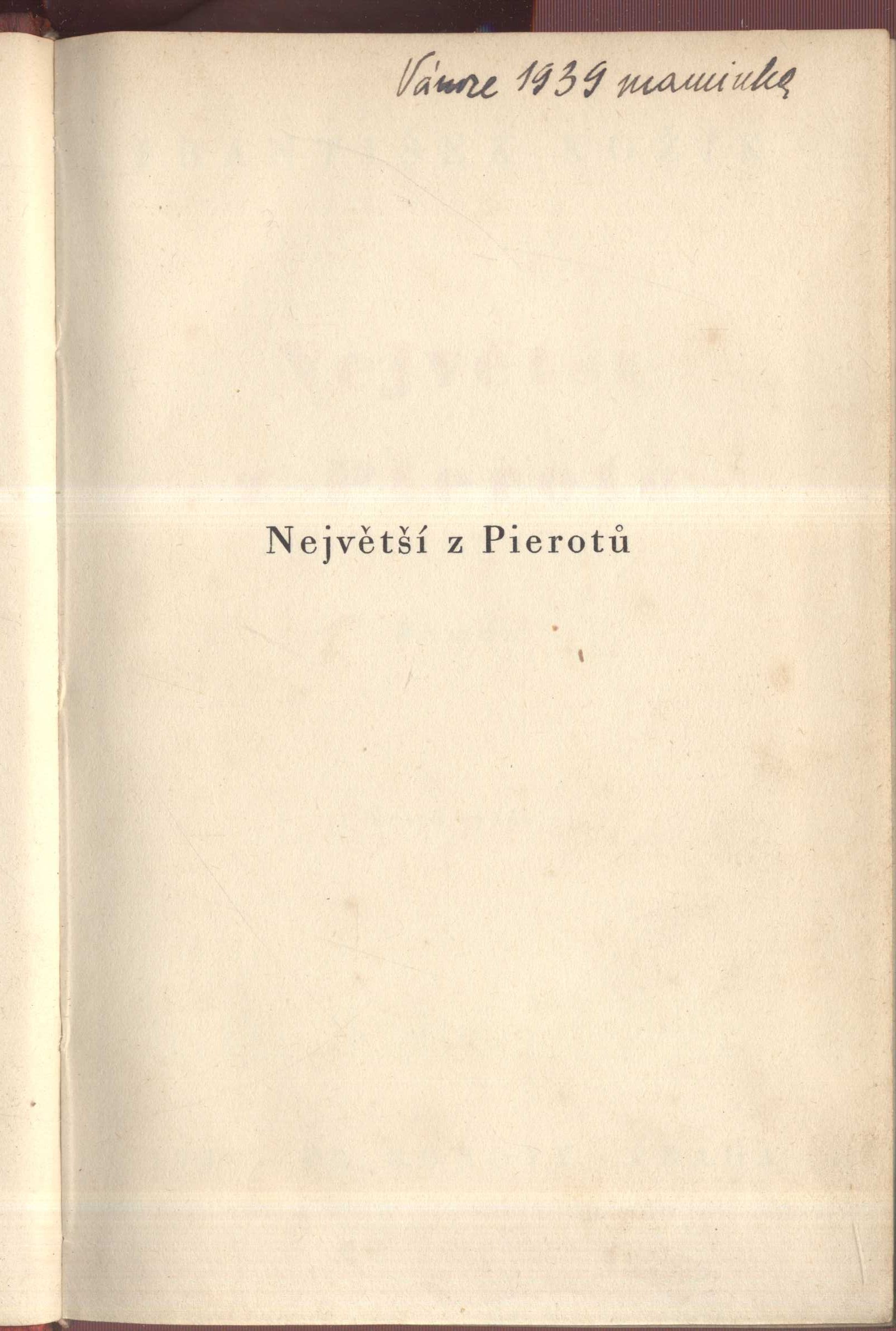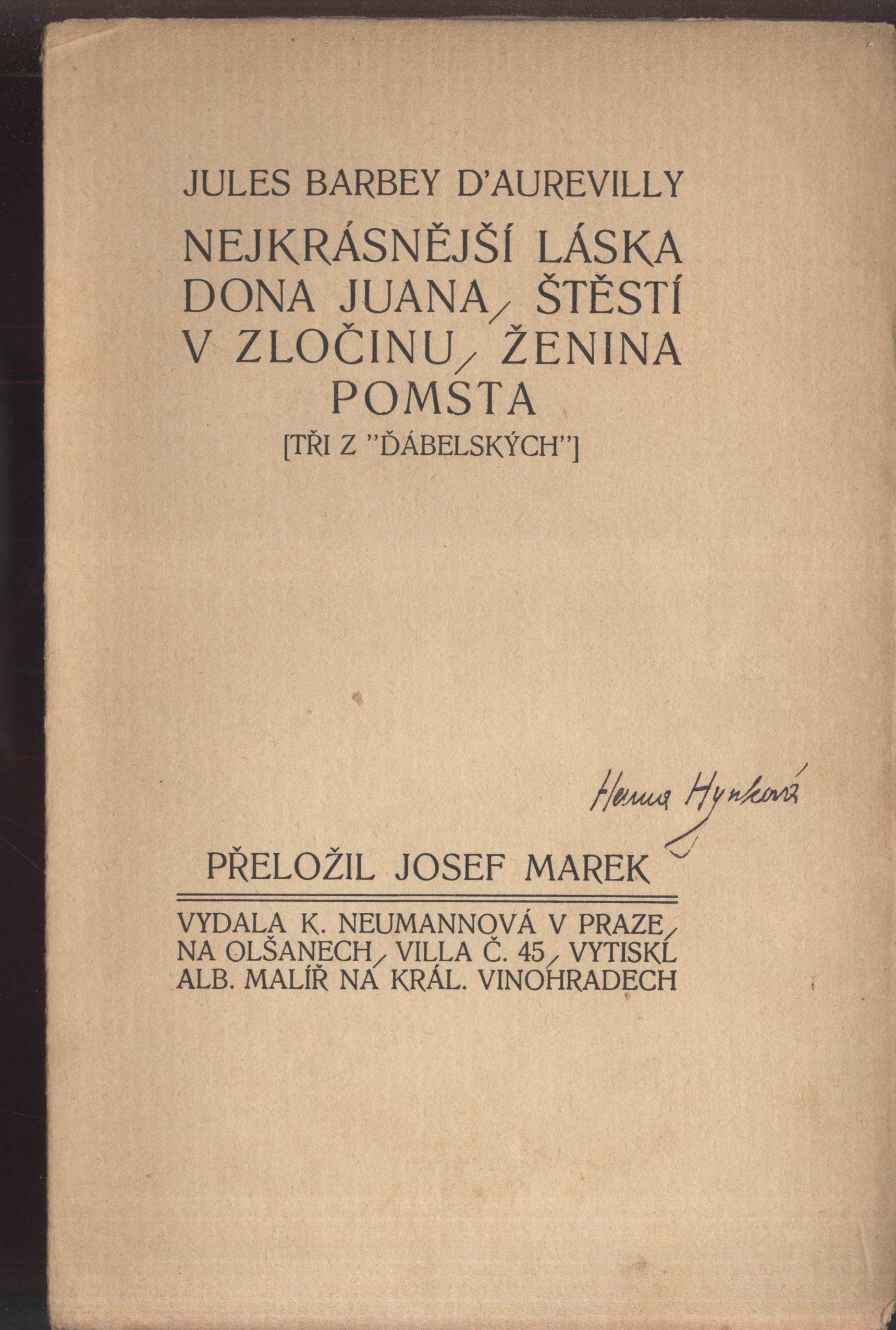 Názvové údaje Dcera Evina / Honoré de Balzac ; přeložila Jaroslava Vobrubová Osobní jméno Balzac, Honoré de, 1799-1850 (Autor) Další autoři Vobrubová-Koutecká, Jaroslava, 1891-1969 (Překladatel) Havlůjová, Hermina, 1891-1974 (Dřívější majitel) Neumannová, Kamila, 1874-1956 (Nakladatel, vydavatel) Korp. Albert Malíř (tiskárna a nakladatelství) (Tiskař) Nakladatelství Kamilla Neumannová (Nakladatel, vydavatel) Nakladatel V Praze : Kamilla Neumannová, 1910 Výrobce Na Královských Vinohradech : Tiskem Alberta Malíře, 1910 Rozsah 120 stran Klíčová slova francouzská literatura * novely * stol. 19. Počet ex. 1, z toho volných 1 Druh dok. monografie Signatura VHB 2031/přív.1 Odkazy (1) - Monografie Názvové údaje Honorina : novela / napsal Honoré de Balzac ; přeložil Jiří Živný Osobní jméno Balzac, Honoré de, 1799-1850 (Autor) Další autoři Živný, Jiří, 1876-1948 (Překladatel) Vokolek, Vlastimil, 1903-1985 (Dřívější majitel) Havlůjová, Hermina, 1891-1974 (Dřívější majitel) Neumannová, Kamila, 1874-1956 (Nakladatel, vydavatel) Korp. Albert Malíř (tiskárna a nakladatelství) (Tiskař) Nakladatelství Kamilla Neumannová (Nakladatel, vydavatel) Nakladatel V Praze : Kamilla Neumannová, 1909 Výrobce Na Královských Vinohradech : Tiskem Alberta Malíře, 1909 Rozsah 114 stran Klíčová slova francouzská literatura * novely * stol. 19. Počet ex. 2, z toho volných 2 Druh dok. monografie Signatura C12b 8066, VHB 2031 Odkazy (1) - Monografie Názvové údaje Nejkrásnější láska Dona Juana ; Štěstí v zločinu ; Ženina pomsta : tři z "Ďábelských" / Jules Barbey D´Aurevilly ; přeložil Josef Marek Osobní jméno Barbey d'Aurevilly, Jules Amédée, 1808-1889 (Autor) Další autoři Marek, Josef Richard, 1883-1951 (Překladatel) Neumannová, Kamila, 1874-1956 (Nakladatel, vydavatel) Havlůjová, Hermina, 1891-1974 (Autor podpisu) Korp. Nakladatelství Kamilla Neumannová (Nakladatel, vydavatel) Albert Malíř (tiskárna a nakladatelství) (Tiskař) Nakladatel V Praze : K. Neumannová, [1910] Výrobce Na Král. Vinohradech : Alb. Malíř, [1910] Rozsah 132 stran Klíčová slova francouzská literatura * francouzská próza * novely * dekadence Počet ex. 2, z toho volných 2 Druh dok. monografie Signatura Hoffmeister 0198, VHB 2035 Názvové údaje Hubená kočka : novella / Anatole France ; přeložil Em. Blahovec ; upravil a původními dřevoryty vyzdobil F. Kobliha Osobní jméno France, Anatole, 1844-1924 (Autor) Další autoři Blahovec, Emanuel (Překladatel) Kobliha, František, 1877-1962 (Ilustrátor) (Typograf) Havlůjová, Hermina, 1891-1974 (Autor podpisu) (Dřívější majitel) Korp. Nakladatelství Kamilla Neumannová (Nakladatel, vydavatel) J. Skalák a spol. (Praha) (Tiskař) Nakladatel V Praze : Kamilla Neumannová, 1913 Výrobce [Česko] : Knihtiskárna J. Skaláka a spol., 1913 Rozsah 81 stran ; 22 cm Klíčová slova francouzská próza * francouzská literatura * novely Počet ex. 4, z toho volných 4 Druh dok. monografie Signatura Hoffmeister 0011, VMartínek 0712, P 135 B 1, VHB 2244 Názvové údaje Král Kandaules : drama o třech dějstvích / napsal André Gide ; přeložil Arnošt Procházka ; [upravil Miloš Klicman] Osobní jméno Gide, André, 1869-1951 (Autor) Další autoři Procházka, Arnošt, 1869-1925 (Překladatel) Havlůjová, Hermina, 1891-1974 (Dřívější majitel) Klicman, Miloš František, 1890-1957 (Editor) Korp. Nakladatelství Kamilla Neumannová (Nakladatel, vydavatel) J. Skalák a spol. (Praha) (Tiskař) Nakladatel V Praze : Kamilla Neumannová, 1914 Výrobce (Tiskem J. Skaláka) Rozsah 67 s. Klíčová slova francouzská literatura * francouzské divadlo * dramata * divadelní hry * symbolismus * dekadence * francouzský symbolismus Počet ex. 2, z toho volných 2 Druh dok. monografie Signatura Hoffmeister 0190, VHB 2275 Názvové údaje Zahrada Popelčina / Josef Hora ; [frontispic a obálka od Eduarda Miléna] Osobní jméno Hora, Josef, 1891-1945 (Autor) (Dedikátor) Další autoři Milén, Eduard, 1891-1976 (Autor obálky) (Ilustrátor) Havlůjová, Hermina, 1891-1974 (Dedikátor) Holanová, Růžena, 1911- (Dedikant) Hellmuthová, Marta, 1917-1988 (Dřívější majitel) (Dedikant) Korp. Fr. Borový (firma) (Nakladatel, vydavatel) Akciová moravská knihtiskárna Polygrafie (Tiskař) Nakladatel Praha : Fr. Borový, 1940 Výrobce Akciová moravská knihtiskárna Polygrafie) Rozsah 68 s. : il. ; 20 cm Klíčová slova česká literatura * poezie * básně * r. 1940 Počet ex. 3, z toho volných 3 Druh dok. monografie Signatura Holan 1480, MUK 1742, VHB 3693 Názvové údaje Temno : historický obraz / Alois Jirásek ; ilustroval Adolf Kašpar Osobní jméno Jirásek, Alois, 1851-1930 (Autor) Další autoři Kašpar, Adolf, 1877-1934 (Ilustrátor) Havlůjová, Hermina, 1891-1974 (Dřívější majitel) Korp. Nakladatelství Jan Otto (Nakladatel, vydavatel) Česká grafická Unie (tiskárna a nakladatelství) (Tiskař) Nakladatel Praha : J. Otto, 1926 Výrobce (Tiskem České grafické Unie a. s.) Rozsah 702 s. : il. Klíčová slova česká literatura * česká próza * historická próza Počet ex. 1, z toho volných 1 Druh dok. monografie Signatura VHB 3705 Názvové údaje Daleké obzory / Josef Kadlec ; [za redakce Pavly Buzkové ; obálka a kresby Arnošt Paderlík] Osobní jméno Kadlec, Josef, 1912-2000 (Autor) Další autoři Buzková, Pavla, 1885-1949 (Editor) (Autor úvodu atd.) Hellmuthová, Marta, 1917-1988 (Dřívější majitel) (Dedikant) Havlůjová, Hermina, 1891-1974 (Dedikant) Paderlík, Arnošt, 1919-1999 (Ilustrátor) (Autor obálky) Korp. Českomoravský kompas (nakladatelství) (Nakladatel, vydavatel) (Tiskař) Nakladatel V Praze : Českomoravský kompas, 1943 Rozsah 213 s. : il. ; 20 cm Klíčová slova česká literatura * česká próza * esej * esejistické texty * úvahy * fejetony * rozhlasová tvorba * rozhlasové fejetony Poče