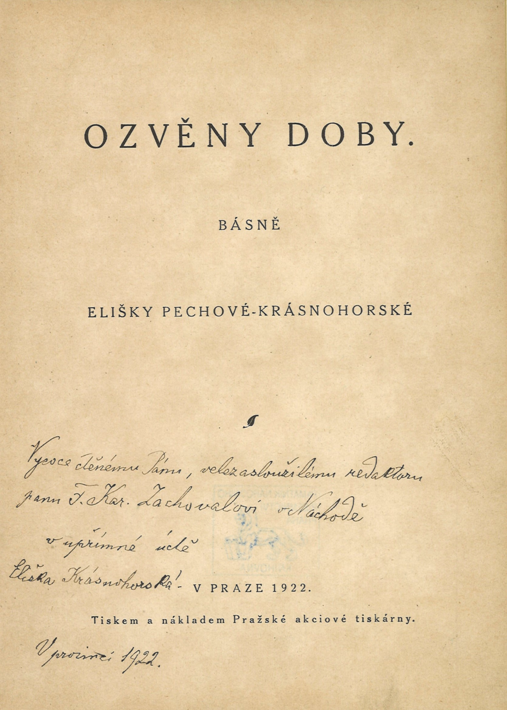 Názvové údaje Ozvěny doby : básně / Elišky Pechové-Krásnohorské Osobní jméno Pechová-Krásnohorská, Eliška, 1847-1926 (Autor) Další autoři Pražská akciová tiskárna (Nakladatel, vydavatel) (Tiskař) Nakladatel V Praze : tiskem a nákladem Pražské akciové tiskárny, 1922 Rozsah 120 stran ; 22 cm Klíčová slova česká literatura * poezie * česká poezie * vlastenecká poezie Počet ex. 2, z toho volných 2 Druh dok. monografie Signatura C12b 14969, C12b 19714