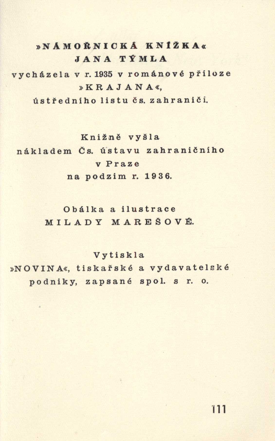 Názvové údaje Společenská škola : žákovská samospráva, školní kluby a společná shromáždění na škole II. stupně / [Anna] Kantová, [Jan] Kosina, [Jan] Týml Osobní jméno Kantová, Anna, 1889-1965 (Autor) (Dedikátor) Další autoři Kosina, Jan Evangelista, 1827-1899 (Autor) (Dedikátor) Týml, Jan, 1905-1945 (Autor) (Dedikátor) Hora, Josef, 1891-1945 (Dedikant) Korp. Dědictví Komenského (vydavatelství) (Nakladatel, vydavatel) Tiskařské a nakladatelské družstvo "Pokrok" (tiskárna, nakladatelství, vydavatelství) (Tiskař) Nakladatel V Praze : Dědictví Komenského, 1934 Výrobce (Pokrok) Rozsah 184, [3] s. ; 8° Klíčová slova škola * školáci * školní docházka * školní vzdělání Počet ex. 1, z toho volných 1 Druh dok. monografie Signatura Hora I 1201 Názvové údaje Hej, ty Rusi nečesaná, nemytá! / Jan Týml Osobní jméno Týml, Jan, 1905-1945 (Autor) Nakladatel Praha : Volná myšlenka, 1932 Výrobce Stiebling a Havelka Rozsah 89 stran ; 17 cm Klíčová slova SSSR * cestopisné reportáže * cestopisné črty * poznámky * stol. 20., léta 30. Druh dok. monografie Názvové údaje Námořnická knížka Jana Týmla [z cesty Hamburg-New York / obálka a ilustrace Milady Marešové] Osobní jméno Týml, Jan, 1905-1945 (Autor) Další autoři Marešová, Milada, 1901-1987 (Ilustrátor) (Autor obálky) Korp. Československý ústav zahraniční (v Praze) (Nakladatel, vydavatel) Novina (firma) (Tiskař) Nakladatel Praha : Československý ústav zahraniční, 1936 Výrobce (Novina) Rozsah 111 s., xxxii obr. příl. Klíčová slova česká próza * cestopisné reportáže * mořeplavecké cesty * r. 1918 Počet ex. 1, z toho volných 0 Druh dok. monografie Signatura VMartínek 1425 Názvové údaje Dvanáct poutí světem : vyprávění o českých osudech v širém světě : soubor povídek / Jan Drda, Jaroslav Havlíček, Stanislav Jandík, Jaromír John, Josef Kopta, František Kubka, Jiří Mařánek, Zdeněk Němeček, Karel Nový, Jan Týml, A.J. Urban, Edvard Valenta, Jan Weiss ; kresby a obrazy v textu a na obálce: Ctibor Štolovský Osobní jméno Drda, Jan, 1915-1970 (Autor) Další autoři Jandík, Stanislav, 1902-1970 (Autor) Havlíček, Jaroslav, 1896-1943 (Autor) John, Jaromír, 1882-1952 (Autor) Kopta, Josef, 1894-1962 (Autor) Kubka, František, 1894-1969 (Autor) Mařánek, Jiří, 1891-1959 (Autor) Němeček, Zdeněk, 1894-1957 (Autor) Nový, Karel, 1890-1980 (Autor) Týml, Jan, 1905-1945 (Autor) Urban, A. Jaroslav, 1899-1962 (Autor) Valenta, Edvard, 1901-1978 (Autor) Weiss, Jan, 1892-1972 (Autor) Štolovský, Ctibor, 1913- (Ilustrátor) Korp. Čin - tiskové a nakladatelské družstvo československých legionářů (Nakladatel, vydavatel) Nakladatel Praha : Čin, tiskové a nakladatelské družstvo, 1941 Výrobce Grafia Rozsah 241 stran, 12 nečíslovaných listů obrazových příloh : ilustrace ; 29 cm Klíčová slova česká literatura * česká próza * povídky * osudy lidí Počet ex. 1, z toho volných 1 Druh dok. monografie Signatura P 56 a 2