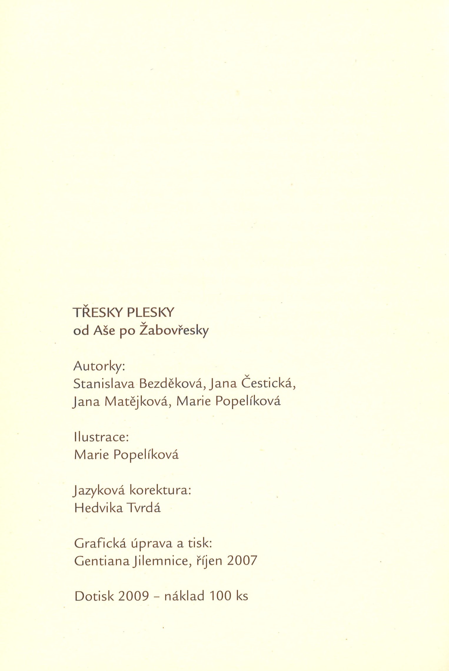 Názvové údaje Portrét mého muže / Marie Popelíková ; ilustrace Marie Popelíková Osobní jméno Popelíková, Marie (Autor) (Ilustrátor) (Nakladatel, vydavatel) Další autoři Gentiana Jilemnice (firma) (Knižní grafik) (Tiskař) Nakladatel [Kladno] : Marie Popelíková, 2016 Výrobce Jilemnice : Gentiana Rozsah 46 stran : ilustrace ; 21 cm Klíčová slova česká literatura * soukromý tisk * drobné prózy * drobné příběhy * vzpomínky * Česko * stol. 21. Počet ex. 1, z toho volných 1 Druh dok. monografie Signatura LITb 00294 Názvové údaje Třesky plesky od Aše po Žabovřesky / autorky: Bezděková Stanislava, Čestická Jana, Matějková Jana, Popelíková Marie ; ilustrace: Popelíková Marie ; grafická úprava a tisk: Gentiana Jilemnice Osobní jméno Bezděková, Stanislava (Autor) Další autoři Čestická, Jana (Autor) Matějková, Jana (Autor) Popelíková, Marie (Autor) (Ilustrátor) (Nakladatel, vydavatel) Korp. Gentiana Jilemnice (firma) (Knižní grafik) (Tiskař) Nakladatel [Česko] : [Marie Popelíková], 2007 Výrobce Jilemnice : Gentiana Rozsah 53 stran : ilustrace ; 21 cm Klíčová slova česká poezie * básně * sbírka básní * soukromý tisk Počet ex. 1, z toho volných 1 Druh dok. monografie Signatura LITb 01629