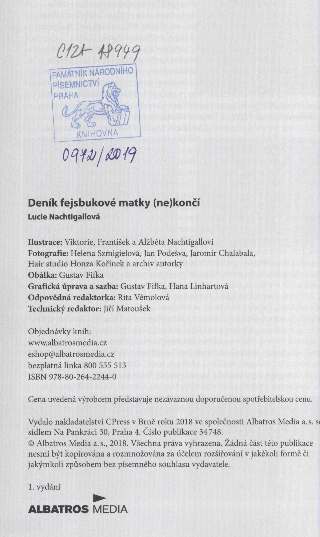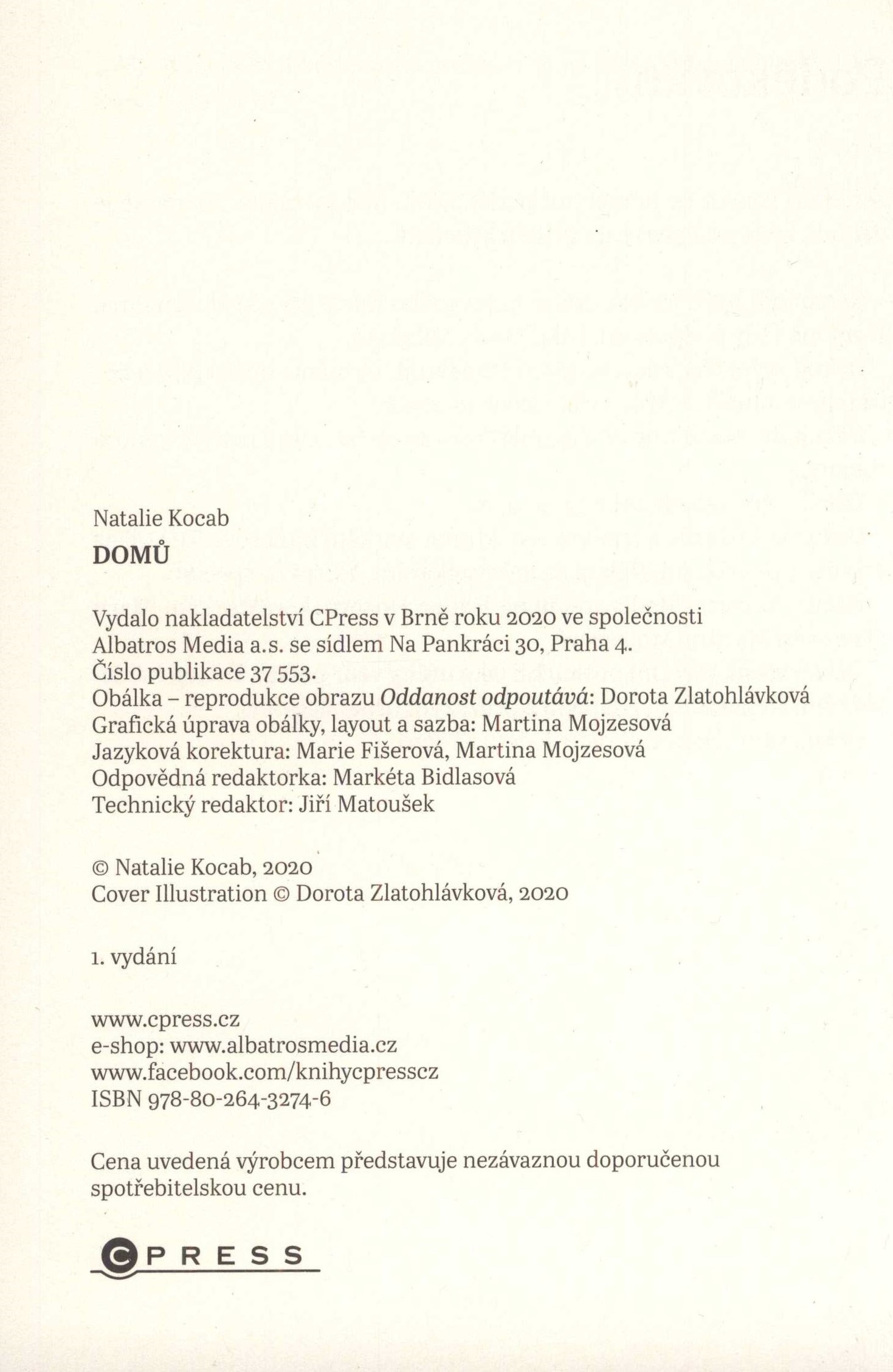 Názvové údaje Moje řeč : fejtónky Dobré češtiny / Michal Beck, Barbora Čiháková, Jana Fleglová, Lenka Hniličková, Radek Hochmal, Daniela Iwashita, Markéta Kořená, Daniel Kubec, Lucie Kukačková, Jan Mazanec, Barbora Podaná, Lukáš Prchal, Nicole R. Snová a Anna Štičková ; editoři Barbora Čiháková a Daniel Kubec ; ilustrace Pavel Reisenauer ; obálka, grafická úprava a sazba Lenka Hniličková Osobní jméno Beck, Michal, 1993- (Autor) Další autoři Čiháková, Barbora, 1988- (Autor) (Editor) Fleglová, Jana, 1992- (Autor) Hniličková, Lenka, 1989- (Autor) (Autor obálky) (Knižní grafik) (Sazeč) Hochmal, Radek, 1984- (Autor) Iwashita, Daniela, 1971- (Autor) Kořená, Markéta, 1971-2024 (Autor) Kubec, Daniel, 1988- (Autor) (Editor) Kukačková, Lucie, 1989- (Autor) Mazanec, Jan, 1990- (Autor) Podaná, Barbora, 1990- (Autor) Prchal, Lukáš, 1989- (Autor) Snová, Nicole Rebeka, 1990- (Autor) Štičková, An, 1994- (Autor) Reisenauer, Pavel, 1961-2024 (Ilustrátor) Korp. Albatros Media (firma) (Nakladatel, vydavatel) CPress (nakladatelství) (Nakladatel, vydavatel) Finidr (tiskárna) (Tiskař) Nakladatel V Brně : CPress, 2016 Výrobce [Český Těšín] : Finidr, s. r. o. Rozsah 191 stran ; 21 cm Klíčová slova čeština * blogy * fejetony Počet ex. 1, z toho volných 1 Druh dok. monografie Signatura C12b 17447 Názvové údaje Sekaná s malinama / Jaroslava Černá ; obálka a sazba: Věra Mleczková Osobní jméno Černá, Jaroslava, 1959- (Autor) Další autoři Mleczková, Věra (Autor obálky) (Sazeč) Korp. CPress (nakladatelství) (Nakladatel, vydavatel) Centa (tiskárna) (Tiskař) Nakladatel Brno : CPress, 2017 Výrobce [Brno] : CENTA spol. s r.o. Rozsah 231 stran ; 22 cm Klíčová slova česká literatura * próza * román pro ženy * životní osudy * ženy * spisovatelka * učitelka * osudové události Počet ex. 1, z toho volných 1 Druh dok. monografie Signatura C12b 17691 Názvové údaje Útesy / Jaroslava Černá Osobní jméno Černá, Jaroslava, 1959- (Autor) Další autoři Mleczková, Věra (Autor obálky) (Sazeč) Korp. CPress (nakladatelství) (Nakladatel, vydavatel) Centa (tiskárna) (Tiskař) Nakladatel Brno : CPress, 2017 Výrobce [Brno] : Centa spol. s r.o. Rozsah 296 stran ; 22 cm Klíčová slova česká literatura * próza * Černá J. * román * román pro ženy Počet ex. 1, z toho volných 1 Druh dok. monografie Signatura C12b 17837 Názvové údaje Jed pro Litviněnka : příběh jeho vraždy a Putinovy války se Západem / Luke Harding ; překlad: Anna Poskerová Osobní jméno Harding, Luke, 1968- (Autor) Další autoři Knapiková, Anna, 1990- (Překladatel) Pižurný, Adam, 1986- (Autor obálky) Korp. CPress (nakladatelství) (Nakladatel, vydavatel) Europrint (tiskárna) (Tiskař) Unifikovaný název Very expensive poison. Česky Nakladatel Brno : CPress, 2017 Výrobce [Praha] : Europrint a.s. Rozsah 399 stran, 8 nečíslovaných stran obrazových příloh : ilustrace (některé barevné), portréty, faksimile ; 21 cm Osobní hesla Litvinenko, Aleksandr Val‘terovič, 1962-2006 - ruský zpravodajský důstojník, zavražděný v r. 2006 Heslo korporace (zkrác. heslo korp.) : Federal'naja služba bezopasnosti Rossii Chronologie 2015-2016 Předmětová hesla agenti - Rusko - 20.-21. století * disidenti - Rusko - 20.-21. století * zpravodajské služby - Rusko - 20.-21. století * státní terorismus - Rusko - 20.-21. století * politické vraždy - Rusko - 2006 * policejní vyšetřování - Velká Británie - 21. století * secret service agents - Russia - 20th-21st centuries * dissenters - Russia - 20th-21st centuries * intelligence service - Russia - 20th-21st centuries * state terrorism - Russia - 20th-21st centuries * assassinations - Russia - 2006 * police enquiry - Great Britain - 21st century Geografické heslo Rusko - politika a vláda - 21. století * Russia - politics and government - 21st century Klíčová slova anglická literatura * překlad * Sovětský svaz * Velká Británie * důstojníci * špióni * Litviněnko A. * stol. 21. Počet ex. 1, z toho volných 1 Druh dok. monografie Signatura C12b 17850 Názvové údaje Králova třetí žena : historický román / Jindřiška Kracíková ; ilustrace: Cyril Gaja Osobní jméno Kracíková, Jindřiška, 1977- (Autor) Další autoři Gaja, Cyril, 1986- (Ilustrátor) Korp. CPress (nakladatelství) (Nakladatel, vydavatel) Nakladatel V Brně : CPress, 2019 Rozsah 397 stran : ilustrace ; 22 cm Klíčová slova česká literatura * próza * historický román * příběh * královna * mezilidské vztahy * intriky * nenávist * kultura * historie * nejstarší dějiny * Přední východ Počet ex. 1, z toho volných 1 Druh dok. monografie Signatura LITb 00221 Názvové údaje Deník fejsbukové matky (ne)končí / Lucie Nachtigallová ; ilustrace : Viktorie, František a Alžběta Nachtigallovi ; fotografie: Helena Szmigielová, Jan Podešva, Jaromír Chalabala, Hair studio Honza Kořínek a archiv autorky ; obálka: Gustav Fifka ; grafická úprava a sazba: Gustav Fifka, Hana Linhartová Osobní jméno Nachtigallová, Lucie, 1977- (Autor) Další autoři Szmigielová, Helena (Fotograf) Podešva, Jan, 1953- (Fotograf) Chalabala, Jaromír, 1976- (Fotograf) Fifka, Gustav, ml., 1973- (Autor obálky) (Knižní grafik) (Sazeč) Linhartová, Hana (Knižní grafik) (Sazeč) Korp. CPress (nakladatelství) (Nakladatel, vydavatel) Nakladatel V Brně : CPress, 2018 Rozsah 327 stran : barevné ilustrace ; 21 cm Osobní hesla Nachtigallová, Lucie, 1977- - blogerka, novinářka, produkční, dramaturgyně, redaktorka, spolumajitelka firmy, spisovatelka Chronologie 2015-2017 Předmětová hesla women journalists - Czechia - 20th-21st centuries * mothers and children - humor Klíčová slova česká literatura * facebook * blogy * biografické vyprávění * deníkové záznamy * rodina * matka * děti * každodenní život * humor * r. 2015-2017 Počet ex. 1, z toh
