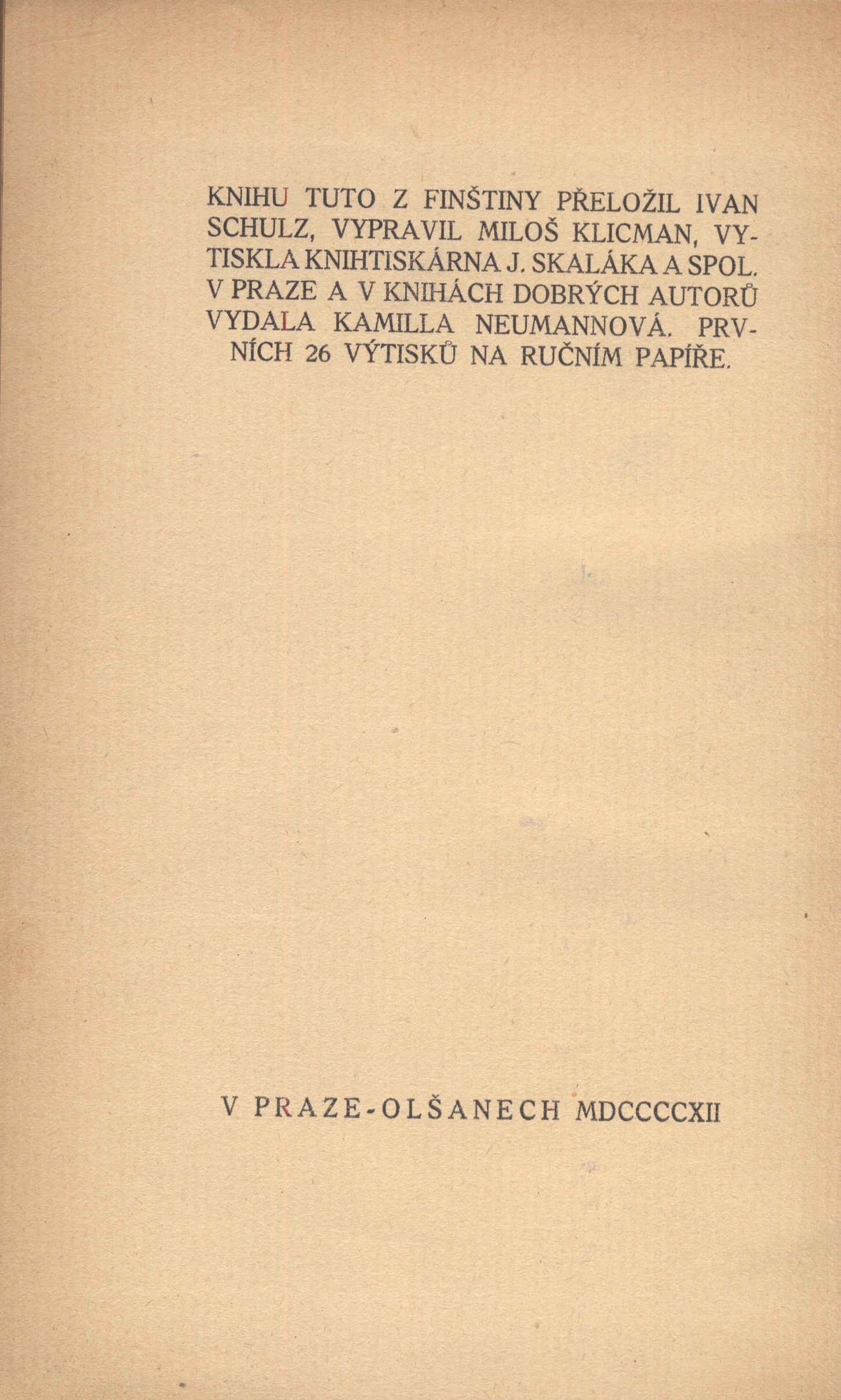 Názvové údaje Osamělý / Juhani Aho ; [knihu tuto z finštiny přeložil Ivan Schulz ; vypravil Miloš Klicman] Osobní jméno Aho, Juhani, 1861-1921 (Autor) Další autoři Schulz, Ivan, 1871-1935 (Překladatel) Klicman, Miloš František, 1890-1957 (Ilustrátor) (Knižní grafik) Korp. Nakladatelství Kamilla Neumannová (Nakladatel, vydavatel) Lidová knihtiskárna J. Skalák a spol. (Tiskař) Nakladatel V Praze : Knihy dobrých autorů, Kamilla Neumannová, 1912 Výrobce (vytiskla Knihtiskárna J. Skaláka a spol.) Rozsah 94 s. : il. ; 21 cm Klíčová slova finská literatura * próza * překlad * novela Počet ex. 1, z toho volných 1 Druh dok. monografie Signatura Topič 0303 Názvové údaje Osamělý / Juhani Aho ; knihu tuto z finštiny přeložil Ivan Schulz ; vypravil Miloš Klicman Osobní jméno Aho, Juhani, 1861-1921 (Autor) Další autoři Klicman, Miloš František, 1890-1957 (Grafický technik) Schulz, Ivan, 1871-1935 (Překladatel) Hellmuthová, Marta, 1917-1988 (Dřívější majitel) Neumannová, Kamila, 1874-1956 (Nakladatel, vydavatel) Korp. Nakladatelství Kamilla Neumannová (Nakladatel, vydavatel) Lidová knihtiskárna J. Skalák a spol. (Tiskař) Nakladatel V Praze : Kamilla Neumannová, 1912 Výrobce V Praze : Knihtiskárna J. Skaláka a spol., 1912 Rozsah 94 stran Klíčová slova finská literatura * prózy * novely Počet ex. 4, z toho volných 4 Druh dok. monografie Signatura Hoffmeister 0374, VMartínek 0958, VHB 2972, P 113 e 6 Názvové údaje Kresby k "Sirotku" / Mikuláš Aleš ; rozborem doprovází František Žákavec ; Josef Váchal Osobní jméno Aleš, Mikoláš, 1852-1913 (Ilustrátor) Další autoři Žákavec, František, 1878-1937 (Autor komentáře) Váchal, Josef, 1884-1969 Korp. B. Kočí (nakladatelství a knihkupectví) (Nakladatel, vydavatel) Lidová knihtiskárna J. Skalák a spol. (Tiskař) Nakladatel Praha : B. Kočí, 1917 Výrobce (Tiskem Lidové knihtiskárny J. Skalák a spol.) Rozsah 19 s. : il. Klíčová slova česká literatura * české písně * národní písně * lidové písně * česká kresba * čeští malíři * Aleš M. * stol. 19. Počet ex. 1, z toho volných 1 Druh dok. monografie Signatura Váchal 217 Názvové údaje Kresby k Sirotku / Mikuláš Aleš ; přístupným rozborem doprovází František Žákavec Osobní jméno Aleš, Mikoláš, 1852-1913 (Ilustrátor) Další autoři Žákavec, František, 1878-1937 (Autor úvodu atd.) Korp. B. Kočí (nakladatelství a knihkupectví) (Nakladatel, vydavatel) Lidová knihtiskárna J. Skalák a spol. (Tiskař) Nakladatel V Praze : Vede a vydává nakladatel B. Kočí, 1917 Výrobce (Tiskem Lidové knihtiskárny J. Skalák a spol.) Rozsah 19 s., [14] l. obr. příl. : il. ; 16 cm Klíčová slova česká literatura * české písně * národní písně * lidové písně * česká kresba * čeští malíři * Aleš M. * stol. 19. * r. 1917 Počet ex. 2, z toho volných 2 Druh dok. monografie Signatura Holan 1631, AVrbova 377 Názvové údaje Ex Ponto / Ivo Andrić ; ze srbochorvatštiny přeložil Josef Pelíšek Osobní jméno Andrić, Ivo, 1892-1975 (Autor) Další autoři Pelíšek, Josef, 1889-1969 (Překladatel) Minařík, Stanislav, 1884-1944 (Nakladatel, vydavatel) Bartulović, Niko, 1890-1943 (Autor úvodu atd.) Korp. Lidová knihtiskárna J. Skalák a spol. (Tiskař) Stanislav Minařík (nakladatelství) (Nakladatel, vydavatel) Nakladatel Na Smíchově : Stanislav Minařík, 1919 Výrobce Tiskem J. Skaláka) Rozsah 131 s. Klíčová slova srbochorvatská literatura * srbochorvatská poezie * básně * próza * básně v próze * reflexe * vězení * vězeňská literatura * vězeňská próza * lyrika * lyrizovaná próza * stol. 20., léta 10. Počet ex. 2, z toho volných 2 Druh dok. monografie Signatura KaG I C2 59, VHB 1673 Názvové údaje Jediný návrat / Zdeněk Bár ; [v úpravě a s kresbami V. Bilovského] Osobní jméno Bár, Zdeněk, 1904-1980 (Autor) (Dedikátor) Další autoři Beneš Buchlovan, Bedřich, 1885-1953 (Dedikant) (Dřívější majitel) (Dárce) Bilovský, Václav, 1902-1967 (Ilustrátor) (Nakladatel, vydavatel) Korp. Oborný a Bradna (Moravská Ostrava, Česko) (Tiskař obrazu) Lidová knihtiskárna J. Skalák a spol. (Tiskař) Nakladatel V Moravské Ostravě : V. Bilovský, 1937 Výrobce (Lidová knihtiskárna) Rozsah 9 s. : il. Klíčová slova česká literatura * stol. 20., léta 30. * bibliofilská vydání * bibliofilské tisky * česká próza * bibliofilie Počet ex. 1, z toho volných 1 Druh dok. monografie Signatura KaG LXI 34 Názvové údaje Peklo / Henri Barbusse ; přeložil Jindřich Hořejší Osobní jméno Barbusse, Henri, 1873-1935 (Autor) Další autoři Hořejší, Jindřich, 1886-1941 (Překladatel) (Dedikátor) Hořejší, Růžena, 1899- (Dedikant) Korp. Ústřední dělnické nakladatelství a knihkupectví (Nakladatel, vydavatel) Lidová knihtiskárna J. Skalák a spol. (Tiskař) Nakladatel V Praze : Ústřední dělnické nakladatelství a knihkupectví (Ant. Svěcený), 1920 Výrobce Lidová knihtiskárna (J. Skalák a spol.) Rozsah 227 stran ; 20 cm Klíčová slova francouzská literatura * překlady do češtiny * romány Počet ex. 3, z toho volných 3 Druh dok. monografie Signatura VMartínek 1536, AHO 0478, AHO 0486 Názvové údaje Hudba pramenů / Otakar Březina ; obrazy doprovodil František Bílek Osobní jméno Březina, Otokar, 1868-1929 (Autor) (Dedikátor) (Autor podpisu) Další autoři Bílek, František, 1872-1941 (Ilustrátor) Durych, Jaroslav, 1886-1962 (Dedikant) Holman, Petr, 1951-2019 (Korektor tištěných materiálů) Bělohlávek, Bedřich, 1902-1991 (Autor podpisu) Korp. Odkaz (nakladatelství) (Nakladatel, vydavatel) Lidová knihtiskárna J. Skalák a spol. (Tiskař) Nakladatel V Praze : nákladem Vydavatelského sdružení Odkaz, 1918 Výrobce Lidová knihtiskárna J. Skalák a spol. Rozsah 51 stran, 10 nečíslovaných listů obrazových příloh : ilustrace ; 23 cm Kl