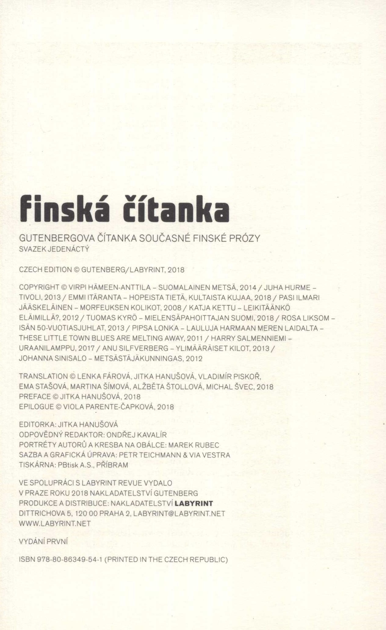 Názvové údaje Finská čítanka : Gutenbergova čítanka současné finské prózy : finsko-české vydání / editorka: Jitka Hanušová ; překlad Lenka Fárová, Jitka Hanušová, Vladimír Piskoř, Ema Stašová, Martina Šímová, Alžběta Štollová, Michal Švec ; doslov Viola Parente-Čapková ; portréty autorů a kresba na obálce marek Rubec ; sazba a grafická úprava Petr Teichmann & Via Vestra Další autoři Hanušová, Jitka, 1982- (Editor) (Autor úvodu atd.) (Překladatel) Fárová, Lenka, 1970- (Překladatel) Piskoř, Vladimír, 1960- (Překladatel) Stašová, Ema, 1986- (Překladatel) Šímová, Martina (Překladatel) Štollová, Alžběta, 1981- (Překladatel) Švec, Michal, 1984- (Překladatel) Parente-Čapková, Viola, 1966- (Autor doslovu, tiráže atd.) Rubec, Marek, 1979- (Ilustrátor) (Autor obálky) Teichmann, Petr, 1973- (Sazeč) Korp. Labyrint (nakladatelství) (Nakladatel, vydavatel) Gutenberg (nakladatelství) (Nakladatel, vydavatel) PBtisk (tiskárna) (Tiskař) Labyrint Revue (časopis) (Jiná role) Nakladatel Praha : Labyrint revue : Gutenberg, 2018 Výrobce Příbram : PBtisk A.S. Rozsah 241 stran : portréty ; 19 cm Klíčová slova finská literatura * dvojjazyčné vydání * překlady * antologie * čítanka * současná próza * povídky * dramata Počet ex. 1, z toho volných 1 Druh dok. monografie Signatura C12b 18935