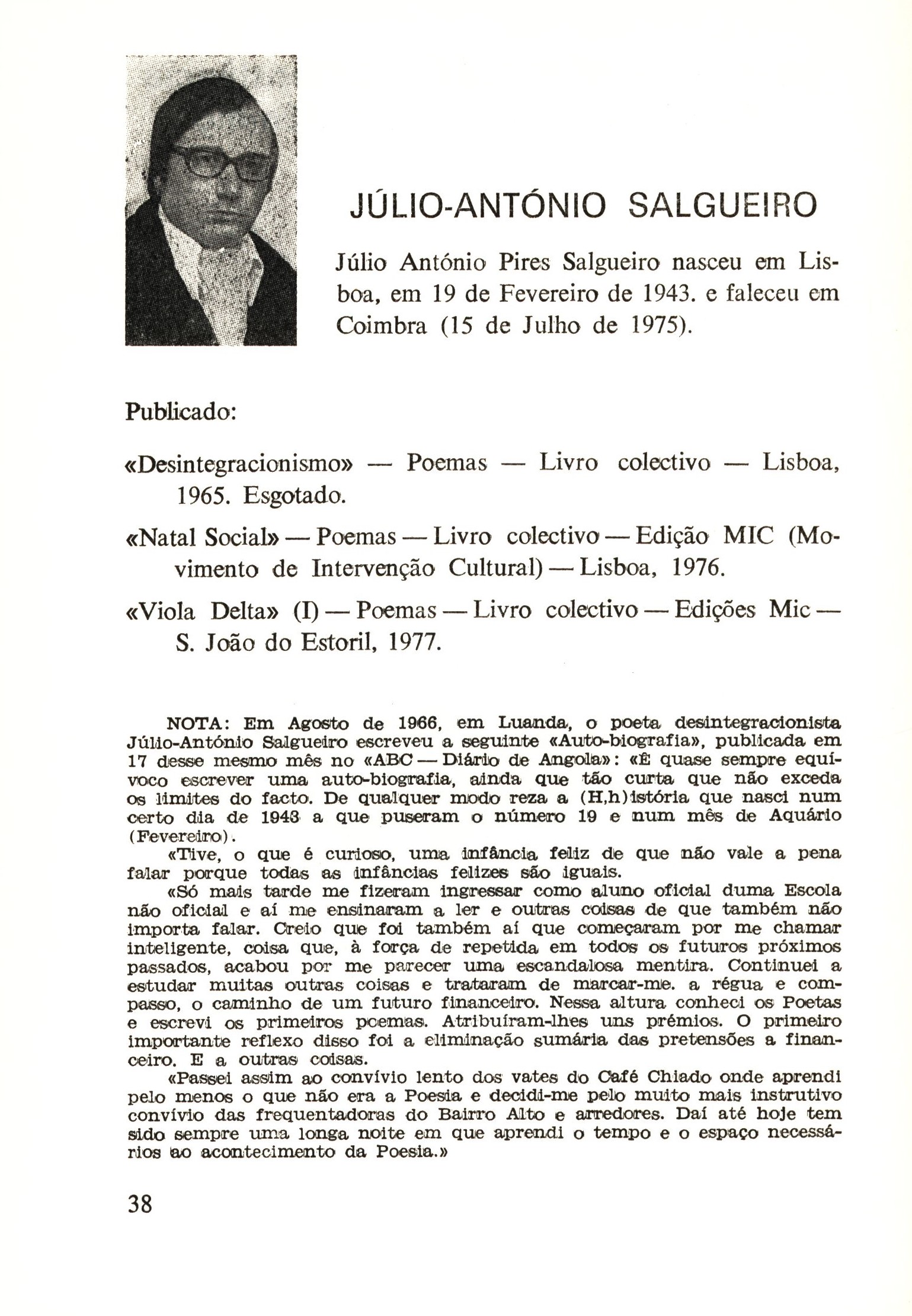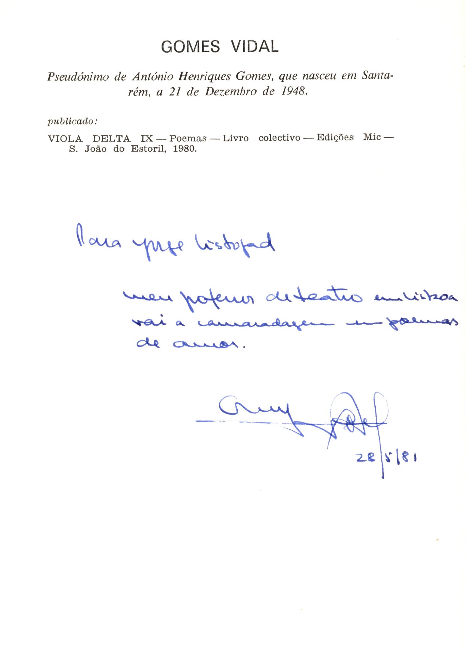 Názvové údaje 10 anos de poesia (1962-1972) : antologia / Fernando Grade Osobní jméno Grade, Fernando, 1943- (Autor) Další autoři Edições Mic (Nakladatel, vydavatel) Nakladatel [S. João do Estoril] : Edições Mic, 1977 Rozsah 124 stran ; 20 cm Klíčová slova portugalská literatura * portugalsky psaná literatura * stol. 20. * poezie Počet ex. 1, z toho volných 1 Druh dok. monografie Signatura Listopad 0332 Názvové údaje 25 anos de poesia : antologia 1962 - 1987 / Fernando Grade Osobní jméno Grade, Fernando, 1943- (Autor) (Dedikátor) Další autoři Listopad, František, 1921-2017 (Dedikant) Korp. Edições Mic (Nakladatel, vydavatel) Nakladatel S. João do Estoril : Edições Mic, 1988 Rozsah 174 stran : ilustrace ; 21 cm Klíčová slova poezie * antologie * portugalská literatura * portugalsky psaná literatura * básníci * stol. 20. Počet ex. 1, z toho volných 1 Druh dok. monografie Signatura Listopad 0439 Názvové údaje Alma burra / Fernando Grade Osobní jméno Grade, Fernando, 1943- (Autor) Další autoři Edições Mic (Nakladatel, vydavatel) Editorial Minerva (Tiskař) Nakladatel S. João do Estoril : Edições Mic, 1987 Výrobce Lisabon : Editorial Minerva Rozsah 46 stran: čb. fotografie ; 21 cm Klíčová slova portugalská literatura * portugalsky psaná literatura * portugalsky píšící spisovatelé * poezie * básně Počet ex. 1, z toho volných 1 Druh dok. monografie Signatura Listopad 0546 Názvové údaje O bando da papoila: Poemas / Fernando Grade Osobní jméno Grade, Fernando, 1943- (Autor) Další autoři Edições Mic (Nakladatel, vydavatel) Editorial Minerva (Tiskař) Nakladatel S. João do Estoril : Edições Mic, 1983 Výrobce Lisabon : Editorial Minerva, Rozsah 64 stran: čb. fotografie, čb. ilustrace ; 20 cm Klíčová slova portugalská literatura * portugalsky psaná literatura * portugalsky píšící spisovatelé * poezie * básně Počet ex. 1, z toho volných 1 Druh dok. monografie Signatura Listopad 0518 Názvové údaje As cordas e os metais, o sabor da paisagem / Mário Machado Fraião Osobní jméno Machado Fraião, Mário (Autor) Další autoři Edições Mic (Nakladatel, vydavatel) Oficinas da Editorial Minerva (Minigráfica – Cooperativa de Artes Gráficas, CRL) (Tiskař) Nakladatel Estoril : Edições Mic, 1985 Výrobce Lisabon : Oficinas da Editorial Minerva (Minigráfica – Cooperativa de Artes Gráficas, CRL), Rozsah 60 stran ; 20 cm Klíčová slova portugalská literatura * portugalsky píšící spisovatelé * portugalsky psaná literatura * poezie * sbírka básní Počet ex. 1, z toho volných 1 Druh dok. monografie Signatura Listopad 0489 Názvové údaje Mecânico de ovnis / Fernando Grade Osobní jméno Grade, Fernando, 1943- (Autor) (Dedikátor) Další autoři Listopad, František, 1921-2017 (Dedikant) Korp. Edições Mic (Nakladatel, vydavatel) Nakladatel Estoril : Edições Mic e Fernando Grade, 1984 Rozsah 39 stran : ilustrace ; 22 cm Klíčová slova portugalská literatura * portugalsky psaná literatura * obscénní literatura * poezie * stol. 20., léta 80. Počet ex. 1, z toho volných 1 Druh dok. monografie Signatura Listopad 0114 Názvové údaje O vinho dos mortos : poemas / Fernando Grade Osobní jméno Grade, Fernando, 1943- (Autor) (Dedikátor) Další autoři Listopad, František, 1921-2017 (Dedikant) Korp. Edições Mic (Nakladatel, vydavatel) Nakladatel [S. João do Estoril] : Edições Mic, 1977 Výrobce Tipografia da editorial Minerva Rozsah 100 stran : černobílé ilustrace ; 21 cm Klíčová slova portugalská literatura * portugalsky psaná literatura * stol. 20. * poezie * sbírka básní Počet ex. 1, z toho volných 1 Druh dok. monografie Signatura Listopad 0331 Názvové údaje Viola delta II : Poemas / Carlos Manuel Nogueira ; Fernando Grade ; João Centeno Castanho ; José Carlos Soares ; Júlio-António Salgueiro Osobní jméno Nogueira, Carlos Manuel (Autor) Další autoři Grade, Fernando, 1943- (Autor) Centeno Castanho, João (Autor) Soares, José Carlos (Autor) Salgueiro, Júlio-António (Autor) Korp. Edições Mic (Nakladatel, vydavatel) Editorial Minerva (Tiskař) Nakladatel S. João do Estoril : Edições Mic, 1978 Výrobce Lisabon : Editorial Minerva, Rozsah 46 stran : čb. ilustrace, reprodukce, čb. fotografie ; 20 cm Klíčová slova portugalská literatura * portugalsky psaná literatura * portugalsky píšící spisovatelé * poezie * básně Počet ex. 1, z toho volných 1 Druh dok. monografie Signatura Listopad 0514 Názvové údaje Viola delta IX : Poemas / Fernando Grade ; Gomes Vidal ; Henrique Madeira ; João Travanca Rêgo ; Pincar Osobní jméno Grade, Fernando, 1943- (Autor) Další autoři Vidal, Gomes (Autor) Madeira, Henrique (Autor) Travanca Rêgo, João (Autor) Pincar (Autor) Korp. Edições Mic (Nakladatel, vydavatel) Editorial Minerva (Tiskař) Nakladatel S. João do Estoril : Edições Mic, 1980 Výrobce Lisabon : Editorial Minerva, Rozsah 47 stran : čb. ilustrace ; 20 cm Klíčová slova portugalská literatura * portugalsky psaná literatura * portugalsky píšící spisovatelé * poezie * básně Počet ex. 1, z toho volných 1 Druh dok. monografie Signatura Listopad 0517 Názvové údaje Viola delta VI : Poemas / Fernando Grade ; Hugo Beja ; Manuel Murteira ; Natércia Fraga ; Paulo Brito e Abreu Osobní jméno Grade, Fernando, 1943- (Autor) Další autoři Beja, Hugo (Autor) Murteira, Manuel (Autor) Fraga, Natércia Brito e Abreu, Paulo (Autor) Korp. Edições Mic (Nakladatel, vydavatel) Editorial Minerva (Tiskař) Nakladatel S. João do Estoril : Edições Mic, 1979 Výrobce Lisabon : Editorial Minerva, Rozsah 46 stran : reprodukce, čb. fotografie ; 20 cm Klíčová slova portugalská literatura * portugalsky psaná literatura * portugalsky píšící spisovatelé * poezie * básně Počet ex. 1, z toho volných 1 Druh dok. monografie Signatura Listopad 0515