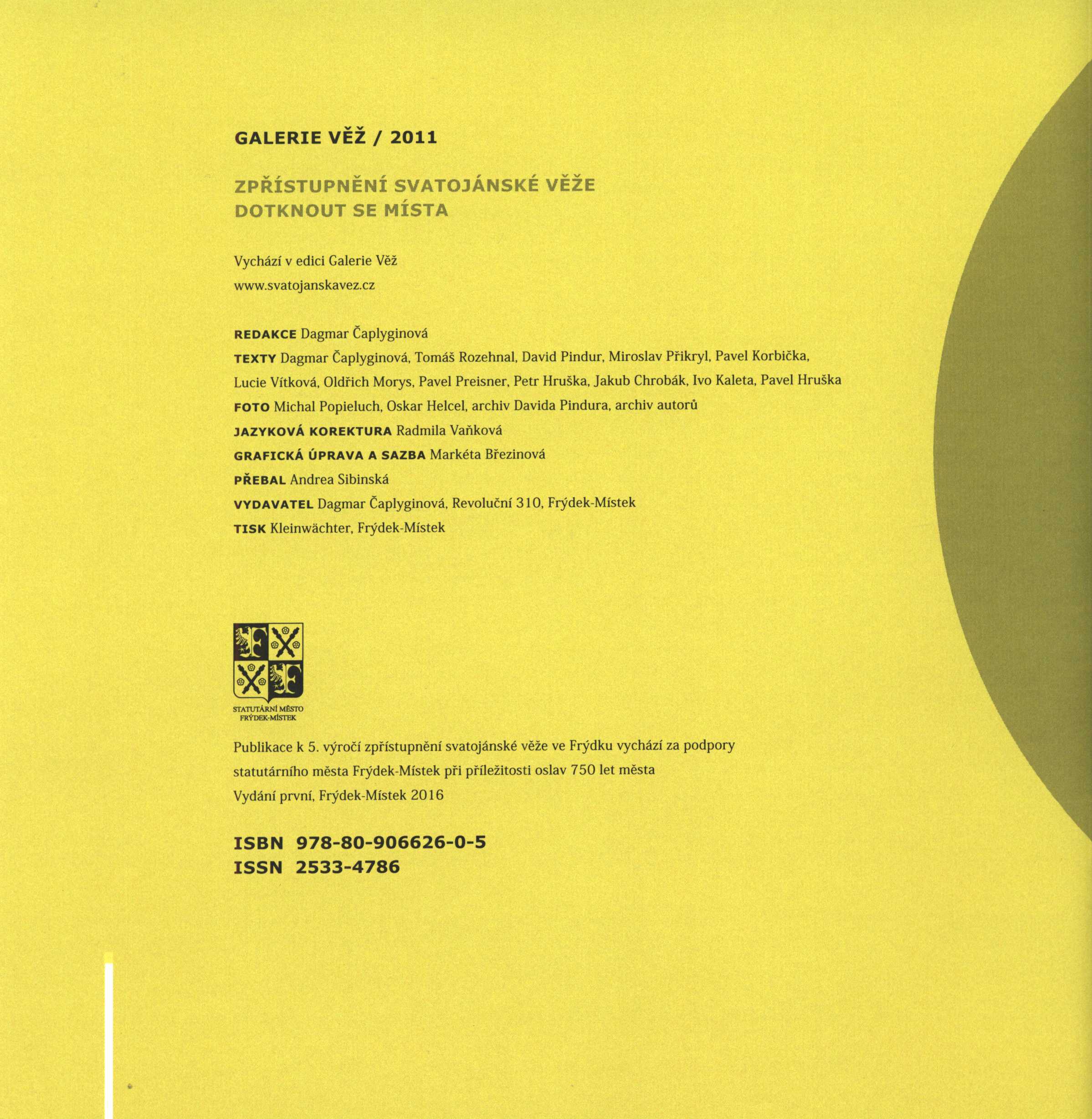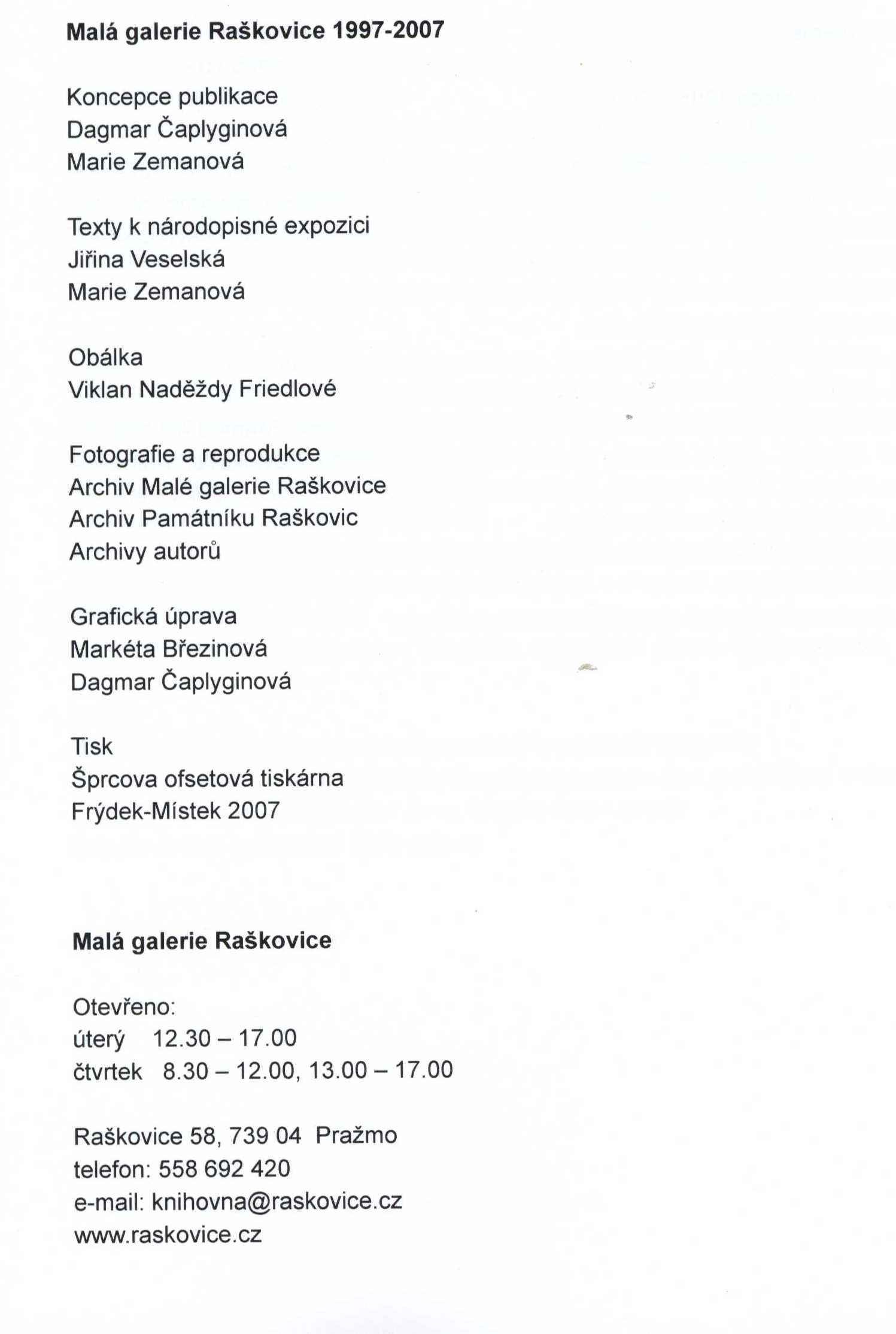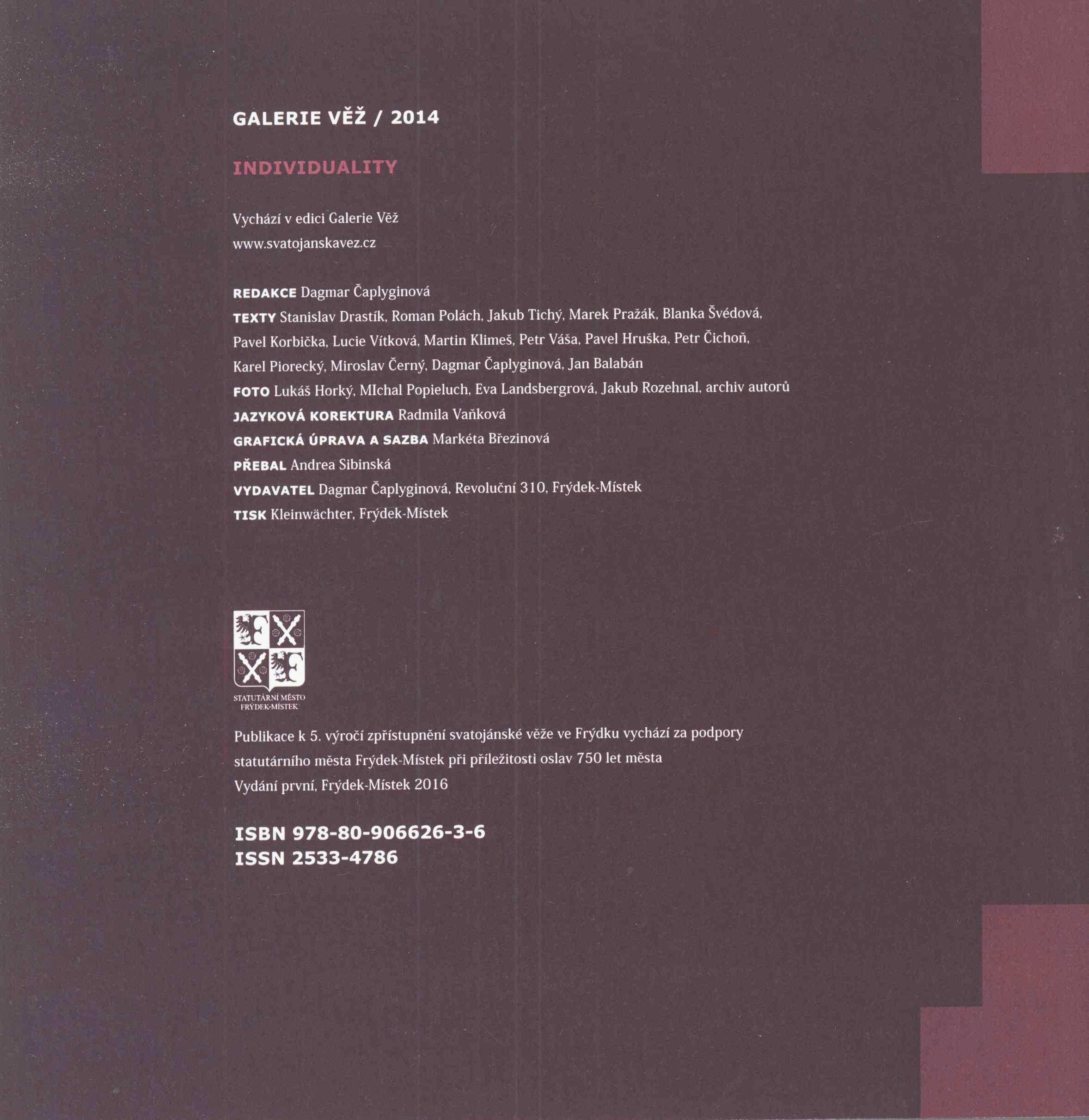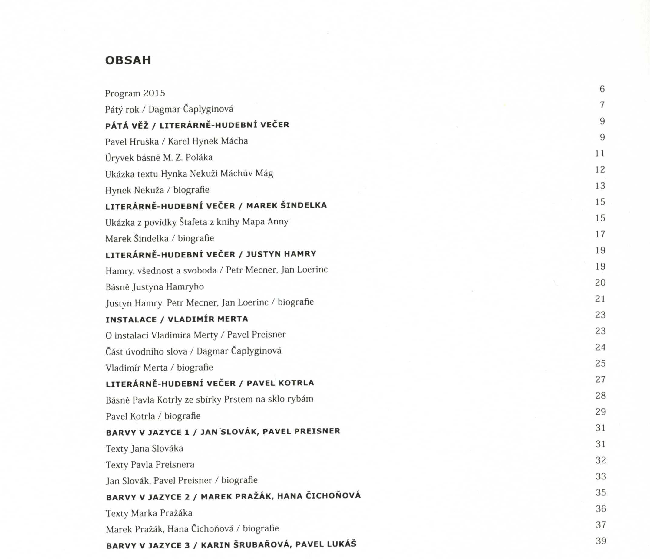Názvové údaje Barvy v jazyce ; Instalace / redakce Dagmar Čaplyginová Záhlaví-korpor. Galerie Věž (Frýdek-Místek, Česko) (Autor) Další autoři Čaplyginová, Dagmar, 1958- (Redaktor, výkonný redaktor) (Autor) (Nakladatel, vydavatel) Nakladatel Frýdek-Místek : Dagmar Čaplyginová, 2016 Výrobce Tisk Kleinwächter Rozsah 42 stran : ilustrace (některé barevné), portréty ; 22 cm Heslo korporace (zkrác. heslo korp.) : Galerie Věž (Frýdek-Místek, Česko) Geografické heslo Frýdek-Místek (Česko) Klíčová slova umělecké galerie * kulturní akce * r. 2015 * česká poezie * české výtvarné umění * instalační umění * literární večery * hudební umění * jubilejní publikace Počet ex. 1, z toho volných 1 Druh dok. monografie Signatura C12b 17914/5 Názvové údaje Individuality / redakce Dagmar Čaplyginová Záhlaví-korpor. Galerie Věž (Frýdek-Místek, Česko) (Autor) Další autoři Čaplyginová, Dagmar, 1958- (Redaktor, výkonný redaktor) (Autor) (Nakladatel, vydavatel) Nakladatel Frýdek-Místek : Dagmar Čaplyginová, 2016 Výrobce Tisk Kleinwächter Rozsah 42 stran : ilustrace (některé barevné), portréty ; 22 cm Heslo korporace (zkrác. heslo korp.) : Galerie Věž (Frýdek-Místek, Česko) Geografické heslo Frýdek-Místek (Česko) Klíčová slova umělecké galerie * kulturní akce * kulturní život * regionální kultura * česká poezie * programy * r. 2014 * jubilejní publikace Počet ex. 1, z toho volných 1 Druh dok. monografie Signatura C12b 17914/4 Názvové údaje ION ; Černé na bílém / redakce Dagmar Čaplyginová Záhlaví-korpor. Galerie Věž (Frýdek-Místek, Česko) (Autor) Další autoři Čaplyginová, Dagmar, 1958- (Redaktor, výkonný redaktor) (Autor) (Nakladatel, vydavatel) Nakladatel Frýdek-Místek : Dagmar Čaplyginová, 2016 Výrobce Tisk Kleimwächter Rozsah 22 stran : ilustrace (některé barevné) ; 22 cm Osobní hesla Zubek, Petr, 1967- - výtvarník Heslo korporace (zkrác. heslo korp.) : Galerie Věž (Frýdek-Místek, Česko) Geografické heslo Frýdek-Místek (Česko) Klíčová slova kulturní akce * výtvarní umělci * umělecké výstavy * české výtvarné umění * Česko * stol. 21. * instalace * instalační umění * programy * r. 2012 * jubilejní publikace Počet ex. 1, z toho volných 1 Druh dok. monografie Signatura C12b 17914/2 Názvové údaje Slovo v prostoru, prostor ve slovu ; Věž / redakce Dagmar Čaplyginová Záhlaví-korpor. Galerie Věž (Frýdek-Místek, Česko) (Autor) Další autoři Čaplyginová, Dagmar, 1958- (Redaktor, výkonný redaktor) (Autor) (Nakladatel, vydavatel) Nakladatel Frýdek-Místek : Dagmar Čaplyginová, 2016 Výrobce Tisk Kleinwächter Rozsah 36 stran : ilustrace (některé barevné), portréty ; 22 cm Heslo korporace (zkrác. heslo korp.) : Galerie Věž (Frýdek-Místek, Česko) Geografické heslo Frýdek-Místek (Česko) Klíčová slova umělecké galerie * kulturní akce * regionální kultura * česká poezie * Česko * r. 2013 * programy * jubilejní publikace Počet ex. 1, z toho volných 1 Druh dok. monografie Signatura C12b 17914/3 Názvové údaje Věž : 5. výročí zpřístupnění svatojánské věže ve Frýdku Záhlaví-korpor. Galerie Věž (Frýdek-Místek, Česko) (Autor) Další autoři Čaplyginová, Dagmar, 1958- (Nakladatel, vydavatel) Nakladatel Frýdek-Místek : Dagmar Čaplyginová, 2016 Výrobce Tisk Kleinwächter Rozsah 5 svazků (37, 22, 36, 42, 42 stran) : ilustrace (některé barevné), portréty ; 22 cm Heslo korporace (zkrác. heslo korp.) : Galerie Věž (Frýdek-Místek, Česko) Klíčová slova galerie * výročí * kulturní akce * regionální tvorba * r. 2011-2015 * jubilejní publikace Počet ex. 1, z toho volných 1 Druh dok. monografie Signatura C12b 17914 Názvové údaje Zpřístupnění svatojánské věže ; Dotknout se místa / redakce Dagmar Čaplyginová Záhlaví-korpor. Galerie Věž (Frýdek-Místek, Česko) (Autor) Další autoři Čaplyginová, Dagmar, 1958- (Autor) (Redaktor, výkonný redaktor) (Nakladatel, vydavatel) Nakladatel Frýdek-Místek : Dagmar Čaplyginová, 2016 Výrobce Tisk Kleinwächter Rozsah 37 stran : ilustrace (některé barevné), portréty, 1 faksimile ; 22 cm Heslo korporace (zkrác. heslo korp.) : Galerie Věž (Frýdek-Místek, Česko) Geografické heslo Frýdek-Místek (Česko) Klíčová slova kostely * věž * historie * kulturní akce * programy * regionální osobnosti * regionální kultura * regionální poezie * regionální próza * Česko * jubilejní publikace Počet ex. 1, z toho volných 1 Druh dok. monografie Signatura C12b 17914/1 Názvové údaje Malá galerie Raškovice : 1997-2007 / [texty k národopisné expozici Jiřina Veselská, Marie Zemanová ; koncepce publikace Dagmar Čaplyginová, Marie Zemanová] Osobní jméno Veselská, Jiřina, 1943- (Autor) Další autoři Zemanová, Marie, 1959- (Autor) (Sestavovatel, kompilátor) Čaplyginová, Dagmar, 1958- (Sestavovatel, kompilátor) Nakladatel Raškovice : Obec Raškovice, 2007 Výrobce Šprcova ofsetová tiskárna) Rozsah [25] s. : il. (některé barev.) ; 20 cm Heslo korporace (zkrác. heslo korp.) : Malá galerie (Raškovice, Česko) Geografické heslo Raškovice (Česko) Klíčová slova galerie * umělecké galerie * umělecké výstavy * národopisné sbírky * r. 1991-2010 * jubilejní publikace Počet ex. 1, z toho volných 1 Druh dok. monografie Signatura C12b 15351