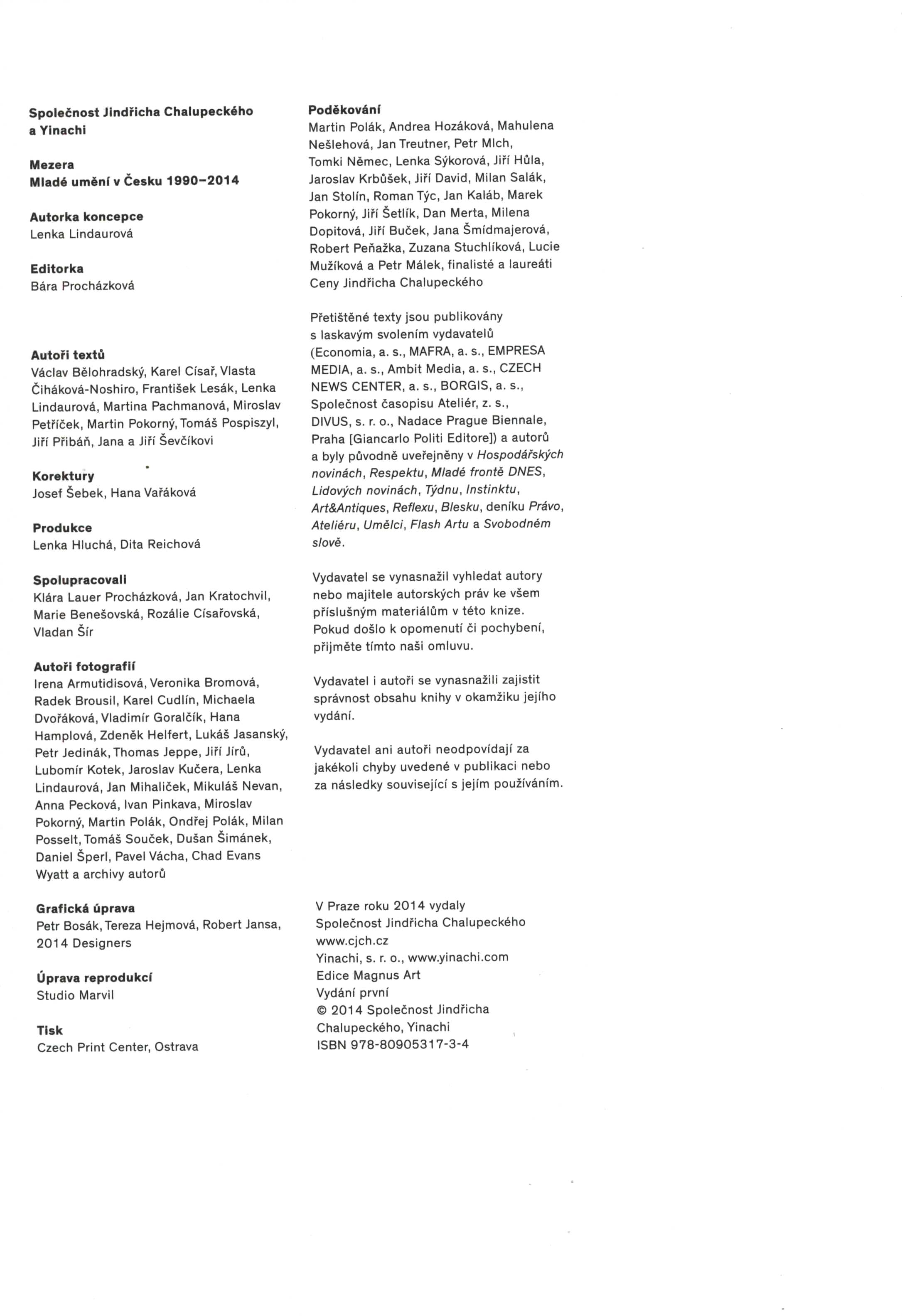 | Názvové údaje | Mezera : mladé umění v Česku 1990-2014 / Lenka Lindaurová ; editorka Bára Procházková ; autoři textů Václav Bělohradský, Karel Císař, Vlasta Čiháková-Noshiro, František Lesák, Lenka Lindaurová, Martina Pachanová, Miroslav Petříček, Martin Pokorný, Tomáš Pospiszyl, Jiří Přibáň, Jana a Jiří Ševčíkovi ; grafická úprava Petr Bosák, Tereza Hejmová, Robert Jansa, 2014 Designers