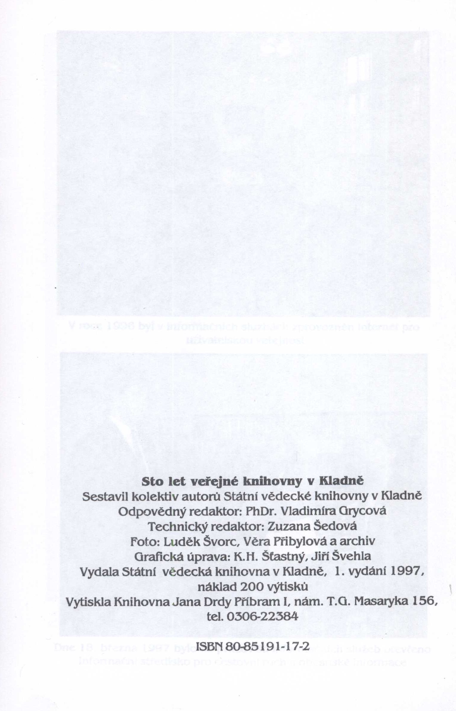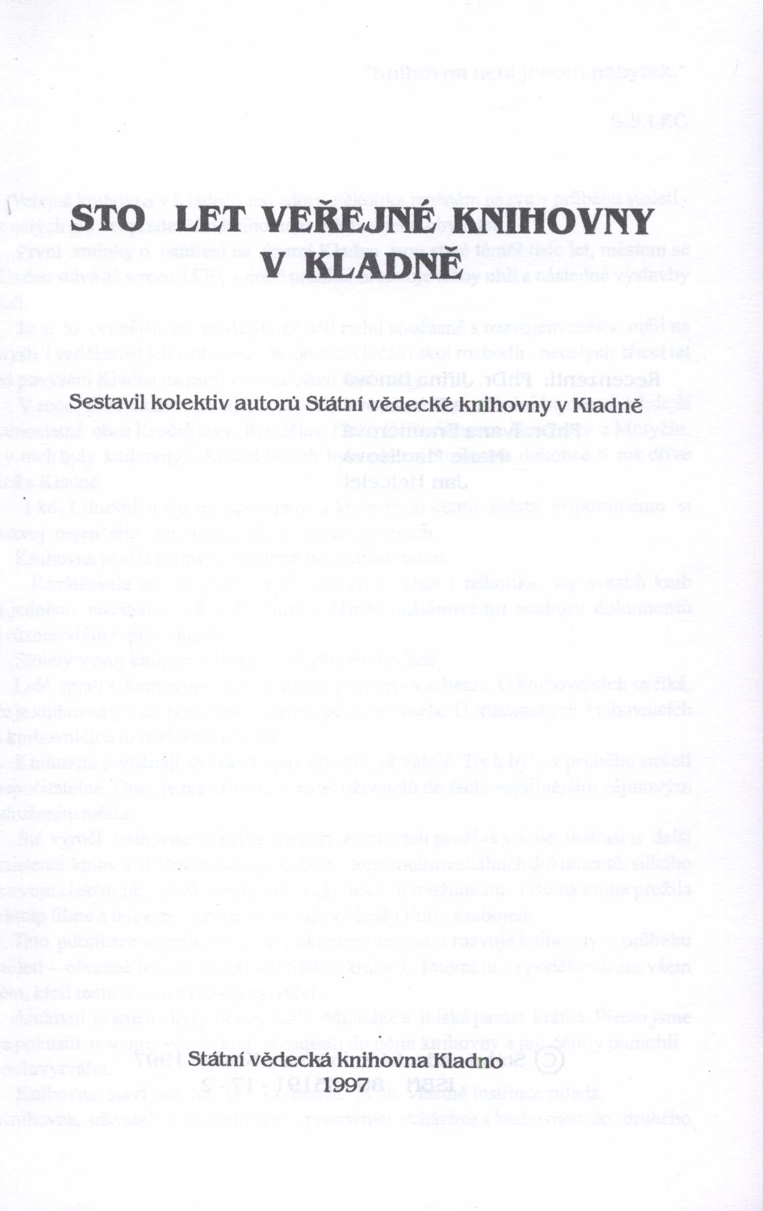 Názvové údaje Květy s vůní cyankáli / básně Olga Fikrlová, foto Luděk Švorc Osobní jméno Fikrlová, Olga, 1954- Další autoři Švorc, Luděk, 1941-2019 (Fotograf) Nakladatel Příbram : Knihovna Jana Drdy, 2004 Rozsah 46 s. : il. Klíčová slova česká poezie * lyrické básně * obrazová publikace Počet ex. 2, z toho volných 2 Druh dok. monografie Signatura C12a 2951, C12a 2951a Názvové údaje Kůň, panna a víno velké čistoty potřebují / Miroslav Slach ; Foto obálka Luděk Švorc ; Graf. návrh obálky Pavel Kratochvíl ; Ilustr. Jaroslava Bičovská Osobní jméno Slach, Miroslav, 1919-2001 (Autor) Další autoři Švorc, Luděk, 1941-2019 (Fotograf) Kratochvíl, Pavel (Grafický technik) Bičovská, Jaroslava, 1945- (Ilustrátor) Nakladatel Beroun : B & F, 1999 Rozsah 167 s. : il., fot Klíčová slova česká literatura * próza * povídky Počet ex. 1, z toho volných 1 Druh dok. monografie Signatura C12b 2931 Názvové údaje Sto let veřejné knihovny v Kladně / sestavil kolektiv autorů Státní vědecké knihovny v Kladně Záhlaví-korpor. Státní vědecká knihovna (Kladno, Česko) (Autor) Další autoři Grycová, Vladimíra, 1954- (Editor) Švorc, Luděk, 1941-2019 (Fotograf) Přibylová, Věra, 1939- (Fotograf) Šťastný, Karel H., 1965- (Knižní grafik) Korp. Knihovna Jana Drdy (Příbram, Česko) (Tiskař) Nakladatel Kladno : Státní vědecká knihovna, 1997 Výrobce Příbram : Knihovna Jana Drdy Rozsah 52 nečíslovaných stran : ilustrace, faksimile ; 21 cm Heslo korporace (zkrác. heslo korp.) : Státní vědecká knihovna (Kladno, Česko) Geografické heslo Kladno (Česko) - kulturní život - 1897-1997 Klíčová slova veřejné knihovny * Kladno * 100. výročí * obrazové přílohy Počet ex. 1, z toho volných 1 Druh dok. monografie Signatura C12b 19337
