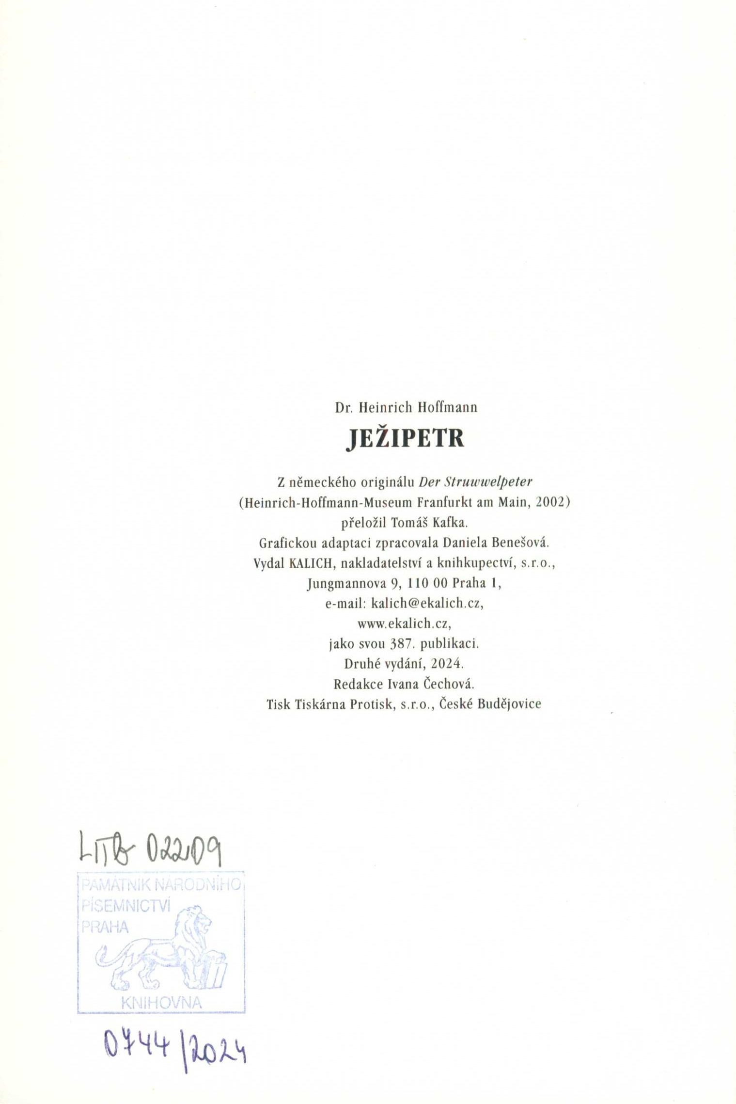 Názvové údaje O papírnách ztracených i těch znovu nalezených / Petr Novotný ; [graphic design Daniela Hana Benešová] Osobní jméno Novotný, Petr, 1953- (Autor) Další autoři Benešová, Daniela Hana (Knižní grafik) (Výtvarník vazby) Korp. Filigrán (Praha) (Nakladatel, vydavatel) PBtisk (tiskárna) (Tiskař) Nakladatel Praha : Vladimír Sitta, nakladatelství Filigrán, 2008 Výrobce PBtisk, s. r. o.) Rozsah 231 s. : il., mapa, faksim. ; 25 cm Předmětová hesla papírny - Česko * papírny - dějiny Klíčová slova Čechy a Morava * papír * výroba * historie * papírny * papírenský průmysl Počet ex. 1, z toho volných 1 Adr. el. zdr. http://toc.nkp.cz/NKC/200806/contents/nkc20081805095_1.pdf Druh dok. monografie Signatura C12c 3690 Názvové údaje Hanýžka a Martínek / Jindřich Šimon Baar ; ilustrovala Daniela Hahnová ; výbor uspořádala Jana Štefánková Osobní jméno Baar, Jindřich Šimon, 1869-1925 (Autor) Další autoři Benešová, Daniela, 1929- (Ilustrátor) Štefánková, Jana, 1921- (Sestavovatel, kompilátor) Korp. Nakladatelství Albatros (Nakladatel, vydavatel) Nakladatel Praha : Albatros, 1978 Rozsah 300 stran : ilustrace Klíčová slova česká próza * literatura pro děti a mládež Počet ex. 1, z toho volných 1 Druh dok. monografie Signatura P 135 h 31 Názvové údaje Hanýžka a Martínek / Jindřich Šimon Baar ; ilustrovala Daniela Hahnová Osobní jméno Baar, Jindřich Šimon, 1869-1925 (Autor) Další autoři Benešová, Daniela, 1929- (Ilustrátor) Korp. Státní nakladatelství dětské knihy (Nakladatel, vydavatel) Nakladatel Praha : Státní nakladatelství dětské knihy, 1968 Rozsah 326 stran : ilustrace Klíčová slova česká próza * literatura pro děti a mládež Počet ex. 1, z toho volných 1 Druh dok. monografie Signatura P 112 g 17 Názvové údaje Hanýžka a Martínek / Jindřich Šimon Baar ; výbor z trilogie Paní komisarka, Osmačtyřicátníci a Lůsy s přihlédnutím k úpravě Hany Štěpánkové uspořádala a doslov napsala Jana Štefánková ; k tisku připravili a poznámkami opatřili Jiří Daňhelka a Jana Ekartová ; ilustrovala Daniela Hahnová Osobní jméno Baar, Jindřich Šimon, 1869-1925 (Autor) Další autoři Štefánková, Jana, 1921- (Sestavovatel, kompilátor) (Autor úvodu atd.) Daňhelka, Jiří, 1919-1993 (Editor) Benešová, Daniela, 1929- (Ilustrátor) Korp. Státní nakladatelství dětské knihy (Nakladatel, vydavatel) Polygrafia (tiskárna, Praha) (Tiskař) Nakladatel Praha : Státní nakladatelství dětské knihy, 1963 Výrobce Polygrafia 3 Rozsah 338 stran : ilustrace Klíčová slova česká próza * české povídky * výbory * literatura pro děti a mládež Počet ex. 1, z toho volných 1 Druh dok. monografie Signatura P 50 a 55 Názvové údaje Ježipetr, aneb, Veselé historky a žertovné obrázky / Heinrich Hoffmann ; z německého originálu Der Struwwelpeter ... přeložil Tomáš Kafka ; grafickou adaptaci zpracovala Daniela Benešová Osobní jméno Hoffmann, Heinrich, 1809-1894 (Autor) Další autoři Kafka, Tomáš, 1965- (Překladatel) Benešová, Daniela, 1929- (Knižní grafik) Korp. Kalich, nakladatelství a knihkupectví (Nakladatel, vydavatel) Protisk (tiskárna, České Budějovice) (Tiskař) Nakladatel Praha : Kalich, 2024 Výrobce České Budějovice : Tiskárna Protisk, s.r.o. Rozsah 34 stran : ilustrace (převážně barevné) ; 20,5 cm Klíčová slova německá poezie * dvojjazyčné vydání * publikace pro děti Počet ex. 1, z toho volných 1 Druh dok. monografie Signatura LITb 02209 Názvové údaje Vo modrým ptáčku / Jindřich Šimon Baar ; ilustrovala Daniela Hahnová Osobní jméno Baar, Jindřich Šimon, 1869-1925 (Autor) Další autoři Benešová, Daniela, 1929- (Ilustrátor) Korp. Státní nakladatelství dětské knihy (Nakladatel, vydavatel) Severografia Liberec (tiskárna) (Tiskař) Nakladatel Praha : Státní nakladatelství dětské knihy, 1960 Výrobce Liberec : SG, z.z Rozsah 31 stran : ilustrace Klíčová slova literatura pro děti * české pohádky * Chodsko Počet ex. 2, z toho volných 2 Druh dok. monografie Signatura P 42 a 19, Leschinger 209