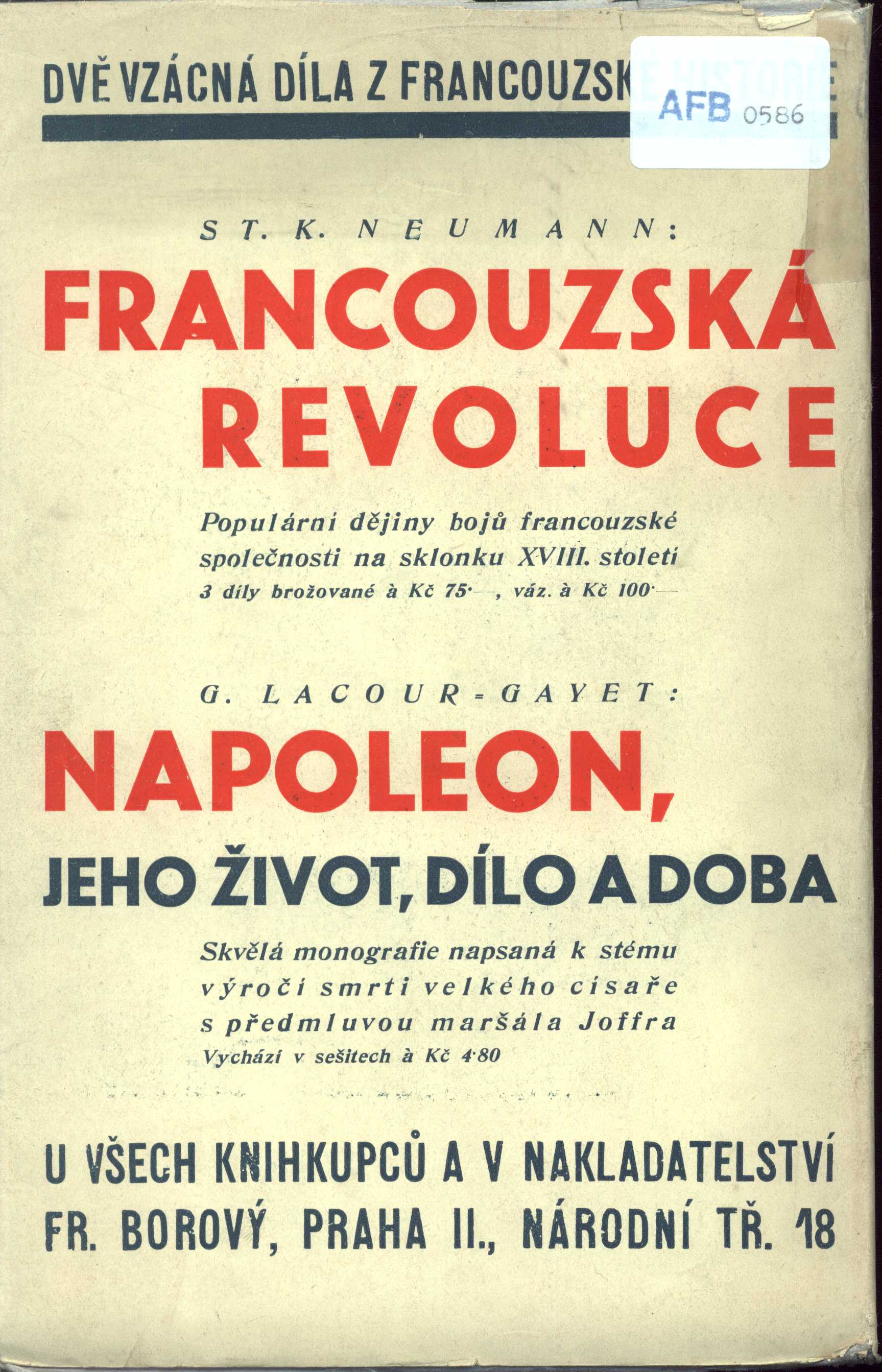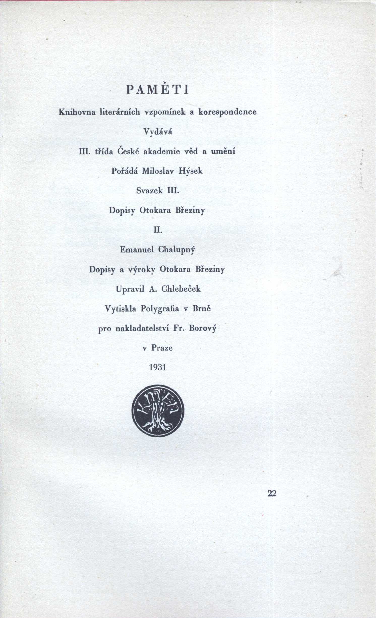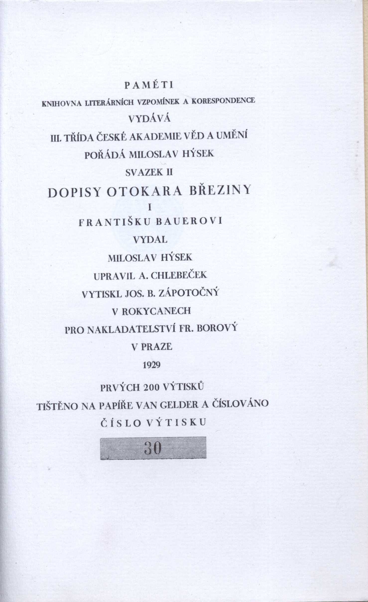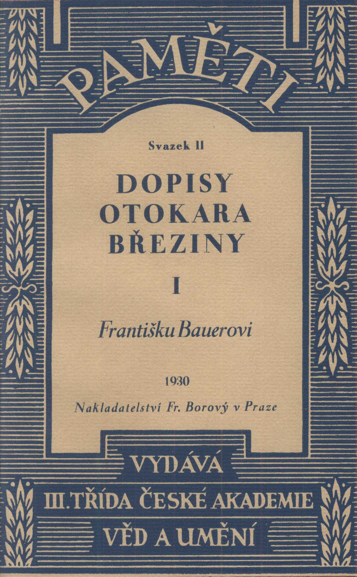 Názvové údaje Pero mi zůstalo : 1938-1945 / Rudolf Bechyně ; [v úpravě A. Chlebečka a vazbou od Jar. Švába] Osobní jméno Bechyně, Rudolf, 1881-1948 (Autor) Další autoři Chlebeček, Antonín, 1889- (Knižní grafik) Šváb, Jaroslav, 1906-1999 (Autor obálky) (Výtvarník vazby) Korp. Dělnické nakladatelství (Nakladatel, vydavatel) Cíl (tiskárna v Praze) (Tiskař) Nakladatel V Praze : Dělnické nakladatelství, 1947 Výrobce Cíl) Rozsah 244 s. Osobní hesla Bechyně, Rudolf, 1881-1948 - novinář, politik Klíčová slova demokracie * Mnichov * Mnichovská dohoda * 2. světová válka * vzpomínky * úvahy * články * r. 1938-1945 Počet ex. 1, z toho volných 1 Druh dok. monografie Signatura Teige 176 Názvové údaje Dopisy Otokara Březiny. [Díl] 1 / Otokar Březina ; [upravil A. Chlebeček] Osobní jméno Březina, Otokar, 1868-1929 (Autor) Další autoři Chlebeček, Antonín, 1889- (Knižní grafik) Korp. Fr. Borový (firma) (Nakladatel, vydavatel) Jos. B. Zápotočný (tiskárna) (Tiskař) Nakladatel V Praze : Fr. Borový, 1929 Výrobce Jos. B. Zápotočný) Rozsah 273 s., [11] obr. příl. : noty ; 8° Osobní hesla Březina, Otokar, 1868-1929 - básník, esejista, prozaik * Bauer, František Saleský, 1841-1915 - český duchovní a církevní spisovatel Klíčová slova česká literatura * Březina O. * Bauer F. * korespondence * dopisy Počet ex. 1, z toho volných 1 Druh dok. monografie Signatura AFB 0527-I Názvové údaje Dopisy Otokara Březiny. I, Františku Bauerovi / upravil A. Chlebeček Osobní jméno Březina, Otokar, 1868-1929 (Autor) Další autoři Bauer, František Saleský, 1841-1915 (Adresát, příjemce) Chlebeček, Antonín, 1889- (Jiná role) Korp. Fr. Borový (firma) (Nakladatel, vydavatel) Jos. B. Zápotočný (tiskárna) (Tiskař) Nakladatel V Praze : Fr. Borový, 1929 Výrobce V Rokycanech : Jos. B. Zápotočný Rozsah 273 stran, 10 nečíslovaných listů obrazových příloh : ilustrace, portréty, faksimile, noty ; 21 cm Osobní hesla Březina, Otokar, 1868-1929 - učitel, básník, esejista, prozaik a myslitel * Bauer, František Saleský, 1841-1915 - český duchovní a církevní spisovatel Klíčová slova čeští spisovatelé * čeští básníci * katoličtí spisovatelé * korespondence Počet ex. 7, z toho volných 7 Druh dok. monografie Signatura AFB 0528-I, Preissová 049, P 7 B 39, Holman-Březina 0175, Holman-Březina 0177, Holman-Březina 0179, AHO 0578 Názvové údaje Dopisy Otokara Březiny. II, Emanuel Chalupný, Dopisy a výroky Otokara Březiny / upravil A. Chlebeček Osobní jméno Březina, Otokar, 1868-1929 (Autor) Další autoři Chalupný, Emanuel, 1879-1958 (Adresát, příjemce) Chlebeček, Antonín, 1889- (Knižní grafik) Korp. Fr. Borový (firma) (Nakladatel, vydavatel) Polygrafia (nakladatelství a tiskárna, Brno) (Tiskař) Nakladatel V Praze : Fr. Borový, 1931 Výrobce V Brně : Polygrafia Rozsah 327 stran, 10 nečíslovaných listů obrazových příloh ; ilustrace, portréty, faksimile 21 cm Osobní hesla Březina, Otokar, 1868-1929 - učitel, básník, esejista, prozaik a myslitel * Chalupný, Emanuel, 1879-1958 - právník, sociolog, překladatel Klíčová slova čeští spisovatelé * čeští básníci * právníci * sociologové * překladatelé * korespondence * výroky Počet ex. 4, z toho volných 4 Druh dok. monografie Signatura AFB 0648/II, Holman-Březina 0176, Holman-Březina 0178, Holman-Březina 0180 Názvové údaje Dopisy Otokara Březiny / Emanuel Chalupný ; [upravil A. Chlebeček]. [Sv.] II, Dopisy a výroky Otokara Březiny Osobní jméno Březina, Otokar, 1868-1929 (Autor) Další autoři Chalupný, Emanuel, 1879-1958 (Autor) Chlebeček, Antonín, 1889- (Knižní grafik) Korp. Fr. Borový (firma) (Nakladatel, vydavatel) Polygrafia (nakladatelství a tiskárna, Brno) (Tiskař) Nakladatel V Praze : Fr. Borový, 1931 Výrobce Polygrafia) Rozsah 327 s., [10] obr. příl. ; 8° Osobní hesla Březina, Otokar, 1868-1929 - básník, esejista, prozaik * Chalupný, Emanuel, 1879-1958 - sociolog, překladatel Klíčová slova česká literatura * Březina O. * Chalupný E. * korespondence Počet ex. 1, z toho volných 1 Druh dok. monografie Signatura AFB 0650-II Názvové údaje Dopisy Otokara Březiny / Emanuel Chalupný ; [upravil A. Chlebeček]. [Sv.] II, Dopisy a výroky Otokara Březiny Osobní jméno Březina, Otokar, 1868-1929 (Autor) Další autoři Chalupný, Emanuel, 1879-1958 (Autor) Chlebeček, Antonín, 1889- (Knižní grafik) Korp. Fr. Borový (firma) (Nakladatel, vydavatel) Polygrafia (nakladatelství a tiskárna, Brno) (Tiskař) Nakladatel V Praze : Fr. Borový, 1931 Výrobce Polygrafia) Rozsah 327 s., [10] obr. příl. ; 8° Osobní hesla Březina, Otokar, 1868-1929 - básník, esejista, prozaik * Chalupný, Emanuel, 1879-1958 - sociolog, překladatel Klíčová slova česká literatura * Březina O. * Chalupný E. * korespondence Počet ex. 1, z toho volných 1 Druh dok. monografie Signatura AFB 0649-II Názvové údaje Velikost a bída jednoho vítězství / Georges Clemenceau ; [přeložil Rudolf Procházka ; obálka a graf. úprava Ant. Chlebečka] Osobní jméno Clemenceau, Georges, 1841-1929 (Autor) Další autoři Procházka, Rudolf, 1889-1945 (Překladatel) Chlebeček, Antonín, 1889- (Autor obálky) Korp. Fr. Borový (firma) (Nakladatel, vydavatel) Polygrafia (nakladatelství a tiskárna, Brno) (Tiskař) Nakladatel V Praze : Fr. Borový, 1930 Výrobce Polygrafia) Rozsah XXI, 415 s. : [3] tb. ; 8° Osobní hesla Foch, Ferdinand, 1851-1929 - francouzský důstojník, maršál Klíčová slova Evropa * Francie * politika * 1. světová válka * poválečné období * osobnosti Počet ex. 1, z toho volných 1 Druh dok. monografie Signatura AFB 0586 Názvové údaje Tři léta při Tichém oceáně / J. V. Daneš ; [graficky upravil A. Chlebeček]. Díl I., [Australie] Osobní jméno Daneš, Jiří Viktor, 1880-1928 (Autor) (Autor úvodu atd.) Další autoři