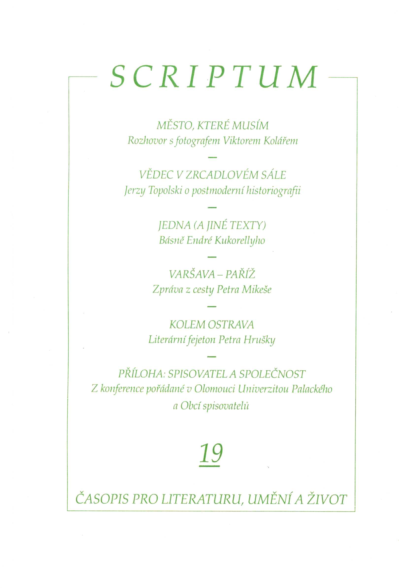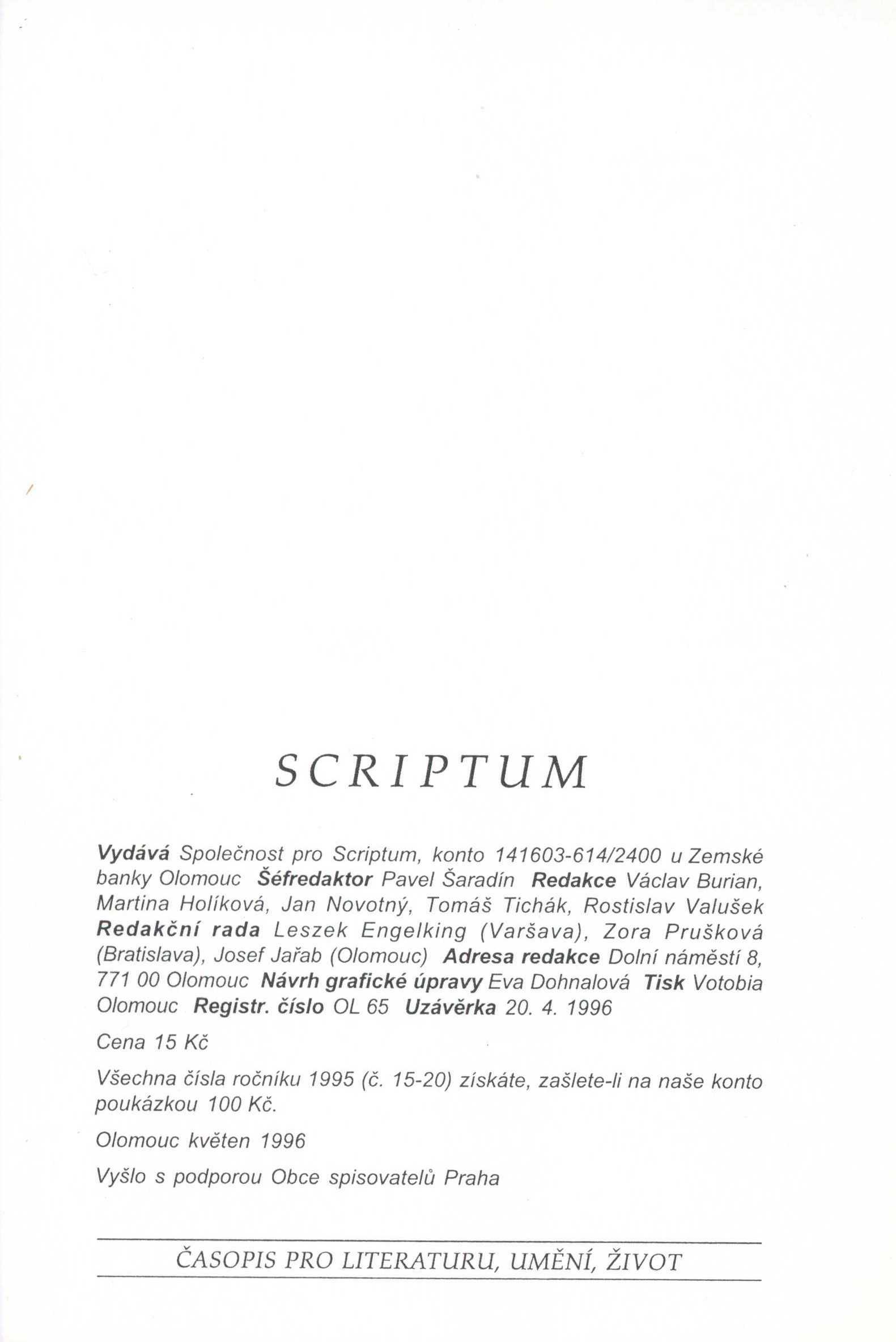 Názvové údaje Duševní aristokratismus / Friedrich Nietzsche ; z něm. přel. a úvod [napsal] Vítězslav Tichý ; typogr. a obálka Eva Dohnalová Osobní jméno Nietzsche, Friedrich, 1844-1900 (Autor) Další autoři Tichý, Vítězslav, 1904-1962 (Překladatel) (Autor úvodu atd.) Dohnalová, Eva (Grafický technik) Nakladatel Olomouc : Votobia, 1993 Rozsah 127 s. ; 15 cm Klíčová slova německá filozofie * duševní aristokratismus * aristokratismus vůle * individualismus * nadčlověk Počet ex. 1, z toho volných 0 Druh dok. monografie Signatura M 220 g 104 Názvové údaje Scriptum : časopis pro literaturu, umění a život. 19 / šéfredaktor Pavel Šaradín ; návrh grafické úpravy Eva Dohnalová Další autoři Šaradín, Pavel, 1969- (Šéfredaktor, odpovědný redaktor) Dohnalová, Eva (Knižní grafik) Korp. Společnost pro Scriptum (spolek) (Nakladatel, vydavatel) Votobia (nakladatelství) (Tiskař) Nakladatel Olomouc : Společnost pro Scriptum, 1996 Výrobce Olomouc : Votobia Rozsah 82 stran ; 21 cm Klíčová slova česká literatura * časopis * literatura * umění * život * recenze * kritiky * Česko * r. 1996 Počet ex. 1, z toho volných 1 Druh dok. periodika Signatura Kantůrková 0362