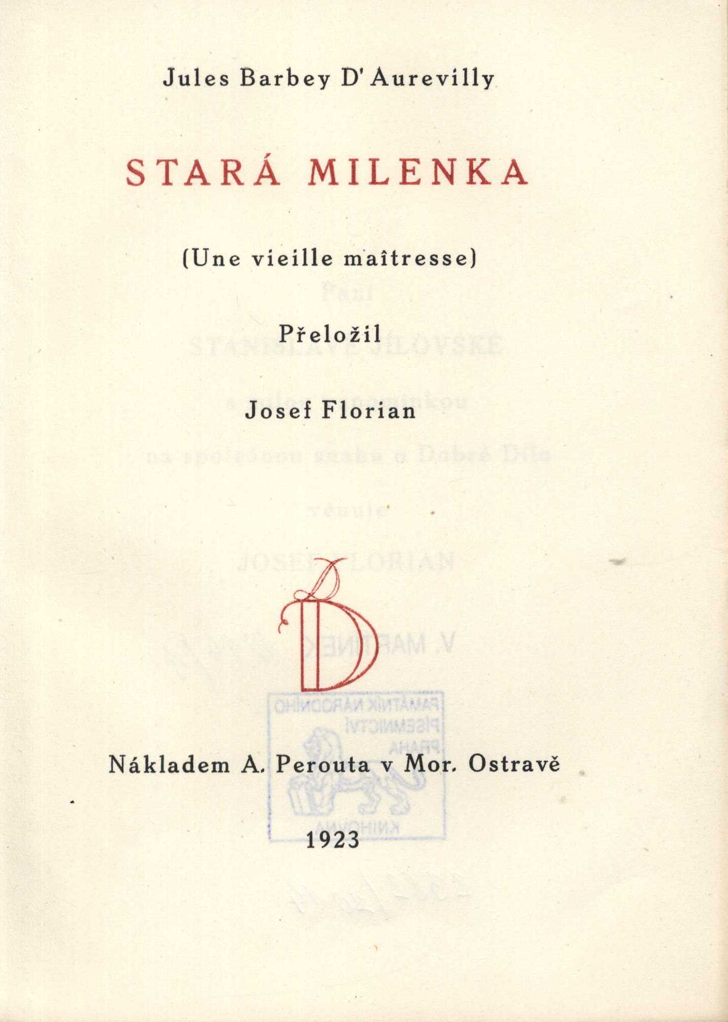 Názvové údaje Pohřební řeč nad sestrou Marií z Kříže, rozenou Melanií Kalvatovou, pasačkou La Salettskou / Annibal Marie de France ; Přel. Josef Florian Autor Annibale-Maria di Francia, 1851-1927 (Autor) Další autoři Florian, Josef, 1873-1941 (Překladatel) Nakladatel Stará Říše : Antonín Stříž, 1910 Rozsah 35 s. : il Osobní hesla Calvat, Mélanie, 1831-1904 - pasačka * Calvat, Mélanie, 1831-1904 - pasačka Klíčová slova francouzská literatura * pohřební řeč * náboženství * pasačka La Salettská Počet ex. 1, z toho volných 1 Druh dok. monografie Signatura C12a 1239 Názvové údaje Legenda o Cidu Campeadorovi / Alexandre Arnoux ; Z frančiny přel. Josef Florian ; Linolea vyryl Michael Florian ; [Typograficky upravil Antonín Lískovec] Osobní jméno Arnoux, Alexandre, 1884-1973 (Autor) Další autoři Florian, Josef, 1873-1941 (Překladatel) Florian, Michael, 1911-1984 (Ilustrátor) Lískovec, Antonín, 1894-1949 (Ilustrátor) Florian, Josef, 1873-1941 (Autor podpisu) Nakladatel Stará Říše : [Marta Florianová], 1935 Rozsah 107 s. : il Osobní hesla Florian, Josef, 1873-1941 - nakladatel a překladatel Klíčová slova francouzská literatura * próza * historický román * legenda * španělská literatura Počet ex. 1, z toho volných 1 Druh dok. monografie Signatura C12a 194 Názvové údaje Legenda o Cidu Campeadorovi / Alexandre Arnoux ; Z frančiny přel. Josef Florian ; Linolea vyryl Michael Florian Osobní jméno Arnoux, Alexandre, 1884-1973 (Autor) Další autoři Florian, Josef, 1873-1941 (Překladatel) Florian, Michael, 1911-1984 (Ilustrátor) Portman, Josef, 1893-1968 (Dedikant) Florian, Josef, 1873-1941 (Dedikátor) Florian, Josef, 1873-1941 (Autor podpisu) Nakladatel Stará Říše : Josef Florian, 1935 Rozsah 107 s. : il Osobní hesla Portman, Josef, 1893-1968 - bibliofil, vydavatel, tiskař, sběratel * Florian, Josef, 1873-1941 - nakladatel a překladatel * Florian, Josef, 1873-1941 - nakladatel a překladatel Klíčová slova francouzská literatura * próza * legenda * bibliofilie Počet ex. 3, z toho volných 3 Druh dok. monografie Signatura POR 145, LK P 75 F 38, LK ZA 7 F 22 Názvové údaje Filosofie budoucnosti / Jakob Balmes ; [přeložil Josef Florian] Osobní jméno Balmes, Jaime, 1810-1848 (Autor) Další autoři Florian, Josef, 1873-1941 (Překladatel) Korp. Josef Florian (Stará Říše na Moravě) (Nakladatel, vydavatel) Vokolek, Václav (tiskárna : Pardubice) (Tiskař) Nakladatel Stará Říše na Moravě : [Josef Florian], 1946 Výrobce V. Vokolek a syn) Rozsah 54 s. Klíčová slova španělská literatura * filozofie * úvahy Počet ex. 3, z toho volných 3 Druh dok. monografie Signatura C12a 413, Holan 1295, C12a 4929 Názvové údaje Historie beze jména / Jules Barbey d'Aurevilly ; Přeložil Josef Florian Osobní jméno Barbey d'Aurevilly, Jules Amédée, 1808-1889 (Autor) Další autoři Florian, Josef, 1873-1941 (Překladatel) Nakladatel [Stará Říše] : Antonín Ludvík Stříž, 1910 Rozsah 204 s. Klíčová slova francouzská literatura * próza * román Počet ex. 1, z toho volných 1 Druh dok. monografie Signatura C12a 337 Názvové údaje Myšlenky uvolněné ; Úryvky o ženách / J. Barbey d'Aurevilly ; [přeložil Josef Florian ; titul kreslil Josef Marek] Osobní jméno Barbey d'Aurevilly, Jules Amédée, 1808-1889 (Autor) Další autoři Florian, Josef, 1873-1941 (Nakladatel, vydavatel) (Překladatel) (Dedikátor) Stříž, Antonín Ludvík, 1888-1960 (Nakladatel, vydavatel) Karásek ze Lvovic, Jiří, 1871-1951 (Autor podpisu) Skopec, Jindřich, 1873-1942 (Dedikant) Trnka, František Josef (Tiskař) Nakladatel Ve Staré Říši na Moravě : Antonín L. Stříž, 1911 Výrobce Frant. Jos. Trnka) Rozsah [12], 55, [5] s. : il. Klíčová slova francouzská literatura * žena * přelom 19. a 20. stol. * dekadence * aforismy * glosy * postřehy Počet ex. 1, z toho volných 1 Druh dok. monografie Signatura KaG LVIII B 35 Názvové údaje Očarovaná / Jules Barbey D'Aurevilly ; Přel. Josef Florian Osobní jméno Barbey d'Aurevilly, Jules Amédée, 1808-1889 (Autor) Další autoři Florian, Josef, 1873-1941 (Překladatel) Florian, Josef, 1873-1941 (Autor úvodu atd.) Portman, Josef, 1893-1968 (Dedikant) Florian, Josef, 1873-1941 (Dedikátor) Florian, Josef, 1873-1941 (Autor podpisu) Nakladatel Stará Říše : Antonín Ludvík Stříž, 1916 Rozsah 180 s. Osobní hesla Portman, Josef, 1893-1968 - bibliofil, vydavatel, tiskař, sběratel * Florian, Josef, 1873-1941 - nakladatel a překladatel * Florian, Josef, 1873-1941 - nakladatel a překladatel Klíčová slova francouzská literatura * próza * román Počet ex. 4, z toho volných 4 Druh dok. monografie Signatura POR 288, LK SÁŇKA 1890, LK P 75 D 43, LK P 110 F 5 Názvové údaje Očarovaná / Jules Amédée Barbey d'Aurevilly ; Přeložil Josef Florian Osobní jméno Barbey d'Aurevilly, Jules Amédée, 1808-1889 (Autor) Další autoři Florian, Josef, 1873-1941 (Překladatel) Nakladatel Stará Říše : A. L. Stříž, 1915 Rozsah 180 s. Klíčová slova francouzská literatura * próza * historický román Počet ex. 1, z toho volných 1 Druh dok. monografie Signatura C12b 430 Názvové údaje Stará milenka = Une vieille maîtresse / Jules Barbey D'Aurevilly ; přeložil Josef Florian Osobní jméno Barbey d'Aurevilly, Jules Amédée, 1808-1889 (Autor) Další autoři Florian, Josef, 1873-1941 (Překladatel) Noyon, Georges (Ilustrátor) Korp. A. Perout (nakladatelství) (Nakladatel, vydavatel) Nakladatel V Mor. Ostravě : Nákladem A. Perouta, 1923 Rozsah 484 stran, 1 list nečíslované obrazové přílohy : ilustrováno Klíčová slova francouzská literatura * francouzská próza * francouzský román * dekadence Počet ex. 1, z toho volných 1 Druh dok. monografie Signatura VHB 2041 Názvové údaje Stará milenka = Une vieille maîtresse. [I.] / Jules Barbey d'Aurevilly ; přeložil Josef Florian Osobní jméno Barbey d'Aurevi