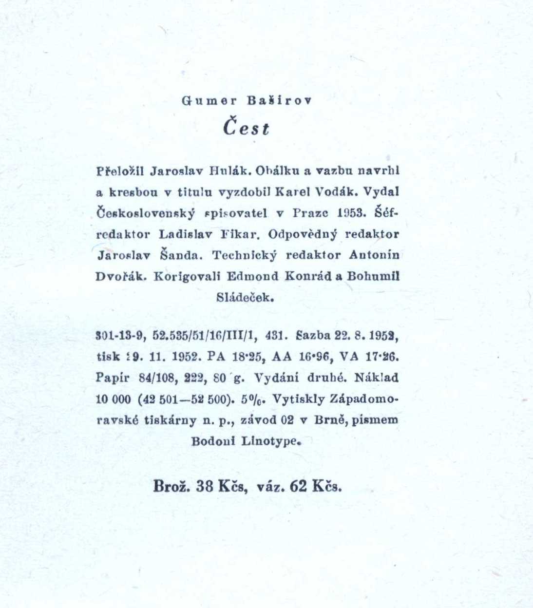 Názvové údaje Čest / Gumer Baširov ; [z ruského překladu tatarského originálu ... přeložil a poznámkami opatřil Jaroslav Hulák ; obálku a vazbu navrhl a kresbou v titulu vyzdobil Karel Vodák] Osobní jméno Baširov, Gumer, 1901- (Autor) Další autoři Hulák, Jaroslav, 1920-1999 (Překladatel) (Dedikátor) (Autor komentáře) Slabý, Zdeněk Karel, 1930-2020 (Dedikant) Vodák, Karel, 1923-2000 (Autor obálky) (Ilustrátor) Korp. Československý spisovatel (nakladatelství) (Nakladatel, vydavatel) Nakladatel Praha : Československý spisovatel, 1953 Rozsah 287 s. Klíčová slova tatarská literatura * sovětská próza * román Počet ex. 3, z toho volných 3 Druh dok. monografie Signatura AČS 03486, AČS 03486a, ZKSlabý 0741 Názvové údaje Čest / Gumer Baširov ; Z ruš. přel. Jaroslav Hulák ; Vazbu s použitím kresby B. Doležalové navrhl Josef Paukert ; Typogr. upr. Josef Hanzl Osobní jméno Baširov, Gumer, 1901- (Autor) Další autoři Hulák, Jaroslav, 1920-1999 (Překladatel) Paukert, Josef, 1915-1991 (Grafický technik) Doleželová, Bohumila, 1922-1993 (Ilustrátor) Hanzl, Josef (Grafický technik) Nakladatel Praha : Československý spisovatel, 1952 Rozsah 305 s. Klíčová slova ruská literatura * sovětská literatura * próza * román Počet ex. 1, z toho volných 1 Druh dok. monografie Signatura AČS 03409 Názvové údaje Melancholický dekameron : z povídek A.P. Čechova / z ruského originálu Sobranije sočinenij, rasskazy i povesti ... přeložili Emanuel Frynta, Jaroslav Hulák a Anna Zahradníčková ; ilustroval Stanislav Kolíbal Osobní jméno Čechov, Anton Pavlovič, 1860-1904 (Autor) Další autoři Frynta, Emanuel, 1888-1949 (Překladatel) (Sestavovatel, kompilátor) (Autor doslovu, tiráže atd.) Hulák, Jaroslav, 1920-1999 (Překladatel) Zahradníčková, Anna, 1894-1979 (Překladatel) Kolíbal, Stanislav, 1925- (Ilustrátor) Albich, Milan, 1925-2000 (Autor obálky) (Výtvarník vazby) (Knižní grafik) Korp. Lidové nakladatelství (Nakladatel, vydavatel) Severografia Liberec (tiskárna) (Tiskař) (Tiskař obrazu) Nakladatel Praha : Lidové nakladatelství, 1976 Výrobce Liberec : Severografia, n. p., závod 1 Rozsah 149 stran : ilustrace ; 25 cm Klíčová slova ruská literatura * próza * Čechov A. P. * povídky * milostné povídky * melancholie * výbory * ilustrované knihy * ilustrace * Kolíbal S. * r. 1976 Počet ex. 2, z toho volných 2 Druh dok. monografie Signatura Holan 1116, VZinková 0763 Názvové údaje Nudná historie : ze zápisků starého člověka / Anton Pavlovič Čechov ; [obálku a vazbu navrhl a ilustracemi vyzdobil Stanislav Kolíbal ; z ruského originálu ... přeložil Vladimír Pravda ; doslov napsal Jaroslav Hulák] Osobní jméno Čechov, Anton Pavlovič, 1860-1904 (Autor) Další autoři Kolíbal, Stanislav, 1925- (Výtvarník vazby) (Autor obálky) (Ilustrátor) Pravda, Vladimír, 1907-1978 (Překladatel) Hulák, Jaroslav, 1920-1999 (Autor doslovu, tiráže atd.) Nakladatel Praha : Československý spisovatel, 1960 Rozsah 91 s., [4] l. obr. příl. Klíčová slova ruská literatura * próza * novela Počet ex. 3, z toho volných 3 Druh dok. monografie Signatura AČS 02581, AČS 02581a, MUK 1671 Názvové údaje Povídky / A. P. Čechov ; [z ruštiny] přeložil Jaroslav Hulák ; předmluva Ladislav Štindl ; obálku, vazbu a úpravu navrhl František Muzika. [Sv.] 1, 1883-1886 Osobní jméno Čechov, Anton Pavlovič, 1860-1904 (Autor) Další autoři Hulák, Jaroslav, 1920-1999 (Překladatel) Štindl, Ladislav, 1928- (Autor úvodu atd.) Muzika, František, 1900-1974 (Grafický technik) Nakladatel Praha : Československý spisovatel, 1951 Rozsah 381 s. Osobní hesla Čechov, Anton Pavlovič, 1860-1904 - ruský prozaik, dramatik a lékař Klíčová slova ruská literatura * překlad * próza * povídky Počet ex. 2, z toho volných 2 Druh dok. monografie Signatura AČS 01369/I, AČS 01369/Ia Názvové údaje Zločin a trest / Fjodor Michajlovič Dostojevskij ; [z ruštiny přeložil a doslov napsal Jaroslav Hulák ; ilustrace Eva Bednářová ; obálka a grafická úprava Pavel Hrach] Osobní jméno Dostojevskij, Fedor Michajlovič, 1821-1881 (Autor) Další autoři Hulák, Jaroslav, 1920-1999 (Překladatel) (Autor doslovu, tiráže atd.) Bednářová, Eva, 1937-1986 (Ilustrátor) Hrach, Pavel, 1947- (Autor obálky) (Knižní grafik) Korp. Lidové nakladatelství (Nakladatel, vydavatel) Nakladatel Praha : Lidové nakladatelství, 1988 Výrobce SG) Rozsah 434 s. : il. ; 24 cm Osobní hesla Dostojevskij, Fedor Michajlovič, 1821-1881 - ruský spisovatel Klíčová slova ruská literatura * ruská próza * ruský román Počet ex. 1, z toho volných 1 Druh dok. monografie Signatura F I 5087 Názvové údaje Zločin a trest / Fjodor Michajlovič Dostojevskij ; [z ruského origináli ... přeložil a doslovem opatřil Jaroslav Hulák ; ilustrace Rastislav Michal ; obálka Leo Novotný] Osobní jméno Dostojevskij, Fedor Michajlovič, 1821-1881 (Autor) Další autoři Hulák, Jaroslav, 1920-1999 (Překladatel) (Autor doslovu, tiráže atd.) Michal, Rastislav, 1936-2022 (Ilustrátor) Novotný, Leo, 1931- (Autor obálky) Korp. Lidové nakladatelství (Nakladatel, vydavatel) Nakladatel Praha : Lidové nakladatelství, 1977 Výrobce SG) Rozsah 473 s. : il. ; 8° Osobní hesla Dostojevskij, Fedor Michajlovič, 1821-1881 - ruský spisovatel Klíčová slova ruská literatura * ruská próza * ruský román Počet ex. 1, z toho volných 1 Druh dok. monografie Signatura P II 279 Názvové údaje Zločin a trest / Fjodor Michajlovič Dostojevskij ; [z ruského originálu ... přeložil Jaroslav Hulák ; poznámku o autorovi napsal Ladislav Zadražil ; ilustroval Jozef Baláž ; obálku a vazbu navrhl Miroslav Váša s použitím kresby Jozefa Baláže ; graficky upravil Antonín Dvořák] Osobní jméno Dostojevskij, Fedor Michajlovič, 1821-1881 (Autor) Další autoři Hulák, Jaroslav, 1920-1999 (Překl