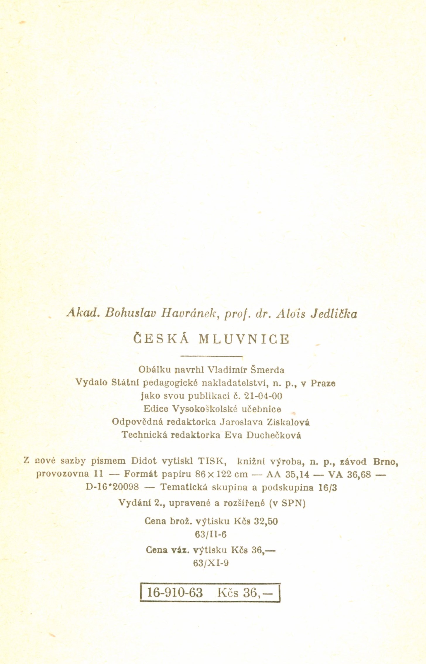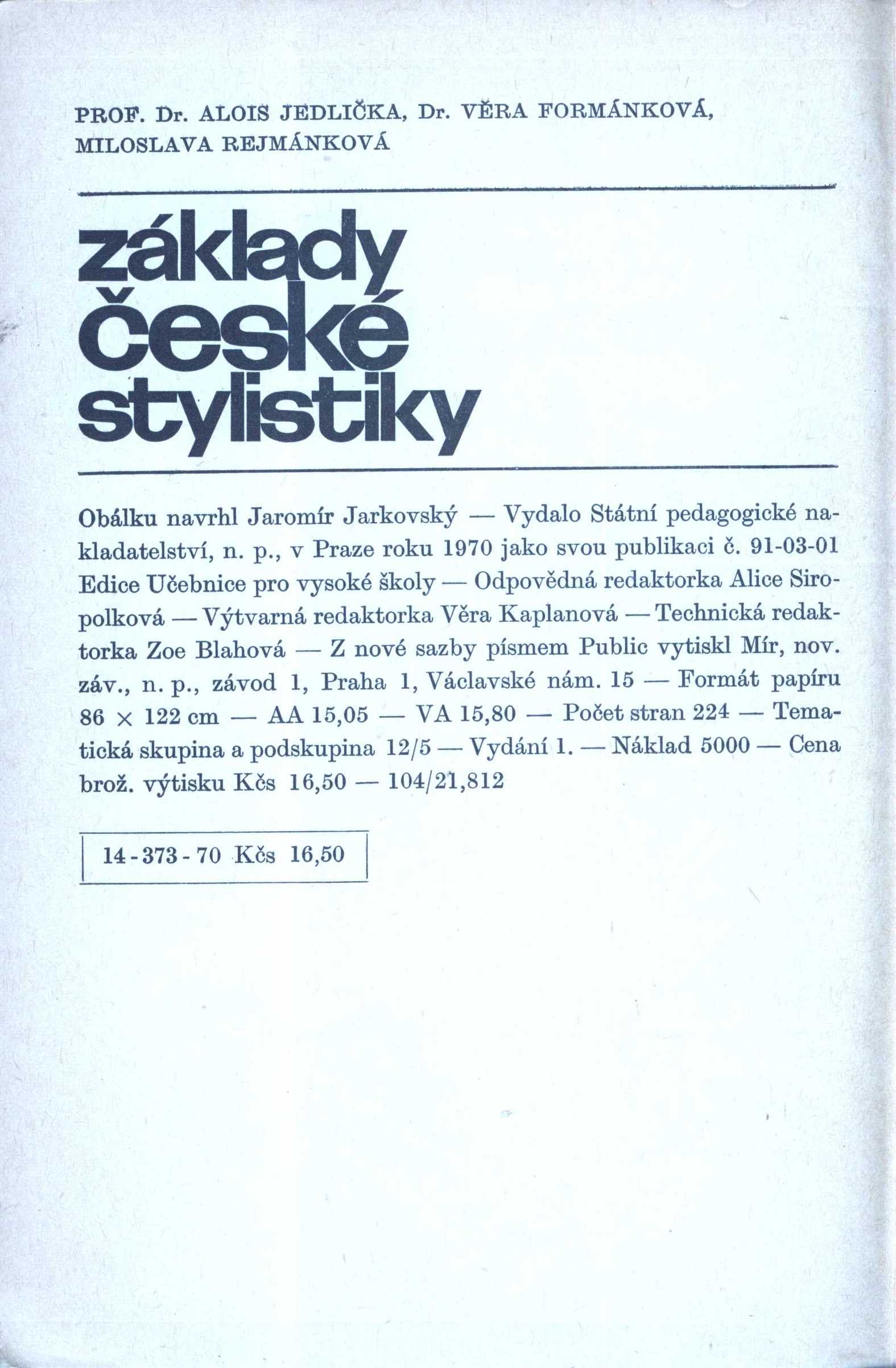 Názvové údaje Česká mluvnice / Bohuslav Havránek, Alois Jedlička Osobní jméno Havránek, Bohuslav, 1893-1978 (Autor) Další autoři Jedlička, Alois, 1912-2000 (Autor) Nakladatel Praha : Státní pedagogické nakladatelství, 1988 Rozsah 568 s. Klíčová slova mluvnice * gramatika * česká mluvnice * učebnice Počet ex. 1, z toho volných 1 Druh dok. monografie Signatura C12b 7592 Názvové údaje Česká mluvnice / Bohuslav Havránek, Alois Jedlička Osobní jméno Havránek, Bohuslav, 1893-1978 (Autor) Další autoři Jedlička, Alois, 1912-2000 (Autor) Korp. Státní pedagogické nakladatelství (Nakladatel, vydavatel) Stráž, tiskařské závody (Tiskař) Nakladatel Praha : Státní pedagogické nakladatelství, 1970 Výrobce Vimperk : Stráž Rozsah 559 stran ; 20 cm Klíčová slova český jazyk * mluvnice * vysokoškolské učebnice Počet ex. 1, z toho volných 1 Druh dok. monografie Signatura BVolkova 1424 Názvové údaje Stručná mluvnice česká / Bohuslav Havránek, Alois Jedlička Osobní jméno Havránek, Bohuslav, 1893-1978 (Autor) Další autoři Jedlička, Alois, 1912-2000 (Autor) Korp. Státní pedagogické nakladatelství (Nakladatel, vydavatel) Severografia (tiskárna, Most) (Tiskař) Nakladatel Praha : Státní pedagogické nakladatelství, 1981 Výrobce Most : Severografia Rozsah 226 stran ; 20 cm Klíčová slova čeština * mluvnice * učebnice pro základní školy Počet ex. 1, z toho volných 1 Druh dok. monografie Signatura BVolkova 1378 Názvové údaje Spisovný jazyk v současné komunikaci / Alois Jedlička ; [recenzovali Bohuslav Havránek, Václav Křístek ; obálka a grafická úprava Jaroslav Příbramský] Osobní jméno Jedlička, Alois, 1912-2000 (Autor) Další autoři Havránek, Bohuslav, 1893-1978 (Recenzent) Křístek, Václav, 1918-1979 (Recenzent) Příbramský, Jaroslav, 1920- (Autor obálky) Nakladatel Praha : Univerzita Karlova, 1974 Výrobce Mír) Rozsah 227 s. Klíčová slova čeština * spisovná čeština * sociální komunikace * komunikace * verbální komunikace * studie Počet ex. 1, z toho volných 1 Druh dok. monografie Signatura BVolkova 0450 Názvové údaje Základy české stylistiky / Alois Jedlička, Věra Formánková, Miloslava Rejmánková ; [obálku navrhl Jaromír Jarkovský] Osobní jméno Jedlička, Alois, 1912-2000 (Autor) Další autoři Formánková, Věra, 1928- (Autor) Rejmánková, Ludmila, 1923-2017 (Autor) Jarkovský, Jaromír (Autor obálky) Korp. Státní pedagogické nakladatelství (Nakladatel, vydavatel) Mír, novinářské závody (tiskárna) (Tiskař) Nakladatel Praha : Státní pedagogické nakladatelství, 1970 Výrobce Mír) Rozsah 226 s. Klíčová slova český jazyk * stylistika * vysokoškolské učebnice Počet ex. 1, z toho volných 1 Druh dok. monografie Signatura BVolkova 0206 Názvové údaje Česká mluvnice / Bohuslav Havránek, Alois Jedlička ; obálku navrhl Vladimír Šmerda Osobní jméno Havránek, Bohuslav, 1893-1978 (Autor) Další autoři Jedlička, Alois, 1912-2000 (Autor) Šmerda, Vladimír, 1926- (Knižní grafik) Korp. Státní pedagogické nakladatelství (Nakladatel, vydavatel) Tisk Brno (tiskárna) (Tiskař) Nakladatel V Praze : Státné pedagogické nakladatelství, n.p., 1963 Výrobce Brno : Tisk, knižní výroba, n.p., závod Brno, provozovna 11 Rozsah 561 stran ; 21 cm Klíčová slova český jazyk * čeština * mluvnice * učebnice vysokých škol Počet ex. 1, z toho volných 1 Adr. el. zdr. http://krameriusndk.nkp.cz/search/handle/uuid:db5c38b0-37d6-11e3-8d9d-005056827e51 Druh dok. monografie Signatura JVladislav 506 Názvové údaje Hospodářská krise a její důsledky pro ČSR / Alois Jedlička Osobní jméno Jedlička, Alois, 1912-2000 (Autor) Další autoři Knihovna Levé fronty (nakladatelství) (Nakladatel, vydavatel) Nakladatel Praha : Knihovna Levé fronty, 1935 Rozsah 56 stran : tabulky Klíčová slova Československá republika * hospodářská krize * důsledky Počet ex. 1, z toho volných 1 Druh dok. monografie Signatura K C VI 67 Názvové údaje Jazykový koutek Československého rozhlasu : první výběr / redaktoři Bohuslav Havránek, Alois Jedlička, František Váhala Další autoři Havránek, Bohuslav, 1893-1978 (Editor) Jedlička, Alois, 1912-2000 (Editor) Váhala, František, 1911-1974 (Editor) Korp. Orbis (nakladatelství a vydavatelství) (Nakladatel, vydavatel) Nakladatel Praha : Orbis, 1949 Rozsah 291 stran Klíčová slova český jazyk * jazykověda * vzdělávání * rozhlasové pořady * sborníky Počet ex. 2, z toho volných 2 Druh dok. monografie Signatura Eisner 1255, Václavek 665 Názvové údaje Jazykový koutek Československého rozhlasu : první výběr [1951] / redaktoři Bohuslav Havránek, Alois Jedlička, František Váhala Další autoři Havránek, Bohuslav, 1893-1978 (Editor) Jedlička, Alois, 1912-2000 (Editor) Váhala, František, 1911-1974 (Editor) Korp. Slovanské nakladatelství (Nakladatel, vydavatel) Nakladatel Praha : Slovanské nakladatelství, 1951 Rozsah 287 stran Klíčová slova český jazyk * jazykověda * rozhlasové pořady * vzdělávání Počet ex. 2, z toho volných 2 Druh dok. monografie Signatura P XXV d 11, P XXVI g 51 Názvové údaje Josef Jungmann a obrozenecká terminologie literárně vědná a linguistická / Alois Jedlička Osobní jméno Jedlička, Alois, 1912-2000 (Autor) Další autoři Česká akademie věd a umění (Nakladatel, vydavatel) Nakladatel Praha : Česká akademie věd a umění, 1948 Rozsah 106 stran, 1 obrazová příloha Osobní hesla Jungmann, Josef, 1773-1847 - filolog, literární historik, lexikograf, pedagog, spisovatel a překladatel Heslo korporace (zkrác. heslo korp.) : Česká akademie věd a umění Klíčová slova lingvistika * historická lingvistika * literární věda * národní obrození * obrozenecké hnutí * čeština * terminologie Počet ex. 5, z toho volných 5 Druh dok. monografie Signatura M 46 b 8, M 67 f 10, J T V 54