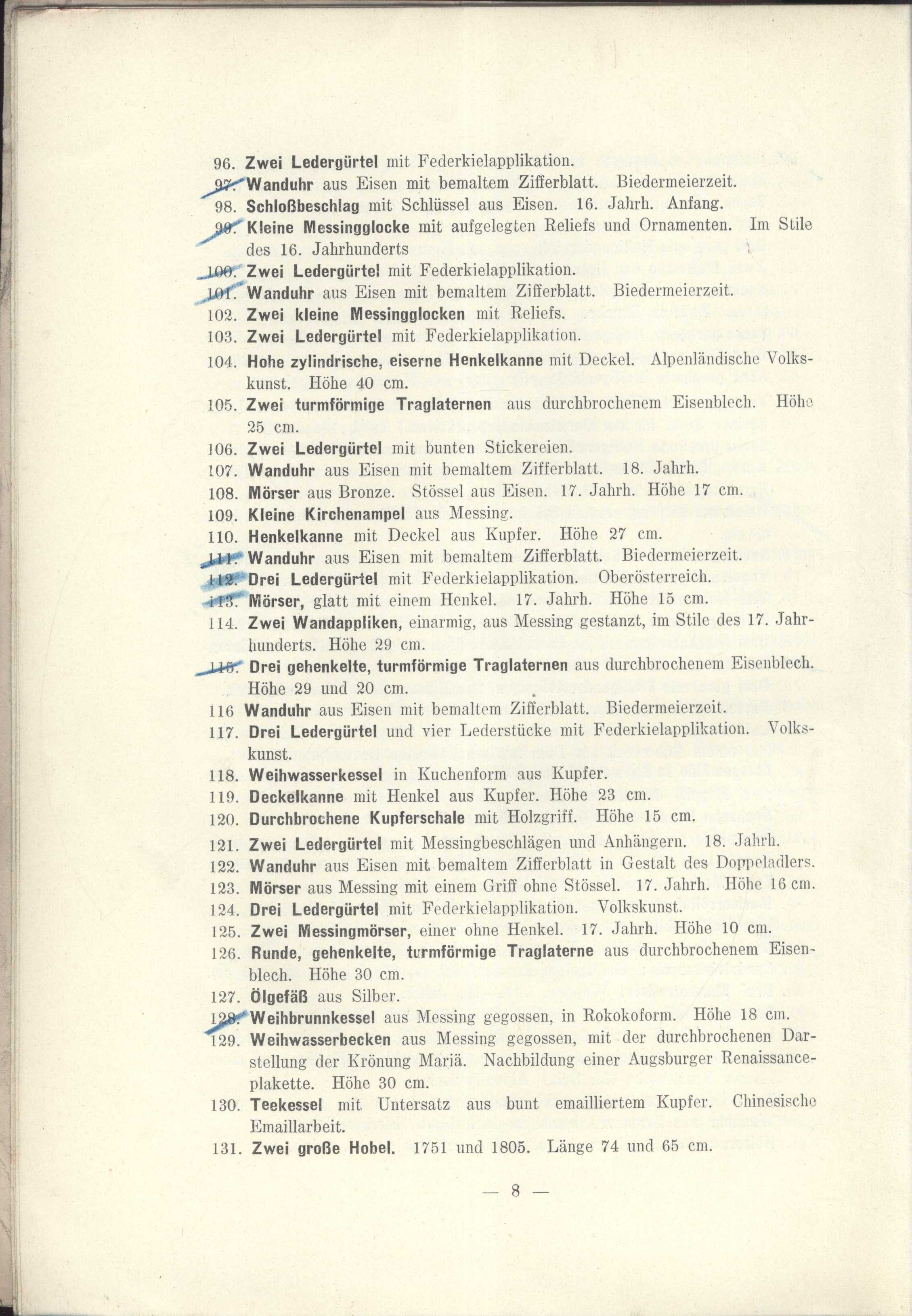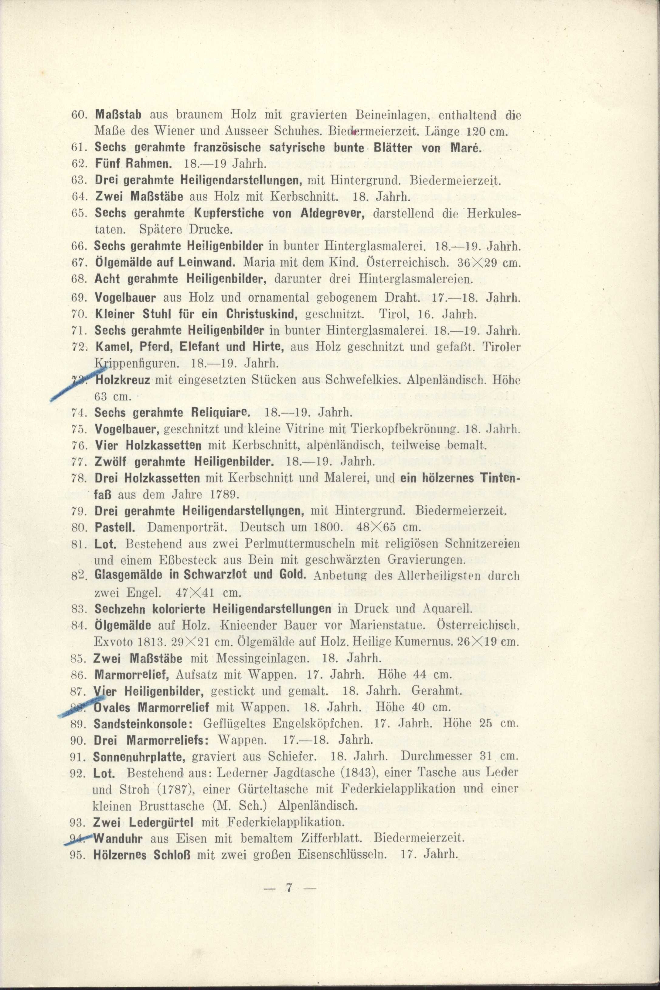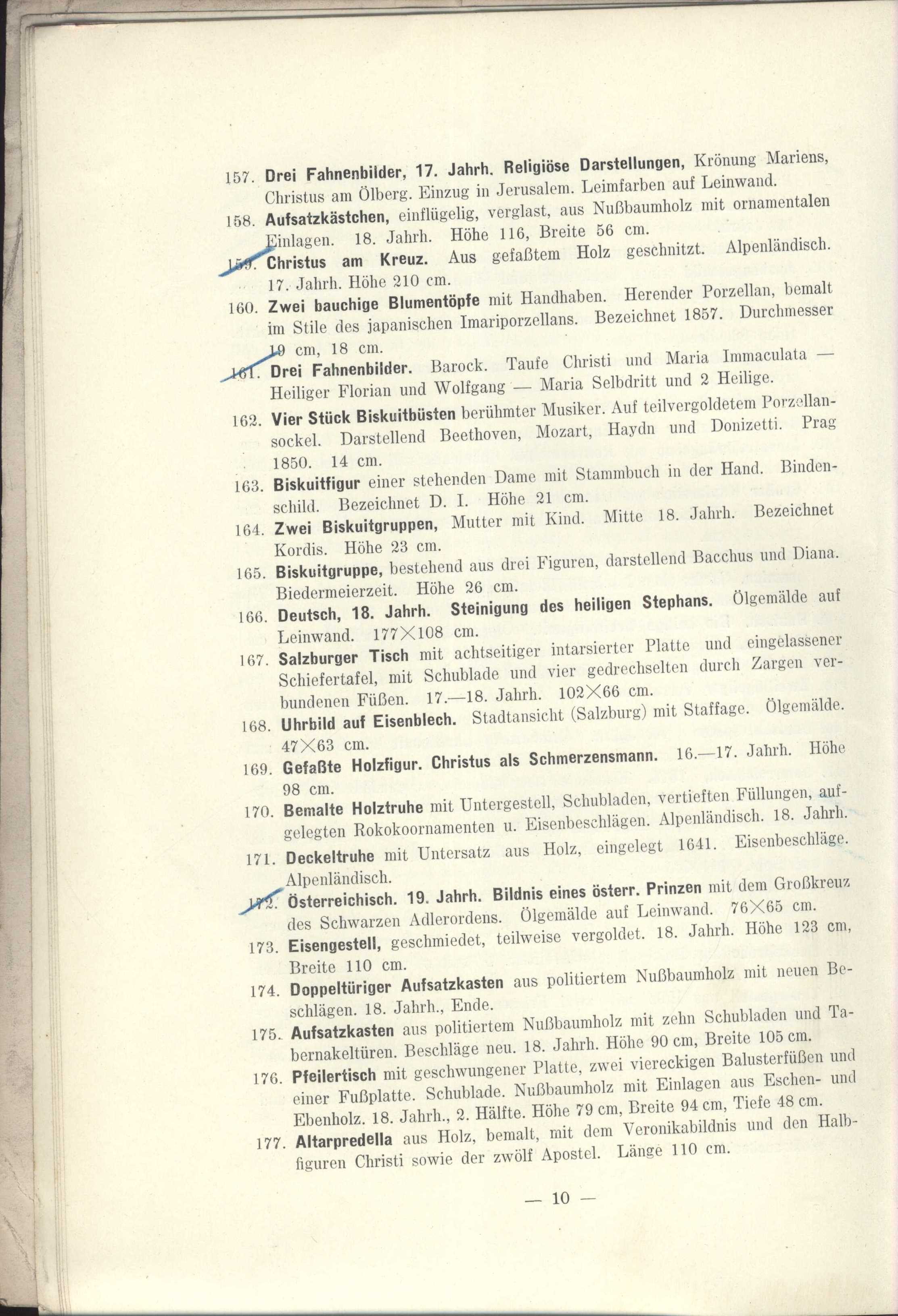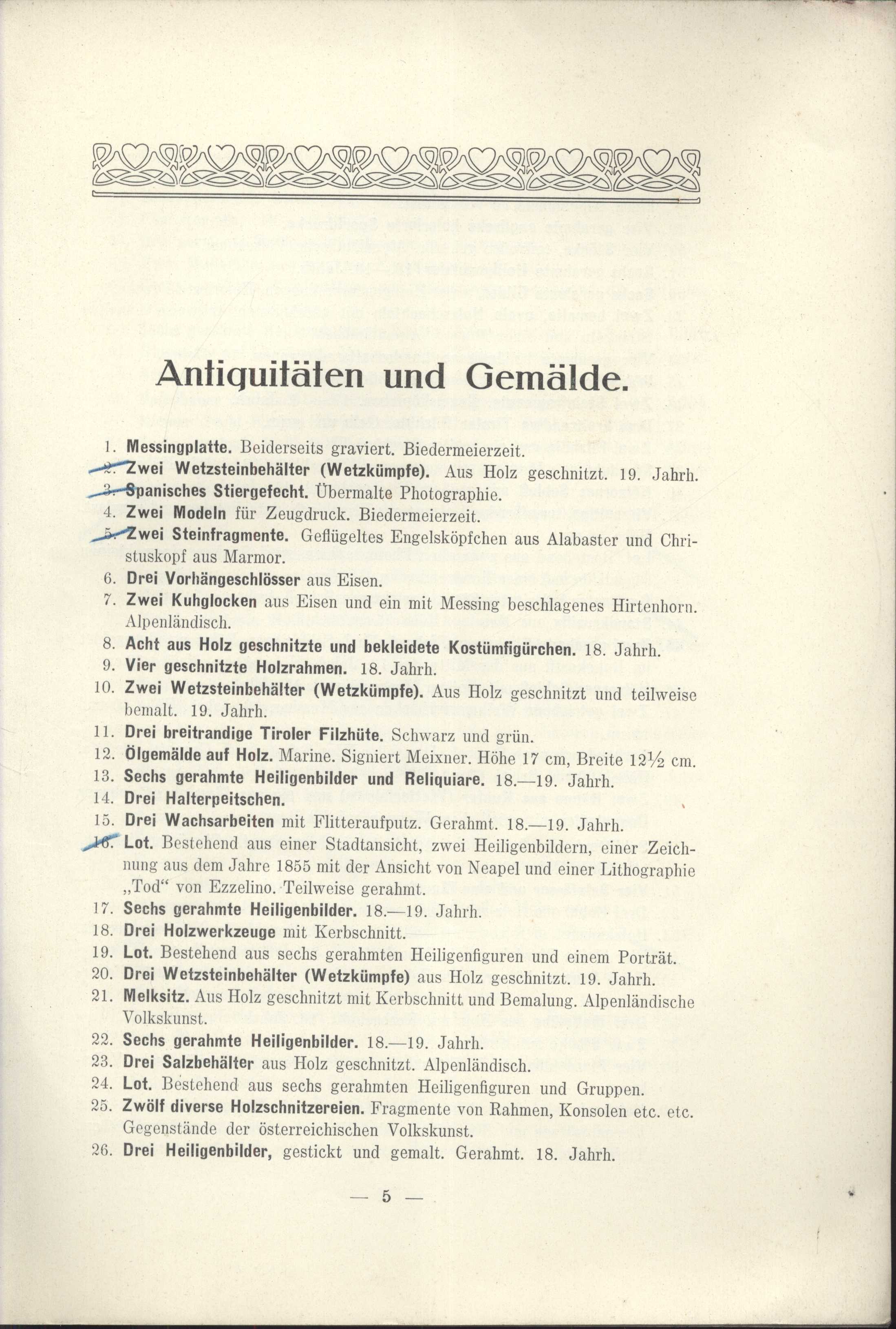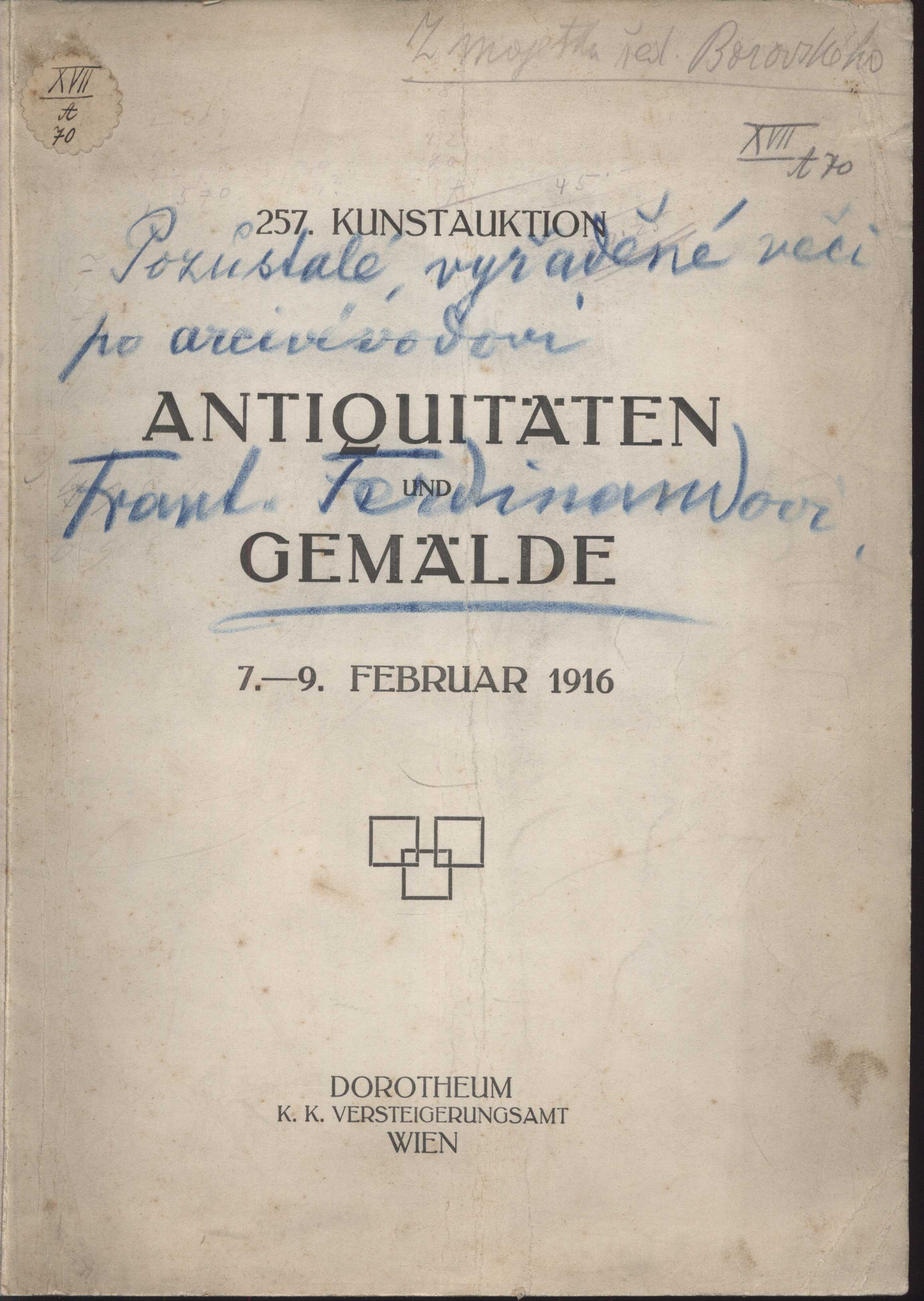 Názvové údaje XII. aukce : Knihovna Arnošta Procházky : druhá část : 17. a 18. prosince 1927 : hotel "Beránek" na Kr. Vinohradech / sestavil Karel Zink ; obálku do dřeva ryl František Kobliha Záhlaví-akce XII=12. aukce (Knihovna Arnošta Procházky) (17.-18. 12. 1927 : Hotel "Beránek", Praha, Česko) Další autoři Zink, Karel, 1889-1975 (Sestavovatel, kompilátor) (Nakladatel, vydavatel) (Dedikátor) Kobliha, František, 1877-1962 (Autor obálky) Karásek ze Lvovic, Jiří, 1871-1951 (Dedikant) Korp. Karel Zink (knihkupectví, antikvariát) (Nakladatel, vydavatel) Státní tiskárna v Praze (Tiskař) Nakladatel V Praze : Karel Zink, 1927 Výrobce (Tiskem Státní tiskárny) Rozsah 74 nečíslovaných stran, 1 nečíslovaný list obrazové přílohy : ilustrace Osobní hesla Procházka, Arnošt, 1869-1925 - básník, esejista, literární a výtvarný kritik, překladatel Klíčová slova česká literatura * katalog * bibliofilie * stol. 20., léta 20. * katalog knih * vzácné tisky * aukční katalog * aukční katalog knih * bibliofilská vydání * bibliofilské tisky * soukromé knihovny * dekadence * symbolismus * přelom 19. a 20. stol. * r. 1927 * Procházka A. Počet ex. 2, z toho volných 1 Druh dok. monografie Signatura KaG XVII B 30/12, KaG LXV 312 Názvové údaje XIV=14. aukce : Knihovna Arnošta Procházky : třetí část : 4. a 5. května 1928 : hotel "Beránek" na Kr. Vinohradech / [sestavili Miloslav Novotný a Karel Zink ; obálku a frontispic do dřeva ryl František Kobliha ; kromě obyčejného vydání vytištěno 50 exemplářů na holandském ručním papíru s původním leptem T. F. Šimona] Záhlaví-akce XIV=14. aukce (Knihovna Arnošta Procházky) (část třetí) (4.-5. 5. 1928 : Hotel Beránek, Praha, Česko) Další autoři Zink, Karel, 1889-1975 (Sestavovatel, kompilátor) (Nakladatel, vydavatel) (Autor podpisu) Novotný, Miloslav, 1894-1966 (Sestavovatel, kompilátor) (Autor podpisu) Kobliha, František, 1877-1962 (Autor obálky) (Grafický technik) (Ilustrátor) (Autor podpisu) Šimon, Tavík František, 1877-1942 (Grafický technik) Karásek ze Lvovic, Jiří, 1871-1951 (Autor podpisu) Korp. Karel Zink (knihkupectví, antikvariát) (Nakladatel, vydavatel) Státní tiskárna v Praze (Tiskař) Nakladatel V Praze : Karel Zink, 1928 Výrobce (Tiskem Státní tiskárny) Rozsah [92] s., [2] l. obr. příl. : il. Osobní hesla Procházka, Arnošt, 1869-1925 - básník, esejista, literární a výtvarný kritik, překladatel Klíčová slova česká literatura * katalog * vzácné knihy * bibliofilie * autografy * aukce * katalog knih * vzácné tisky * aukční katalog * autografy spisovatelů * aukční katalog knih * bibliofilská vydání * bibliofilské tisky * věnování * světová literatura * francouzská literatura * německá literatura * holandská literatura * rakouská literatura * polská literatura * španělská literatura * portugalská literatura * italská literatura * stol. 20., léta 20. * r. 1928 * soukromé knihovny Počet ex. 1, z toho volných 0 Druh dok. monografie Signatura KaG XVII B 30/14 Názvové údaje "Praha jak bývala.." : kresby a vzácná grafika z pražské soukromé sbírky / tento katalog sestavil Bedřich Lenz ; se čtyřmi vyobrazeními ; Krasoumná jednota, Praha 2, Pštrossova 12. ; 22. únor - 16. březen Záhlaví-akce "Praha jak bývala.." (kresby a vzácná grafika z pražské soukromé sbírky) (22. 2. - 16. 3. 1930 : Krasoumná jednota, Praha, Česko) Další autoři Karásek ze Lvovic, Jiří, 1871-1951 (Autor podpisu) Lenz, Bedřich (Autor úvodu atd.) Korp. Krasoumná jednota (Nakladatel, vydavatel) Emanuel Stivín (v Praze) (Tiskař) Nakladatel Praha : Krasoumná jednota, 1930 Výrobce (Tiskem Emanuela Stivína a synů) Rozsah 32 s., 4 l. obr. příl. : il. Klíčová slova česká literatura * české výtvarné umění * katalog * katalog výstavy * výstava * Praha * pragensia * stol. 20., léta 30. * r. 1930 Počet ex. 1, z toho volných 1 Druh dok. monografie Signatura KaG IX B 58 Názvové údaje Antiquitäten zumeist Alpenländische Volks-Kunst des 16., 17. und 18. Jahrhunderts : Holzbildwerke, Arbeiten in Holz (Modeln, Engelsköpschen, Krippenfiguren, Rahmen, Hausgeräte); Arbeiten in Fayence, Porzellan, Steingut, Ton, Glas, Silber, Bronze, Eisen, Kupfer, Messing, Zinn; Leder, Stein, Marmor, Wachs; Möbel (Tabernakelkästen, Schreibschränake, Truhen, Tische), Stand- und Wanduhren ; Alte Gemälde des 15. bis 18. Jahrhunderts italienischer und deutscher Meister Záhlaví-akce 257. Kunstauktion Antiquitäten und Gemälde (7. - 9. 2. 1916 : Dorotheum, WIen) Další autoři Borovský, František Adolf, 1852-1933 (Autor podpisu) (Dřívější majitel) Karásek ze Lvovic, Jiří, 1871-1951 (Autor podpisu) Korp. Dorotheum (Wien, Rakousko) (Nakladatel, vydavatel) R. v. Waldheim (Wien, Rakousko) (Tiskař) Nakladatel Wien : Dorotheum, 1916 Výrobce (R. v. Waldheim, Jos. Eberle & Co.) Rozsah 35 s., 6 l. obr. příl. : il. Klíčová slova katalog * aukce * rakouská literatura * stol. 20., léta 10. * r. 1918 * umělecká díla * aukční katalogy * aukční katalog Počet ex. 1, z toho volných 1 Druh dok. monografie Signatura KaG XVII A 70 Názvové údaje Katalog einer Sammlung von Antiquitäten : als Arbeiten in Gold, Silber, Emaille und Niello, Bronze, Kupfer, Zinn und Eisen, Glas, Porzellan, Majolika, Delft, Steingut, Buchsbaum, Elfenbein, Perlmutter, Kehlheimer Stein, Marmor, Lapis Lazuli, Korallen, Serpentin, Horn, Wachs, Möbel, Arbeiten in Holz, Waffen, Textilsachen, Manuskripte, Miniatüre, Aquarelle, Stiche und Buntdrucke, Bücher etc. : aus dem Nachlasse des Herrn domkapitular Dr. Aldenkirchen in Trier, zweir russischer Sammler und Anderer Záhlaví-akce 79. Math. Lempertz'sche Kunstversteigerung (17. - 18. 10. 1904 : Cöln) Další autoři Karásek ze Lvovic, Jiří, 1871-1951 (Autor podpisu) Borovský, František Adolf, 1852-1933 (Autor podpisu) (Dřívější majitel) Korp