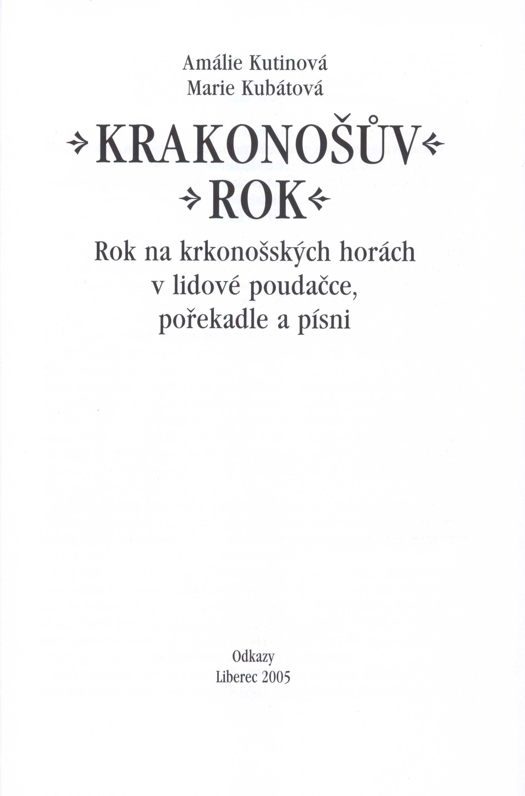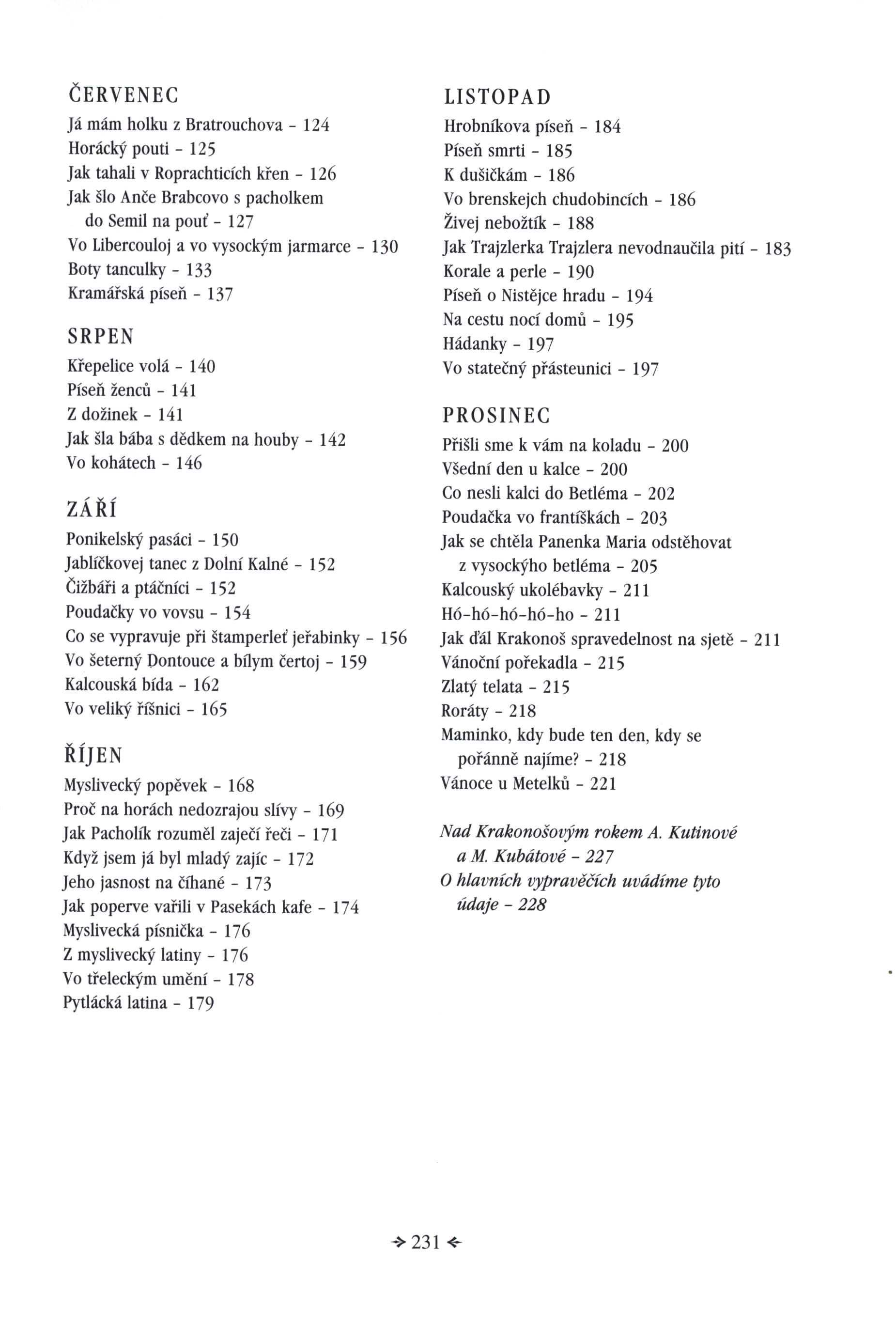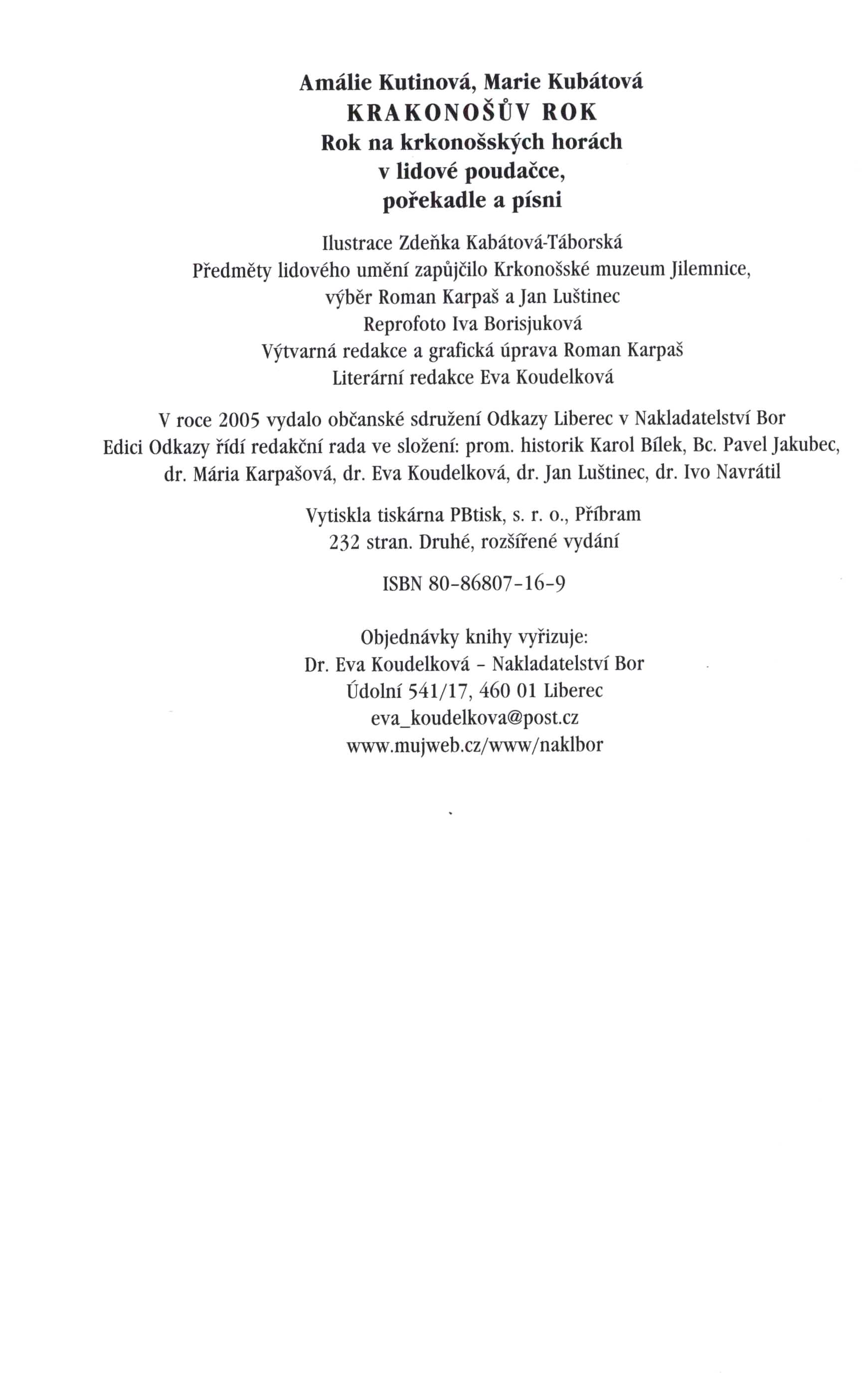 Názvové údaje Krakonoš v literatuře : kapitoly k literárnímu ztvárnění látky o Krakonošovi / Eva Koudelková ; [ilustrace na obálce, obou předsádkách, frontispisu a na s. 279 Petr Kříž] Osobní jméno Koudelková, Eva, 1949- (Autor) Další autoři Kříž, Petr, 1946- (Ilustrátor) Nakladatel Liberec : Bor, 2006 Rozsah 333 s., [32] s. barev. obr. příl. : il., faksim. ; 25 cm Klíčová slova česká literatura * r. 1620-1989 * německá literatura * stol. 17.-20. * Krakonoš * literární postavy * literárněvědné rozbory * studie Počet ex. 1, z toho volných 1 Druh dok. monografie Signatura C12c 2376 Názvové údaje Literární ztvárnění lidových pověstí z Náchodska / Eva Koudelková Osobní jméno Koudelková, Eva, 1949- (Autor) Nakladatel Boskovice : Albert, 1999 Rozsah 230 s., obr Klíčová slova česká literatura * literární věda * historické pověsti * lidové pověsti * literární ztvárnění * výzkum pověsti * Náchodsko Počet ex. 1, z toho volných 1 Druh dok. monografie Signatura C12b 3218 Názvové údaje Pověsti z kraje sklářů : lidová vyprávění z Jizerských hor a podhůří / sestavila a převyprávěla Eva Koudelková ; ilustrovala Jarka Vaňová ; z němčiny přeložila Adriana Šídová Osobní jméno Koudelková, Eva, 1949- (Editor) (Autor adaptace, upravovatel) (Autor úvodu atd.) Další autoři Novotná, Jarka, 1956- (Ilustrátor) Šídová, Adriana, 19-- (Překladatel) Nakladatel Liberec : Bor, 2004 Rozsah 199 s. : il. Klíčová slova česká próza * lidová vyprávění * pověsti * Jizerské hory Počet ex. 1, z toho volných 1 Druh dok. monografie Signatura C12c 1880 Názvové údaje Kalmanach 2003 : Kruh autorů Liberecka / [redakčně připravili Eva Koudelková, Jan Šebelka] Záhlaví-korpor. Kruh autorů Liberecka Další autoři Koudelková, Eva, 1949- (Editor) Šebelka, Jan, 1951- (Editor) Nakladatel Liberec : Bor, 2003 Rozsah 95 s. : il. Klíčová slova česká literatura * literární tvorba * umělecká tvorba * poezie * povídky * ukázky z děl * portréty osobností * Liberecko * regionální tvorba * spisovatelé * výtvarníci * osobnosti kraje Počet ex. 1, z toho volných 1 Druh dok. monografie Signatura C12d 865 Názvové údaje Krakonošův rok : rok na krkonošských horách v lidové poudačce, pořekadle a písni / Amálie Kutinová, Marie Kubátová ; ilustrace Zdeňka Kabátová-Táborská ; výtvarná redakce a grafická úprava Roman Karpaš Osobní jméno Kutinová, Amálie, 1898-1965 (Autor) Další autoři Kubátová, Marie, 1922-2013 (Autor) (Autor úvodu atd.) Kabátová-Táborská, Zdenka, 1933-2021 (Ilustrátor) Karpaš, Roman, 1951- (Redaktor, výkonný redaktor) (Knižní grafik) Koudelková, Eva, 1949- (Autor doslovu, tiráže atd.) Korp. Občanské sdružení Odkazy (Nakladatel, vydavatel) Nakladatelství Bor (Nakladatel, vydavatel) PBtisk (tiskárna) (Tiskař) Nakladatel Liberec : Odkazy, 2005 Výrobce Příbram : PBtisk, s. r. o. Rozsah 231 stran : ilustrace (některé barevné) ; 25 cm Předmětová hesla folk literature - Czechia Geografické heslo Krkonoše (Česko a Polsko : pohoří : oblast) * Krkonoše Region (Czechia and Poland) Klíčová slova česká literatura * antologie * folklor * tradice * lidová slovesnost * lidová vyprávění * lidové písně * lidové pohádky * Krkonoše * Česko Počet ex. 1, z toho volných 1 Druh dok. monografie Signatura C12c 5133