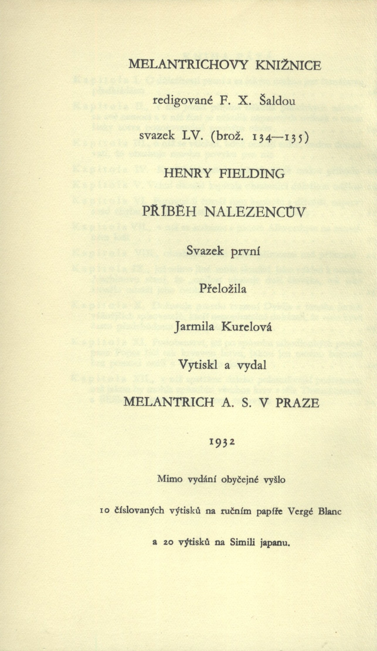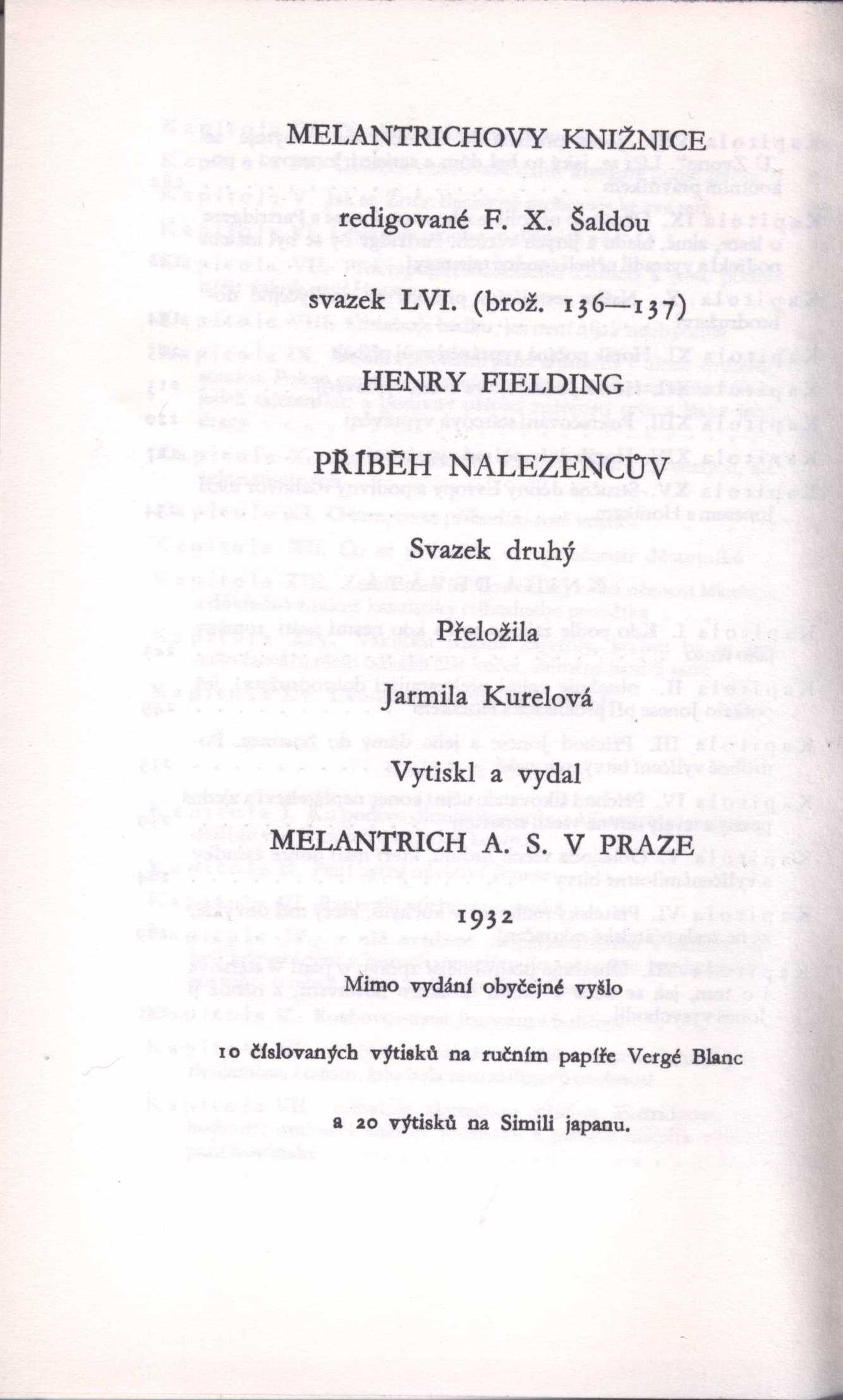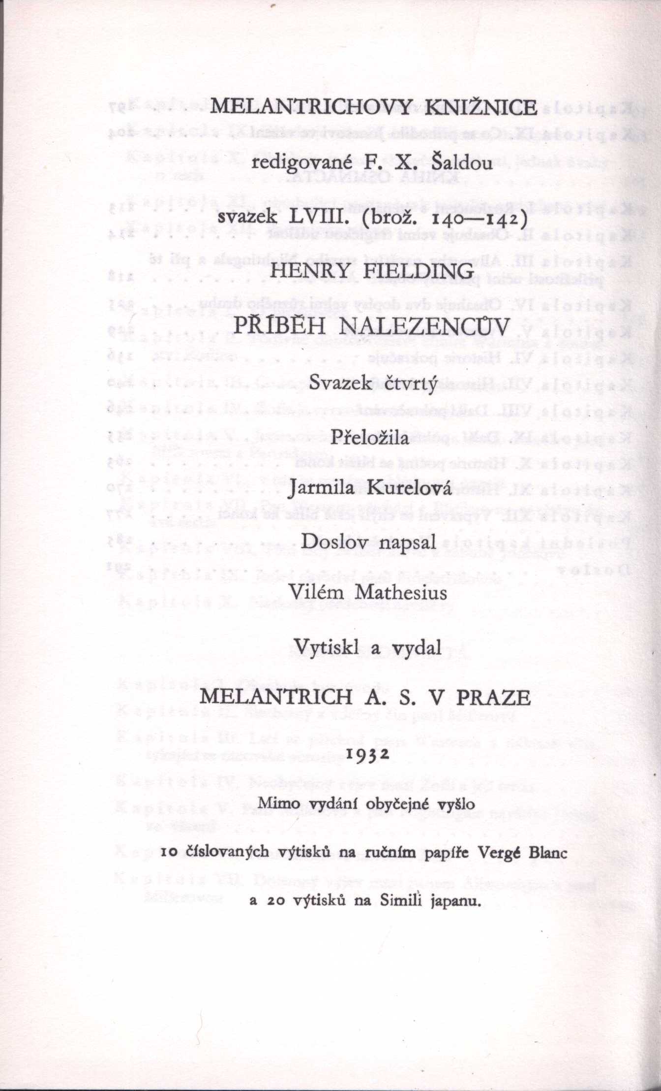 Názvové údaje Příběh nalezencův. 1, 2 / Henry Fielding ; překlad Jarmila Kurelová Osobní jméno Fielding, Henry, 1707-1754 (Autor) Další autoři Kurelová, Jarmila (Překladatel) Nakladatel Praha : Melantrich, 1932 Rozsah 248, 278 s. ; 19 cm Klíčová slova česká literatura Počet ex. 1, z toho volných 1 Druh dok. monografie Signatura Holan 1124 Názvové údaje Příběh nalezencův. 3, 4 / Henry Fielding ; přeložila Jarmila Kurelová ; doslov napsal Vilém Mathesius Osobní jméno Fielding, Henry, 1707-1754 (Autor) Další autoři Kurelová, Jarmila (Překladatel) Mathesius, Vilém, 1882-1945 (Autor úvodu atd.) Nakladatel Praha : Melantrich, 1932 Rozsah 239, 303 s. ; 19 cm Klíčová slova česká literatura Počet ex. 1, z toho volných 1 Druh dok. monografie Signatura Holan 1125 Názvové údaje Příběh nalezencův / Henry Fielding ; [přeložila Jarmila Kurelová]. I. Osobní jméno Fielding, Henry, 1707-1754 (Autor) Další autoři Kurelová, Jarmila (Překladatel) Korp. Melantrich (nakladatelství : 1910-1950) (Nakladatel, vydavatel) (Tiskař) (Tiskař obrazu) Nakladatel Praha : Melantrich a. s., 1932 Výrobce (Melantrich a. s.) Rozsah [6], 248 s. ; 20 cm Klíčová slova anglická literatura * próza * Fielding H. * překlad * román * Anglie * stol. 18. Počet ex. 1, z toho volných 1 Druh dok. monografie Signatura P 100 d 12 Názvové údaje Příběh nalezencův / Henry Fielding ; [přeložila Jarmila Kurelová]. II. Osobní jméno Fielding, Henry, 1707-1754 (Autor) Další autoři Kurelová, Jarmila (Překladatel) Murphy, Arthur, 1727-1805 (Autor úvodu atd.) Korp. Melantrich (nakladatelství : 1910-1950) (Tiskař) (Tiskař obrazu) Nakladatel Praha : Melantrich a. s., 1932 Výrobce (Melantrich a. s.) Rozsah 278 s. ; 20 cm Klíčová slova anglická literatura * próza * Fielding H. * překlad * román * Anglie * stol. 18. Počet ex. 1, z toho volných 1 Druh dok. monografie Signatura P 100 d 13 Názvové údaje Příběh nalezencův / Henry Fielding ; [přeložila Jarmila Kurelová]. III. Osobní jméno Fielding, Henry, 1707-1754 (Autor) Další autoři Kurelová, Jarmila (Překladatel) Korp. Melantrich (nakladatelství : 1910-1950) (Nakladatel, vydavatel) (Tiskař) (Tiskař obrazu) Nakladatel Praha : Melantrich a. s., 1932 Výrobce (Melantrich a. s.) Rozsah 241 s. ; 20 cm Klíčová slova anglická literatura * próza * Fielding H. * překlad * román * Anglie * stol. 18. Počet ex. 1, z toho volných 1 Druh dok. monografie Signatura P 100 d 14 Názvové údaje Příběh nalezencův / Henry Fielding ; [přeložila Jarmila Kurelová ; doslov napsal Vilém Mathesius]. IV. Osobní jméno Fielding, Henry, 1707-1754 (Autor) Další autoři Kurelová, Jarmila (Překladatel) Mathesius, Vilém, 1882-1945 (Autor doslovu, tiráže atd.) Korp. Melantrich (nakladatelství : 1910-1950) (Nakladatel, vydavatel) (Tiskař) (Tiskař obrazu) Nakladatel Praha : Melantrich a. s., 1932 Výrobce (Melantrich a. s.) Rozsah 303 s. ; 20 cm Osobní hesla Fielding, Henry, 1707-1754 - anglický romanopisec, dramatik, esejista a žurnalista Klíčová slova anglická literatura * próza * Fielding H. * překlad * román * Anglie * stol. 18. Počet ex. 1, z toho volných 1 Druh dok. monografie Signatura P 100 d 15 Názvové údaje Příběh nalezencův. [sv.] I. / Henry Fielding ; [přeložila Jarmila Kurelová] Osobní jméno Fielding, Henry, 1707-1754 (Autor) Další autoři Kurelová, Jarmila (Překladatel) Korp. Melantrich (nakladatelství) (Nakladatel, vydavatel) Nakladatel Praha : Melantrich, 1932 Rozsah 248 s. ; 8° Klíčová slova anglická literatura * próza * anglický román Počet ex. 1, z toho volných 1 Druh dok. monografie Signatura MEL 1977/I Názvové údaje Příběh nalezencův. [sv.] II. / Henry Fielding ; [přeložila Jarmila Kurelová] Osobní jméno Fielding, Henry, 1707-1754 (Autor) Další autoři Kurelová, Jarmila (Překladatel) Korp. Melantrich (nakladatelství) (Nakladatel, vydavatel) Nakladatel Praha : Melantrich, 1932 Rozsah 278 s. ; 8° Klíčová slova anglická literatura * próza * anglický román Počet ex. 1, z toho volných 1 Druh dok. monografie Signatura MEL 1977/II Názvové údaje Příběh nalezencův. [sv.] III. / Henry Fielding ; [přeložila Jarmila Kurelová] Osobní jméno Fielding, Henry, 1707-1754 (Autor) Další autoři Kurelová, Jarmila (Překladatel) Korp. Melantrich (nakladatelství) (Nakladatel, vydavatel) Nakladatel Praha : Melantrich, 1932 Rozsah 241 s. ; 8° Klíčová slova anglická literatura * próza * anglický román Počet ex. 1, z toho volných 1 Druh dok. monografie Signatura MEL 1977/III Názvové údaje Příběh nalezencův. [sv.] IV. / Henry Fielding ; [přeložila Jarmila Kurelová] Osobní jméno Fielding, Henry, 1707-1754 (Autor) Další autoři Kurelová, Jarmila (Překladatel) Korp. Melantrich (nakladatelství) (Nakladatel, vydavatel) Nakladatel Praha : Melantrich, 1932 Rozsah 303 s. ; 8° Klíčová slova anglická literatura * próza * anglický román Počet ex. 1, z toho volných 1 Druh dok. monografie Signatura MEL 1977/IV