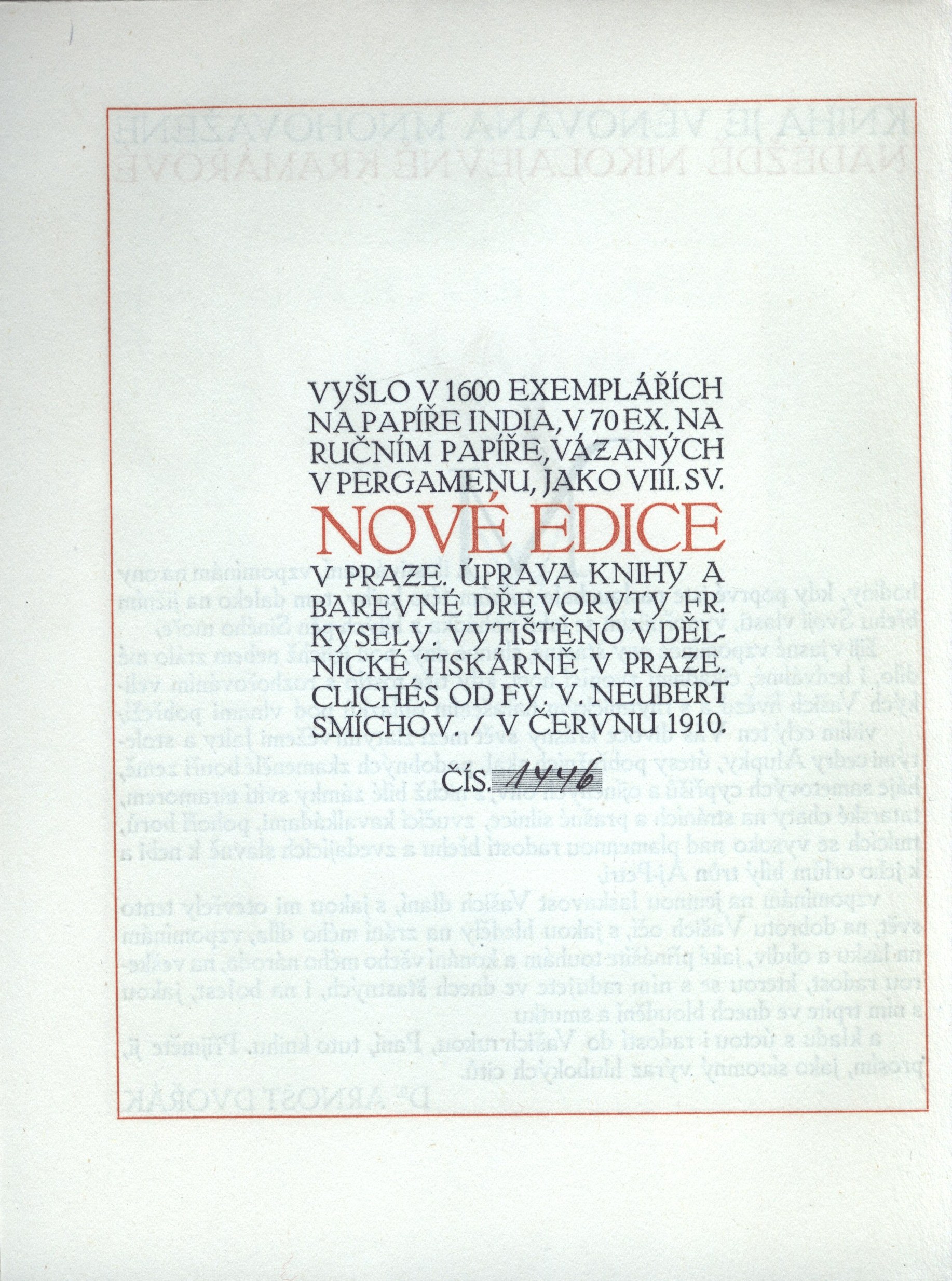 Názvové údaje Portugalské listy / [v překladu a s doslovem od Hanuše Jelínka ; úprava a barevné litografie Frant. Kysely] Osobní jméno Alcoforado, Mariana, 1640-1723 (Autor) Další autoři Jelínek, Hanuš, 1878-1944 (Překladatel) (Autor doslovu, tiráže atd.) Kysela, František, 1881-1941 (Ilustrátor) (Litograf) Svobodová, Hana (Dárce) Svoboda, Antonín (Dřívější majitel) Korp. Dělnická knihtiskárna a nakladatelství (Praha) (Tiskař) V. Neubert a synové (firma) (Tiskař obrazu) Nakladatel V Praze : Nová edice, [po r. 1900] Rozsah 35 s., [3] l. obr. příl. : il. Klíčová slova portugalská literatura * dopisy * milostné dopisy * milostná literatura * kláštery * bibliofilské tisky * bibliofilský tisk * bibliofilská vydání Počet ex. 1, z toho volných 1 Druh dok. monografie Signatura KaG XXXII F2 137 Názvové údaje Fysiologie manželství / Honoré de Balzac ; obálka a titulní list Frant. Kysely Osobní jméno Balzac, Honoré de, 1799-1850 (Autor) Další autoři Kysela, František, 1881-1941 Nakladatel Praha : Aktuality a kuriosity, 1922 Výrobce Tribuna, Rozsah 219 s. ; 19 cm Klíčová slova česká literatura Počet ex. 1, z toho volných 1 Druh dok. monografie Signatura Holan 184 Názvové údaje Neznámé arcidílo / Honoré de Balzac ; [v překladu St. Hanuše ; úprava knihy Fr. Kysely] Osobní jméno Balzac, Honoré de, 1799-1850 (Autor) Další autoři Hanuš, Stanislav, 1885-1943 (Překladatel) Kysela, František, 1881-1941 (Knižní grafik) Bouček, Antonín, 1880-1947 (Nakladatel, vydavatel) Korp. Dělnická knihtiskárna a nakladatelství (Praha) (Tiskař) Štencovo nakladatelství (Tiskař obrazu) Nakladatel V Praze : Antonín Bouček, 1909 Výrobce (Tiskem Dělnické knihtiskárny) Rozsah 35, [3] s., [1] list obr. příl. : il. Klíčová slova francouzská literatura * stol. 19. * bibliofilie * bibliofilský tisk * francouzská próza Počet ex. 1, z toho volných 1 Druh dok. monografie Signatura KaG XV B 236 Názvové údaje Neznámé arcidílo / Honoré de Balzac ; v překladu St. Hanuše ; úprava Fr. Kysely Osobní jméno Balzac, Honoré de, 1799-1850 (Autor) Další autoři Hanuš, Stanislav, 1885-1943 (Překladatel) Kysela, František, 1881-1941 (Grafický technik) Nakladatel Praha : Antonín Bouček, 1909 Rozsah 35 s. : il. ; 17 cm Klíčová slova česká literatura Počet ex. 1, z toho volných 1 Druh dok. monografie Signatura Holan 843 Názvové údaje Národní divadlo a jeho budovatelé : dějiny Národního divadla / Jan Bartoš Osobní jméno Bartoš, Jan, 1893-1946 (Autor) Další autoři Kysela, František, 1881-1941 (Grafický technik) Kaláb, Method, 1885-1963 (Grafický technik) Korp. Národní divadlo v Praze (Organizátor akce) Nakladatel V Praze : Sbor pro zřízení druhého Národního divadla, 1933 Rozsah 359 s. : il. Klíčová slova dějiny divadla * monografie * Národní divadlo, Praha * osobnosti * Praha * Česko * stol. 20. Počet ex. 3, z toho volných 3 Druh dok. monografie Signatura MUK 1126, M 66a13, P 35A42 Názvové údaje Bolestná blaženost / Edvard Bém ; [dřevoryt a veškeré kresby provedl V. H. Brunner ; po jeho smrti redakci úpravy, se zachováním původních disposic převzal František Kysela ; návrh vazby provedl Václav Mašek] Osobní jméno Bém, Edvard, 1883-1945 (Autor) (Nakladatel, vydavatel) Další autoři Svoboda, Milan (Nakladatel, vydavatel) Brunner, Vratislav Hugo, 1886-1928 (Knižní grafik) (Ilustrátor) Kysela, František, 1881-1941 (Knižní grafik) Mašek, Václav, 1893-1973 (Výtvarník vazby) Korp. Průmyslová tiskárna v Praze (Tiskař) Nakladatel Praha : [Edvard Bém], 1929 Výrobce (Průmyslová tiskárna) Rozsah 44 s. : il. Klíčová slova česká literatura * česká próza * bibliofilie * bibliofilská vydání * bibliofilský tisk Počet ex. 1, z toho volných 1 Druh dok. monografie Signatura KaG XXXVII D 29 Názvové údaje Král Václav IV. : drama o 5 dějstvích / Arnošt Dvořák ; [úprava knihy a barevné dřevoryty Fr. Kysely] Osobní jméno Dvořák, Arnošt, 1881-1933 (Autor) Další autoři Kysela, František, 1881-1941 (Knižní grafik) (Ilustrátor) Korp. Antonín Bouček (nakladatelství) (Nakladatel, vydavatel) Dělnická tiskárna (Tiskař) (Tiskař obrazu) Grafické umělecké závody V. Neubert (firma) (Tiskař obrazu) Nakladatel V Praze : Nová edice, 1910 Výrobce (vytištěno v Dělnické tiskárně) Rozsah 92, [3] s., [5] obr. příl. : il. ; 21,7 cm Klíčová slova česká literatura * drama * divadelní hra * r. 1910 Počet ex. 1, z toho volných 1 Druh dok. monografie Signatura OŘíha 310 Názvové údaje Giuseppe Moro / Viktor Dyk ; [v úpravě F. Kysely] Osobní jméno Dyk, Viktor, 1877-1931 (Autor) (Autor podpisu) Další autoři Kysela, František, 1881-1941 (Knižní grafik) Korp. Štencovo nakladatelství (Tiskař obrazu) Dělnická knihtiskárna a nakladatelství (Praha) (Tiskař) Nakladatel Praha : [s. a.], 1911 Výrobce (Tiskem Dělnické tiskárny) Rozsah 65 s. : il. Klíčová slova česká poezie * epická poezie * stol. 20., léta 10. * česká literatura Počet ex. 2, z toho volných 2 Druh dok. monografie Signatura C12a 2739, KaG XVI B 314 Názvové údaje Krysař / Viktor Dyk ; [v úpravě Fr. Kysely ; svázal Antonín Jelínek] Osobní jméno Dyk, Viktor, 1877-1931 (Autor) Další autoři Kysela, František, 1881-1941 (Ilustrátor) (Knižní grafik) (Výtvarník vazby) Korp. Fr. Borový (firma) (Nakladatel, vydavatel) Grafia (tiskárna, nakladatelství) (Tiskař) Nakladatel V Praze : nakladatel Fr. Borový, 1915 Výrobce (vytiskla "Grafia") Rozsah 79 s., [3] l. obr. příl. : il. ; 19 cm Klíčová slova česká literatura * próza * lyrická próza * ilustrované knihy * bibliofilie Počet ex. 3, z toho volných 3 Druh dok. monografie Signatura AFB 0038, AFB 0038a, Topič 0341 Názvové údaje Čechische Bestrebungen um ein modernes Interieur / Josef Gočár, Pavel Janák, Frant. Kysela ; mit einer Einleit