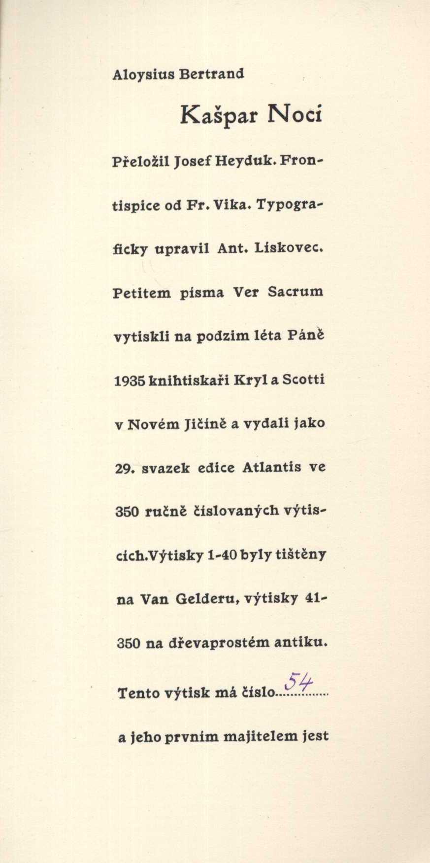Názvové údaje Kalendář Mikoláše Alše / s básní Jaroslava Seiferta ; upravil A. Lískovec ; vazbu navrhl Břetislav Štorm ; obálka s použitím Alšova portrétu od Maxe Švabinského Osobní jméno Aleš, Mikoláš, 1852-1913 (Autor) Další autoři Seifert, Jaroslav, 1901-1986 (Jiná role) Švabinský, Max, 1873-1962 (Autor obálky) Štorm, Břetislav, 1907-1960 (Výtvarník vazby) Lískovec, Antonín, 1894-1949 (Grafický technik) Korp. Ladislav Kuncíř (nakladatelství a knihkupectví) (Nakladatel, vydavatel) Dr. Ed. Grégr (nakladatelství, tiskárna) (Tiskař) Nakladatel V Praze : Ladislav Kuncíř, 1947 Výrobce Eduard Grégr Rozsah 152, xli stran : ilustrace Klíčová slova umění * výtvarné umění * české výtvarné umění * obrazové publikace Počet ex. 2, z toho volných 2 Druh dok. monografie Signatura Hoffmeister 0815, Janeček 1047 Názvové údaje Legenda o Cidu Campeadorovi / Alexandre Arnoux ; Z frančiny přel. Josef Florian ; Linolea vyryl Michael Florian ; [Typograficky upravil Antonín Lískovec] Osobní jméno Arnoux, Alexandre, 1884-1973 (Autor) Další autoři Florian, Josef, 1873-1941 (Překladatel) Florian, Michael, 1911-1984 (Ilustrátor) Lískovec, Antonín, 1894-1949 (Ilustrátor) Florian, Josef, 1873-1941 (Autor podpisu) Nakladatel Stará Říše : [Marta Florianová], 1935 Rozsah 107 s. : il Osobní hesla Florian, Josef, 1873-1941 - nakladatel a překladatel Klíčová slova francouzská literatura * próza * historický román * legenda * španělská literatura Počet ex. 1, z toho volných 1 Druh dok. monografie Signatura C12a 194 Názvové údaje Poslední den / André Beaunier ; Z francouzštiny přeložil Jaroslav Zaorálek ; [Upravil Antonín Lískovec] Osobní jméno Beaunier, André, 1869-1925 (Autor) Další autoři Zaorálek, Jaroslav, 1896-1947 (Překladatel) Lískovec, Antonín, 1894-1949 (Grafický technik) Nakladatel Stará Říše : [Marta Florianová], 1937 Rozsah 101 s. Klíčová slova francouzská literatura * náboženství * próza * román Počet ex. 1, z toho volných 1 Druh dok. ***nezařazeno*** Signatura C12a 364 Názvové údaje Neviditelné světlo / Robert Hugh Benson ; přeložil Antonín Stříž ; [podle osnovy Antonína Lískovce] Osobní jméno Benson, Robert Hugh, 1871-1914 (Autor) Další autoři Stříž, Antonín Ludvík, 1888-1960 (Překladatel) Lískovec, Antonín, 1894-1949 (Knižní grafik) Korp. Ladislav Kuncíř (nakladatelství a knihkupectví) (Nakladatel, vydavatel) Václav Horák (tiskárna) (Tiskař) Nakladatel V Praze : Ladislav Kuncíř, 1930 Výrobce Knihtiskárna Václava Horáka) Rozsah 166 s. : il. ; 17 cm Klíčová slova anglická próza * anglicky psaná literatura * nadpřirozená zkušenost * smyslové vnímání * tajuplné příběhy Počet ex. 2, z toho volných 2 Druh dok. monografie Signatura VMartínek 1469, Holan 1438 Názvové údaje Pod sluncem Satanovým / Georges Bernanos ; [Přeložil B. Reynek] Osobní jméno Bernanos, Georges, 1888-1948 (Autor) Další autoři Reynek, Bohuslav, 1892-1971 (Překladatel) Lískovec, Antonín, 1894-1949 (Ilustrátor) Nakladatel Stará Říše : [Marta Florianová], 1928 Rozsah 344 s. Klíčová slova francouzská literatura * próza * román Počet ex. 1, z toho volných 1 Druh dok. monografie Signatura C12a 268 Názvové údaje Kašpar Noci / Aloysius Bertrand ; [přeložil Josef Heyduk ; frontispice od Fr. Vika ; typograficky upravil Ant. Lískovec] Osobní jméno Bertrand, Aloysius, 1807-1841 (Autor) Další autoři Heyduk, Josef, 1904-1994 (Překladatel) Vik, František, 1895-1957 (Ilustrátor) Lískovec, Antonín, 1894-1949 (Grafický technik) Korp. Jan V. Pojer (Brno) (Nakladatel, vydavatel) Kryl a Scotti (firma) (Tiskař) Nakladatel [Brno : Jan V. Pojer], 1935 Výrobce Kryl a Scotti) Rozsah 183 s. Klíčová slova francouzská próza * povídky Počet ex. 2, z toho volných 2 Druh dok. monografie Signatura C12a 260, VMartínek 1098 Názvové údaje Církevní Cherubín, anebo, Slavný, a stálý v ohni, a mukách víry a svaté zpovědi zástupce Jan Sarkander : vytištěný po prvé v Brně l. P. 1703 u Marie Alžběty Synápovy, vdovy / Bohumír Hynek Bilovský ; do tisku připravil Josef Vašica Osobní jméno Bílovský, Bohumír Hynek Josef, 1659-1725 (Autor) Další autoři Vašica, Josef, 1884-1968 (Dedikátor) (Editor) (Autor doslovu, tiráže atd.) Lískovec, Antonín, 1894-1949 (Knižní grafik) Korp. Stojanova literární jednota bohoslovců (spolek) (Nakladatel, vydavatel) Lidové závody tiskařské a nakladatelské (Olomouc) (Tiskař) Nakladatel Olomouc : Stojanova literární jednota bohoslovců, 1933 Výrobce V Olomouci : Lidové závody tiskařské a nakladatelské, společnost s ručením obmez. Rozsah 249 stran, 1 nečíslovaný list obrazové přílohy : ilustrace ; 18 cm Osobní hesla Jan Sarkander, svatý, 1576-1620 Klíčová slova česká literatura * barokní poezie * starší česká literatura * české baroko * česká barokní literatura * světci * hagiografické texty * hagiografie Počet ex. 3, z toho volných 3 Druh dok. monografie Signatura C12a 2687, VHB 0226, AHO 0117 Názvové údaje Na prahu Apokalypsy / Leon Bloy ; Přeložil Otto Albert Tichý. 1913-1915, Další k Žebráku Nevděčníku, Mému Deníku, Čtyřem Letům Zajetí v Prasečí Marně, Neprodajnému, Starci s Hory a k Poutníku Absolutna Osobní jméno Bloy, Léon, 1846-1917 (Autor) Další autoři Tichý, Otto Albert, 1890-1973 (Překladatel) Lískovec, Antonín, 1894-1949 (Grafický technik) Nakladatel Praha : Ladislav Kuncíř, 1930 Rozsah 343 s. Klíčová slova francouzská literatura * próza * filozofické povídky Počet ex. 1, z toho volných 1 Druh dok. monografie Signatura C12a 254 Názvové údaje Abbé Du Bos : obnovitel vědecké kritiky / Marcel Braunschvig ; [z francouzštiny přeložil J. F] Osobní jméno Braunschvig, Marcel, 1876-1953 (Autor) Další autoři Florian, Josef, 1873-1941 (Překladatel) Lískove