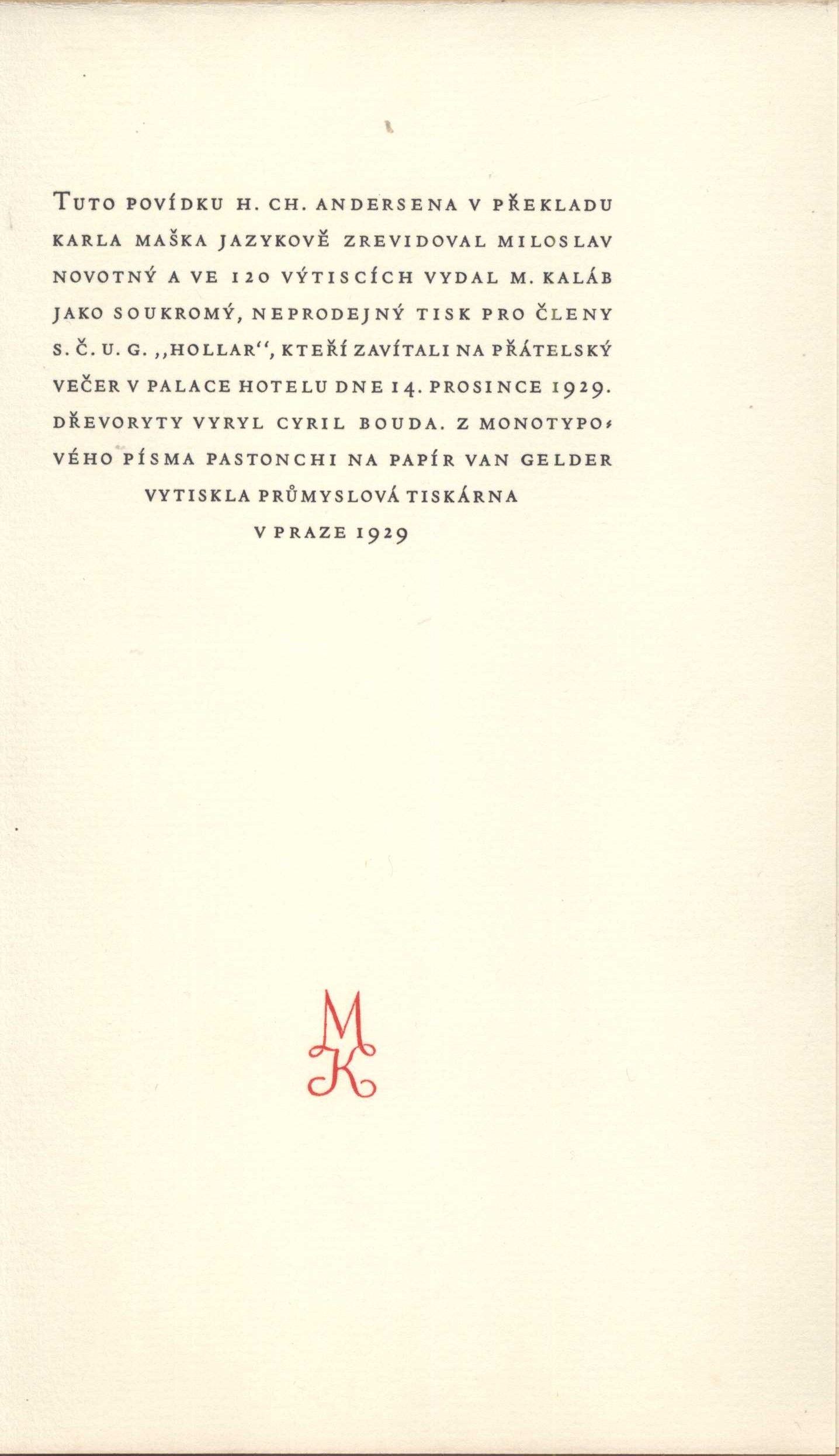 Názvové údaje XIV=14. aukce : Knihovna Arnošta Procházky : třetí část : 4. a 5. května 1928 : hotel "Beránek" na Kr. Vinohradech / [sestavili Miloslav Novotný a Karel Zink ; obálku a frontispic do dřeva ryl František Kobliha ; kromě obyčejného vydání vytištěno 50 exemplářů na holandském ručním papíru s původním leptem T. F. Šimona] Záhlaví-akce XIV=14. aukce (Knihovna Arnošta Procházky) (část třetí) (4.-5. 5. 1928 : Hotel Beránek, Praha, Česko) Další autoři Zink, Karel, 1889-1975 (Sestavovatel, kompilátor) (Nakladatel, vydavatel) (Autor podpisu) Novotný, Miloslav, 1894-1966 (Sestavovatel, kompilátor) (Autor podpisu) Kobliha, František, 1877-1962 (Autor obálky) (Grafický technik) (Ilustrátor) (Autor podpisu) Šimon, Tavík František, 1877-1942 (Grafický technik) Karásek ze Lvovic, Jiří, 1871-1951 (Autor podpisu) Korp. Karel Zink (Praha, Česko) (Nakladatel, vydavatel) Státní tiskárna v Praze (Tiskař) Nakladatel V Praze : Karel Zink, 1928 Výrobce (Tiskem Státní tiskárny) Rozsah [92] s., [2] l. obr. příl. : il. Osobní hesla Procházka, Arnošt, 1869-1925 - básník, esejista, literární a výtvarný kritik, překladatel Klíčová slova česká literatura * katalog * vzácné knihy * bibliofilie * autografy * aukce * katalog knih * vzácné tisky * aukční katalog * autografy spisovatelů * aukční katalog knih * bibliofilská vydání * bibliofilské tisky * věnování * světová literatura * francouzská literatura * německá literatura * holandská literatura * rakouská literatura * polská literatura * španělská literatura * portugalská literatura * italská literatura * stol. 20., léta 20. * r. 1928 * soukromé knihovny Počet ex. 1, z toho volných 1 Druh dok. monografie Signatura KaG XVII B 30/14 Názvové údaje Můj život se lvy / George Adamson ; z anglického originálu Bwana Game přeložil Jan Silvín ; obálka a vazba Miloslav Novotný Osobní jméno Adamson, George, 1906-1989 (Autor) Další autoři Silvín, Jan (Překladatel) Novotný, Miloslav (Autor obálky) Korp. Mladá fronta (nakladatelství) (Nakladatel, vydavatel) Mír, novinářské závody (tiskárna) (Tiskař) Nakladatel Praha : Mladá fronta, 1972 Výrobce Mír 6 Rozsah 255 stran : 28 nečíslovaných stran fotografických příloh a 8 nečíslovaných stran barevných příloh Klíčová slova Afrika * Keňa * příroda * přírodní rezervace * zoologie Počet ex. 1, z toho volných 1 Druh dok. monografie Signatura P 27 F 95 Názvové údaje Povídka o roce / Hans Christian Andersen ; v překladu Karla Maška Osobní jméno Andersen, Hans Christian, 1805-1875 (Autor) Další autoři Mašek, Karel, 1867-1922 (Překladatel) Novotný, Miloslav, 1894-1966 (Redaktor, výkonný redaktor) Bouda, Cyril, 1901-1984 (Ilustrátor) Kaláb, Method, 1885-1963 (Nakladatel, vydavatel) (Knižní grafik) Korp. Průmyslová tiskárna v Praze (Tiskař) (Tiskař obrazu) Nakladatel V Praze : M. Kaláb, 1929 Výrobce V Praze : Průmyslová tiskárna Rozsah 20 stran : ilustrace ; 22 cm + 1 list 22 x 28 cm složený na 22 x 14 cm Klíčová slova dánská literatura * próza * Andersen H. Ch. * povídka * český překlad * Mašek K. * ilustrace * Bouda C. * soukromý tisk * Kaláb M. * bibliofilská vydání * r. 1929 Počet ex. 1, z toho volných 1 Druh dok. monografie Signatura VZinková 0550 Názvové údaje Štrajchpudlíci / J. Arbes ; illustroval M. Aleš ; s doslovem Jiřího Karáska ze Lvovic ; typografická úprava, obálka a vazba jsou provedeny podle návrhů Jindřicha Štyrského ; v redakci Miloslava Novotného Osobní jméno Arbes, Jakub, 1840-1914 (Autor) Další autoři Aleš, Mikoláš, 1852-1913 (Ilustrátor) Karásek ze Lvovic, Jiří, 1871-1951 (Autor doslovu, tiráže atd.) Štyrský, Jindřich, 1899-1942 (Autor obálky) (Výtvarník vazby) (Typograf) Novotný, Miloslav, 1894-1966 (Editor) (Autor doslovu, tiráže atd.) Korp. Evropský literární klub (nakladatelství) (Nakladatel, vydavatel) Müller a spol. (tiskárna) (Tiskař) Nakladatel V Praze : Evropský literární klub, 1940 Výrobce V Turnově : Müller a spol. Rozsah 303 stran : ilustrace Klíčová slova česká literatura * česká próza * romány * stol. 19., léta 80. Počet ex. 3, z toho volných 3 Druh dok. monografie Signatura KaG LII D 118, P 55 a 27, P 28 b 66 Názvové údaje Štrajchpudlíci / J. Arbes ; illustroval M. Aleš ; [s doslovem Jiřího Karáska ze Lvovic ; typografická úprava, obálka a vazba jsou provedeny podle návrhů Jindřicha Štyrského] Osobní jméno Arbes, Jakub, 1840-1914 (Autor) Další autoři Aleš, Mikoláš, 1852-1913 (Ilustrátor) Karásek ze Lvovic, Jiří, 1871-1951 (Autor doslovu, tiráže atd.) Štyrský, Jindřich, 1899-1942 (Typograf) (Autor obálky) (Výtvarník vazby) Novotný, Miloslav, 1894-1966 (Autor úvodu atd.) Korp. Evropský literární klub (nakladatelství) (Nakladatel, vydavatel) Müller a spol. (tiskárna) (Tiskař) Nakladatel V Praze : Evropský literární klub, 1940 Výrobce Müller a spol.) Rozsah 303 s. : il. ; 22 cm Osobní hesla Arbes, Jakub, 1840-1914 - novinář, politik, prozaik, dramatik, překladatel Klíčová slova česká literatura * próza * román * sociální román * Praha * Smíchov (Praha) * stol. 19. * ilustrované knihy Počet ex. 1, z toho volných 1 Druh dok. monografie Signatura ELK 0251 Názvové údaje Vikingové / Holger Arbman ; z anglické verze The Vikings ... přeložil, doslov a poznámky napsal Lubomír Košnar ; přebal, vazba a grafická úprava Miloslav Novotný Osobní jméno Arbman, Holger, 1904-1968 (Autor) Další autoři Košnar, Lubomír, 1944- (Překladatel) (Autor doslovu, tiráže atd.) (Autor komentáře) Novotný, Miloslav, 1894-1966 (Autor obálky) (Knižní grafik) Korp. Mladá fronta (nakladatelství) (Nakladatel, vydavatel) Nakladatel Praha : Mladá fronta, 1969 Rozsah 197 stran, 48 nečíslovaných stran obrazových příloh : černobílé ilustrace, mapy, 