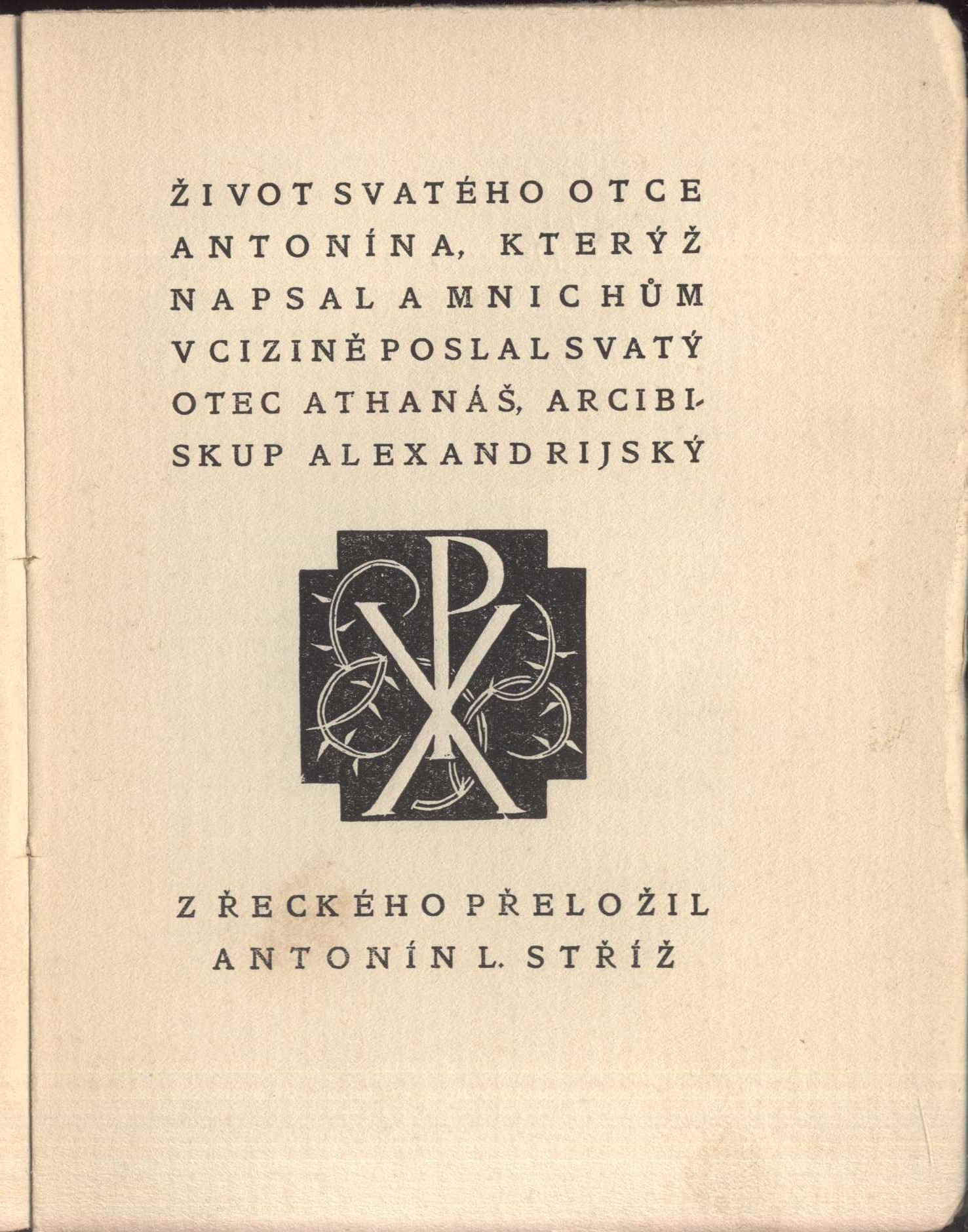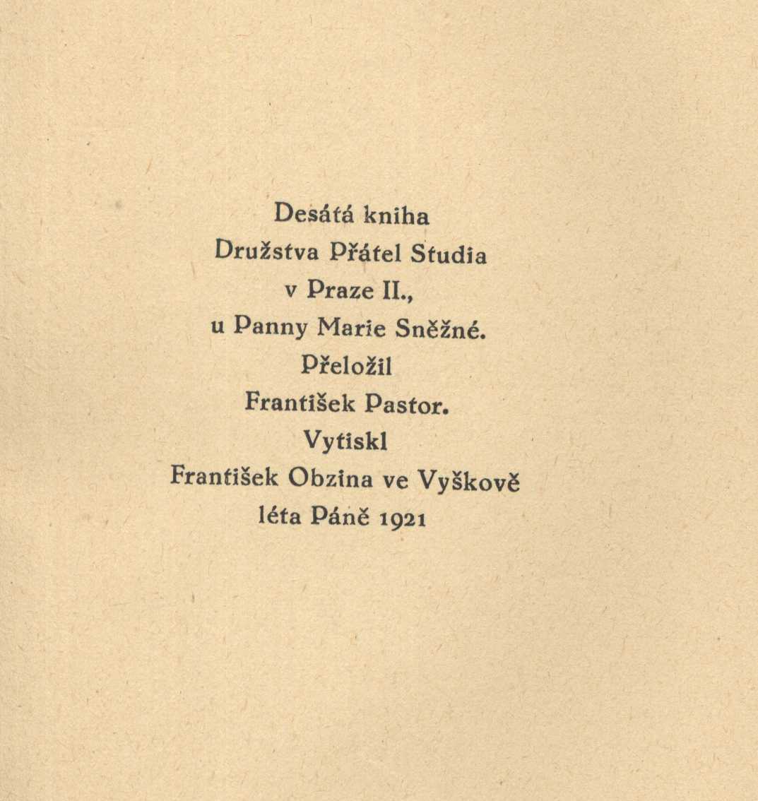 Názvové údaje Život svatého otce Antonína, kterýž napsal a mnichům v cizině poslal svatý otec Athanáš, arcibiskup alexandrijský / z řeckého přeložil Antonín L. Stříž ; [dřevoryty vyzdobil Jaroslav Benda] Autor Athanasius, svatý, asi 295-373 (Autor) Další autoři Stříž, Antonín Ludvík, 1888-1960 (Překladatel) Pastor, František, 1895-1961 (Překladatel) Benda, Jaroslav, 1882-1970 (Ilustrátor) Portman, Josef, 1893-1968 (Dedikant) Korp. Marta Florianová (nakladatelství, tiskárna) (Nakladatel, vydavatel) Fr. Trnka (nakladatelství, tiskárna) (Tiskař) Nakladatel Ve Staré Říši : Sklad Marty Florianové, 1928 Výrobce Fr. J. Trnka) Rozsah 120 s. Osobní hesla Antonín Poustevník, svatý, asi 250-356 Klíčová slova řecká literatura * náboženská literatura * životopis * Antonín svatý * bibliofilie Počet ex. 2, z toho volných 2 Druh dok. monografie Signatura POR 272, VHB 3154 Názvové údaje Řehoř Narecký / Aršag Čobanian ; Přeložil František Pastor Osobní jméno Čobanian Aršak, 1872-1954 (Autor) Další autoři Pastor, František, 1895-1961 (Překladatel) Lískovec, Antonín, 1894-1949 (Grafický technik) Nakladatel Stará Říše : [Marta Florianová], 1933 Rozsah 57 s. Osobní hesla Řehoř Narecký, svatý, 951-1003 - arménský teolog, mystik, básník * Řehoř Narecký, svatý, 951-1003 - arménský teolog, mystik, básník * Řehoř Narecký, svatý, 951-1003 - arménský teolog, mystik, básník * Řehoř Narecký, svatý, 951-1003 - arménský teolog, mystik, básník Klíčová slova životopis * Řehoř Narecký svatý Počet ex. 1, z toho volných 1 Druh dok. monografie Signatura C12a 391 Názvové údaje Řehoř Narecký / Aršag Čobanian ; přeložil František Pastor Osobní jméno Čobanian Aršak, 1872-1954 (Autor) Další autoři Pastor, František, 1895-1961 (Překladatel) Nakladatel Stará Říše na Moravě : Josef Florian, 1933 Výrobce Josef Sýkora, Rozsah 57 s. ; 16 cm Klíčová slova česká literatura Počet ex. 1, z toho volných 1 Druh dok. monografie Signatura Holan 1246 Názvové údaje Dobro, svědomí a usebranost / Romano Guardini ; [z němčiny přeložil František Pastor] Osobní jméno Guardini, Romano, 1885-1968 (Autor) Další autoři Pastor, František, 1895-1961 (Překladatel) Nakladatel Stará Říše na Moravě : Marta Florianová, 1941 Výrobce V. Vokolek a syn) Rozsah 36 s. Klíčová slova svědomí dobro křesťanská etika duchovní život přednášky Počet ex. 1, z toho volných 1 Druh dok. monografie Signatura C12b 7335 Názvové údaje Křesťanství a kultura / Romano Guardini ; Přeložil František Pastor Osobní jméno Guardini, Romano, 1885-1968 (Autor) Další autoři Pastor, František, 1895-1961 (Překladatel) Nakladatel Stará Říše : b.n., 1931 Rozsah 17, 54 s. : il Klíčová slova německá literatura * náboženství Počet ex. 1, z toho volných 1 Druh dok. monografie Signatura C12a 386 Názvové údaje Těžkomyslnost a její smysl / Romano Guardini ; Z němčiny přeložil František Pastor Osobní jméno Guardini, Romano, 1885-1968 (Autor) Další autoři Pastor, František, 1895-1961 (Překladatel) Lískovec, Antonín, 1894-1949 (Grafický technik) Nakladatel Stará Říše : [Marta Florianová], 1932 Rozsah 53 s. Klíčová slova německá literatura * filozofie * psychiatrie Počet ex. 2, z toho volných 2 Druh dok. monografie Signatura C12a 387, Holan 1212 Názvové údaje O živém bohu : duchovní slovo / Romano Guardini ; z němčiny přeložil František Pastor Osobní jméno Guardini, Romano, 1885-1968 (Autor) Další autoři Pastor, František, 1895-1961 (Překladatel) Nakladatel Stará Říše na Moravě : Josef Florian, 1939 Rozsah 100 s. ; 17 cm Klíčová slova česká literatura Počet ex. 1, z toho volných 1 Druh dok. monografie Signatura Holan 2188 Názvové údaje Pravda a život / Theodor Haecker ; Přeložil František Pastor Osobní jméno Haecker, Theodor, 1879-1945 (Autor) Další autoři Pastor, František, 1895-1961 (Překladatel) Nakladatel Stará Říše : [Josef V. Florian], 1947 Rozsah 57 s. Klíčová slova německá literatura * filozofie * pravda * úvahy Počet ex. 1, z toho volných 1 Druh dok. monografie Signatura C12a 414 Názvové údaje Pravda a život / Theodor Haecker ; přeložil František Pastor Osobní jméno Haecker, Theodor, 1879-1945 (Autor) Další autoři Pastor, František, 1895-1961 (Překladatel) Nakladatel Stará Říše na Moravě : Josef V. Florian, 1947 Rozsah 57 s. : il. ; 15 cm Klíčová slova česká literatura Počet ex. 1, z toho volných 1 Druh dok. monografie Signatura Holan 1623 Názvové údaje Růženec ve slunci / Francis Jammes ; přeložil František Pastor Osobní jméno Jammes, Francis, 1868-1938 (Autor) Další autoři Pastor, František, 1895-1961 (Překladatel) Korp. Družstvo Přátel Studia (Praha, Česko) (Nakladatel, vydavatel) František Obzina (tiskárna, nakladatelství) (Tiskař) Nakladatel V Praze : Družstvo přátel Studia, 1921 Výrobce František Obzina) Rozsah 194 s. ; 16 cm Klíčová slova francouzská próza * romány Počet ex. 2, z toho volných 2 Druh dok. monografie Signatura VMartínek 1190, P 107 G 27