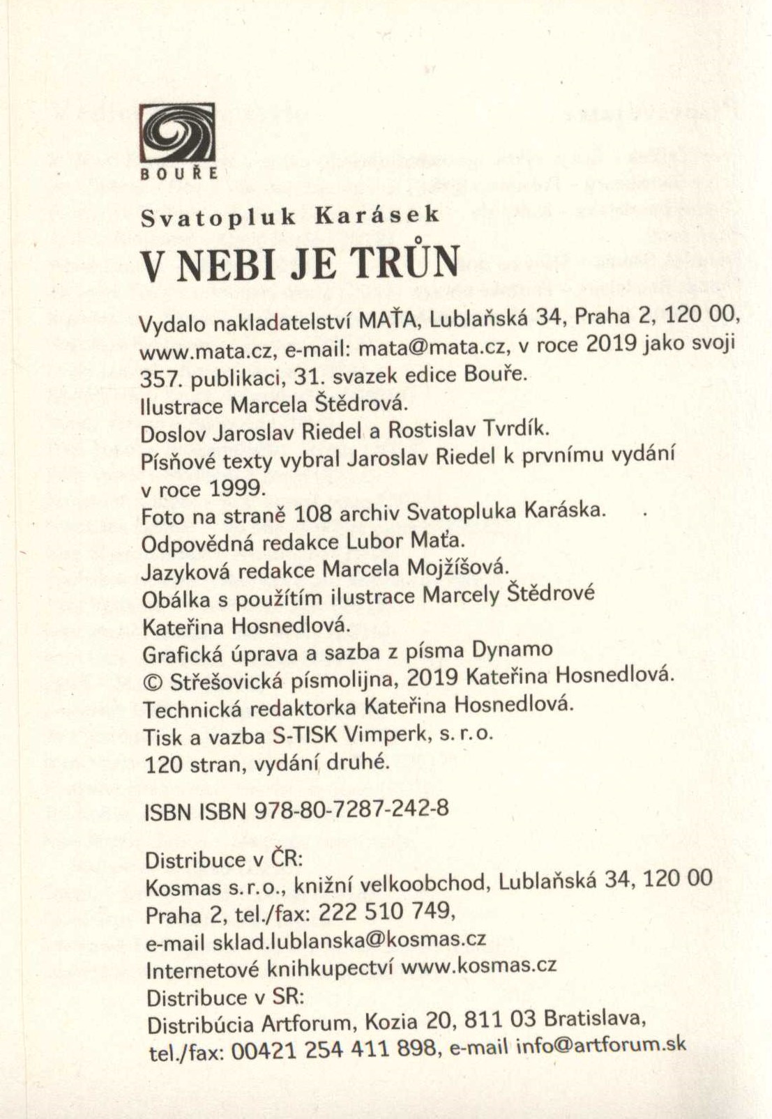 Názvové údaje Listí / Dagmar Voňková ; [k vydání připravil Lubomír Houdek a Jaroslav Riedel ; pořádání, sestavení bloku textů o autorce, diskografie a ediční poznámka Jaroslav Riedel ; ilustrace Dagmar Voňková ; grafická úprava Bedřich Vémola] Osobní jméno Andrtová-Voňková, Dagmar, 1948- (Autor) (Ilustrátor) Další autoři Houdek, Lubomír, 1962- (Editor) Riedel, Jaroslav, 1963- (Editor) (Autor textu doprovodného materiálu) Vémola, Bedřich, 1970- (Knižní grafik) Korp. Galén (nakladatelství) (Nakladatel, vydavatel) Finidr (tiskárna) (Nakladatel, vydavatel) Nakladatel Praha : Galén, 2010 Výrobce Finidr) Rozsah 398 s. : il., portréty Osobní hesla Andrtová-Voňková, Dagmar, 1948- - kytaristka, zpěvačka, hudební skladatelka, textařka Klíčová slova hudební skladatelé * zpěvačky * česká poezie * písňové texty * Česko * stol. 20.-21. * rozhovory * recenze Počet ex. 2, z toho volných 2 Druh dok. monografie Signatura C12b 12824, C12b 15811 Názvové údaje Mňága & Žďorp : z nejhoršího jsme uvnitř / napsal Petr Fiala (a taky Martin Knor... [et al.]) ; fotogr. Karel Prokeš ... [et al.] ; doslov Jaroslav Riedel ; obálka a graf. úprava Tomáš Chorý Osobní jméno Fiala, Petr, 1964 březen 20.- (Autor) Další autoři Riedel, Jaroslav, 1963- (Autor úvodu atd.) Chorý, Tomáš, 1960- (Grafický technik) Nakladatel Olomouc : Hájek, [1993] Rozsah 294 s. : fotogr. ; 18 cm Klíčová slova české hudební skupiny hudební skupiny Počet ex. 1, z toho volných 1 Druh dok. monografie Signatura M 218 e 65 Názvové údaje Vrata dokořán : texty písní a básně / Sváťa Karásek ; [uspořádal, k vydání připravil, diskografii sestavil a ediční poznámku napsal Jaroslav Riedel ; medailon autora napsal Jan Šulc ; obálku navrhl a graficky upravil Viktor Karlík] Osobní jméno Karásek, Svatopluk, 1942-2020 (Autor) Další autoři Riedel, Jaroslav, 1963- (Sestavovatel, kompilátor) (Editor) Šulc, Jan, 1965- (Autor úvodu atd.) Karlík, Viktor, 1962- (Knižní grafik) (Autor obálky) Nakladatel Praha : Kalich, 2010 Výrobce Akcent) Rozsah 178 s. Klíčová slova česká poezie * básně * texty písní * stol. 20., léta 50.-90. Počet ex. 1, z toho volných 1 Druh dok. monografie Signatura C12b 12740 Názvové údaje Kritik bez konzervatoře : rozhovor s Jiřím Černým / Jaroslav Riedel ; [editor Lubomír Houdek] Osobní jméno Riedel, Jaroslav, 1963- (Autor) (Dotazovatel, interviewující) Další autoři Černý, Jiří, 1936-2023 (Dotazovaný, interviewovaný) Houdek, Lubomír, 1962- (Editor) Nakladatel Praha : Galén, c2006 Rozsah 381 s. : il., portréty ; 20 cm Osobní hesla Černý, Jiří, 1936-2023 - novinář, hudební publicista, redaktor Klíčová slova hudební kritika * hudební publicistika * česká hudba * česká populární hudba * česká rocková hudba * čeští publicisté * život * činnost * Česko * stol. 20.-21. * rozhovory Počet ex. 1, z toho volných 1 Druh dok. monografie Signatura C12b 9867
