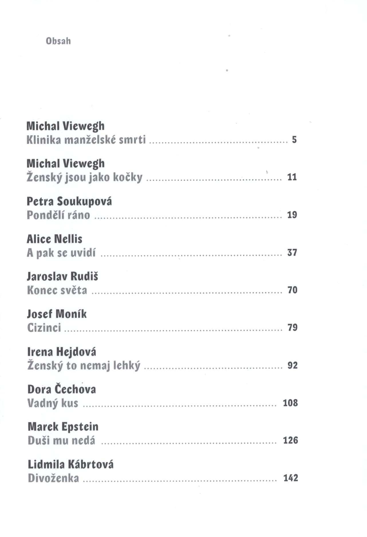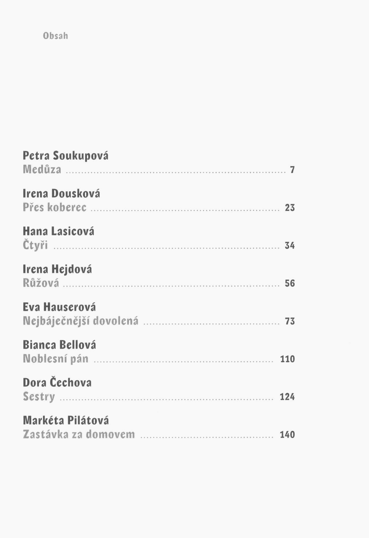 Názvové údaje Dámská jízda / Petra Soukupová, Irena Dousková, Hana Lasicová, Irena Hejdová, Eva Hauserová, Bianca Bellová, Dora Čechova, Markéta Pilátová ; obálku s použitím malby Ivany Lomové navrhl a graficky upravil Luděk Bárta ; editor: Boris Dočekal Osobní jméno Soukupová, Petra, 1982- (Autor) Další autoři Dousková, Irena, 1964- (Autor) Lasicová, Hana, 1981- (Autor) Hejdová, Irena, 1977- (Autor) Hauserová, Eva, 1954-2023 (Autor) Bellová, Bianca, 1970- (Autor) Čechova, Dora, 1971- (Autor) Pilátová, Markéta, 1973- (Autor) Bárta, Luděk, 1961- (Autor obálky) (Knižní grafik) Lomová, Ivana, 1959- (Umělec) Dočekal, Boris, 1950- (Editor) Nakladatel Jihlava : Nakladatelství Listen, 2016 Rozsah 153 stran ; 18 cm Klíčová slova česká próza * povídky * soubor povídek * ženy * každodenní život Počet ex. 1, z toho volných 1 Druh dok. monografie Signatura C12a 5627 Názvové údaje K moři / Petra Soukupová ; [obálka a ilustrace Milan Soukup ; grafická úprava Boris Mysliveček] Osobní jméno Soukupová, Petra, 1982- (Autor) Další autoři Soukup, Milan (Ilustrátor) (Autor obálky) Mysliveček, Boris, 1948- (Knižní grafik) Nakladatel Brno : Host, 2007 Rozsah 198 s. : il. Klíčová slova česká próza * psychologický román * romány ze života Počet ex. 1, z toho volných 1 Druh dok. monografie Signatura C12b 10312 Názvové údaje Kdo zabil Snížka? / Petra Soukupová ; ilustrace Tereza Ščerbová ; graficky upravil a ... vysázel Martin T. Pecina Osobní jméno Soukupová, Petra, 1982- (Autor) Další autoři Ščerbová, Tereza, 1982- (Ilustrátor) Pecina, Martin T., 1982- (Knižní grafik) Korp. Host (nakladatelství) (Nakladatel, vydavatel) Finidr (tiskárna) (Tiskař) Nakladatel Brno : Host, 2017 Výrobce Český Těšín : Finidr, .s.r.o. Rozsah 146 stran : barevné ilustrace ; 24 cm Klíčová slova literatura pro děti * česká próza * detektivní příběh Počet ex. 1, z toho volných 1 Druh dok. monografie Signatura C12c 4961 Názvové údaje Marta v roce vetřelce / Petra Soukupová ; [ilustrace Nikola Hoření ; graficky upravil ... Martin T. Pecina] Osobní jméno Soukupová, Petra, 1982- (Autor) Další autoři Hoření, Nikola (Ilustrátor) Pecina, Martin T., 1982- (Knižní grafik) Nakladatel Brno : Host, 2011 Rozsah 316 s., [8] s. obr. příl. : il. Klíčová slova česká próza * romány * deníková forma * fiktivní deník Počet ex. 1, z toho volných 1 Druh dok. monografie Signatura C12b 13428 Názvové údaje Pod sněhem : román / Petra Soukupová ; [obálka Tomski & Polanski ; grafická úprava a vazba Host] Osobní jméno Soukupová, Petra, 1982- (Autor) Další autoři Tomski & Polanski (umělecká skupina) (Autor obálky) Host (nakladatelství) (Grafický technik) (Výtvarník vazby) Nakladatel Brno : Host, 2015 Rozsah 367 s. Klíčová slova česká próza * román Počet ex. 1, z toho volných 1 Druh dok. monografie Signatura C12b 16109 Názvové údaje Zmizet / Petra Soukupová ; [obálka a ilustrace Milan Soukup ; typografická úprava Martin Pecina] Osobní jméno Soukupová, Petra, 1982- (Autor) Další autoři Soukup, Milan (Autor obálky) (Ilustrátor) Pecina, Martin T., 1982- (Typograf) Nakladatel Brno : Host, 2009 Rozsah 340 s. : il. Klíčová slova česká próza * povídky * rodinné vztahy Počet ex. 1, z toho volných 1 Druh dok. monografie Signatura C12b 11878 Názvové údaje Žít jako single / Petra Soukupová, Miloš Urban, Emil Hakl, Irena Hejdová, Hana Lasicová, Marek Epstein, Daniela Fischerová, Markéta Hejkalová, Tomáš Baldýnský Osobní jméno Soukupová, Petra, 1982- (Autor) Další autoři Urban, Miloš, 1967- (Autor) Hakl, Emil, 1958- (Autor) Hejdová, Irena, 1977- (Autor) Lasicová, Hana, 1981- (Autor) Epstein, Marek, 1975- (Autor) Fischerová, Daniela, 1948- (Autor) Hejkalová, Markéta, 1960- (Autor) Baldýnský, Tomáš, 1972- (Autor) Nakladatel Praha : Listen, 2019 Rozsah 119 stran : ilustrace ; 19 cm Počet ex. 1, z toho volných 0 Druh dok. monografie Signatura LITb 00011 Názvové údaje Možná si porozumíme / Michal Viewegh ... [et al.] ; [obálku s použitím kresby Adély Marie Jirků navrhl a graficky upravil Luděk Bárta ; editor Boris Dočekal] Osobní jméno Viewegh, Michal, 1962- (Autor) Další autoři Soukupová, Petra, 1982- (Autor) Dousková, Irena, 1964- (Autor) Bellová, Bianca, 1970- (Autor) Hejdová, Irena, 1977- (Autor) Baldýnský, Tomáš, 1972- (Autor) Moník, Josef, 1952- (Autor) Hauserová, Eva, 1954-2023 (Autor) Čechova, Dora, 1971- (Autor) Kábrtová, Lidmila, 1971- (Autor) Jirků, Adéla Marie, 1985- (Ilustrátor) Bárta, Luděk, 1961- (Autor obálky) (Knižní grafik) Dočekal, Boris, 1950- (Editor) Nakladatel Jihlava : Listen, 2015 Rozsah 158 s. Klíčová slova česká próza * povídky * soubor povídek Počet ex. 1, z toho volných 1 Druh dok. monografie Signatura C12a 5445 Názvové údaje Nové povídky o ženách / Michal Viewegh, Petra Soukupová, Alice Nellis, Jaroslav Rudiš, Josef Moník, Irena Hejdová, Dora Čechova, Marek Epstein, Lidmila Kábrtová ; obálku s použitím malby Ivany Lomové navrhl a graficky upravil Luděk Bárta ; editor: Boris Dočekal Osobní jméno Viewegh, Michal, 1962- (Autor) Další autoři Soukupová, Petra, 1982- (Autor) Nellis, Alice, 1971- (Autor) Rudiš, Jaroslav, 1972- (Autor) Moník, Josef, 1952- (Autor) Hejdová, Irena, 1977- (Autor) Čechova, Dora, 1971- (Autor) Epstein, Marek, 1975- (Autor) Kábrtová, Lidmila, 1971- (Autor) Bárta, Luděk, 1961- (Autor obálky) Dočekal, Boris, 1950- (Editor) Nakladatel Jihlava : Nakladatelství Listen, 2015 Rozsah 158 stran ; 18 cm Klíčová slova česká próza * ženy * povídky * soubor povídek Počet ex. 1, z toho volných 1 Druh dok. monografie Signatura C12a 5506 Názvové údaje Na večírku / Michal Viewegh ... [et al.] ; [obálku navrhl a graficky upravil Luděk Bárta ; editor Boris Dočekal] Osobní jméno Viewegh, Michal