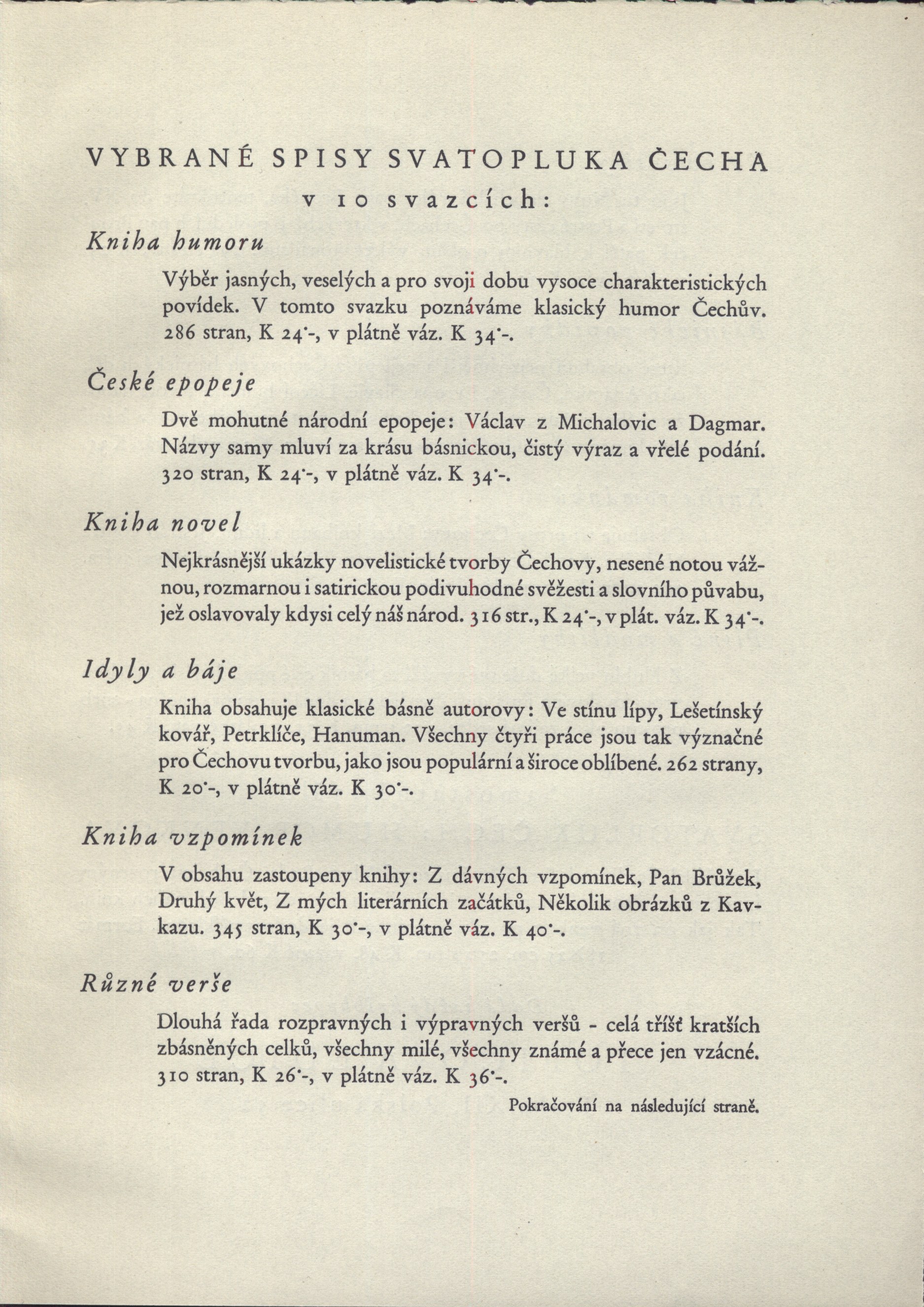 Názvové údaje Rudá v černé / K. J. Beneš ; [obálku a vazbu navrhl Milan Hegar ; proti tit. dřevoryt Maria Strettiho] Osobní jméno Beneš, Karel Josef, 1896-1969 (Autor) Další autoři Hegar, Milan, 1921-1987 (Grafický technik) Stretti, Mario, 1910-1960 (Ilustrátor) Nakladatel Praha : Československý spisovatel, 1955 Rozsah 331 s. Klíčová slova česká literatura * próza * román * próza * román Počet ex. 2, z toho volných 2 Druh dok. monografie Signatura AČS 04927, AČS 04927a Názvové údaje Písně otroka / Svatopluk Čech ; [frontispis Mario Stretti ; v grafické úpravě Cyrila Boudy] Osobní jméno Čech, Svatopluk, 1846-1908 (Autor) Další autoři Stretti, Mario, 1910-1960 (Ilustrátor) Bouda, Cyril, 1901-1984 (Knižní grafik) Korp. Topičova edice (nakladatelství) (Nakladatel, vydavatel) H. Lüdemann (Český Těšín) (Tiskař) (Tiskař obrazu) Nakladatel Praha : Topičova edice, 1946 Výrobce Knihtiskárna H. Lüdemann, nár. správa) Rozsah 77 s. : il. ; 22 cm Klíčová slova česká literatura * poezie * Čech S. * politická lyrika Počet ex. 1, z toho volných 1 Druh dok. monografie Signatura Topič 0109 Názvové údaje Pravý výlet pana Broučka do měsíce / Svatopluk Čech ; [lavírované kresby a úprava Mario Stretti] Osobní jméno Čech, Svatopluk, 1846-1908 (Autor) (Autor úvodu atd.) Další autoři Stretti, Mario, 1910-1960 (Ilustrátor) (Autor obálky) (Knižní grafik) Korp. Topičova edice (nakladatelství) (Nakladatel, vydavatel) Müller a spol. (tiskárna) (Tiskař) Nakladatel V Praze : Topičova edice Praha, 1939 Výrobce knihtiskárna Müller a spol.) Rozsah 107 s., [7] l. obr. příl. : il. ; 23 cm Klíčová slova česká literatura * próza * povídka * satira * satirická sci-fi * Čech S. * ilustrované knihy * ilustrace * Stretti M. Počet ex. 1, z toho volných 1 Druh dok. monografie Signatura Topič 0755 Názvové údaje Divadelní žatva 1948 : sborník dokumentů o novém československém divadle / [uspořádal Emanuel Janský ; obálka a kresby Mario Stretti ; fotografie Karel Drbohlav] Osobní jméno Janský, Emanuel, 1900-1965 (Sestavovatel, kompilátor) Další autoři Stretti, Mario, 1910-1960 (Autor obálky) (Ilustrátor) Drbohlav, Karel, 1908-1971 (Fotograf) Korp. Umění lidu (firma) (Nakladatel, vydavatel) knihtiskárna Janský & Navrátil (Tiskař) (Praha, Česko) Nakladatel Praha : Umění lidu, 1948 Výrobce (Janský a Navrátil, n.s) Rozsah 228 s. : il. ; 4° Klíčová slova české divadlo * divadelní představení * soutěže * sborník * r. 1948 Počet ex. 1, z toho volných 1 Druh dok. monografie Signatura M 123 a 2 Názvové údaje Divadelní žatva 1948 : sborník dokumentů o novém československém divadle / [uspořádal Emanuel Janský ; obálka a kresby Mario Stretti ; fotografie Karel Drbohlav] Osobní jméno Janský, Emanuel, 1900-1965 (Sestavovatel, kompilátor) Další autoři Stretti, Mario, 1910-1960 (Autor obálky) (Ilustrátor) Drbohlav, Karel, 1908-1971 (Fotograf) Korp. Umění lidu (firma) (Nakladatel, vydavatel) knihtiskárna Janský & Navrátil (Tiskař) (Praha, Česko) Nakladatel Praha : Umění lidu, 1948 Výrobce (Janský a Navrátil, n.s) Rozsah 228 s. : il. ; 4° Klíčová slova české divadlo * divadelní představení * soutěže * sborník * r. 1948 Počet ex. 1, z toho volných 1 Druh dok. monografie Signatura P 79 a 16 Názvové údaje Marocké vzpomínky / generál Vladimír Klecanda ; kresba na obálce od M. Strettiho Osobní jméno Klecanda, Vladimír Vojtěch, 1888-1947 (Autor) Další autoři Stretti, Mario, 1910-1960 (Ilustrátor) Korp. Družstvo knihtiskárny (tiskárna, Hranice, Přerov) (Tiskař) Nakladatel Hranice : Vladimír Vojtěch Klecanda, 1934 Výrobce Hranice : Družstvo knihtiskárny Rozsah 15 stran : ilustrace Osobní hesla Klecanda, Vladimír Vojtěch, 1888-1947 - generál, legionář, skautský a sportovní funkcionář, publicista Klíčová slova francouzsky psaná literatura * překlad * česká literatura * přednáška * dějiny vojenství * vzpomínky * Maroko * Francie Počet ex. 3, z toho volných 3 Druh dok. monografie Signatura POR 181, EISNER 466, M 126 h 40 Názvové údaje Listy do vězení / Charlotta G. Masaryková ; [v překladu z němčiny a s doslovem Vincence Svobody] ; s předmluvou Dr. A.G. Masarykové ; obálku a litografii kreslil Maria Stretti ; upravil Method Kaláb] Osobní jméno Masaryková-Garrigue, Charlotte, 1850-1923 (Autor) Další autoři Svoboda, Vincenc, 1887-1955 (Překladatel) (Autor doslovu, tiráže atd.) Masaryková, Alice G., 1879-1966 (Autor úvodu atd.) Stretti, Mario, 1910-1960 (Autor obálky) (Ilustrátor) Kaláb, Method, 1885-1963 (Grafický technik) Korp. Vladimír Žikeš (Praha, Plzeň) (Nakladatel, vydavatel) Průmyslová tiskárna v Praze (Tiskař) Nakladatel V Praze : Vladimír Žikeš, 1948 Výrobce (Průmyslová tiskárna) Rozsah 107-[II] s. ; 8° Osobní hesla Masaryková-Garrigue, Charlotte, 1850-1923 - překladatelka, autorka odborných statí * Masaryk, Tomáš Garrigue, 1850-1937 - politik, první čsl. president, filosof Klíčová slova Česko * 1. světová válka * vězení * dopisy Počet ex. 1, z toho volných 1 Druh dok. monografie Signatura Holan 2099 Názvové údaje Knížka polibků / Jaroslav Seifert ; [ilustrovali Jan Kristofori, Čeněk Pražák, Mario Stretti] Osobní jméno Seifert, Jaroslav, 1901-1986 (Autor) Další autoři Kristofori, Jan, 1931-2004 (Ilustrátor) Pražák, Čeněk, 1914-1996 (Ilustrátor) Stretti, Mario, 1910-1960 (Ilustrátor) Nakladatel Curych : Konfrontace, 1984 Rozsah 192s. : čb. il., portréty Osobní hesla Seifert, Jaroslav, 1901-1986 - básník, novinář, překladatel Klíčová slova česká literatura * česká poezie * básně * vzpomínky * Seifert J. * stol. 20., léta 30.-70. Počet ex. 1, z toho volných 1 Druh dok. monografie Signatura C12b 6255 Názvové údaje O starých časech a dobrých lidech / vypravuje svým vnučkám Marie Stre
