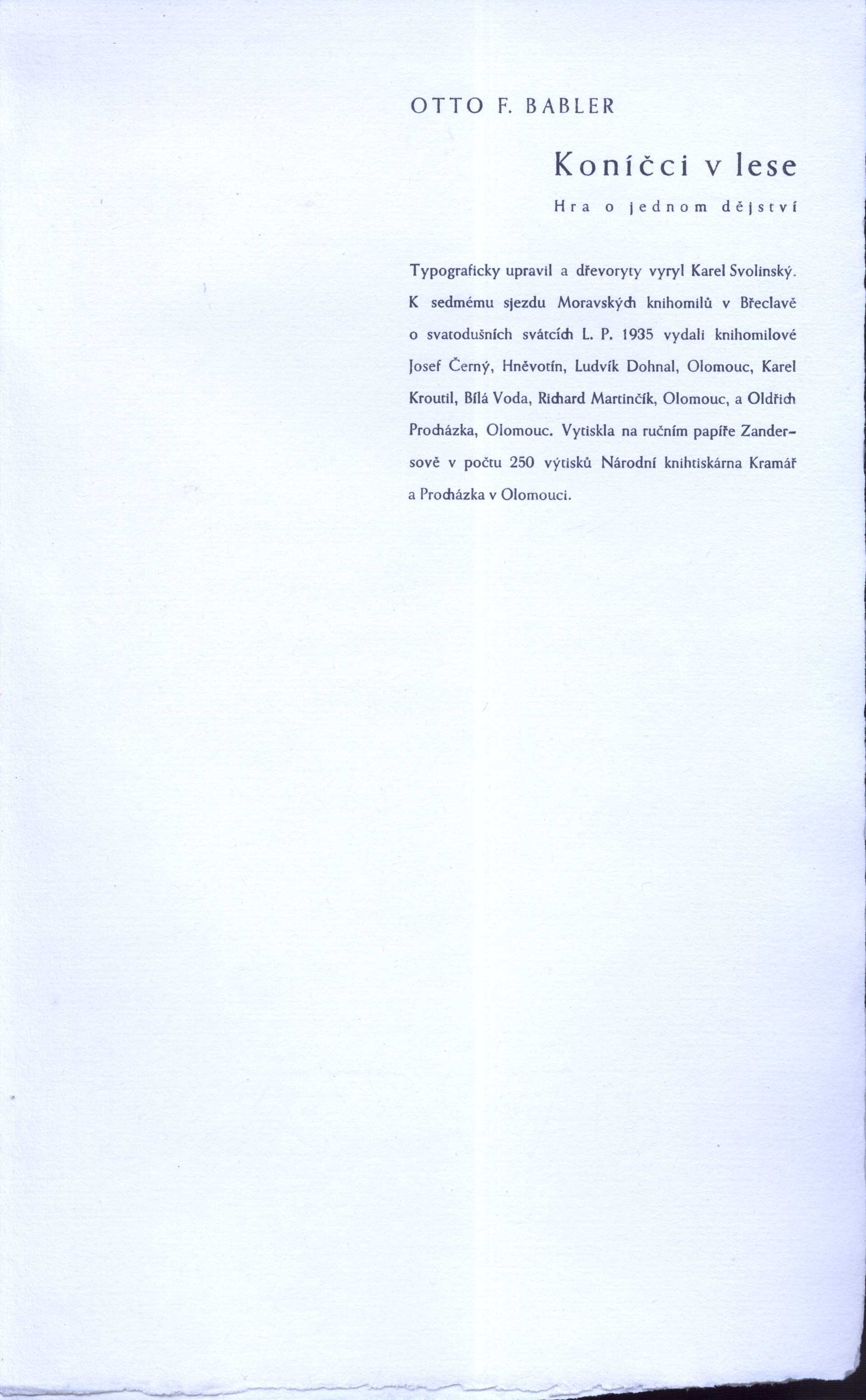 Názvové údaje Portrét / Alain Fournier ; [z francouzštiny přeložil L. Vrla ; upravil a pěti kresbami i obálkou vyzdobil Karel Svolinský] Autor Alain-Fournier, 1886-1914 (Autor) Další autoři Vrla, Leopold, 1909-1991 (Překladatel) Svolinský, Karel, 1896-1986 (Knižní grafik) (Ilustrátor) (Autor obálky) Filip, Josef (Nakladatel, vydavatel) (Tiskař) Nakladatel V Třebíči : Josef Filip, 1946 Rozsah 50 s. : il. Klíčová slova francouzská literatura * francouzská próza * moderní literatura * moderní próza Počet ex. 1, z toho volných 1 Druh dok. monografie Signatura KaG LXIII 176 Názvové údaje Portugalské listy / Marianna Alcoforado ; [přeložil Hanuš Jelínek ; typografickou úpravu, kresby, návrh vazby a ediční značku provedl Karel Svolinský] Osobní jméno Alcoforado, Mariana, 1640-1723 (Autor) Další autoři Jelínek, Hanuš, 1878-1944 (Překladatel) Svolinský, Karel, 1896-1986 (Typograf) (Ilustrátor) (Výtvarník vazby) Korp. Symposion (nakladatelství) (Nakladatel, vydavatel) Müller a spol. (tiskárna) (Tiskař) Nakladatel Praha : Symposion, 1949 Výrobce Müller a spol.) Rozsah 78 s. : il. Klíčová slova portugalská literatura * milostná literatura * milostné dopisy * křesťanští řeholníci * stol. 17. Počet ex. 1, z toho volných 1 Druh dok. monografie Signatura RSzpuk 0443 Názvové údaje Portugalské listy / Marianna Alcoforado ; z francouzštiny přeložil Hanuš Jelínek ; typografickou úpravu, kresby, návrh vazby a ediční značku provedl Karel Svolinský Osobní jméno Alcoforado, Mariana, 1640-1723 (Autor) Další autoři Jelínek, Hanuš, 1878-1944 (Překladatel) Svolinský, Karel, 1896-1986 (Typograf) (Ilustrátor) Korp. Symposion (nakladatelství) (Nakladatel, vydavatel) Müller a spol. (tiskárna) (Tiskař) Nakladatel Praha : Symposion, 1948 Výrobce V Turnově : Müller a spol. Rozsah 78 stran Klíčová slova portugalská literatura * francouzsky psaná literatura * korespondence Počet ex. 4, z toho volných 4 Druh dok. monografie Signatura P 77 f 88, Janeček 156, P 46 f 107, P 85 e 60 Názvové údaje Poslední kresba Josefa Mánesa : psáno a po prvé tištěno 1888 / Jakub Arbes ; tekst přehlédl Bedřich Beneš Buchlovan ; upravil a vyzdobil Karel Svolinský Osobní jméno Arbes, Jakub, 1840-1914 (Autor) Další autoři Beneš Buchlovan, Bedřich, 1885-1953 (Editor) Svolinský, Karel, 1896-1986 (Ilustrátor) Šmidt, Vilém, 1951- (Nakladatel, vydavatel) Nakladatel V Praze : Vilém Šmidt, 1940 Rozsah 43 stran Osobní hesla Mánes, Josef, 1820-1871 - malíř a ilustrátor Klíčová slova čeští malíři * české malířství * stol. 19. Počet ex. 3, z toho volných 3 Druh dok. monografie Signatura M 147 d 26, P 86 c 11, P 134 f 46 Názvové údaje Štědrý den bratří Mánesů / J. Arbes ; kresby a úprava Karel Svolinský Osobní jméno Arbes, Jakub, 1840-1914 (Autor) Další autoři Svolinský, Karel, 1896-1986 (Ilustrátor) (Grafický technik) Korp. Vilém Šmidt (nakladatelství) (Nakladatel, vydavatel) Karel Kryl (firma: Kroměříž, Česko) (Tiskař) Nakladatel Praha : Vilém Šmidt, 1940 Výrobce V Kroměříži : Karel Kryl Rozsah 35 stran : ilustrace Klíčová slova česká literatura * vánoční povídka * bratři Mánesové Počet ex. 4, z toho volných 4 Druh dok. monografie Signatura C12a 1437, KNYTL 481, P 54 E 106, P 74 F 110 Názvové údaje O Boží obci knih 22 = De civitate Dei libri 22. Sv. 1 / přeložila Julie Nováková ; obálka od Karla Svolinského ; vigneta v titulu od V. H. Brunnera Autor Augustin, svatý, 354-430 (Autor úvodu atd.) Další autoři Nováková, Julie, 1909-1991 (Překladatel) Svolinský, Karel, 1896-1986 (Grafický technik) Brunner, Vratislav Hugo, 1886-1928 (Ilustrátor) Nakladatel Praha : Vyšehrad, 1950 Rozsah 693 s. ; 20 cm Klíčová slova křesťanská filozofie * křesťanství * mimokřesťanská náboženství * starověký Řím * traktáty Počet ex. 1, z toho volných 1 Druh dok. monografie Signatura Holan 519 Názvové údaje O Boží obci knih 22 = De civitate Dei libri 22. Sv. 2 / přeložila Julie Nováková ; obálka od Karla Svolinského ; vigneta v titulu od V. H. Brunnera Autor Augustin, svatý, 354-430 (Autor úvodu atd.) Další autoři Nováková, Julie, 1909-1991 (Překladatel) Svolinský, Karel, 1896-1986 (Grafický technik) Brunner, Vratislav Hugo, 1886-1928 (Ilustrátor) Nakladatel Praha : Vyšehrad, 1950 Rozsah 736 s. ; 20 cm Klíčová slova křesťanská filozofie * křesťanství * mimokřesťanská náboženství * starověký Řím * traktáty Počet ex. 1, z toho volných 1 Druh dok. monografie Signatura Holan 514 Názvové údaje Koníčci v lese : hra o jednom dějství / Otto F. Babler ; typograficky upravil a dřevoryty vyryl Karel Svolinský Osobní jméno Babler, Otto František, 1901-1984 (Autor) (Dedikátor) Další autoři Svolinský, Karel, 1896-1986 (Typograf) (Ilustrátor) Korp. Kramář a Procházka (tiskárna) (Tiskař) Nakladatel V Olomouci : vydali knihomilové, 1935 Výrobce Národní knihtiskárna Kramář a Procházka Rozsah 6 nečíslovaných stran, 2 nečíslované listy obrazových příloh Klíčová slova česká dramata * divadelní hry * stol. 20., léta 30. * bibliofilie * bibliofilský tisk Počet ex. 6, z toho volných 6 Druh dok. monografie Signatura C12d 1773, C12d 71, ZA 2 a 46, Sáňka 1494, Sáňka 1495, P 99 a 3 Názvové údaje Nekrolog na světoznámého varhaníka, urozeného pana Jana Šebestiana Bacha, královského polského a kurfiřtského saského dvorního skladatele a ředitele kůru v Lipsku / Fil. Em. Bach a Jan B. Agricola ; přeložil František Bartoš ; závěrečnou báseň E. A. Saudek ; v úpravě Karla Svolinského ; portret J. Šeb. Bacha podle obrazu G. Haussmanna vyryl L. Sichling Osobní jméno Bach, Carl Philipp Emanuel, 1714-1788 (Autor) Další autoři Agricola, Johann Friedrich, 1720-1774 Bartoš, František, 1905-1973 (Překladatel) Saudek, Erik Adolf, 1904-1