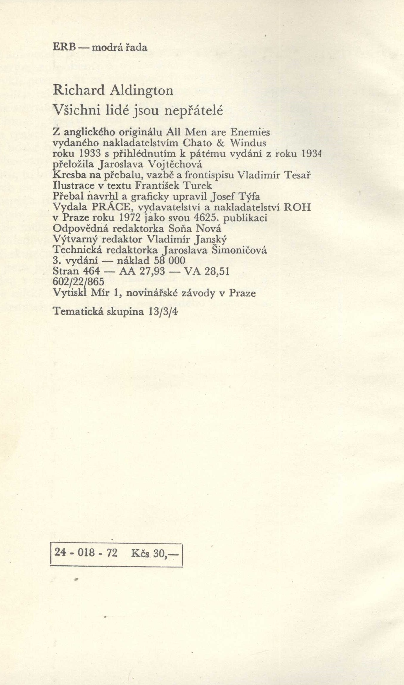 Názvové údaje 50 let SČUG Hollar / [redakce katalogu František Dvořák ; grafická úprava katalogu Josef Týfa] Záhlaví-akce 50 let SČUG Hollar (1967 : Praha, Česko) Další autoři Dvořák, František, 1920-2015 (Editor) Týfa, Josef, 1913-2007 (Knižní grafik) Korp. Sdružení českých umělců grafiků Hollar (Nakladatel, vydavatel) Svaz československých výtvarných umělců (profesní organizace) (Nakladatel, vydavatel) Nakladatel Praha : Svaz československých výtvarných umělců : SČUG Hollar, 1967 Rozsah 1 sv., obr. příl. : il. Heslo korporace (zkrác. heslo korp.) : Sdružení českých umělců grafiků Hollar - organizace českých grafiků Klíčová slova umělecké svazy * čeští výtvarní umělci * r. 1967 * 50. výročí * výstavy * katalogy výstav Počet ex. 1, z toho volných 1 Druh dok. monografie Signatura C12c 2806 Názvové údaje Všichni lidé jsou nepřátelé : romance / Richard Aldington ; z anglického originálu All Men are Enemies ... přeložila Jaroslava Vojtěchová Osobní jméno Aldington, Richard, 1892-1962 (Autor) Další autoři Vojtěchová, Jaroslava, 1943- (Překladatel) Tesař, Vladimír, 1924-2008 (Ilustrátor) Turek, František, 1916-2008 (Ilustrátor) Týfa, Josef, 1913-2007 (Autor obálky) (Knižní grafik) Korp. Práce (nakladatelství, tiskárna) (Nakladatel, vydavatel) Mír, novinářské závody (tiskárna) (Tiskař) Nakladatel Praha : Práce, 1972 Výrobce V Praze : Mír 1, novinářské závody Rozsah 461 stran : ilustrace ; 21 cm Klíčová slova anglická literatura * próza * Aldington R. * anglický román * český překlad * Vojtěchová J. * ilustrované knihy * ilustrace * Turek F. * r. 1972 Počet ex. 3, z toho volných 3 Druh dok. monografie Signatura P 42 e 56, Z A 7 b 46, VZinková 0487 Názvové údaje Hudebník ze Saint-Merry / Guillaume Apollinaire ; [z překladů Marie Bieblové a dalších vybral, uspořádal, předmluvu a dovětek napsal a ilustrace vybral Václav Kubín ; typografie Josef Týfa] Osobní jméno Apollinaire, Guillaume, 1880-1918 (Autor) Další autoři Kubín, Václav, 1920-2007 (Sestavovatel, kompilátor) Bieblová, Marie, 1909-1997 (Překladatel) Týfa, Josef, 1913-2007 (Grafický technik) Nakladatel Praha : Československý spisovatel, 1981 Rozsah 249 s. : il. ; 23 s Osobní hesla Apollinaire, Guillaume, 1880-1918 - francouzský básník Klíčová slova francouzská literatura * poezie * výbor * Apollinaire G. * život a dílo Počet ex. 3, z toho volných 3 Druh dok. monografie Signatura Holan 679, AČS 05596, AČS 05596a Názvové údaje Mimesis : zobrazení skutečnosti v západoevropských literaturách / Erich Auerbach ; z německého originálu přeložili Miloslav Žilina, Vladimír Kafka a Rio Preisner ; doslov napsal Petr Rákos ; graficky upravil Josef Týfa Osobní jméno Auerbach, Erich, 1892-1957 (Autor) Další autoři Žilina, Miloslav, 1926-1999 (Překladatel) Kafka, Vladimír, 1931-1970 (Překladatel) Preisner, Rio, 1925-2007 (Překladatel) Rákos, Petr, 1925-2002 (Autor doslovu, tiráže atd.) Týfa, Josef, 1913-2007 (Knižní grafik) Korp. Mladá fronta (nakladatelství) (Nakladatel, vydavatel) Tisk Brno (tiskárna) (Tiskař) Nakladatel Praha : Mladá fronta, 1968 Výrobce Brno : Tisk, n. p., knižní výroba Rozsah 501 stran ; 20,1 cm Klíčová slova evropská literatura * literární díla * literárněvědné rozbory * skutečnost * metody * interpretace * literárněvědné studie Počet ex. 4, z toho volných 4 Druh dok. monografie Signatura Fuks 0318, OŘíha 130, M 175 c 34, M 63 b 33 Názvové údaje Klapzubova jedenáctka : povídka pro kluky malé i velké / Eduard Bass ; ilustroval Josef Čapek ; k vydání připravila a ediční poznámkou a vysvětlivkami opatřila Jarmila Víšková ; obálku a vazbu navrhl a typograficky upravil Josef Týfa Osobní jméno Bass, Eduard, 1888-1946 (Autor) Další autoři Čapek, Josef, 1887-1945 (Ilustrátor) Víšková, Jarmila, 1927-2017 (Editor) (Autor komentáře) Týfa, Josef, 1913-2007 (Autor obálky) (Výtvarník vazby) (Typograf) Korp. Československý spisovatel (nakladatelství) (Tiskař) Rudé právo (tiskárna, Praha) (Nakladatel, vydavatel) Nakladatel Praha : Československý spisovatel, 1967 Výrobce Praha : Rudé právo Rozsah 127 stran : ilustrace ; 18 cm Klíčová slova česká literatura * próza * povídka * literatura pro mládež Počet ex. 1, z toho volných 2 Druh dok. monografie Signatura AČS 01726, Branald 0485 Názvové údaje Vybrané verše z let 1937-1971 / Kamil Bednář ; Ilustr. Ludmila Jiřincová ; Typogr. Josef Týfa Osobní jméno Bednář, Kamil, 1912-1972 (Autor) Další autoři Jiřincová, Ludmila, 1912-1994 (Ilustrátor) Týfa, Josef, 1913-2007 (Grafický technik) Nakladatel Praha : Československý spisovatel, 1972 Rozsah 137 s. : il Klíčová slova česká literatura * poezie * r. 1937-1971 Počet ex. 1, z toho volných 1 Druh dok. monografie Signatura AČS 02456 Názvové údaje Vybrané verše z let 1937-1971 / Kamil Bednář ; Ilustr. Ludmila Jiřincová ; Typogr. Josef Týfa Osobní jméno Bednář, Kamil, 1912-1972 (Autor) Další autoři Jiřincová, Ludmila, 1912-1994 (Ilustrátor) Týfa, Josef, 1913-2007 (Grafický technik) Nakladatel Praha : Československý spisovatel, 1972 Rozsah 137 s. : il Klíčová slova česká literatura * poezie * verše * výbor * r. 1937-1971 Počet ex. 3, z toho volných 3 Druh dok. monografie Signatura C12b 3645, LK P 29 h 86, LK ZA 6 f 15 Názvové údaje Vlaštovka mého osudu / Olga Berggolcová ; Z ruš. vybrali a přel. Olga a Václav Jelínkovi ; Prózy přel. Anna Nováková ; Předml. Jaroslav Žák ; Obálku, vazbu a graf. úpr. navrhl Josef Týfa Osobní jméno Berggol‘c, Ol‘ga Fedorovna, 1910-1975 (Autor) Další autoři Jelínková, Olga (Překladatel) Jelínek, Václav, 1932-1979 (Překladatel) Nováková, Anna, 1921-2005 (Překladatel) Žák, Jaroslav, 1931-2011 (Autor úvodu atd.) Týfa, Josef, 1913-2007