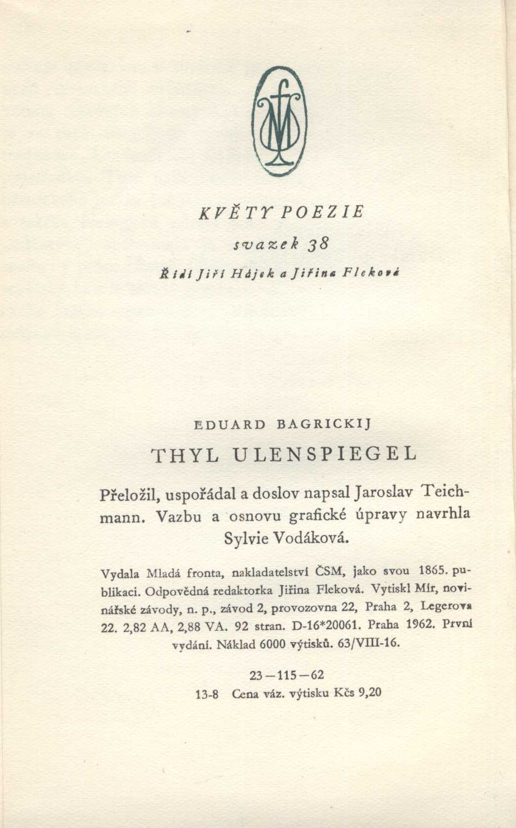 Názvové údaje Hrom je můj bratr / Betti Alverová ; [z estonského originálu] přeložili Vladimír Macura a Jiří Žáček ; dolsov napsal Vladimír Macura ; vazba a kresby Sylvie Vodáková ; graficky upravil František Plaček] Osobní jméno Alver, Betti, 1906-1989 (Autor) Další autoři Macura, Vladimír, 1945-1999 (Překladatel) (Autor doslovu, tiráže atd.) Žáček, Jiří, 1945- (Překladatel) Vodáková, Sylvie, 1926- (Výtvarník vazby) (Ilustrátor) Plaček, František (Knižní grafik) Korp. Mladá fronta (nakladatelství) (Nakladatel, vydavatel) Mír, novinářské závody (tiskárna) (Tiskař) Nakladatel Praha : Mladá fronta, 1980 Výrobce Mír, novinářské závody) Rozsah 122 s. Osobní hesla Alver, Betti, 1906-1989 - estonská básnířka Klíčová slova estonská literatura * poezie * sbírka básní Počet ex. 1, z toho volných 1 Druh dok. monografie Signatura RSzpuk 0637 Názvové údaje Oslavujeme Bakcha : anakreotská poezie / Anacreon ; [z řeckého originálu za jazykové spolupráce R. Hoška] přebásnil Vojtěch Jestřáb ; [doslov napsal a výbor uspořádal Radislav Hošek ; vazba a osnova grafické úpravy podle návrhu Sylvie Vodákové] Autor Anakreón, činný 6. století př. Kr. (Autor) Další autoři Jestřáb, Vojtěch, 1922-2003 (Překladatel) Hošek, Radislav, 1922-2005 (Autor doslovu, tiráže atd.) (Sestavovatel, kompilátor) Vodáková, Sylvie, 1926- (Výtvarník vazby) (Knižní grafik) Korp. Mladá fronta (nakladatelství) (Nakladatel, vydavatel) Mír, novinářské závody (tiskárna) (Tiskař) Nakladatel Praha : Mladá fronta, 1963 Výrobce Mír, novinářské závody) Rozsah 94 s. Osobní hesla Anakreón, činný 6. století př. Kr. - antic. básník Klíčová slova klasická řecká literatura * poezie * výbor básní Počet ex. 1, z toho volných 1 Druh dok. monografie Signatura RSzpuk 0595 Názvové údaje Hádání z vlastní ruky : Výbor z básnického díla / Miguel Angel Asturias ; Z orig. autorovy rukop. antol. vybral, uspoř. a ve spolupr. s Alenou Novohradskou přel. Vlastimil Maršíček ; Frontisp. Jiří Chadima ; Obálka, vazba a graf. úpr. Syvie Vodákové Osobní jméno Asturias, Miguel Ángel, 1899-1974 (Autor) Další autoři Maršíček, Vlastimil, 1923-2000 (Překladatel) Novohradská, Alena (Překladatel) Chadima, Jiří, 1923- (Ilustrátor) Vodáková, Sylvie, 1926- (Grafický technik) Nakladatel Praha : Mladá fronta, 1961 Rozsah 72 [4] s. Osobní hesla Asturias, Miguel Ángel, 1899-1974 - guatemalský spisovatel Klíčová slova latinskoamerická literatura * poezie * výbor básní * stol. 20. Počet ex. 1, z toho volných 1 Druh dok. monografie Signatura C12a 1970 Názvové údaje Thyl Ulenspiegel / Eduard Bagrickij ; přeložil Jaroslav Teichmann Osobní jméno Bagrickij, Èduard Georgijevič, 1895-1934 (Autor) Další autoři Teichmann, Jaroslav, 1904-1999 (Překladatel) (Autor doslovu, tiráže atd.) Vodáková, Sylvie, 1926- (Výtvarník vazby) (Knižní grafik) Korp. Mladá fronta (nakladatelství) (Nakladatel, vydavatel) Mír, novinářské závody (tiskárna) (Tiskař) Nakladatel Praha : Mladá fronta, 1962 Výrobce Mír, novinářské závody, n. p., závod 2 Rozsah 89 stran ; 15 cm Osobní hesla Bagrickij, Èduard Georgijevič, 1895-1934 Klíčová slova ruská literatura * ukrajinská literatura * poezie * poémy * překlad * r. 1962 Počet ex. 3, z toho volných 3 Adr. el. zdr. http://krameriusndk.nkp.cz/search/handle/uuid:d60bc7b0-770b-11e5-9690-005056827e51 Druh dok. monografie Signatura VZinková 0654, F I 3000, P 51 g 47 Názvové údaje Květy zla / Charles Baudelaire ; česky Vítězslav Nezval Osobní jméno Baudelaire, Charles, 1821-1867 (Autor) Další autoři Nezval, Vítězslav, 1900-1958 (Překladatel) Blahynka, Milan, 1933- (Autor komentáře) (Autor doslovu, tiráže atd.) Vodáková, Sylvie, 1926- (Výtvarník vazby) (Knižní grafik) Korp. Mladá fronta (nakladatelství) (Nakladatel, vydavatel) Mír, novinářské závody (tiskárna) (Tiskař) Unifikovaný název Fleurs du mal. Česky Nakladatel Praha : Mladá fronta, 1964 Výrobce Praha : Mír, novinářské závody, n. p., závod 3 Rozsah 232 stran ; 15 cm Osobní hesla Baudelaire, Charles, 1821-1867 - francouzský básník, umělecký kritik a překladatel Klíčová slova francouzská literatura * poezie * Baudelaire Ch. * český překlad * Nezval V. * r. 1964 Počet ex. 1, z toho volných 1 Adr. el. zdr. http://krameriusndk.nkp.cz/search/handle/uuid:096e1170-b30b-11e7-a6f3-005056827e52 Druh dok. monografie Signatura VZinková 0653 Názvové údaje Květy zla : výbor / Charles Baudelaire ; [z francouzského originálu vybral] přeložil [a doslov napsal] Ivan Slavík ; [vazba a kresby Sylvie Vodákové ; typograficky upravil František Plaček] Osobní jméno Baudelaire, Charles, 1821-1867 (Autor) Další autoři Slavík, Ivan, 1920-2002 (Sestavovatel, kompilátor) (Překladatel) (Autor doslovu, tiráže atd.) Vodáková, Sylvie, 1926- (Autor obálky) (Ilustrátor) Plaček, František (Typograf) Korp. Mladá fronta (nakladatelství) (Nakladatel, vydavatel) Mír, novinářské závody (tiskárna) (Tiskař) Nakladatel Praha : Mladá fronta, 1976 Výrobce Mír, novinářské závody) Rozsah 152 s. Osobní hesla Baudelaire, Charles, 1821-1867 - francouzský básník, umělecký kritik a překladatel Klíčová slova francouzská poezie * sbírka básní * výbor básní * stol. 19. Počet ex. 2, z toho volných 2 Druh dok. monografie Signatura C12a 2978, RSzpuk 0623 Názvové údaje Krásných paní milování a jiné rýmy a šprýmy : staročeská poezie / přebásnil Kamil Bednář ; [výbor uspořádal, jazykově spolupracoval a doslov napsal František Svejkovský ; vazba a osnova grafické úpravy podle návrhu Sylvie Vodákové] Osobní jméno Bednář, Kamil, 1912-1972 (Autor) Další autoři Svejkovský, František, 1923- (Autor komentáře) (Autor doslovu, tiráže atd.) Vodáková, Sylvie, 1926- (Výtvarník
