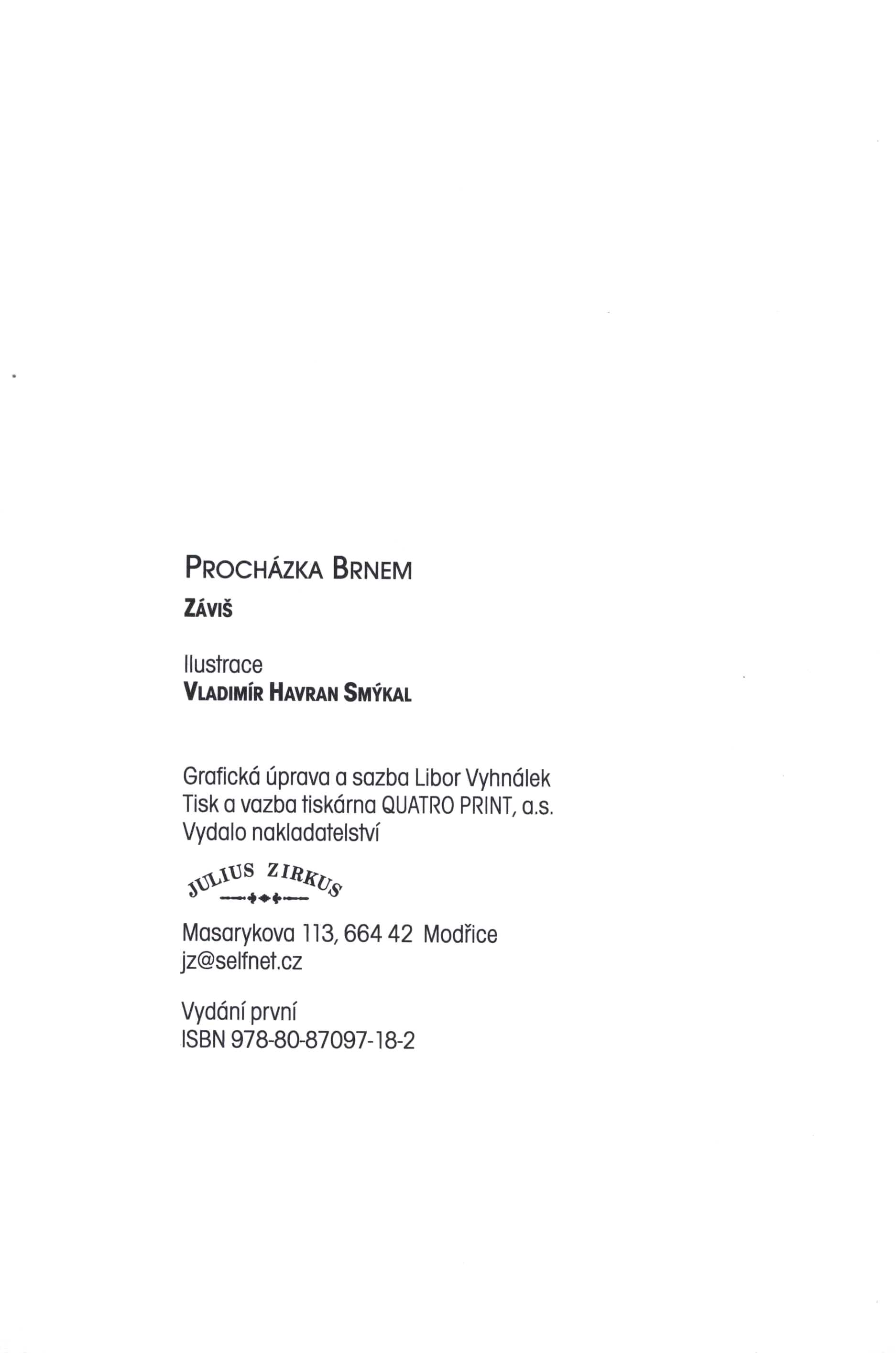 Názvové údaje Anebo jen nezvyk? / Jiří Weinberger (text) ; Petr Wohl (kresby) ; grafická úprava Libor Vyhnálek Osobní jméno Weinberger, Jiří, 1946- (Autor) Další autoři Wohl, Petr, 1970- (Ilustrátor) Vyhnálek, Libor Pearcoo (Knižní grafik) Korp. Krigl (nakladatelství) (Nakladatel, vydavatel) Nakladatel Praha : Krigl, 2018 Rozsah 99 stran : barevné ilustrace ; 17 cm Klíčová slova česká poezie * básně Počet ex. 1, z toho volných 1 Druh dok. monografie Signatura C12a 6003 Názvové údaje Let balonem Záviš ; ilustrace Kristina Šilerová ; grafická úprava a sazba Libor Pearcoo Vyhnálek Autor Záviš, 1956- (Autor) Další autoři Šilerová, Kristina, 1977- (Ilustrátor) Vyhnálek, Libor Pearcoo (Knižní grafik) (Sazeč) Nakladatel Brno : Julius Zirkus, 2015 Výrobce Tiskárna Helbich Rozsah 156 stran : ilustrace ; 17 cm Klíčová slova česká poezie * básně Počet ex. 1, z toho volných 1 Druh dok. monografie Signatura C12a 5562 Názvové údaje Procházka Brnem / Záviš ; ilustrace Vladimír Havran Smýkal ; grafická úprava a sazba Libor Vyhnálek Autor Záviš, 1956- (Autor) Další autoři Smýkal, Vladimír, 1951- (Ilustrátor) Vyhnálek, Libor Pearcoo (Knižní grafik) (Sazeč) Korp. Julius Zirkus (nakladatelství) (Nakladatel, vydavatel) QUATRO PRINT, a.s. (tiskárna) (Tiskař) Nakladatel Modřice : Julius Zirkus, [2018] Výrobce Brno : QUATRO PRINT, a.s. Copyright ©2018 Rozsah 78 stran : ilustrace ; 25 cm Klíčová slova česká literatura * ilustrovaná publikace * poezie * sbírka básní * miniatury * humor Počet ex. 1, z toho volných 1 Druh dok. monografie Signatura C12c 5119