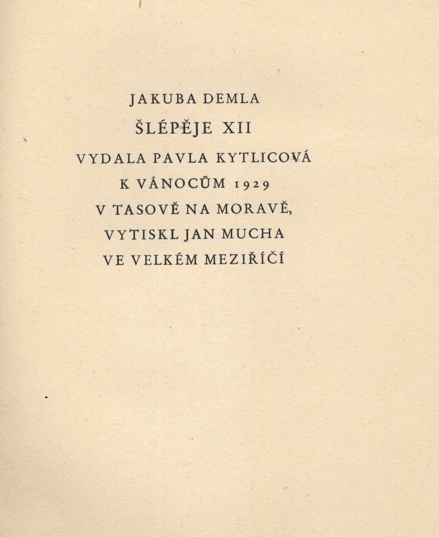Názvové údaje Řeč presidenta republiky Dr. Edvarda Beneše nad rakví presidenta osvoboditele profesora T.G. Masaryka : v Praze dne 21. září 1937 Osobní jméno Beneš, Edvard, 1884-1948 (Autor) Další autoři Masaryk, Tomáš Garrigue, 1850-1937 (Poctěná osoba) Korp. Frant. Bartoš (tiskárna) (Nakladatel, vydavatel) Nakladatel [Československo] : F. Bartoš ... [et al.], 1937 Výrobce Knihtiskárna Bartoš) Rozsah 21 s. Osobní hesla Masaryk, Tomáš Garrigue, 1850-1937 - politik, první čsl. president, filosof Klíčová slova čeští politici * českoslovenští prezidenti * Masaryk T. G. * úmrtí * nekrology * Beneš E. Počet ex. 1, z toho volných 1 Druh dok. monografie Signatura C12d 751 Názvové údaje Zvláštní vydání Věstníku ministerstva školství a národní osvěty : na paměť presidenta Osvoboditele Tomáše Garrigue Masaryka, který zemřel v úterý čtrnáctého září roku tisícího devítistého třicáteho sedmého ve tři hodiny dvacet devět minut po půlnoci, právě když naplnil osmdesát sedm let, šest měsíců a sedm dní svého života / řeč presidenta republiky Dr. Edvarda Beneše, pronesená nad rakví presidenta Osvoboditele na Hradě pražském v úterý 21. září 1937 ; upravil Ladislav Sutnar Osobní jméno Beneš, Edvard, 1884-1948 (Autor) Další autoři Sutnar, Ladislav, 1897-1976 (Grafický technik) Korp. Československo. Ministerstvo školství a národní osvěty (Nakladatel, vydavatel) Státní nakladatelství (Tiskař) Nakladatel Praha : Ministerstvo školství a národní osvěty, 1937 Výrobce Státní nakladatelství Rozsah 28 nečíslovaných stran ; 26 cm Osobní hesla Masaryk, Tomáš Garrigue, 1850-1937 - politik, první čsl. president, filosof Klíčová slova čeští politici * úmrtí * pohřební řeč Počet ex. 2, z toho volných 2 Druh dok. monografie Signatura C12c 2283, JVladislav 567 Názvové údaje V. Bezručova Opava : 9.-16. září 1962 Záhlaví-akce Bezručova Opava (5._: 1962 : Opava, Česko) Nakladatel V Opavě : Péčí Památníku Petra Bezruče, 1962 Výrobce (Moravské tiskářské závody 32) Rozsah 12 s. Osobní hesla Bezruč, Petr, 1867-1958 - básník Klíčová slova čeští básníci * výročí úmrtí * dílo * ohlasy * české spisovatelky * básně * eseje * příležitostný tisk Počet ex. 1, z toho volných 1 Druh dok. monografie Signatura C12b 10884 Názvové údaje Šlépěje. Svazek XII / Jakub Deml Osobní jméno Deml, Jakub, 1878-1961 (Autor) (Autor podpisu) Další autoři Pavla Kytlicová (Tasov na Moravě) (Nakladatel, vydavatel) Jan Mucha (Velké Meziříčí) (Tiskař) Nakladatel V Tasově na Moravě : Pavla Kytlicová, 1929 Výrobce Jan Mucha) Rozsah 59 s. : il. + 1 příl. ; 21 cm. Osobní hesla Březina, Otokar, 1868-1929 - básník, esejista, prozaik Klíčová slova čeští spisovatelé * čeští básníci * Březina O. * úmrtí * vzpomínky přátel Počet ex. 2, z toho volných 2 Druh dok. monografie Signatura Holan 2281, VMartínek 0054 Názvové údaje Chronologicum Necrologium Abbatum, et Canonicorum Praemonstratensium Sioneorum, qui mox a primo ingressu Sacris Ordinis in Bohemiam, aut Pragae in Monte Sion, aut aliis in locis ad Annum usque 1816 obierunt / descriptum a Godefrido Joanne Dlabacž, Pragae in Monte Sion Canonico, ibidem Bibliothecae Praefecto primo, domesticorum Annalium Scriptore, Regiarum Societarum Scientiarum Pragae in Bohemia, et Gorlicii in Lusatia Sodali, et (pl. Tit.) Archiepiscopi Pragensis Notario publico, et jurato Osobní jméno Dlabač, Bohumír Jan, 1758-1820 (Sestavovatel, kompilátor) (Autor) (Dedikátor) Další autoři Sommerová, Josefa, -1836 (Tiskař) Pfeiffer, Benedikt Jan Nepomucký, 1783-1834 (Dedikant) Korp. Strahovský klášter (Nakladatel, vydavatel) Sommerova tiskárna (tiskařský podnik) (Tiskař) Nakladatel Pragae : [Monasterium Strahoviensis], 1817 Výrobce (Litteris typographiae Sommerianae) Rozsah 96 s. Klíčová slova katolické řády * církevní dějiny * křesťanské kláštery * premonstráti * Strahovský klášter * církevní hodnostáři * úmrtí * stol. 12.-19. * chronologické přehledy * nekrologium * r. 1140-1816 * r. 1817-1897 Počet ex. 2, z toho volných 2 Druh dok. monografie Signatura C12b 10238, L XVII D 28 Názvové údaje Tolstoj, apoštol lidskosti a míru : řeč, kterou měl při posmrtné oslavě L. N. Tolstého pořádané Osvětovým svazem na radnici Staroměstské 26. prosince 1910 / Frant. Drtina Osobní jméno Drtina, František, 1861-1925 (Autor) (Nakladatel, vydavatel) Další autoři Edvard Leschinger (firma) (Tiskař) Nakladatel V Praze : nákladem vlastním, 1911 Tiskem Edavrda Leschingra Rozsah 13 stran ; 23, 5 cm Osobní hesla Tolstoj, Lev Nikolajevič, 1828-1910 - ruský prozaik, dramatik, publicista, myslitel a pedagog Klíčová slova ruští spisovatelé * ruská literatura * humanismus * úmrtí * oslavné projevy Počet ex. 1, z toho volných 1 Druh dok. separáty Signatura Patočka 0422 Názvové údaje Zpěvanky, zpěvanky -- : příležitostný tisk k 20. výročí úmrtí Františka Halase / František Halas ; k tisku připravil a ediční poznámku napsal F. X. Halas. graficky upravil Ivan Soukup Osobní jméno Halas, František, 1901-1949 (Autor) Další autoři Halas, František X., 1937-2023 (Editor) Soukup, Ivan, 1942- (Knižní grafik) Korp. Blok (nakladatelství) (Nakladatel, vydavatel) Tisk Brno (tiskárna) (Tiskař) Nakladatel Brno : Blok, 1969 Výrobce Tisk) Rozsah [9] s. Osobní hesla Halas, František, 1901-1949 - básník, esejista, redaktor, překladatel Klíčová slova česká literatura * česká poezie * básnická próza * Halas F. * výročí úmrtí * 20. výročí Počet ex. 1, z toho volných 1 Druh dok. monografie Signatura C12c 3836 Názvové údaje Havlíčkova čítanka / [Karel Havlíček Borovský ; předmluva Karel Jar. Obrátil] Osobní jméno Havlíček Borovský, Karel, 1821-1856 (Autor) Další autoři Obrátil, Kar