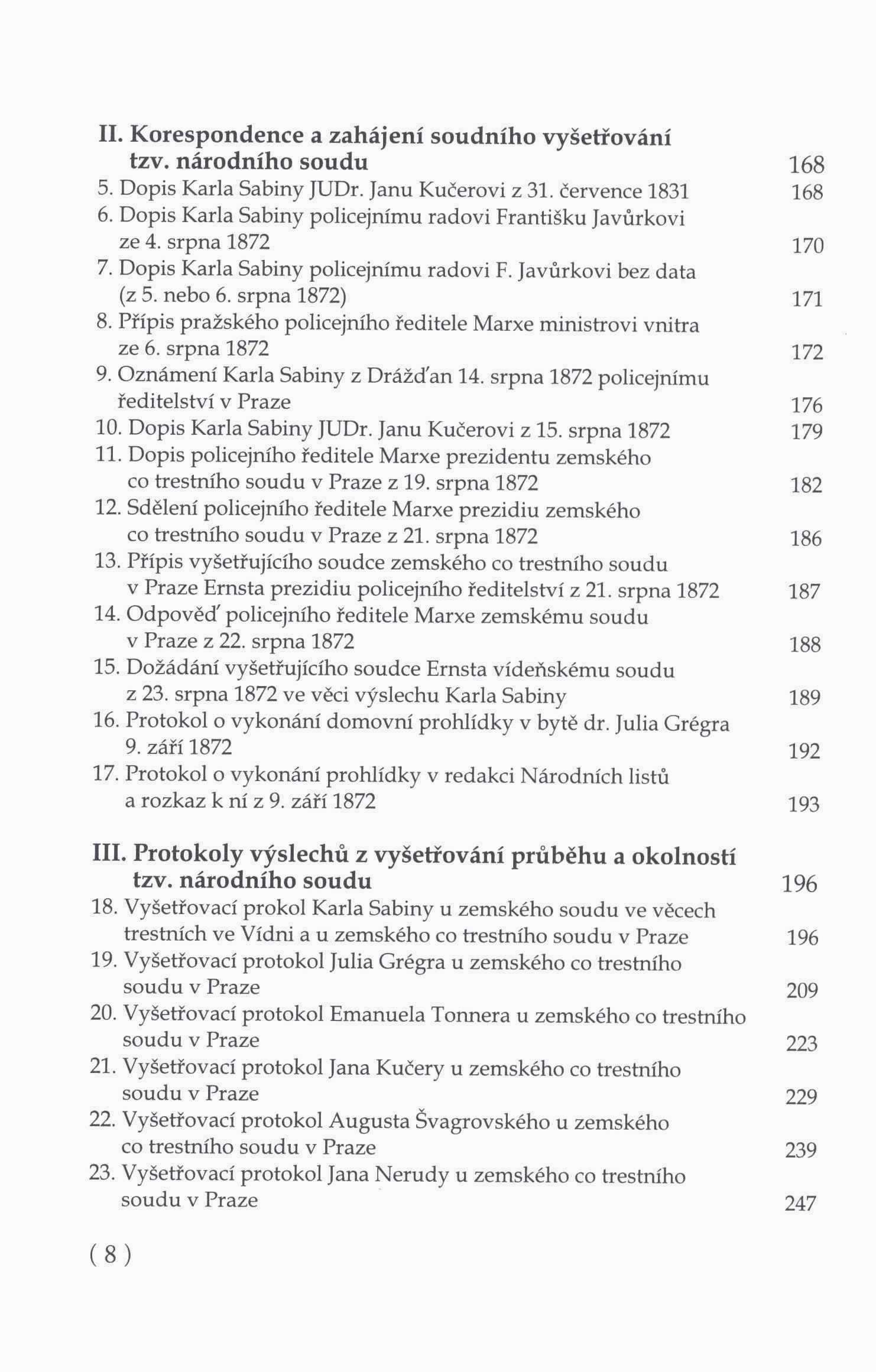 Názvové údaje Karel Havlíček Borovský na Vysočině / František Drašner ; s ilustracemi Luboše Novotného Osobní jméno Drašner, František, 1943-2006 (Autor) Další autoři Novotný, Luboš (Ilustrátor) Nakladatel Havlíčkův Brod : [s.n.], 2003 Výrobce (Tiskárny Havlíčkův Brod) Rozsah 308 s. : il., portréty, faksimile Osobní hesla Havlíček Borovský, Karel, 1821-1856 - spisovatel, publicista a politik Klíčová slova čeští spisovatelé * čeští publicisté * cesty * pobyt * literární místopis * Vysočina * Havlíček Borovský K. * stol. 19. * biografie Počet ex. 2, z toho volných 2 Druh dok. monografie Signatura C12b 6808, C12c 4468 Názvové údaje Epizoda z 60. let : korespondence Václava Havla a Aleše Fetterse / [komentář Aleš Haman ; sestavil a k vydání připravil Petr Lachmann ; fotografie Dagmar Hochová ; grafická úprava Veronika Botová] Osobní jméno Havel, Václav, 1936-2011 (Autor) Další autoři Fetters, Aleš, 1933-2025 (Autor) Haman, Aleš, 1932-2023 (Autor komentáře textu) Lachmann, Petr, 1954- (Sestavovatel, kompilátor) Hochová, Dagmar, 1926-2012 (Fotograf) Botová, Veronika, 1981- (Knižní grafik) Nakladatel Praha : ARSCI, 2006 Výrobce PBtisk) Rozsah 116 s. : il., portréty, faksim. Osobní hesla Havel, Václav, 1936-2011 - spisovatel a dramaturg, dramatik, publicista v literárních a divadelních časopisech, esejista, politik, prezident ČR * Fetters, Aleš, 1933-2025 - publicista, historik Klíčová slova čeští spisovatelé * čeští publicisté * čeští dramatici * čeští pedagogové * středoškolští pedagogové * Československo * r. 1948-1989 * stol. 20. * politická situace * kulturní politika * společnost * korespondence * komentáře * komentované vydání Počet ex. 5, z toho volných 5 Druh dok. monografie Signatura C12b 9253, C12b 9253a, C12b 9253b, R&AHamanovi 0233, C12b 13602 Názvové údaje Masaryk! Ne Lenin : moje svědectví / Vítězslav Houška ; [grafická úprava a uspořádání grafických příloh Lenka Klaputová] Osobní jméno Houška, Vítězslav, 1925-2011 (Autor) Další autoři Masarykovo demokratické hnutí (sdružení) (Nakladatel, vydavatel) Nakladatel Karviná : Paris, 2009 Rozsah 197 s. : il., portréty ; 21 cm Osobní hesla Houška, Vítězslav, 1925-2011 - redaktor, beletrista, překladatel * Masaryk, Tomáš Garrigue, 1850-1937 - politik, první čsl. president, filosof Klíčová slova čeští spisovatelé * čeští publicisté * politické osobnosti * česká společnost * československá politika * Československo * stol. 20. * autobiografické vzpomínky * úvahy Počet ex. 1, z toho volných 1 Adr. el. zdr. obsah Druh dok. monografie Signatura C12b 11965 Názvové údaje Zpověď dítěte svého věku / Jaroslav Jírů ; [úvod Luboš Dobrovský ; přebal a grafická úprava Luboš Šedivý] Osobní jméno Jírů, Jaroslav, 1935-2013 (Autor) Další autoři Dobrovský, Luboš, 1932- (Autor úvodu atd.) Šedivý, Lubomír, 1955- (Autor obálky) Nakladatel Hradec Králové : Kruh, 1991 Rozsah 181 s. ; 20 cm Osobní hesla Jírů, Jaroslav, 1935-2013 - novinář a publicista, rozhlasový redaktor, zahraniční komentátor Klíčová slova čeští novináři * čeští publicisté * Československo * stol. 20., léta 60.-80. * politická situace * společenská situace * komunistický teror * autobiografické vyprávění Počet ex. 2, z toho volných 2 Druh dok. monografie Signatura C12b 10493, M 211 f 53 Názvové údaje Hrst vzpomínek z dospělosti / Václav Kaplický ; k vydání připravil Martin Kučera Osobní jméno Kaplický, Václav, 1895-1982 (Autor) Další autoři Kučera, Martin, 1958- (Editor) Nakladatel Praha : Národní archiv, 2010 Rozsah 188 s. Osobní hesla Kaplický, Václav, 1895-1982 - redaktor, prozaik Klíčová slova čeští spisovatelé * čeští publicisté * českoslovenští legionáři * společnost * politika * literární život * Českotřebovsko * stol. 20. * autobiografické vzpomínky * vyprávění Počet ex. 1, z toho volných 0 Druh dok. monografie Signatura C12b 13083 Názvové údaje Ivan Bauše : 1908-1959 (1962) : inventář / zpracoval Štěpán Kohout Osobní jméno Kohout, Štěpán, 1969- (Sestavovatel, kompilátor) Další autoři Zemský archiv v Opavě. Pobočka Olomouc (Nakladatel, vydavatel) Nakladatel Olomouc : Zemský archiv Opava, pobočka Olomouc, 2009 Rozsah 31 s. Osobní hesla Bauše, Ivan, 1886-1959 - český spisovatel a publicista Heslo korporace (zkrác. heslo korp.) : Zemský archiv v Opavě. Pobočka Olomouc Klíčová slova čeští spisovatelé * čeští publicisté * stol. 19.-20. * život a dílo * archivní fondy * osobní korespondence * literární rukopisy * fotografie * r. 1908-1959 Počet ex. 1, z toho volných 1 Druh dok. monografie Signatura C12d 1520 Názvové údaje Národní soud nad zrádcem Karlem Sabinou : (nová fakta, policejní a soudní dokumenty, výpovědi svědků) / Petr Kovařík ; [německé archiválie přeložil autor ; obálka, grafická úprava a zlom Vladimír Kodeš] Osobní jméno Kovařík, Petr, 1946- (Autor) (Překladatel) Další autoři Kodeš, Vladimír (Autor obálky) (Knižní grafik) Nakladatel Praha : Modrý stůl, 2010 Rozsah 357 s. : il., portréty, faksim. Osobní hesla Sabina, Karel, 1813-1877 - novinář, politik, prozaik, dramatik Klíčová slova literatura faktu * čeští spisovatelé * čeští publicisté * čeští novináři * čeští politici * informátoři policie * stol. 19. * Česko * dějiny * společnost * politika * soudní procesy * soudní dokumenty * archivní fondy * archivní dokumenty * r. 1872 Počet ex. 1, z toho volných 1 Druh dok. monografie Signatura C12b 12646